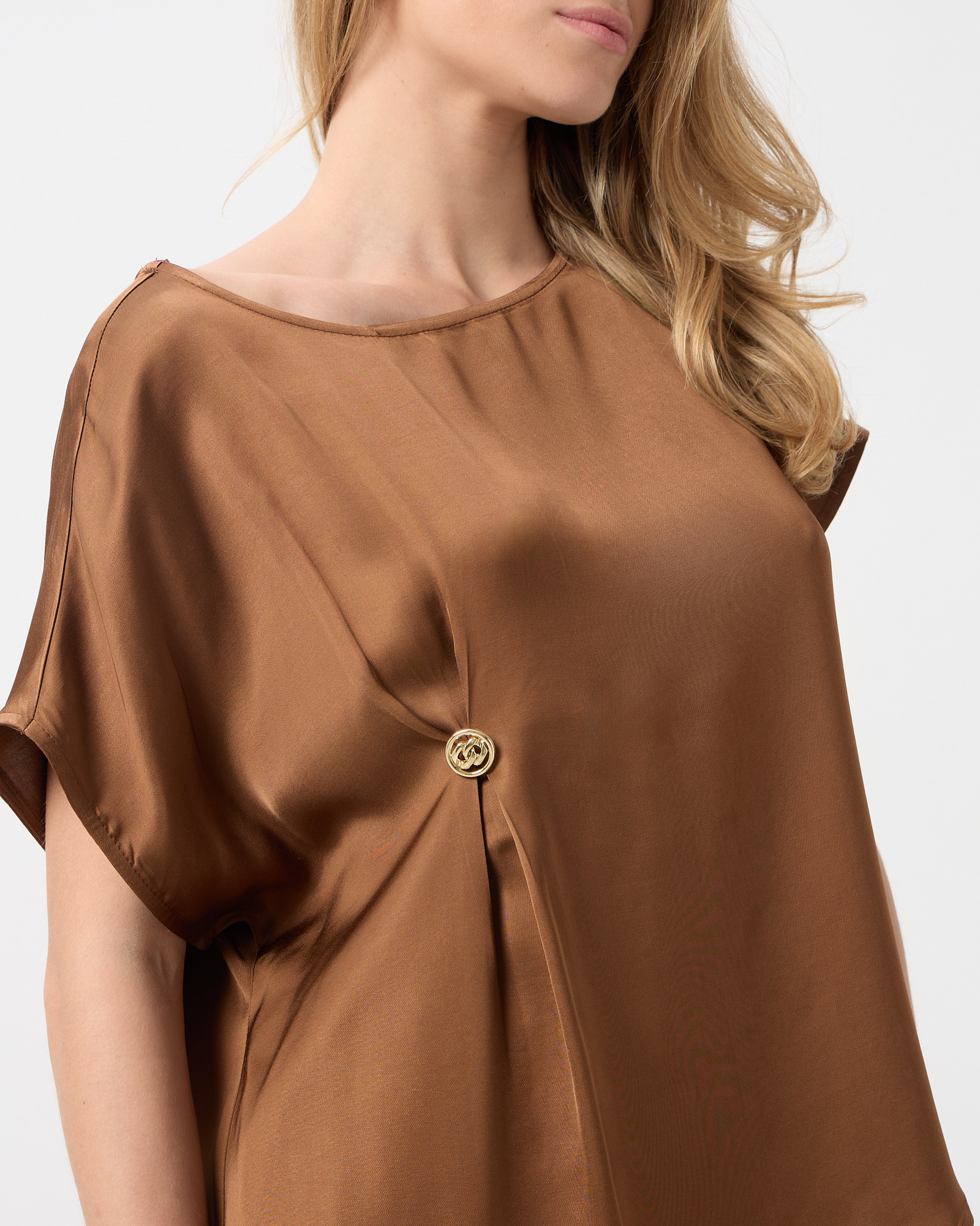 Μπλούζα κοντομάνικη με στρογγυλή λαιμόκοψη, δαικοσμητικό κουμπί στο πλάι, ασύμμετρο τελείωμα σε σατέν υφή, σε άνετη εφαρμογή