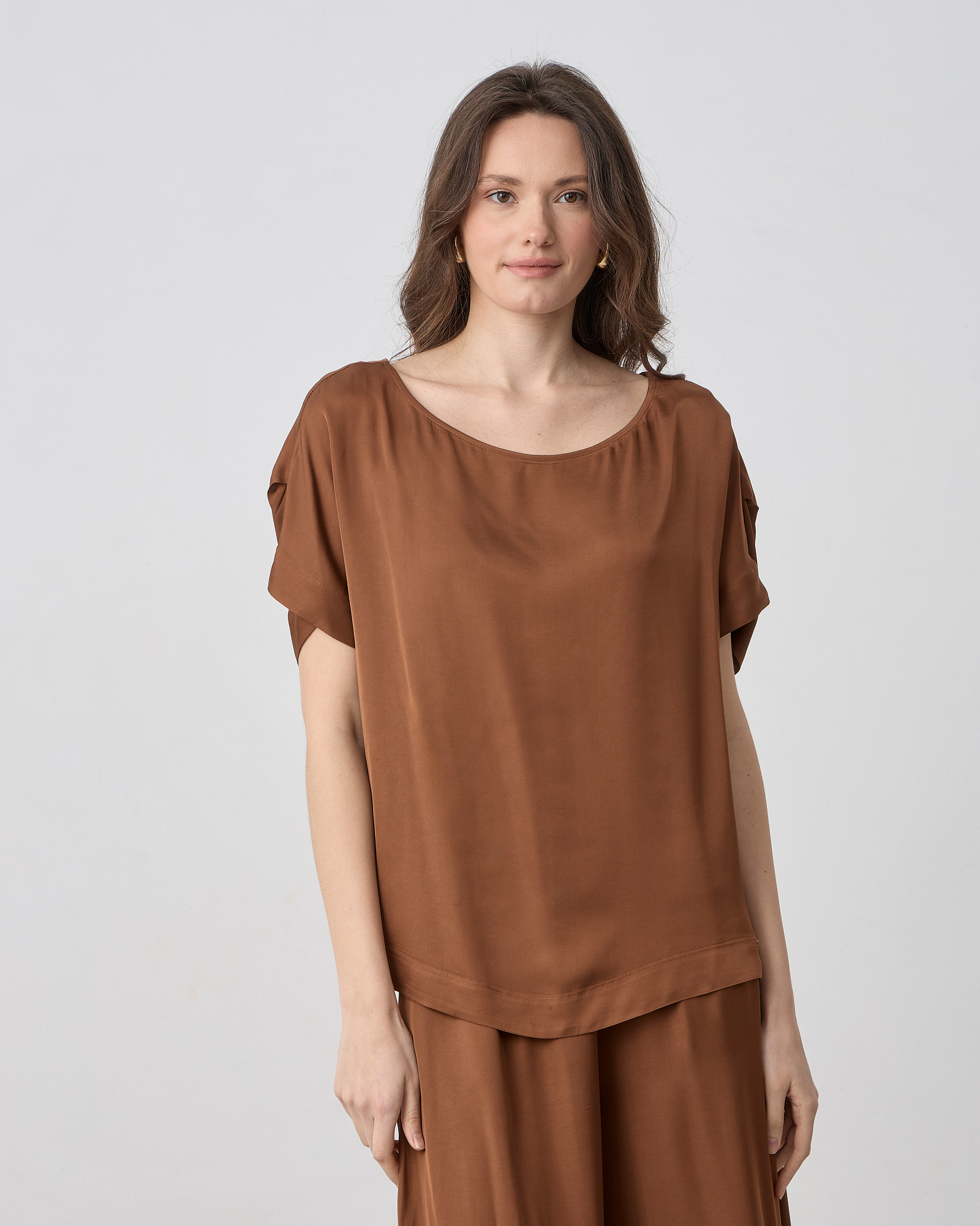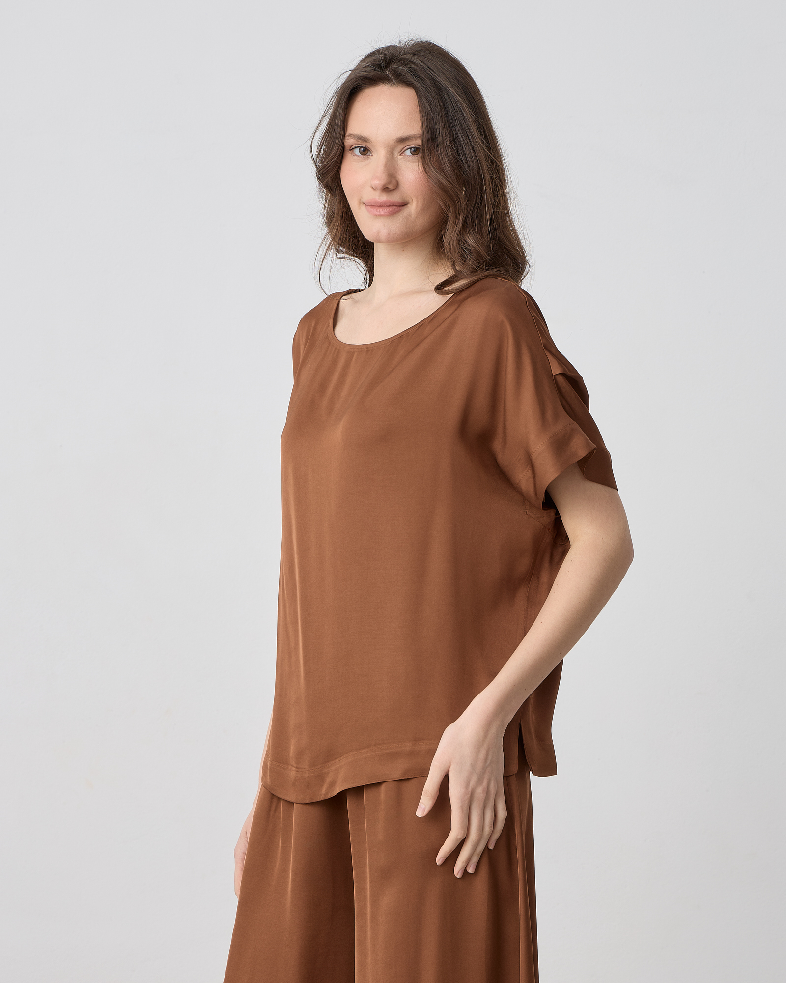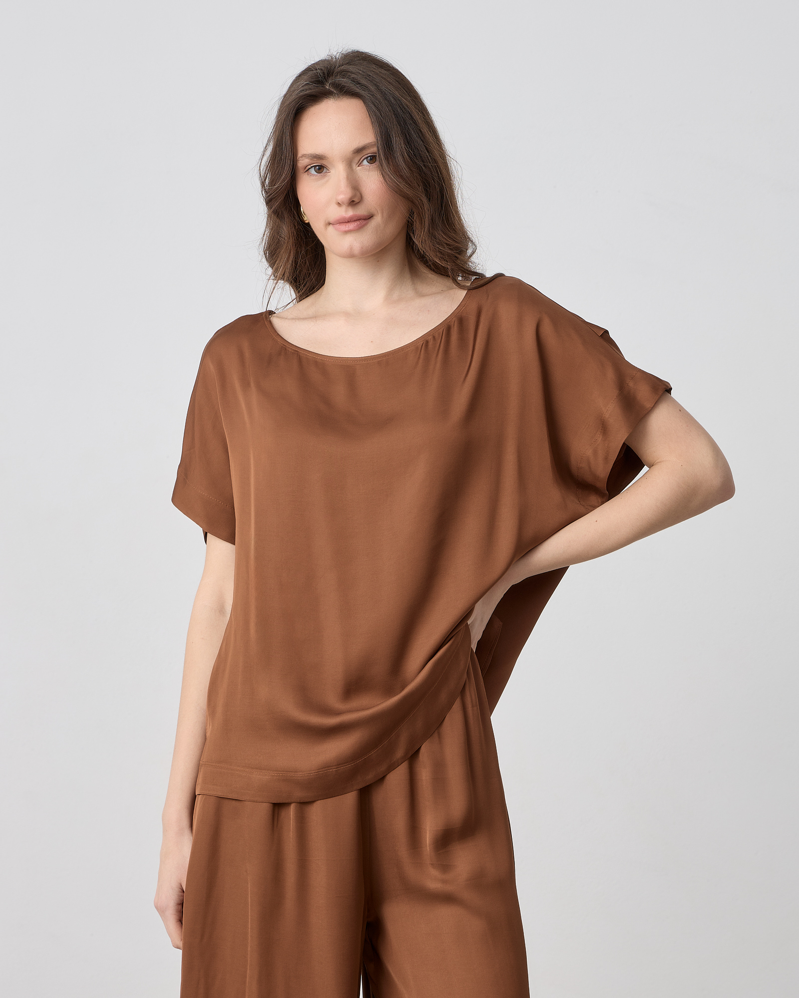 Μπλούζα κοντομάνικη με λαιμόκοψη χαμόγελο, σε σατέν βισκόζ ύφασμα σε άνετη γραμμή