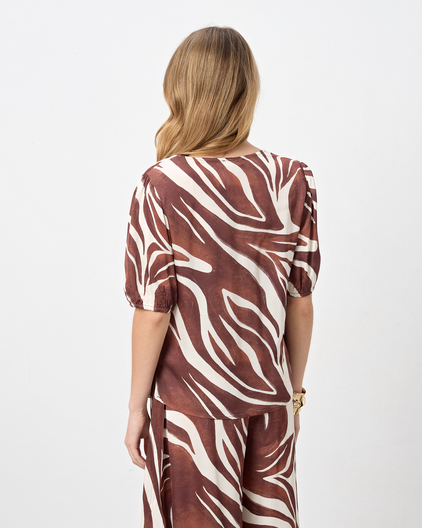 ΜπλούΖα με zebra print, V λαιμόκοψη με κοντό μανίκι με όγκο και λάστιχο στο τελείωμα, σε σατέν υφή, σε κανονική γραμμή
