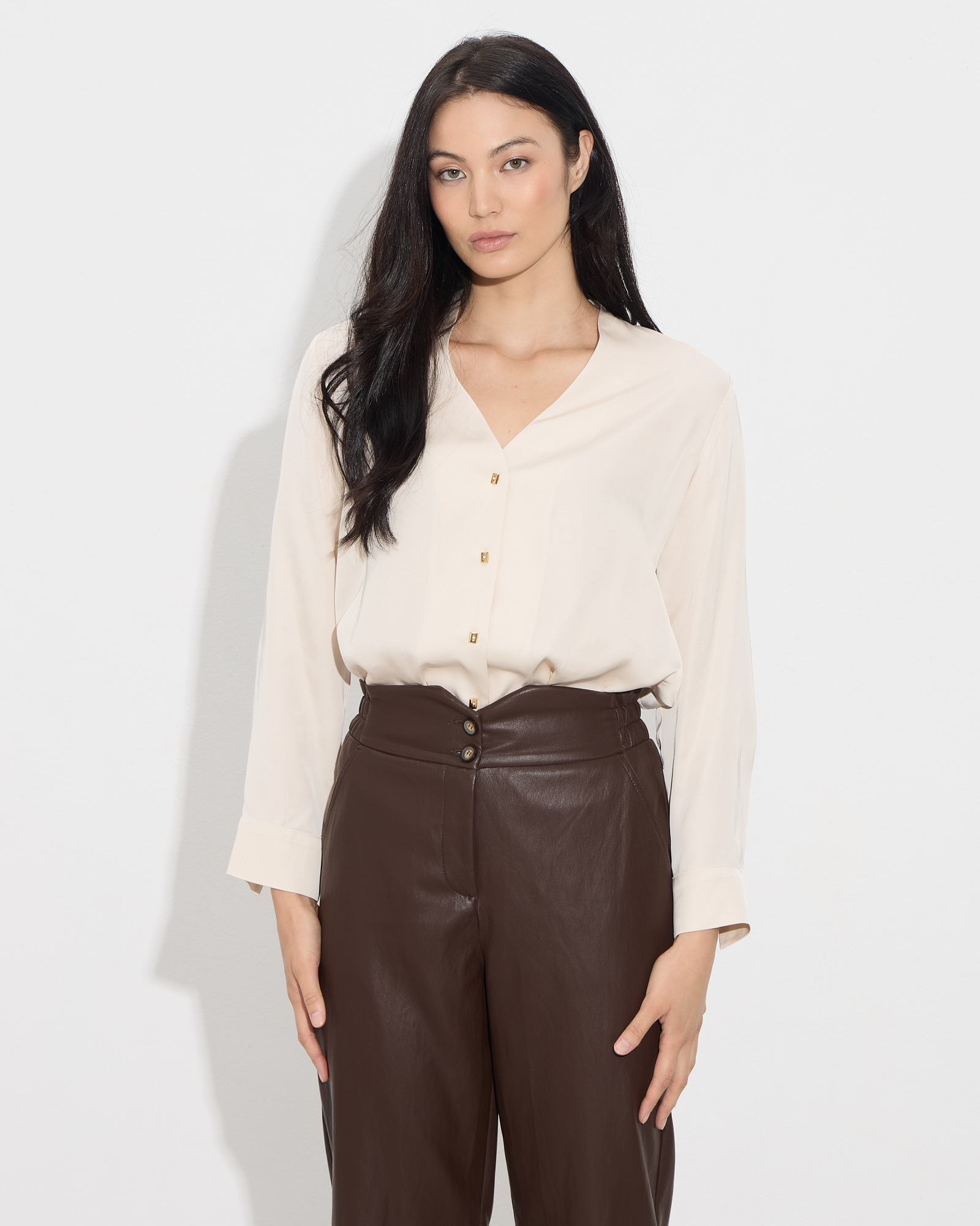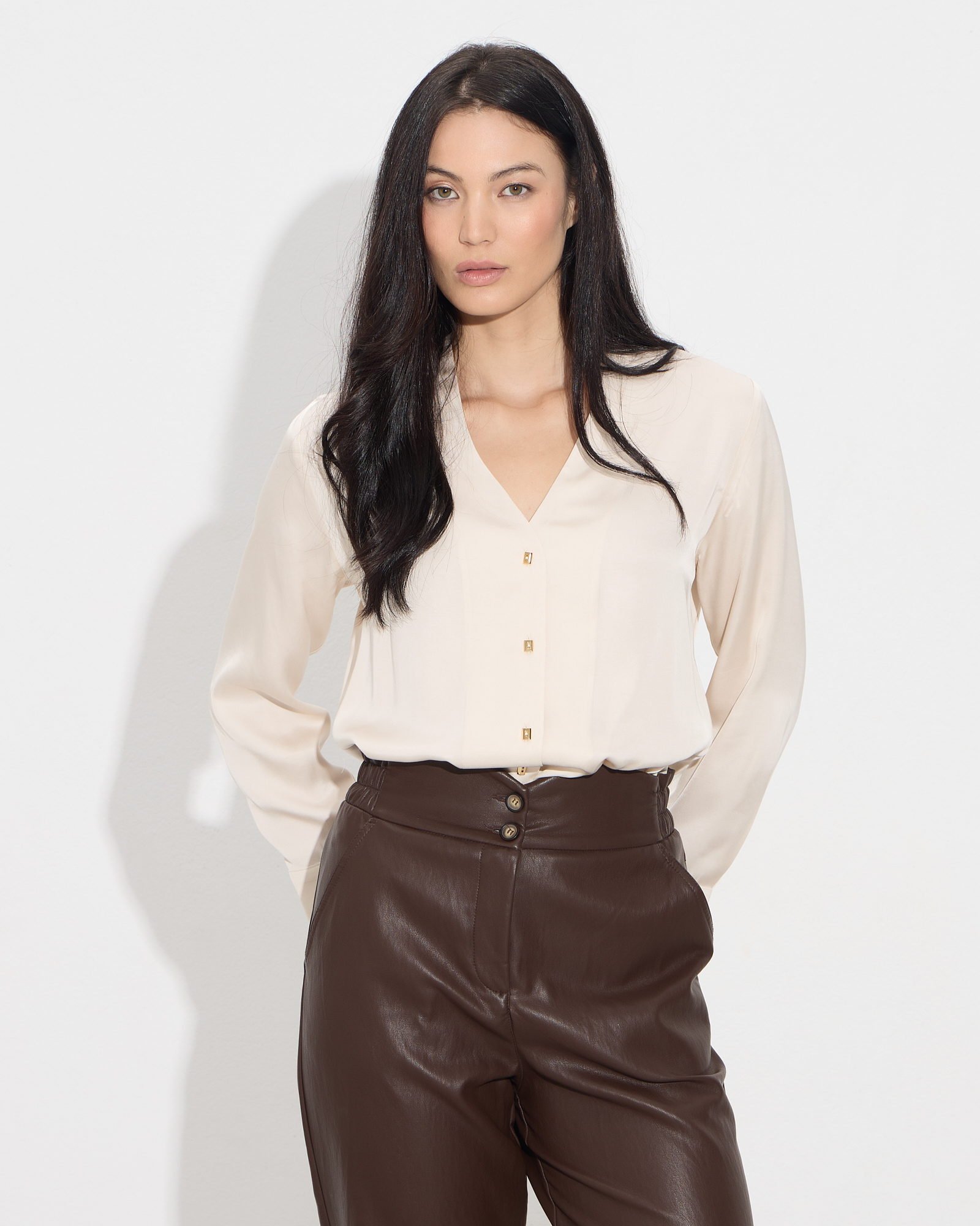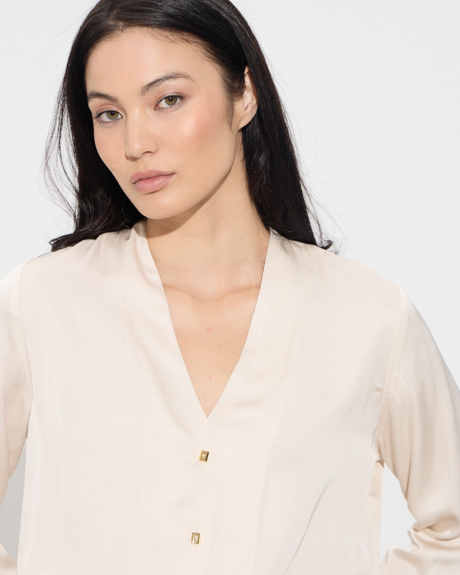 Πουκάμισο μακρυμάνικο με V λαιμόκοψη, μπροστινό κλείσιμο με κουμπιά, μανσέτα με κουμπί στα μανίκια σε σατέν-βισκόζ ύφασμα. σε κανονική γραμμή