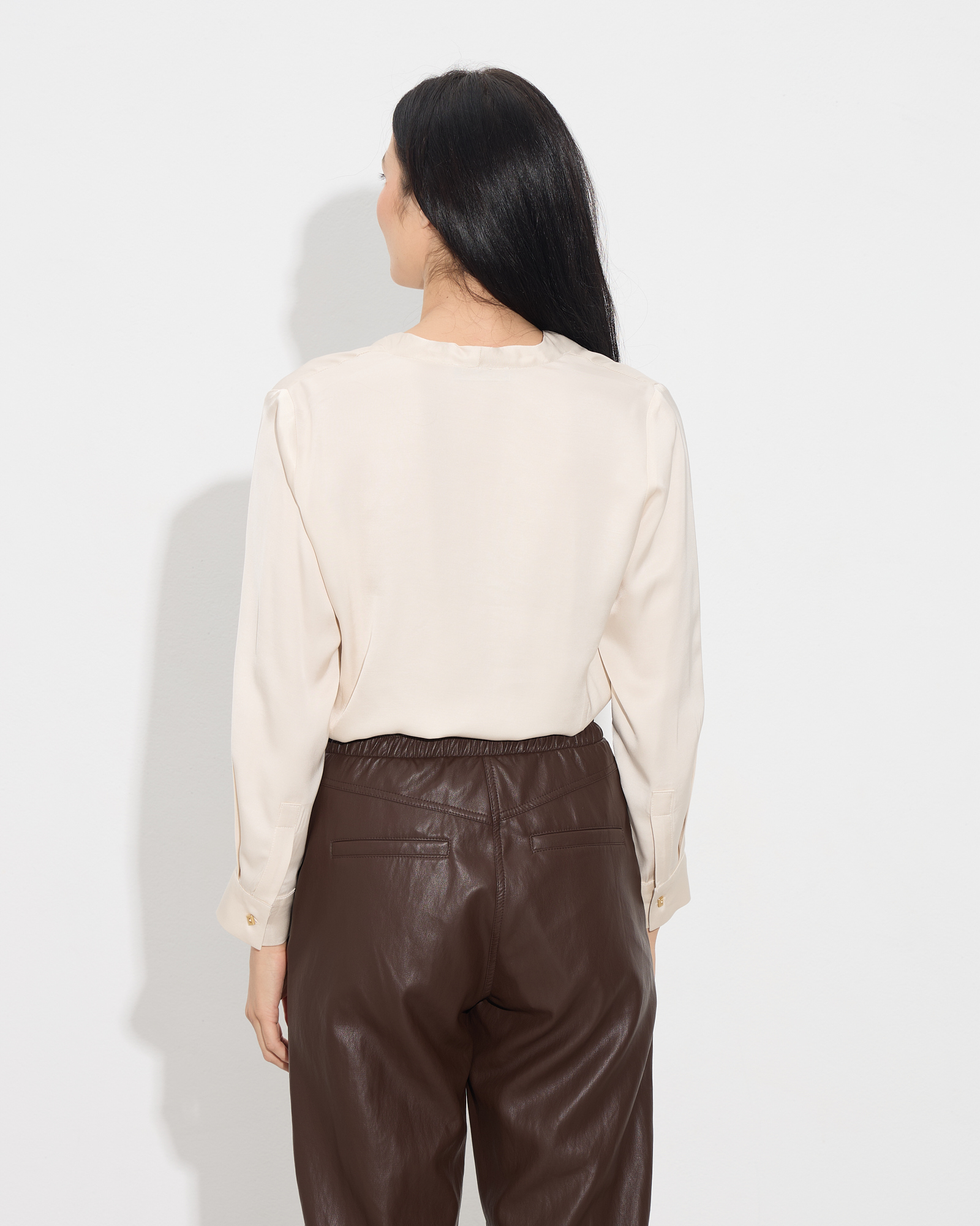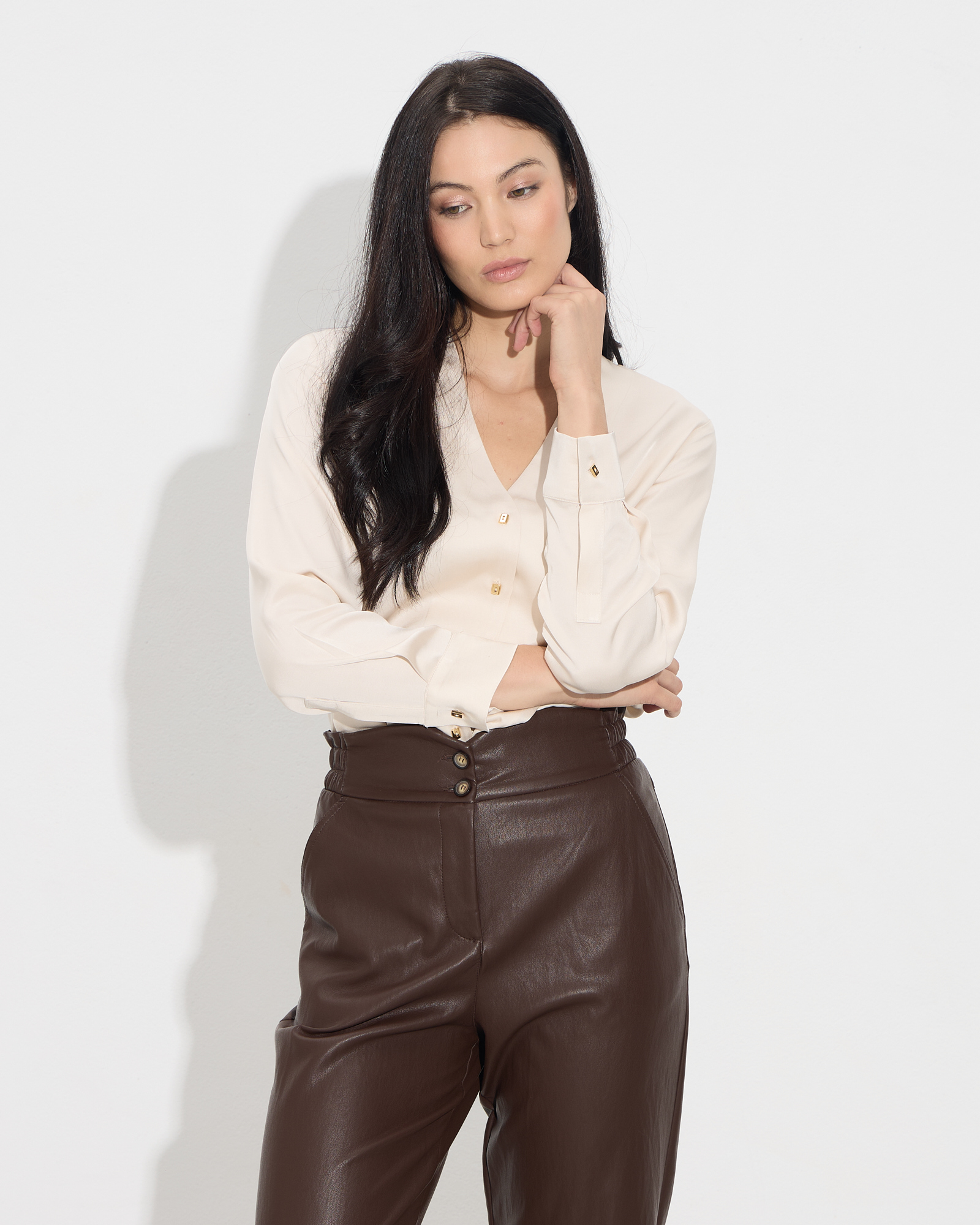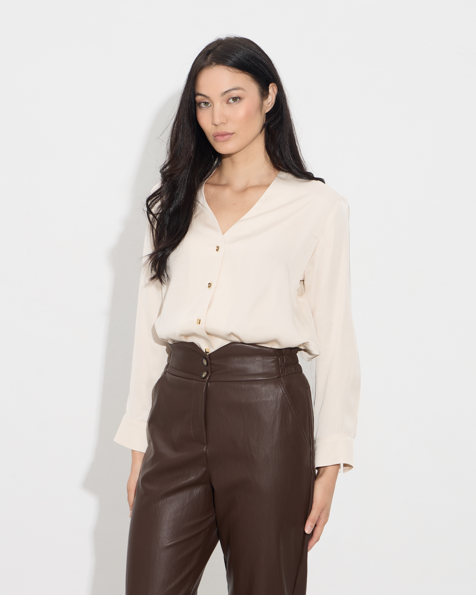 Πουκάμισο μακρυμάνικο με V λαιμόκοψη, μπροστινό κλείσιμο με κουμπιά, μανσέτα με κουμπί στα μανίκια σε σατέν-βισκόζ ύφασμα. σε κανονική γραμμή