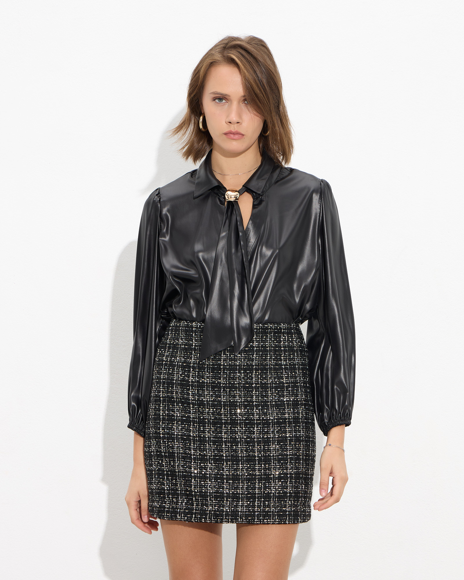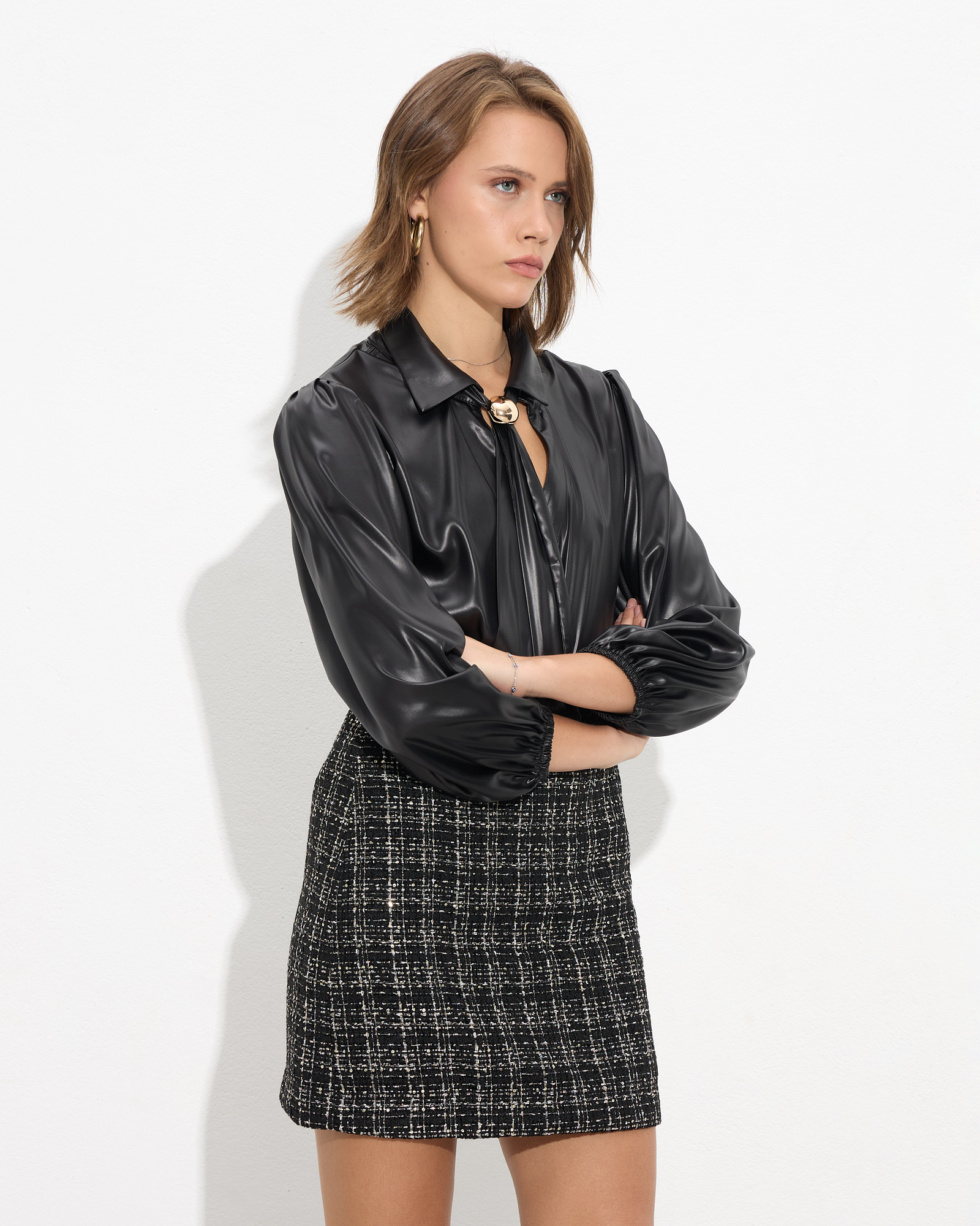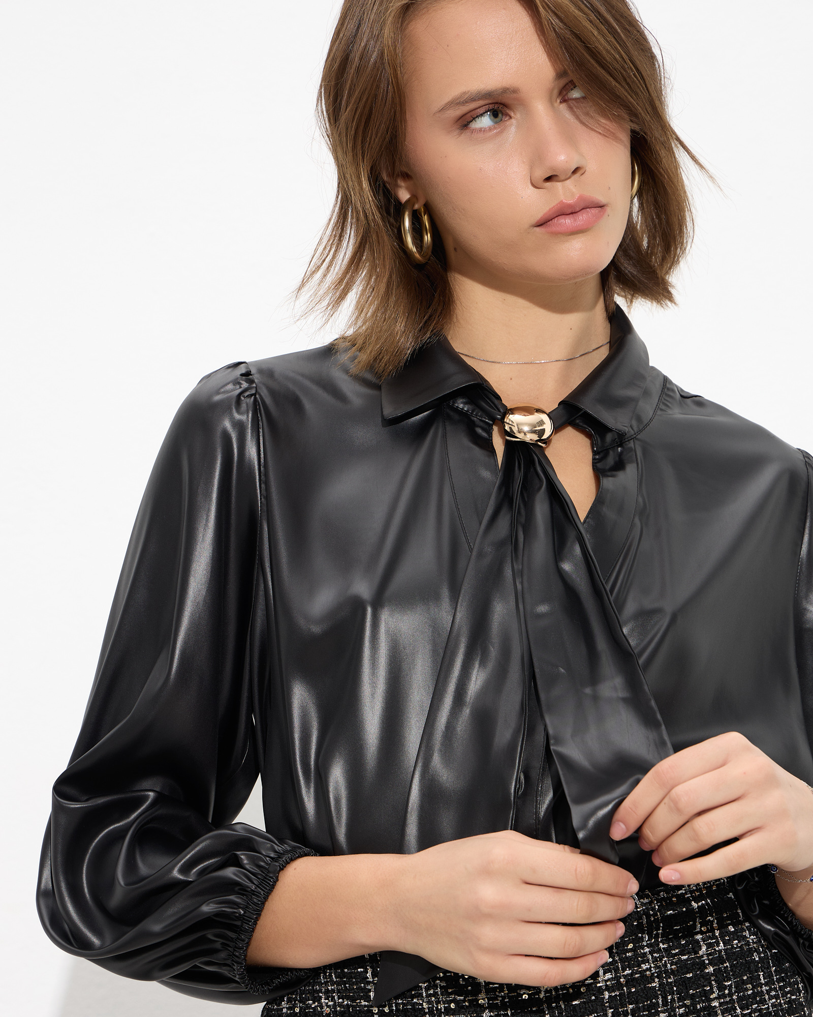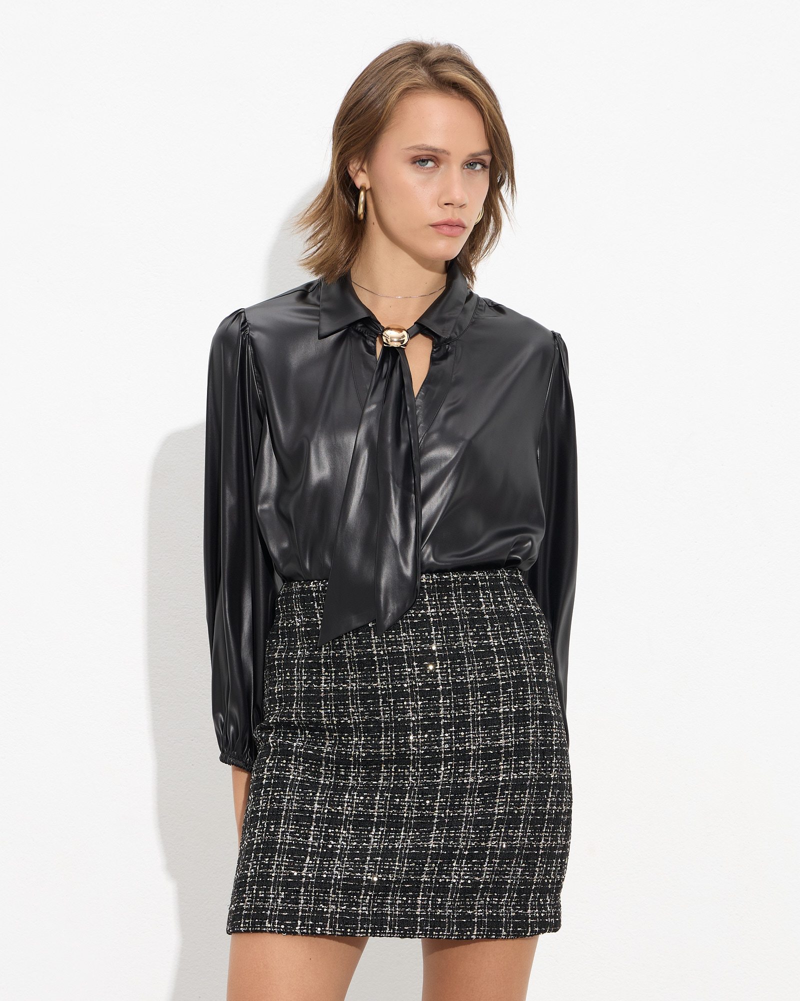 Πουκάμισο με κλασικό γιακά και αποσπώμενη γραβάτα με μεταλλικό διακοσμητικό, κλείσιμο με κουμπιά μπροστά, μακρύ μανίκι με λάστιχο στο τελείωμα,εφέ δερματίνης σε άνετη γραμμή
