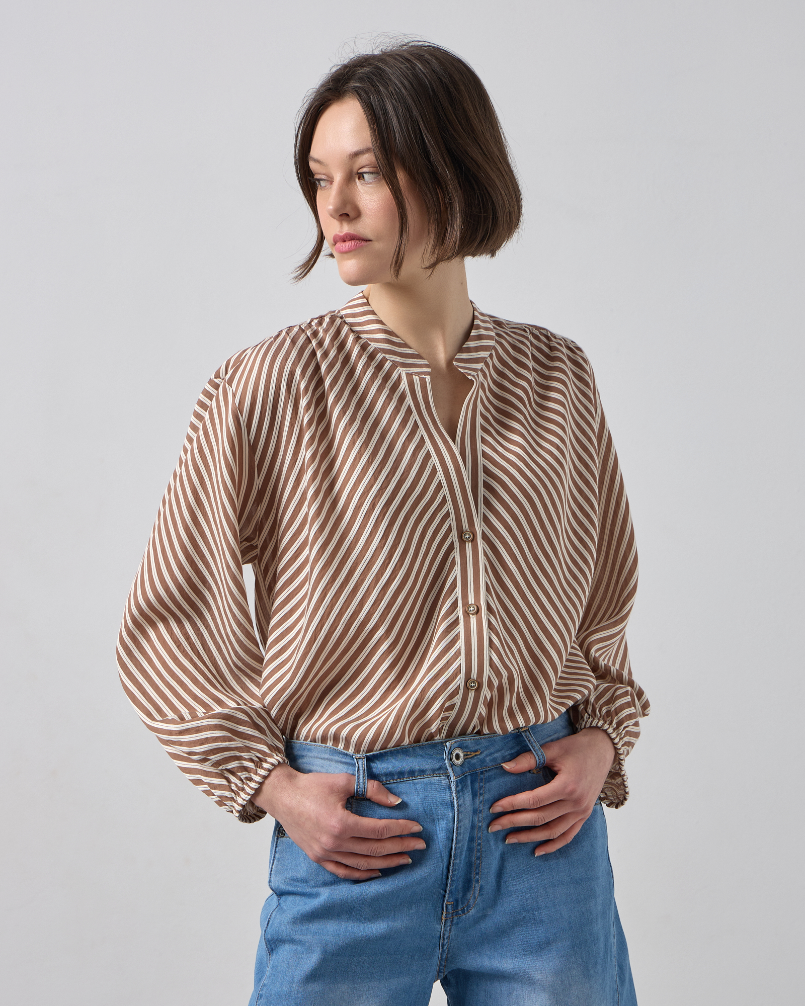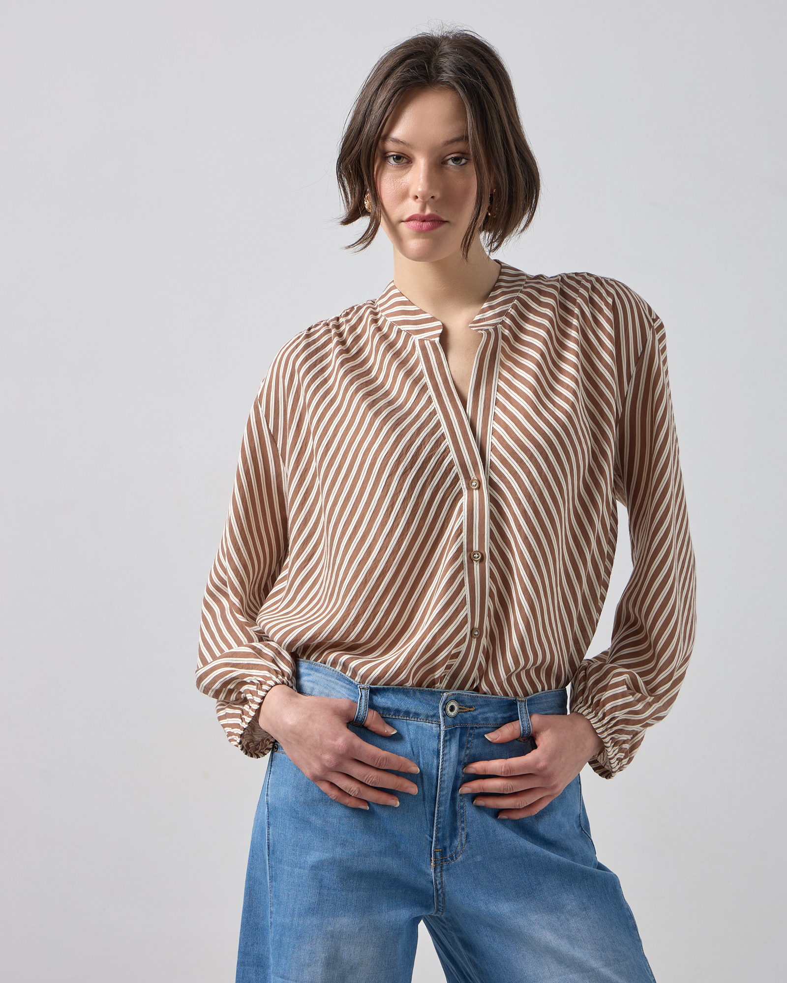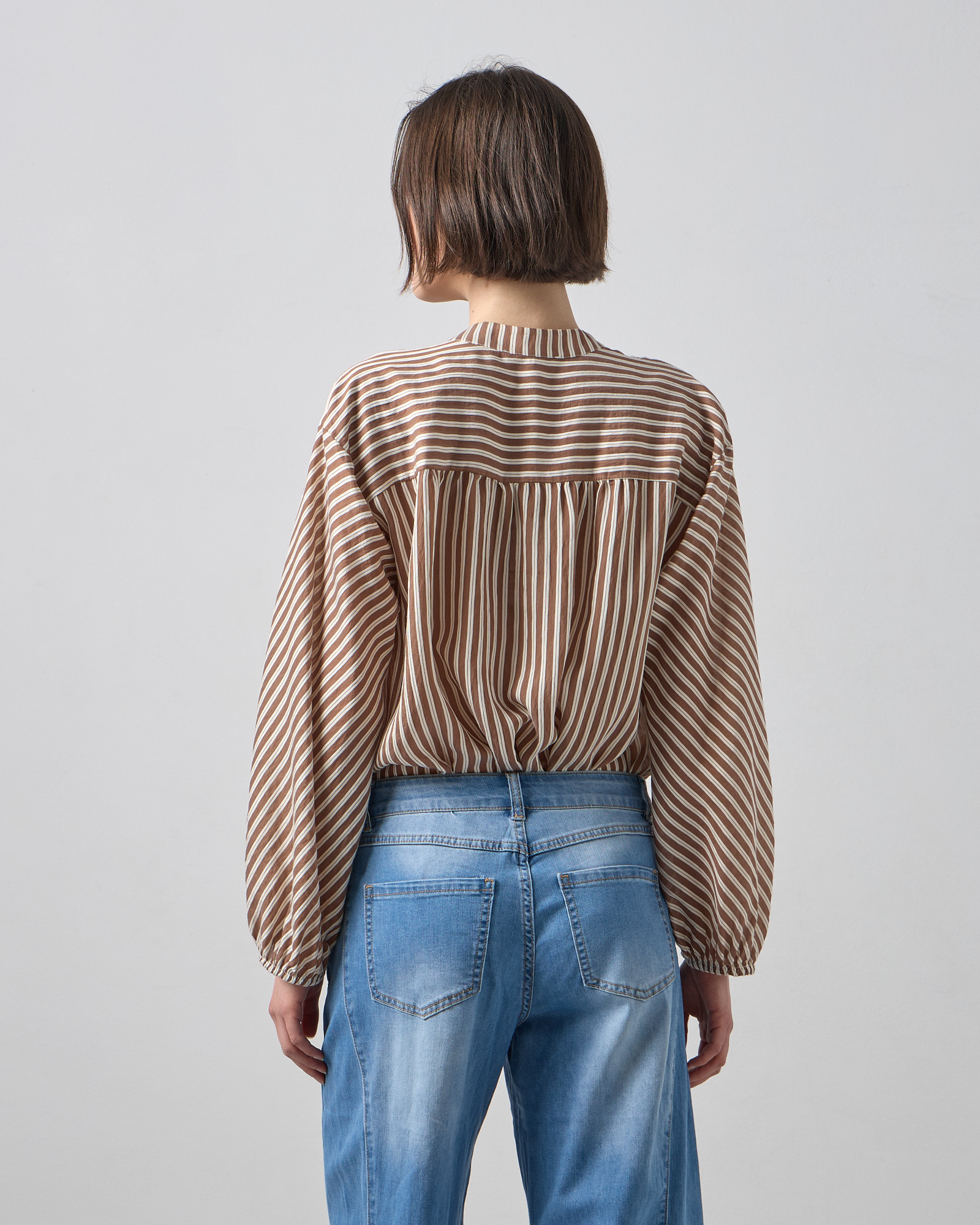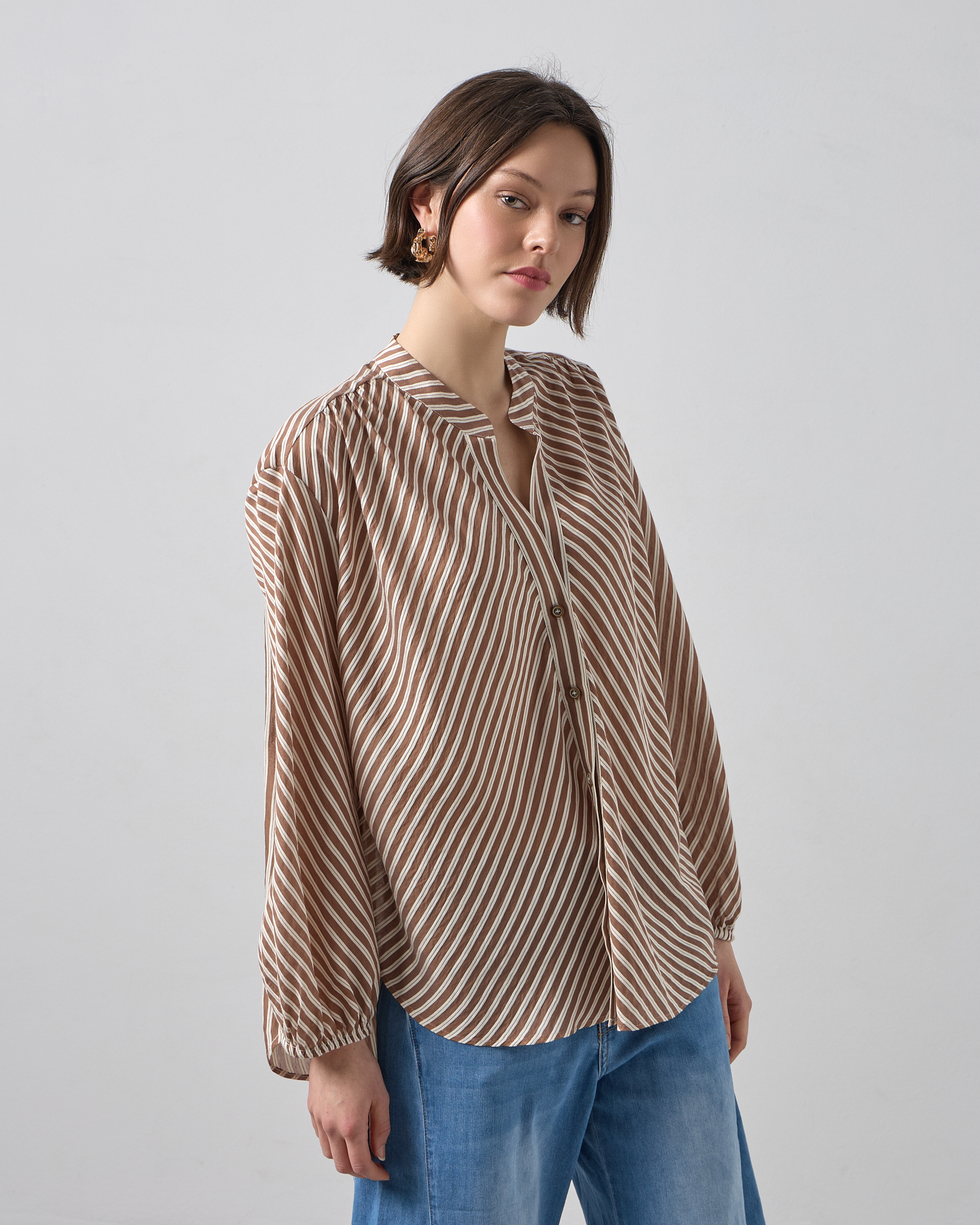 Πουκαμίσα ριγέ με μακρύ μανίκι, λάστιχο στο τελείωμα του, μάο γιακάς με V άνοιγμα. σε αέρινο ύφασμα, άνετη γραμμή