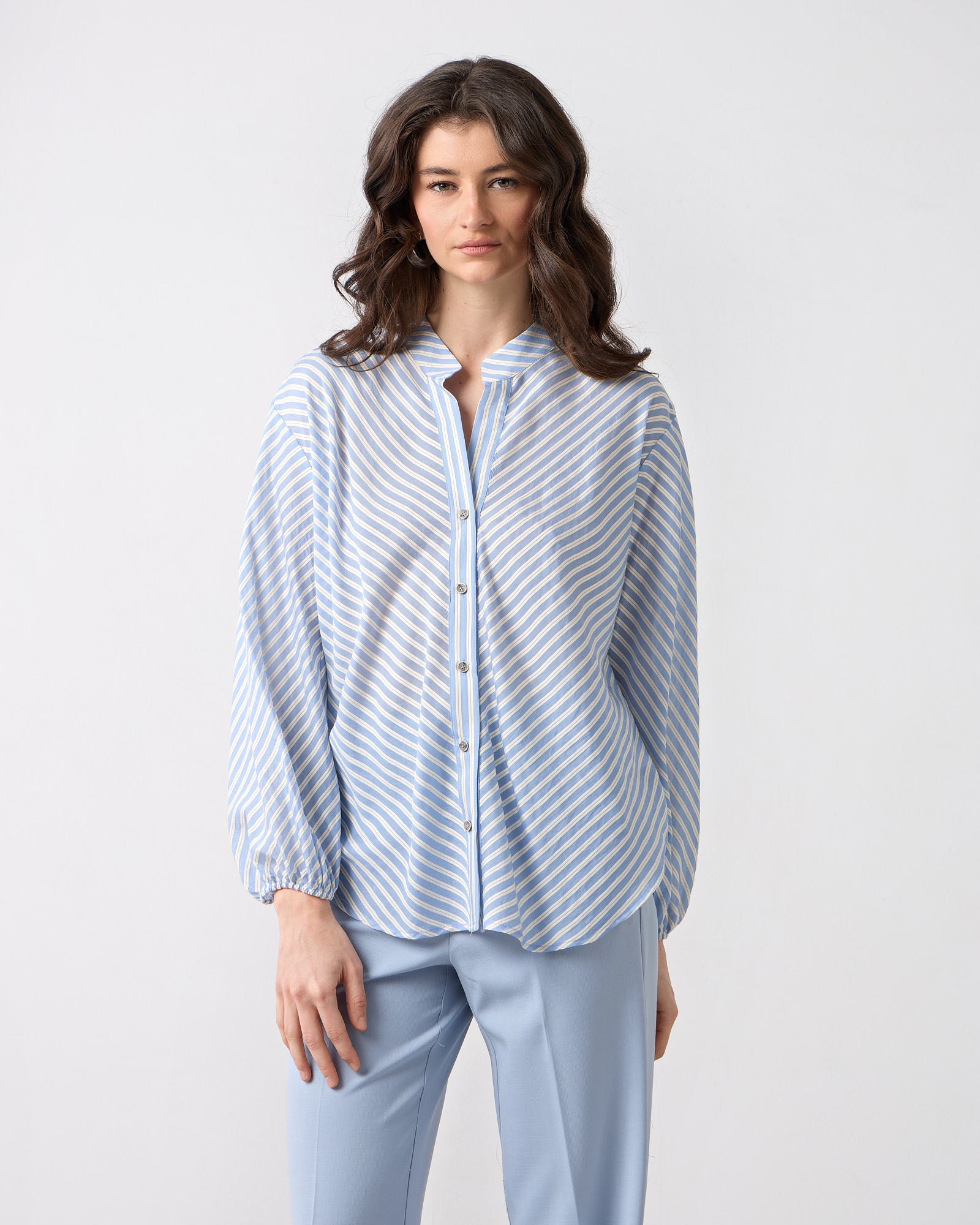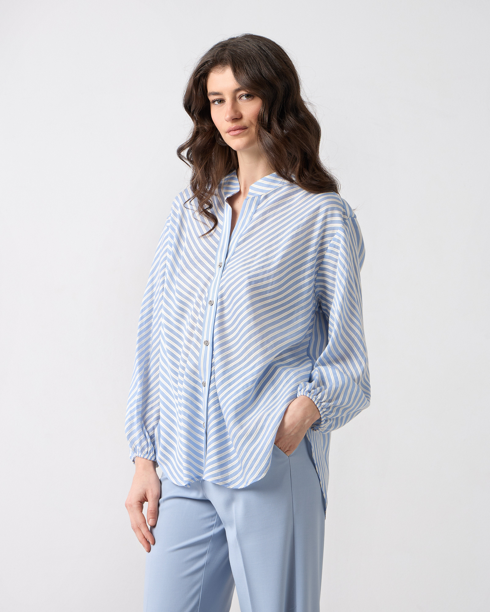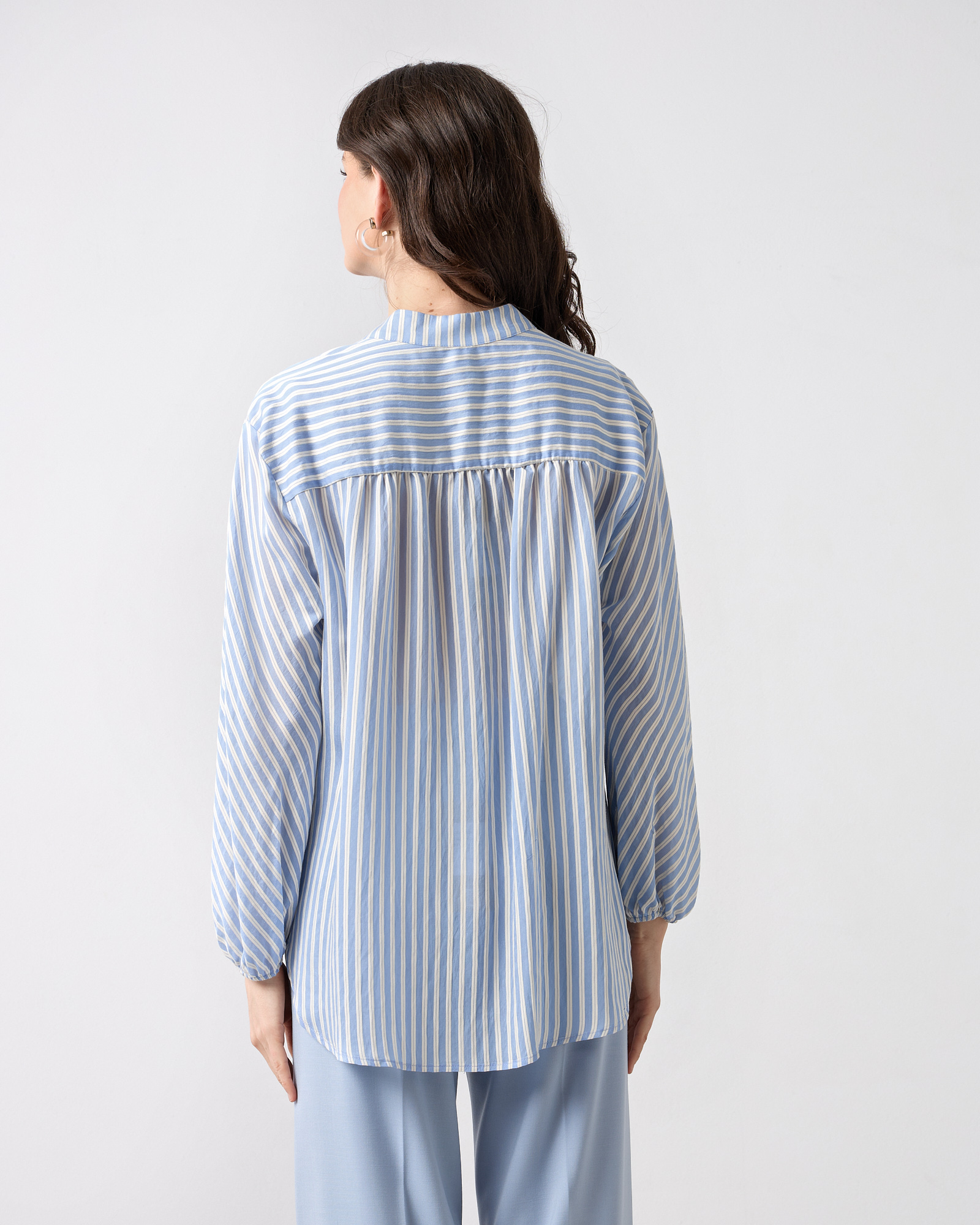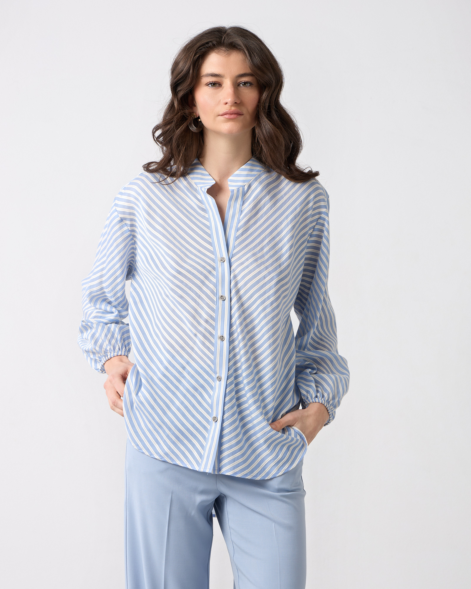 Πουκαμίσα ριγέ με μακρύ μανίκι, λάστιχο στο τελείωμα του, μάο γιακάς με V άνοιγμα. σε αέρινο ύφασμα, άνετη γραμμή