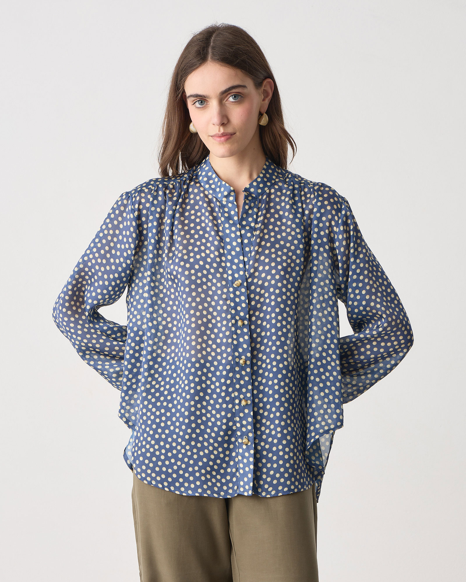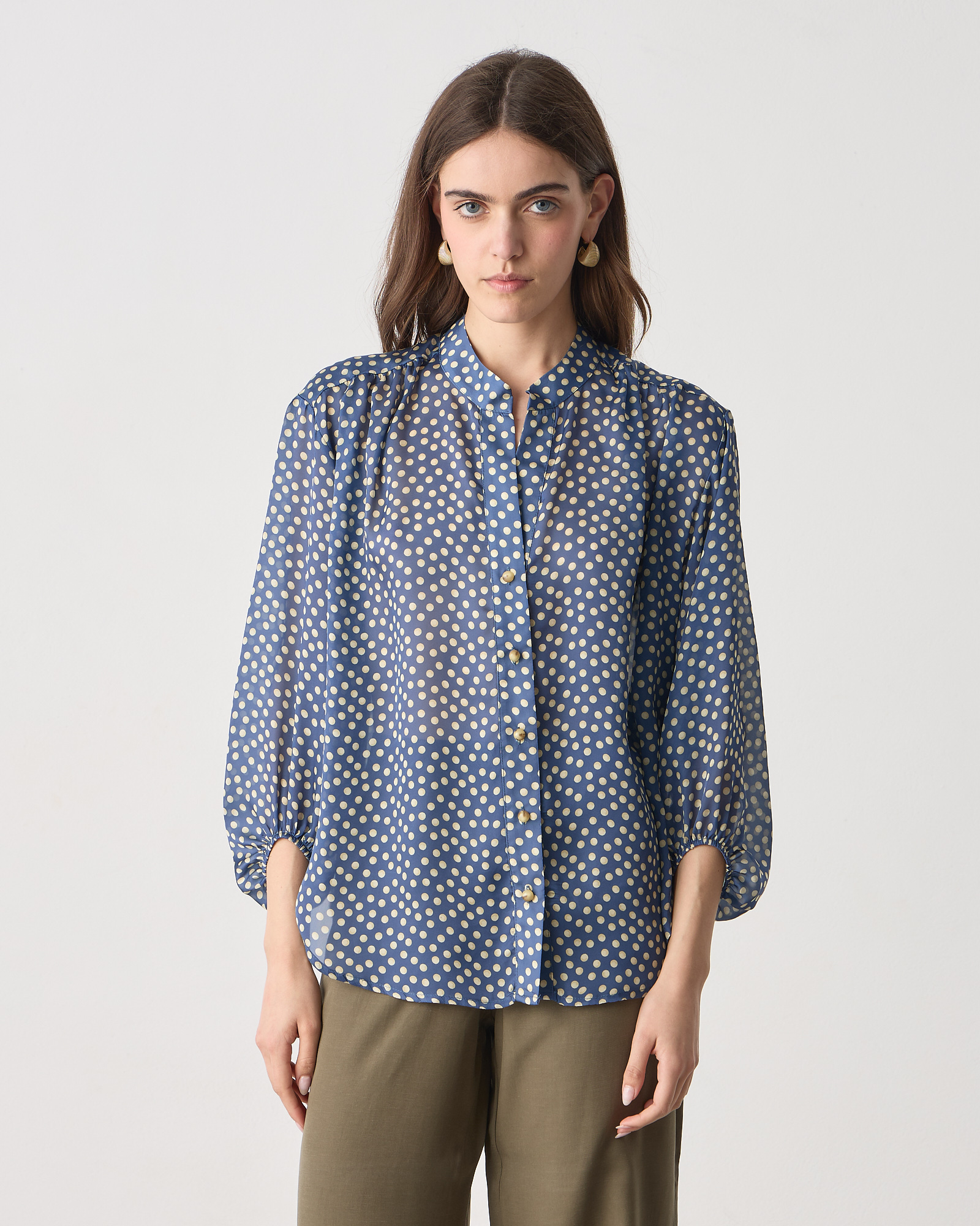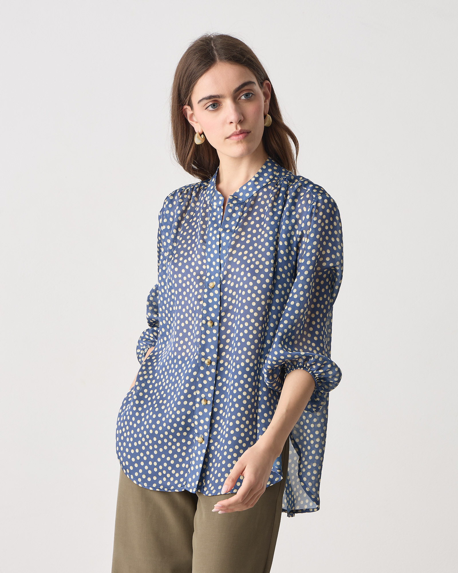 Πουκάμισο πουά με μάο γιακά, κλείσιμο μπροστά με κουμπιά μακρύ μανίκι που καταλήγει σε λάστιχο, σε άνετη γραμμή