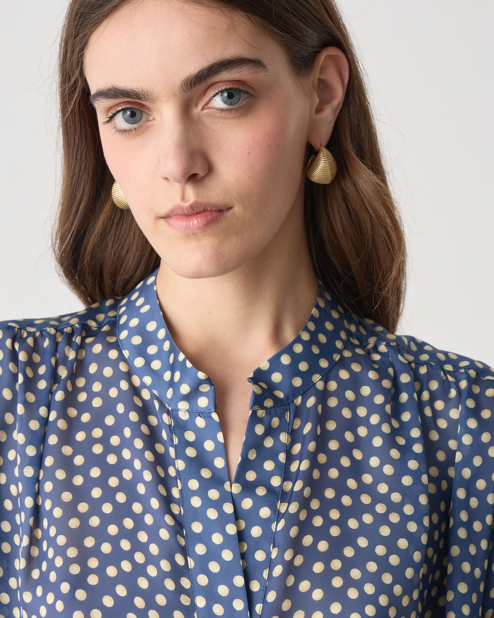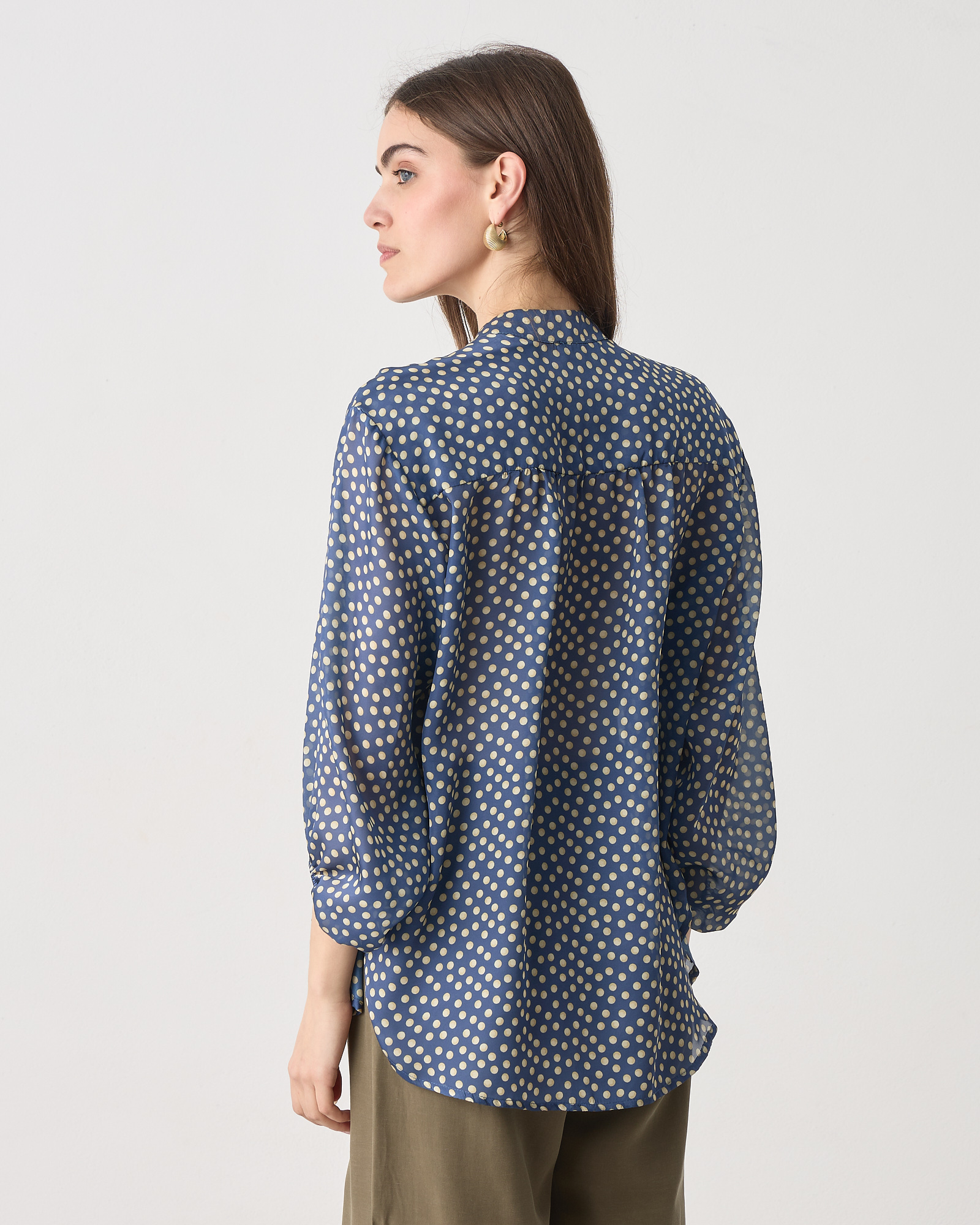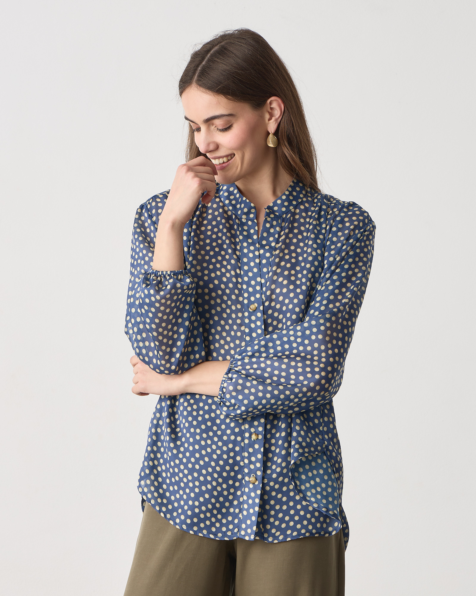 Πουκάμισο πουά με μάο γιακά, κλείσιμο μπροστά με κουμπιά μακρύ μανίκι που καταλήγει σε λάστιχο, σε άνετη γραμμή