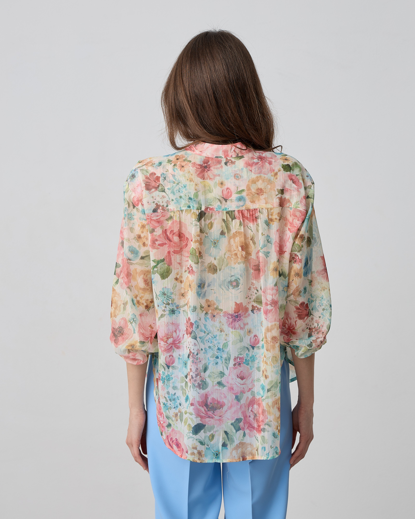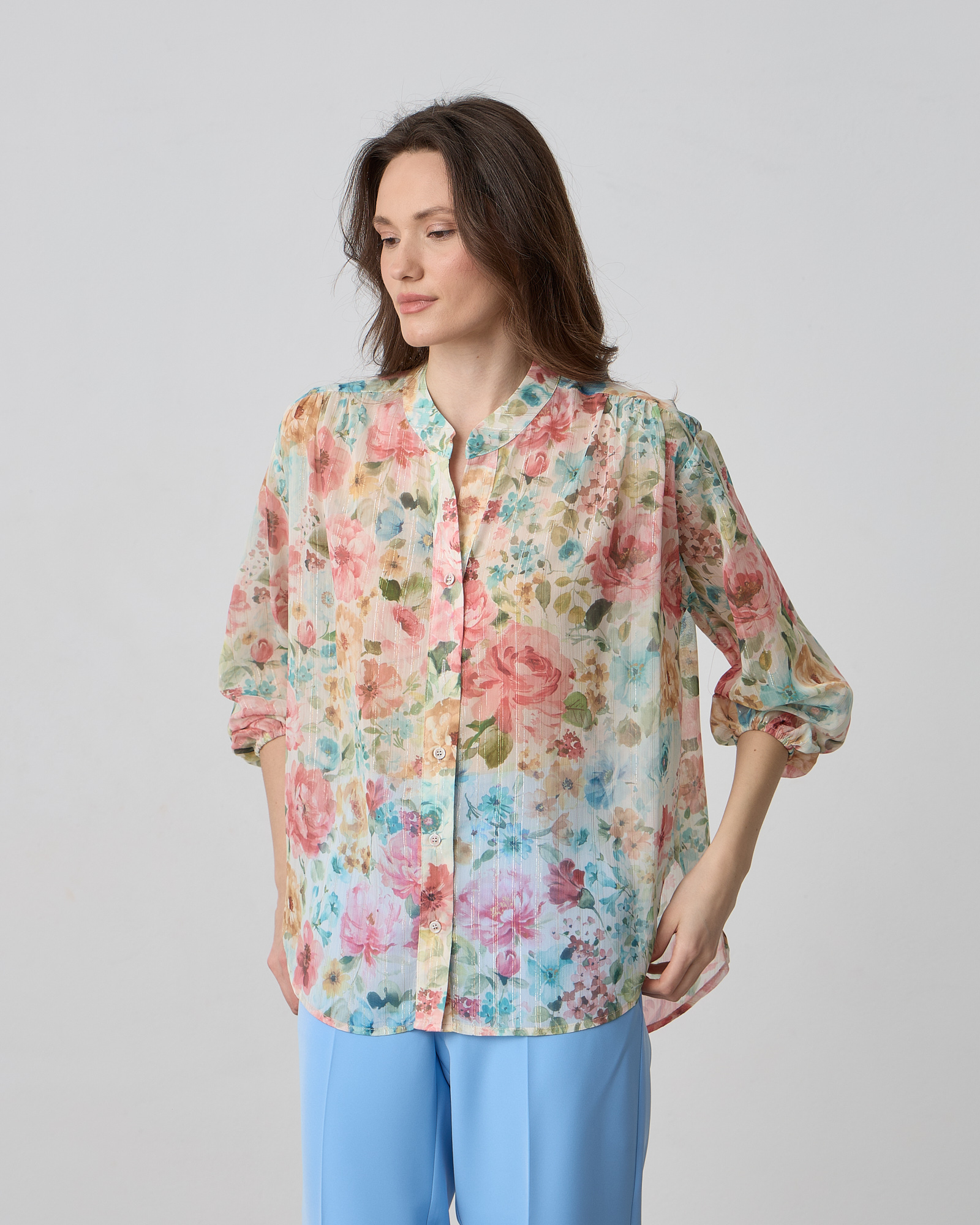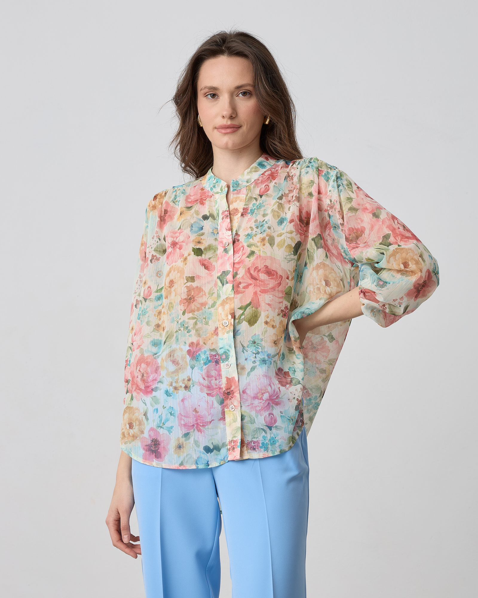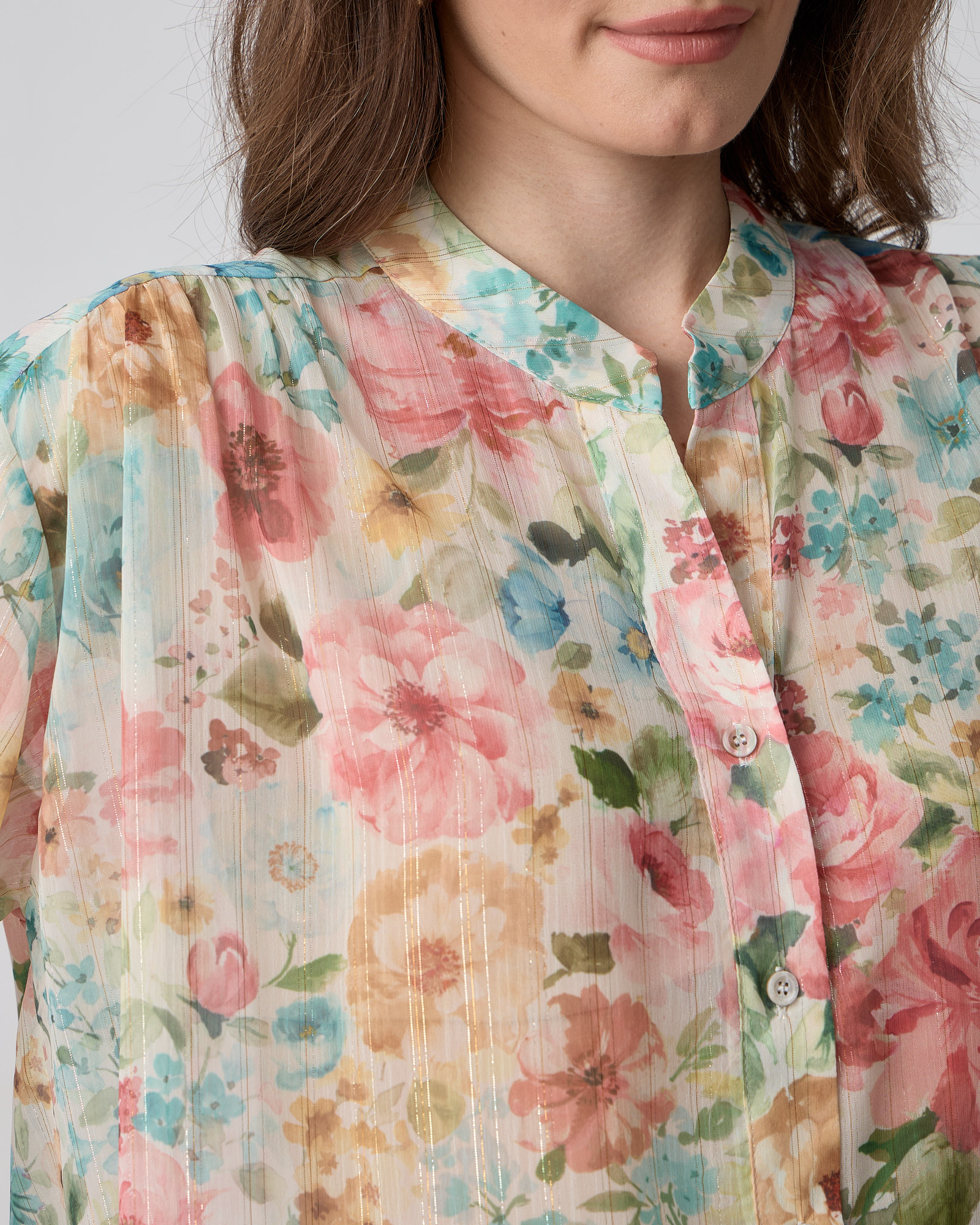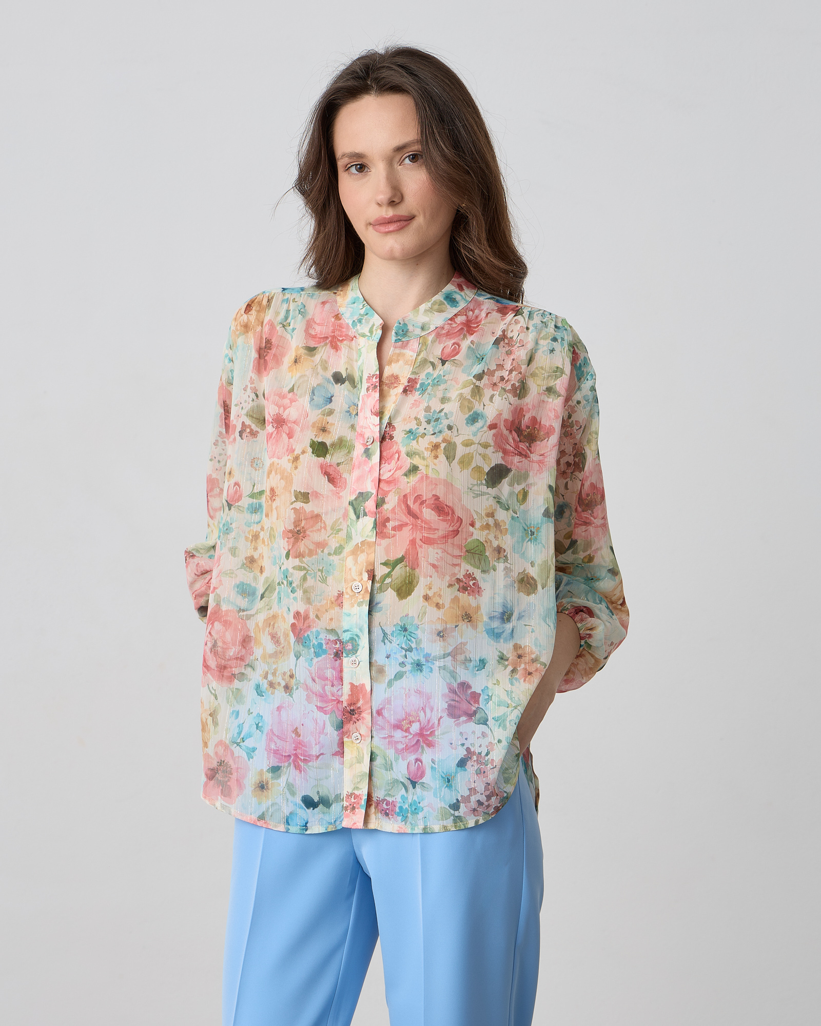 Πουκάμισο φλοράλ με μάο γιακά, κλείσιμο μπροστά με κουμπιά, μακρύ μανίκι που καταλήγει σε λάστιχο, σε άνετη γραμμή
