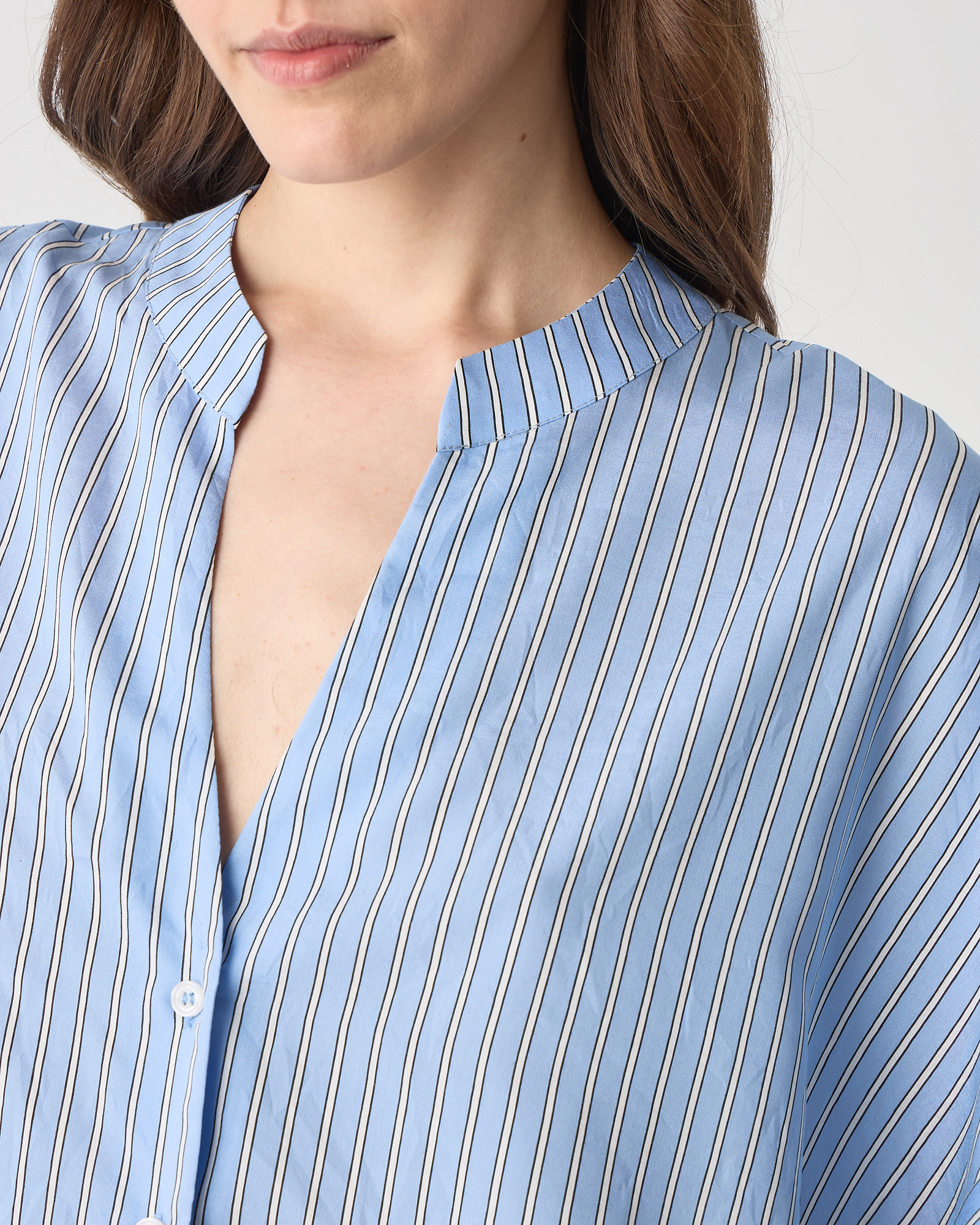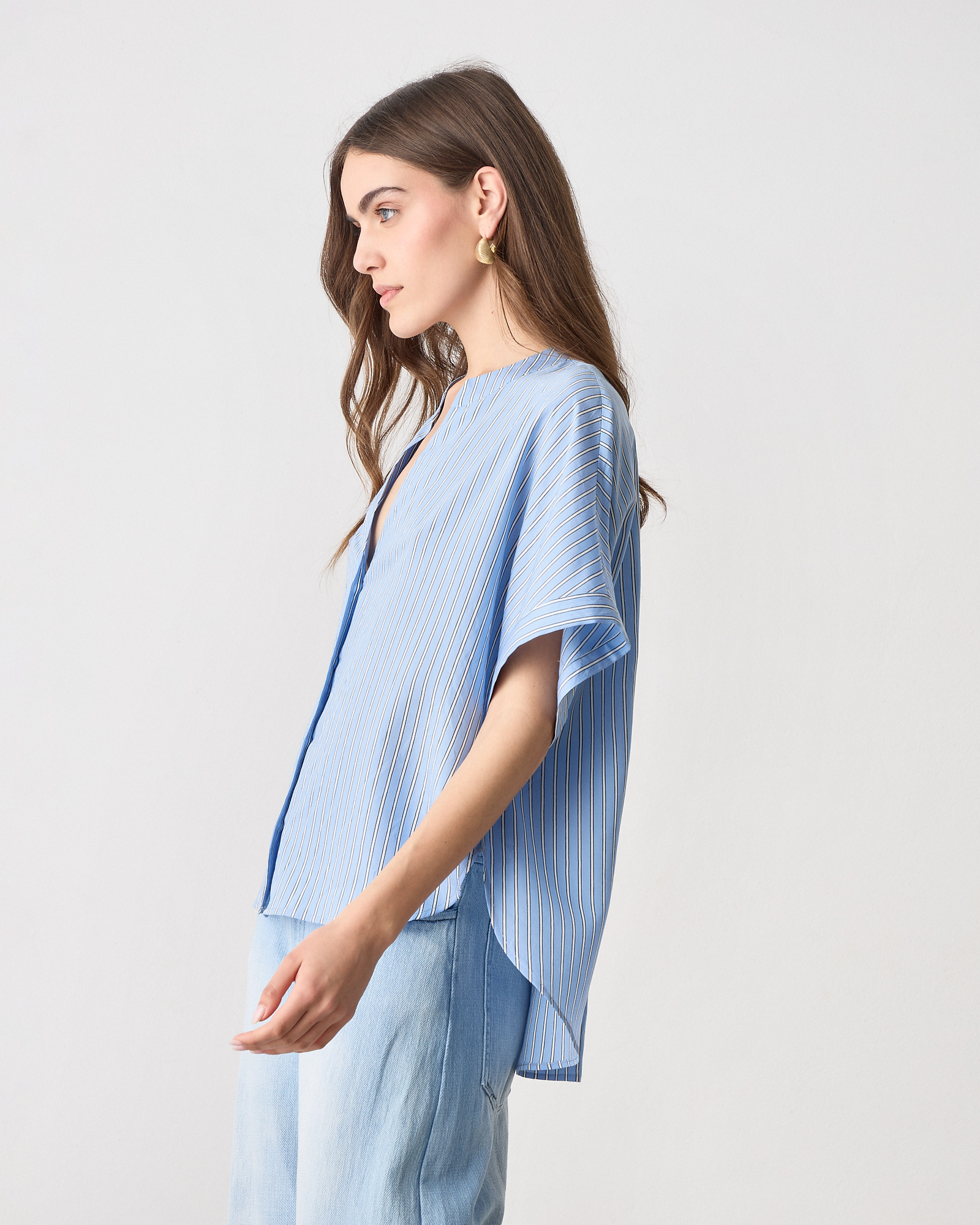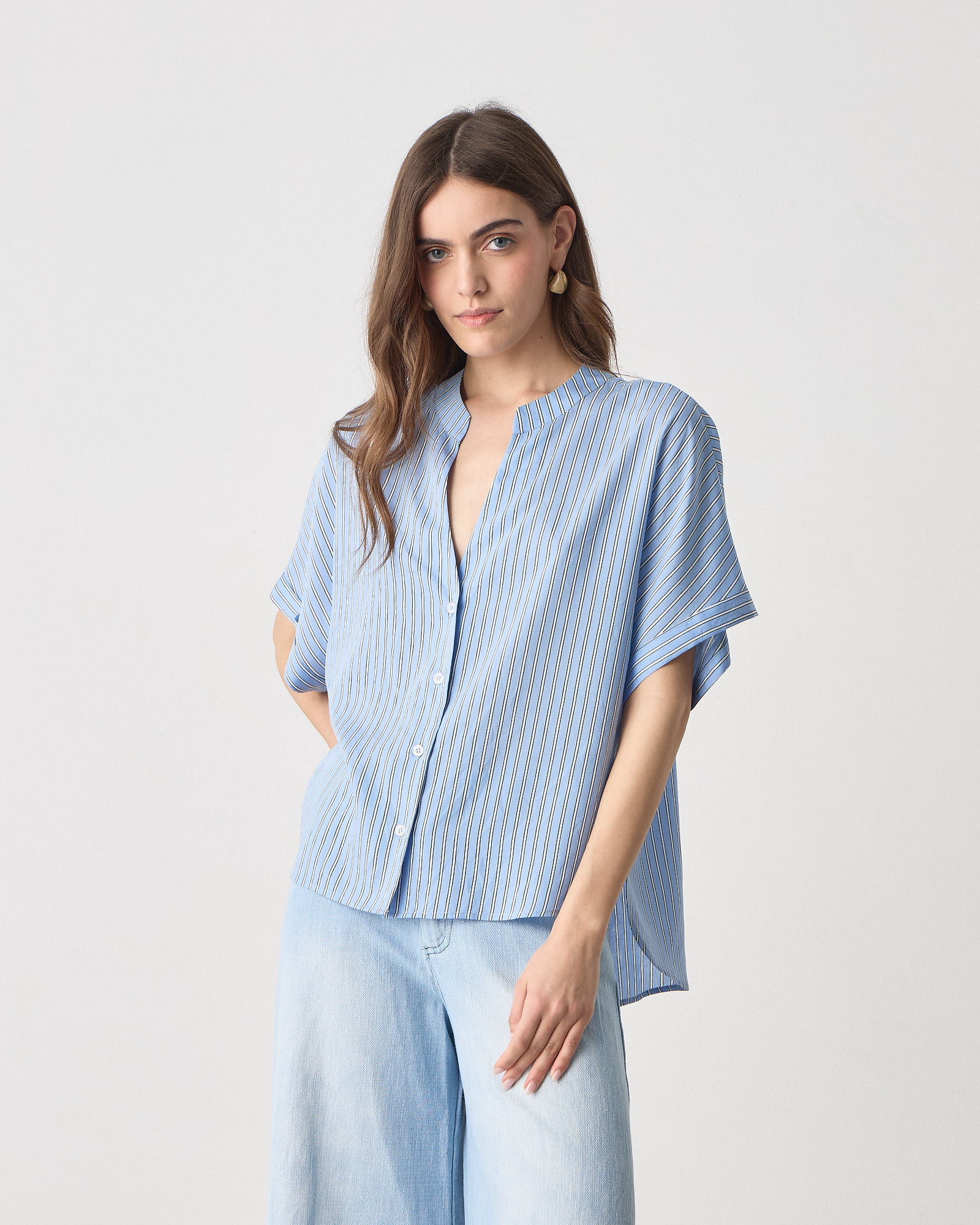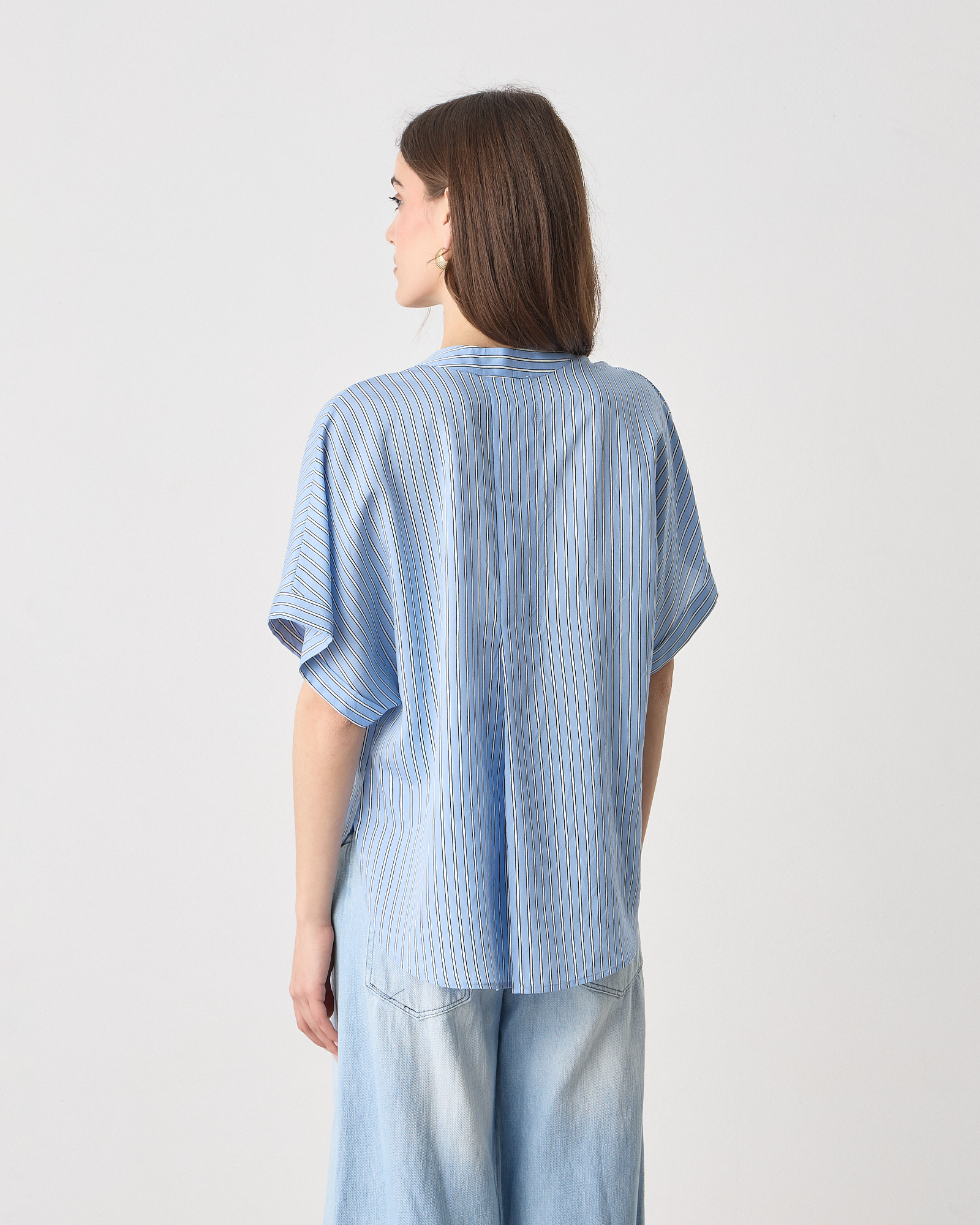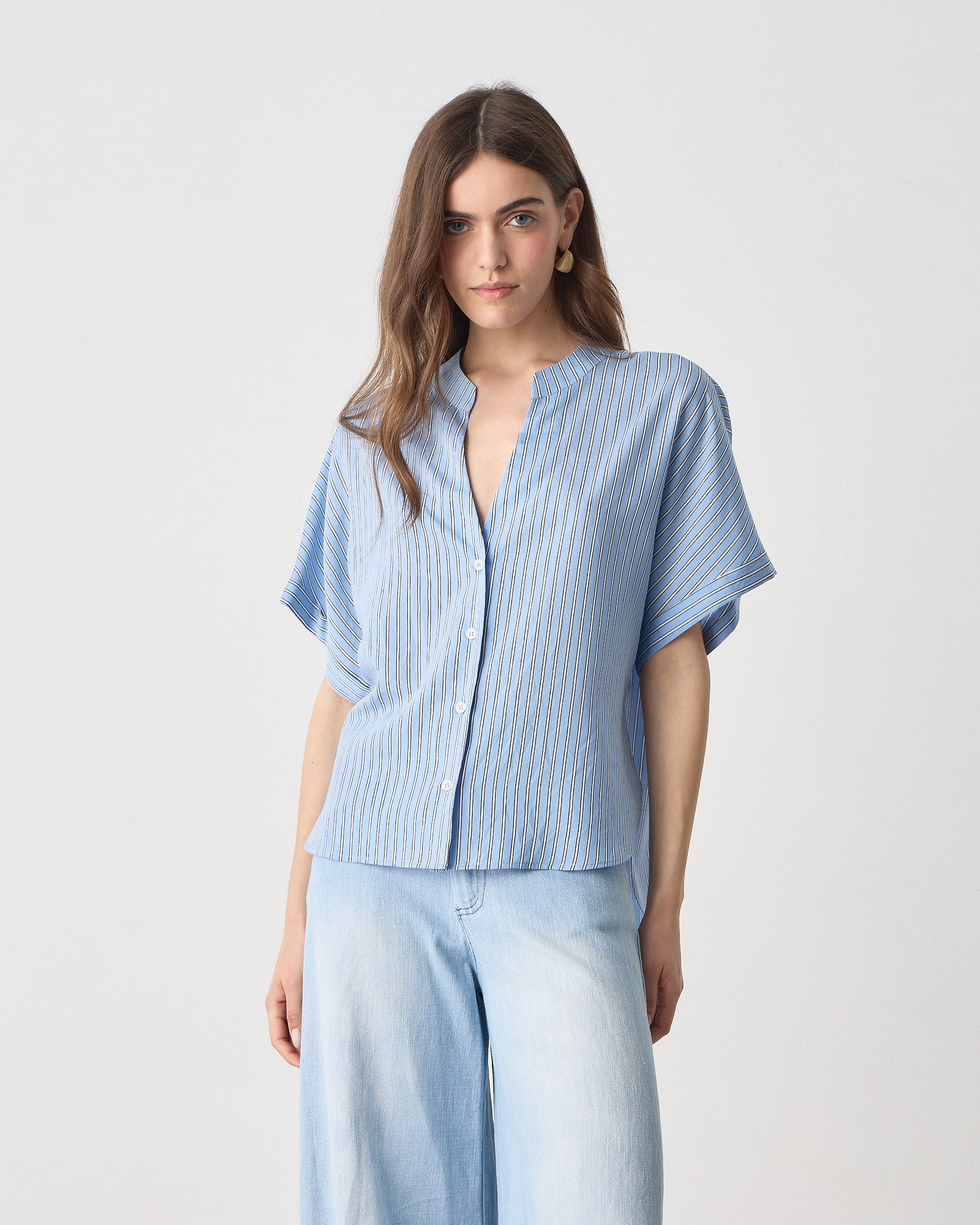 Πουκάμισο ριγέ με V λαιμόκοψη, κοντό μανίκι, κλείσιμο μπροστά με κουμπιά σε άνετη εφαρμογή