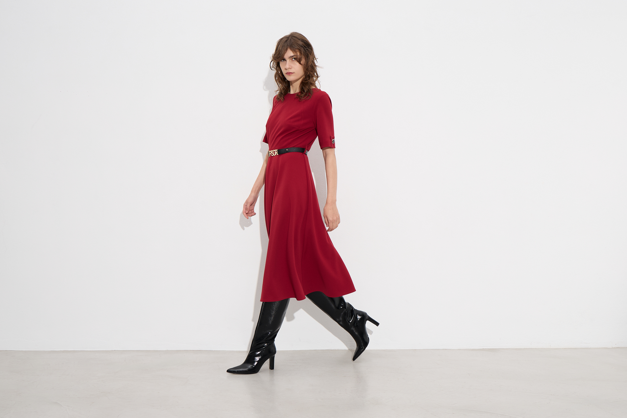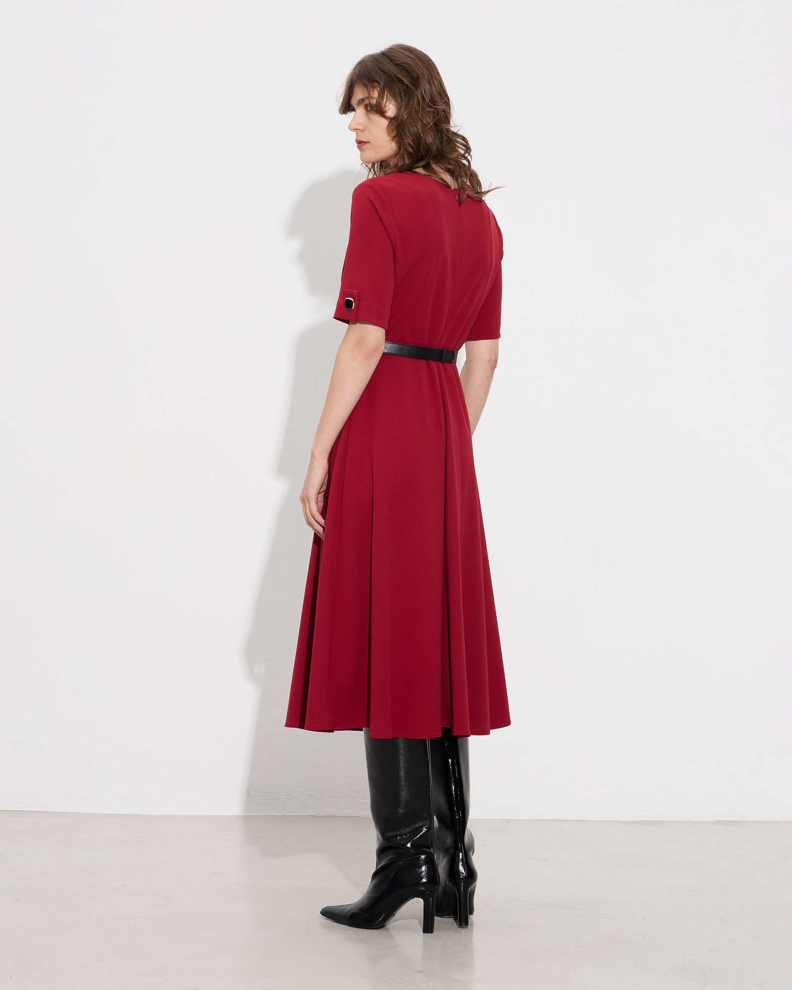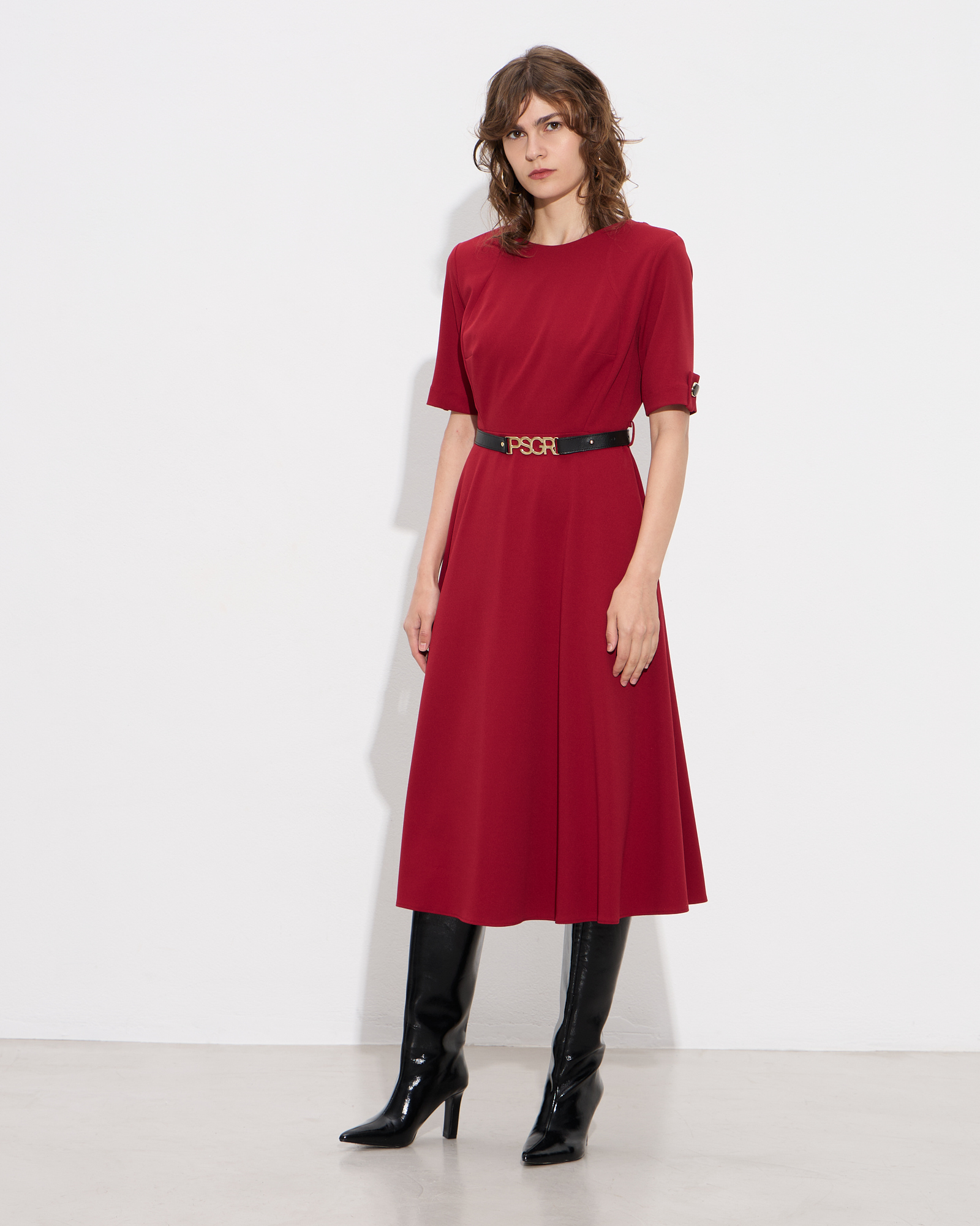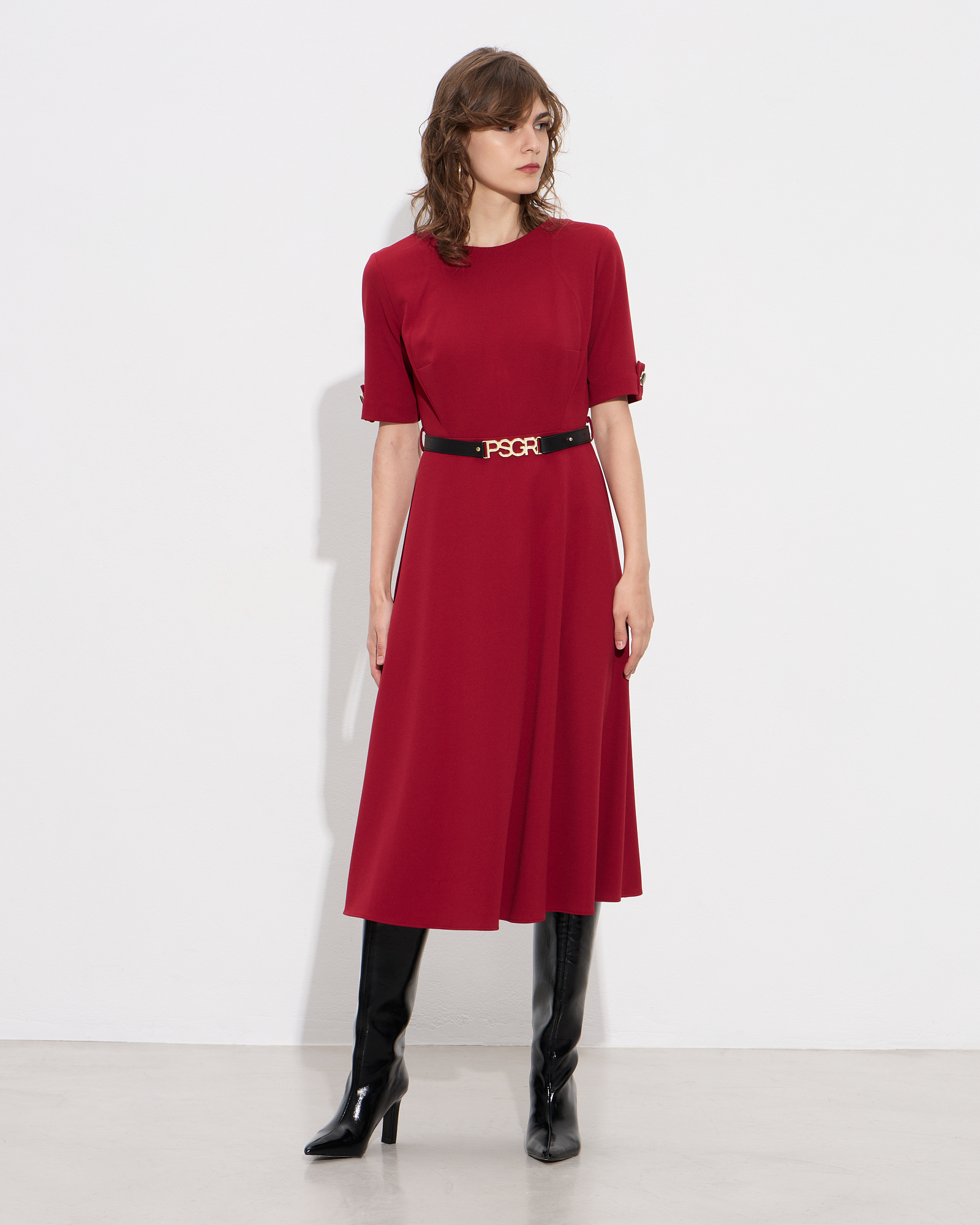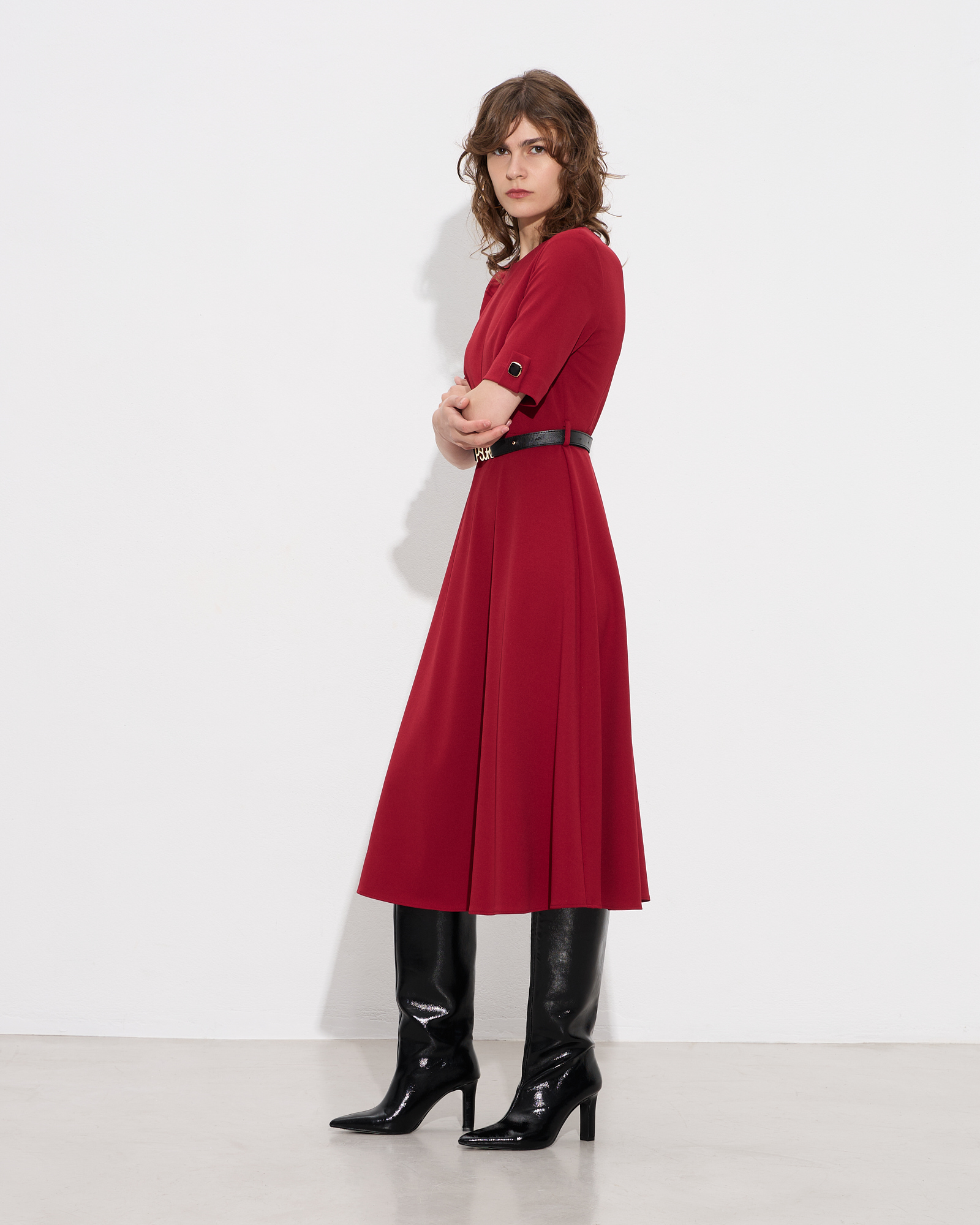 Φόρεμα midi με μανίκι με κουμπί στο τελείωμα με στρογγυλή λαιμόκοψη, με ζώνη στη μέαη, κλείσιμο με φερμουάρ, Α γραμμή, σε κανονική εφαρμογή