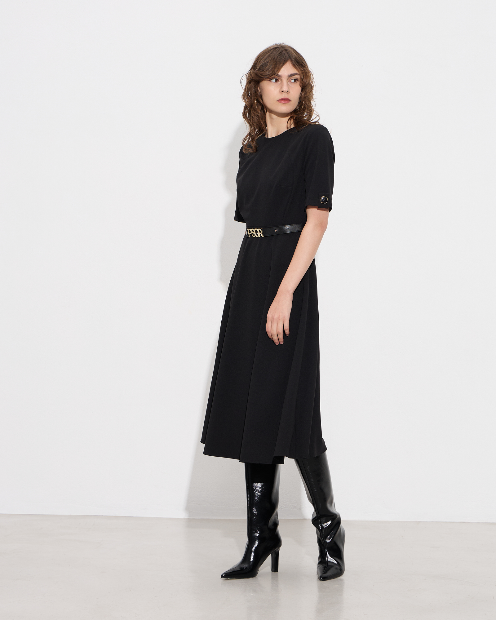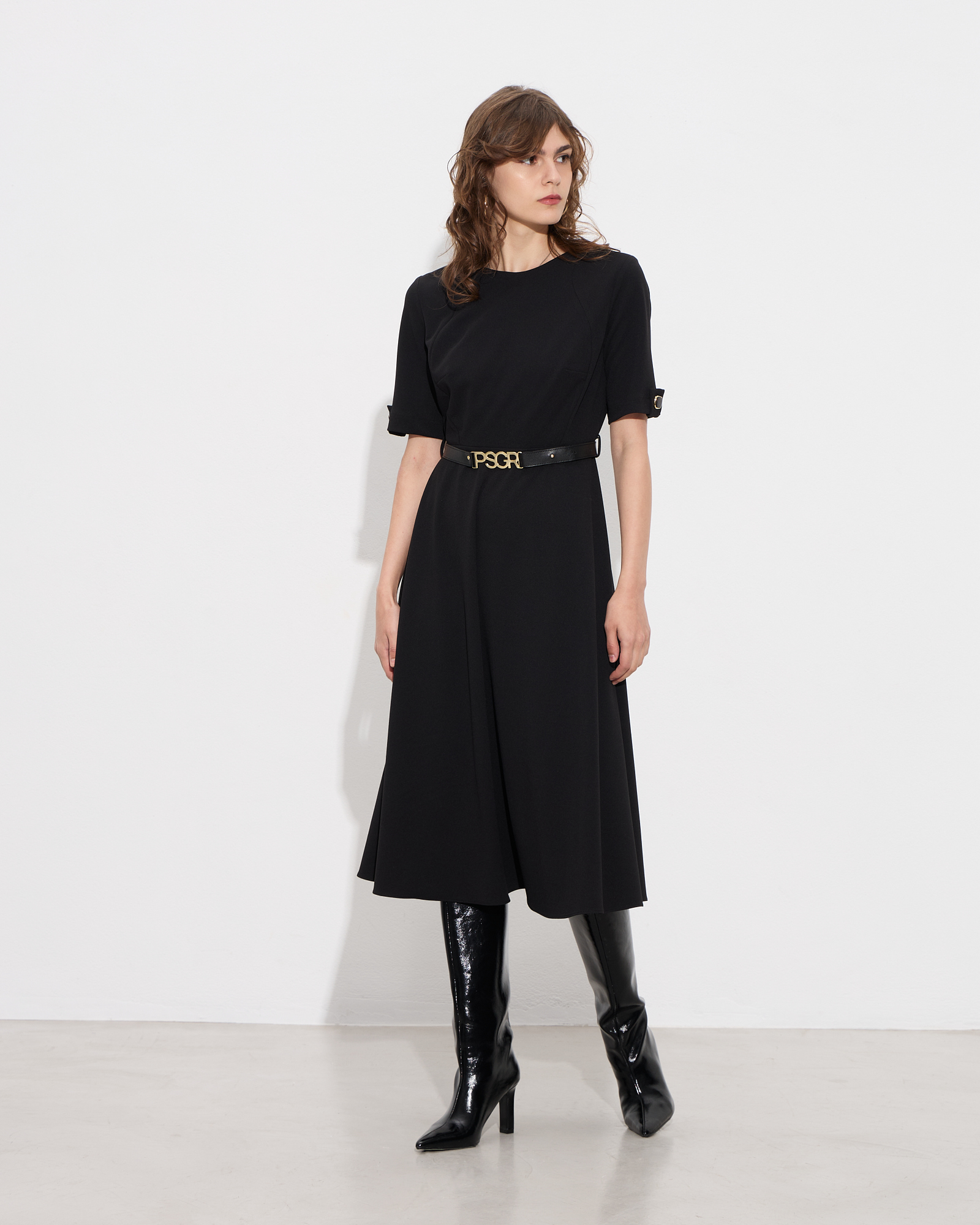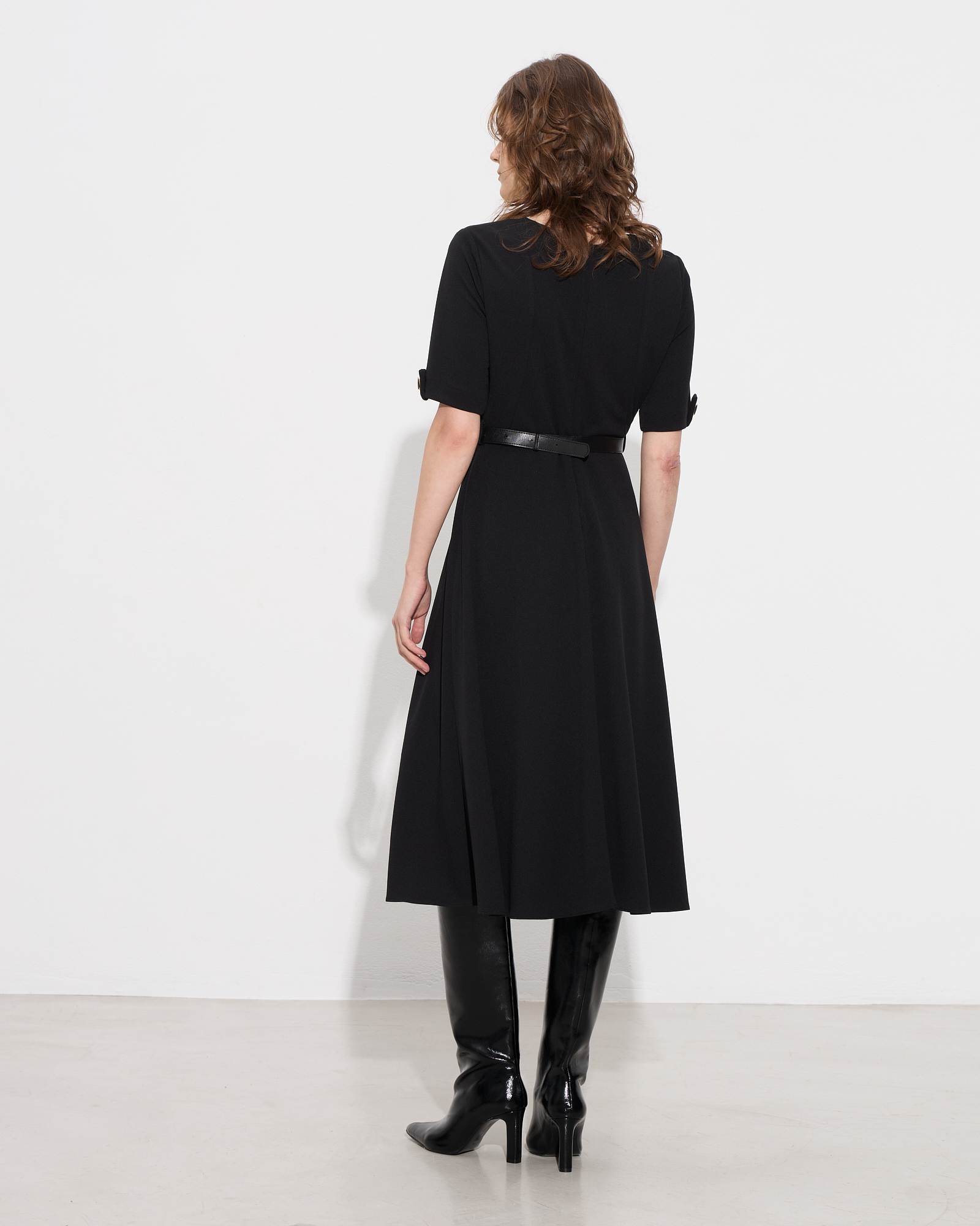Φόρεμα midi με μανίκι με κουμπί στο τελείωμα με στρογγυλή λαιμόκοψη, με ζώνη στη μέαη, κλείσιμο με φερμουάρ, Α γραμμή, σε κανονική εφαρμογή