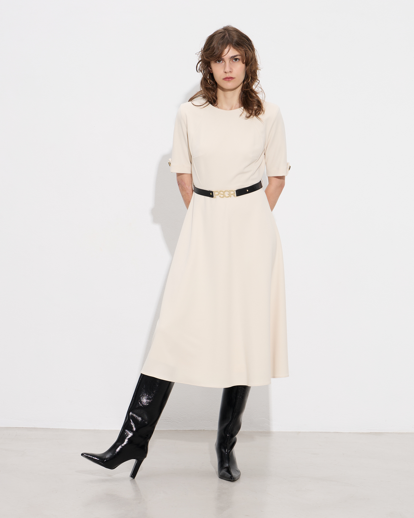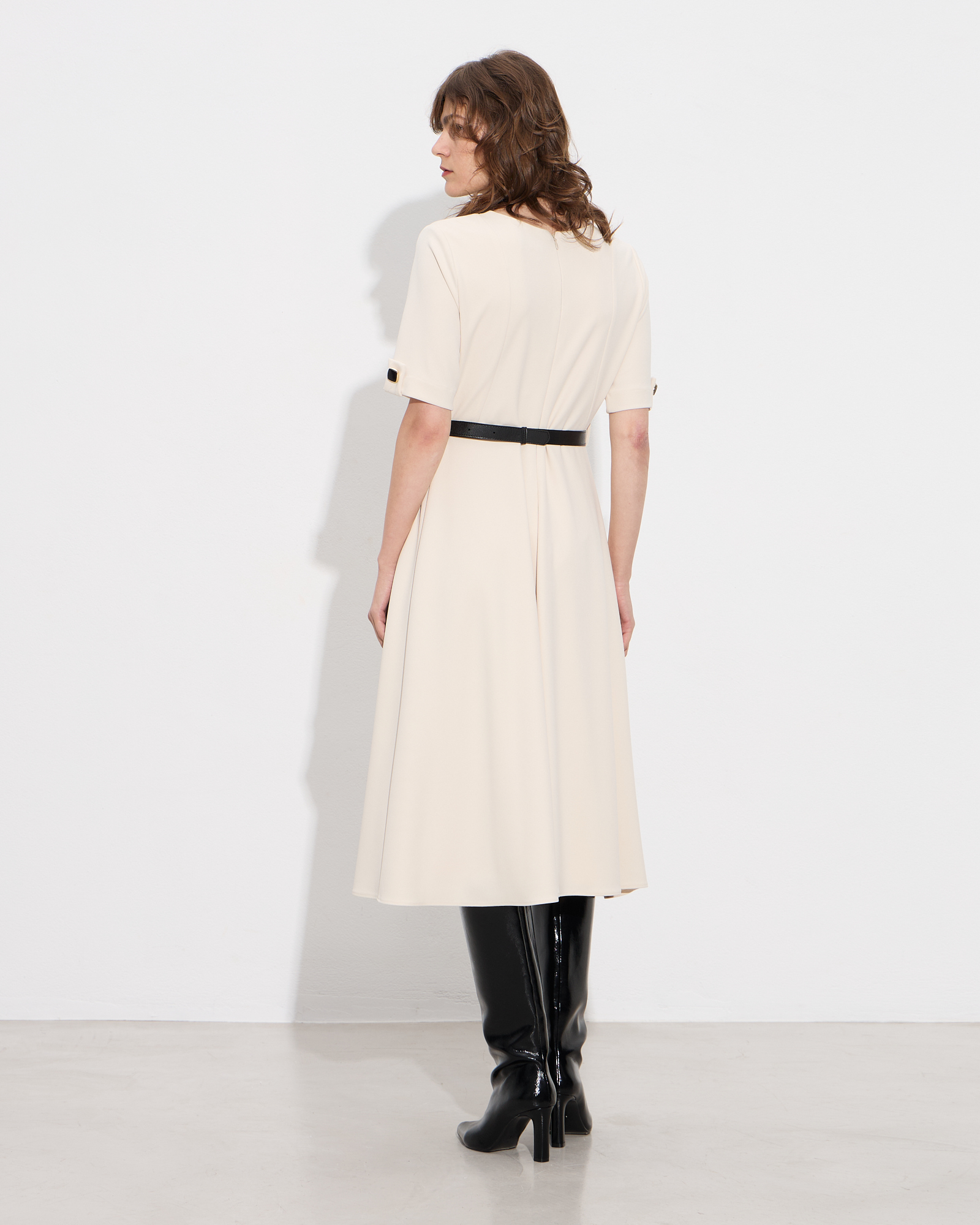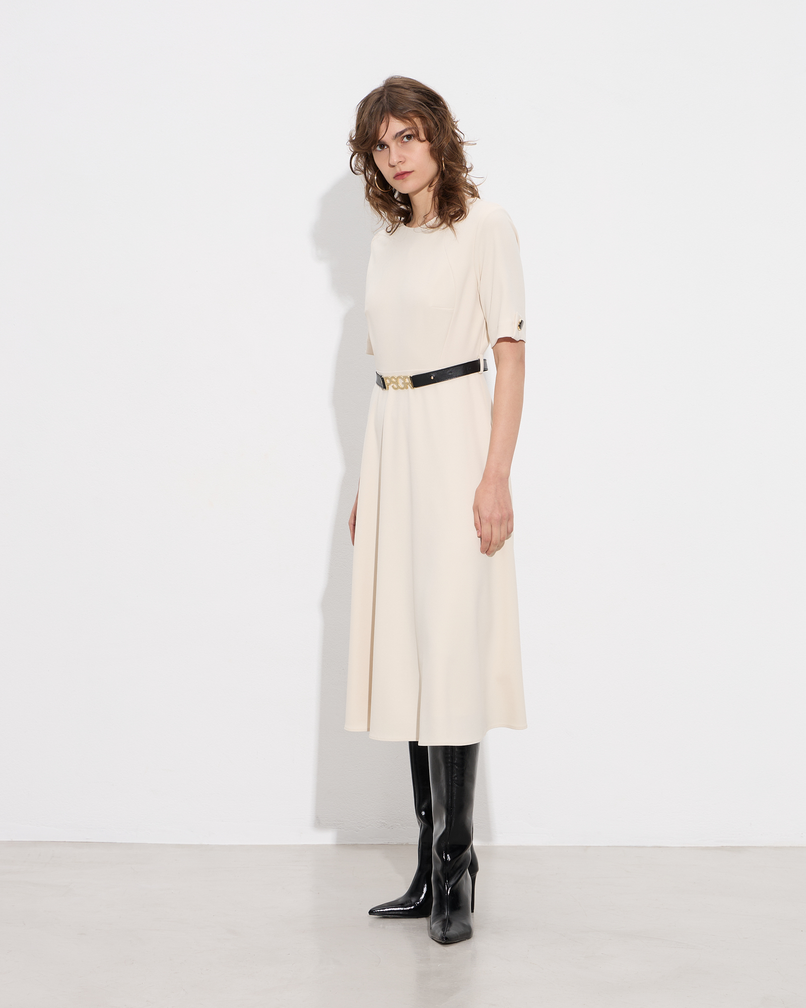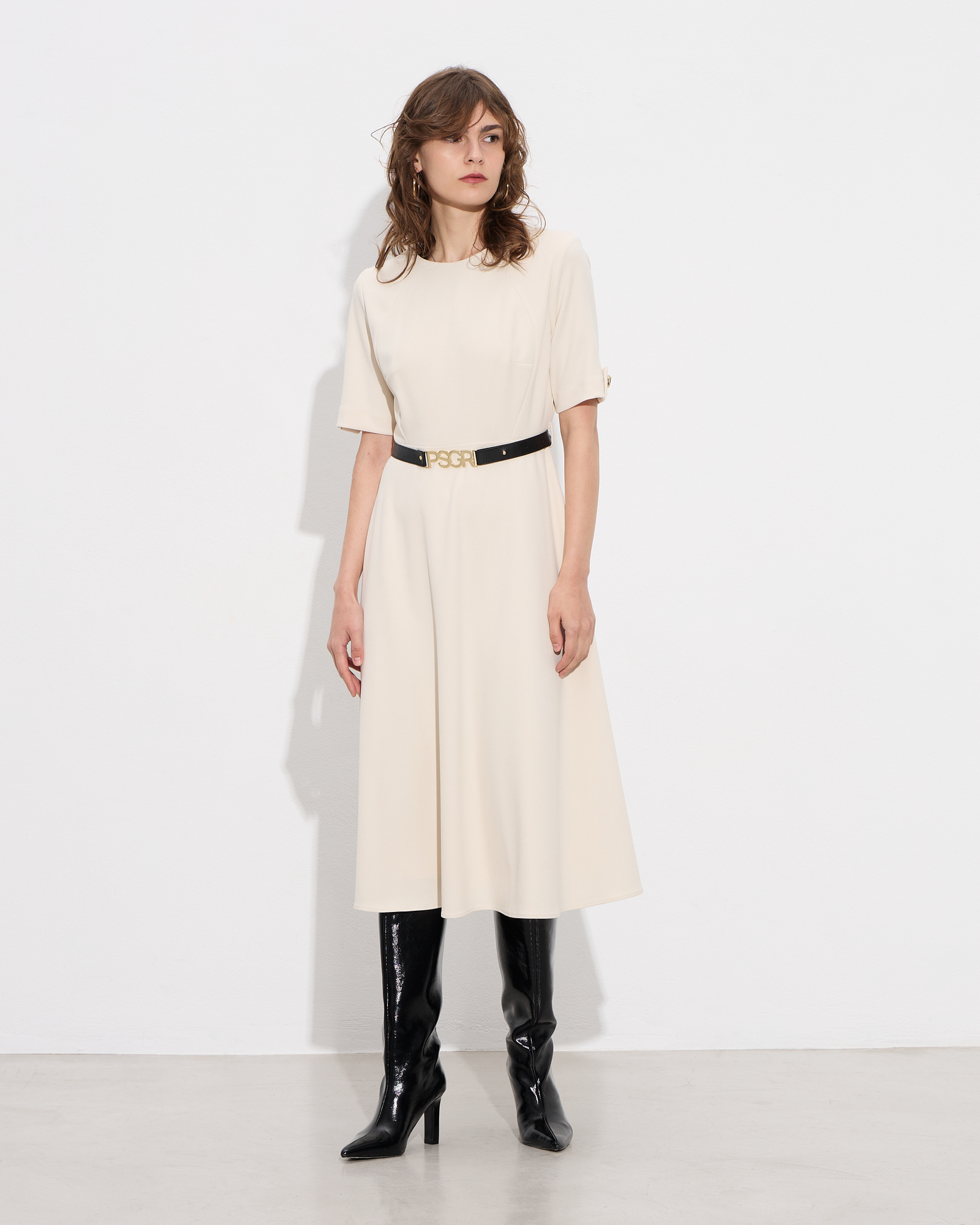 Φόρεμα midi με μανίκι με κουμπί στο τελείωμα με στρογγυλή λαιμόκοψη, με ζώνη στη μέαη, κλείσιμο με φερμουάρ, Α γραμμή, σε κανονική εφαρμογή