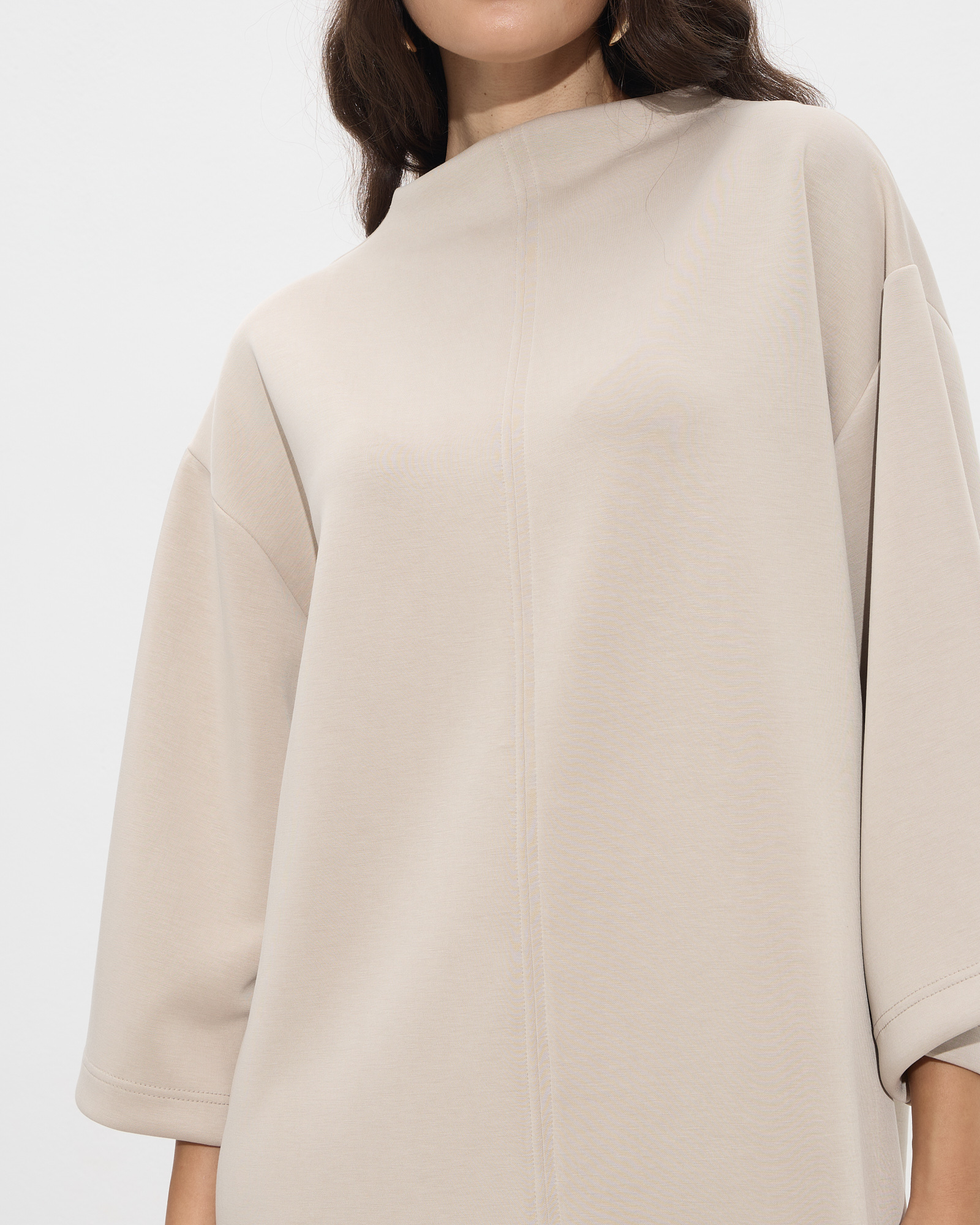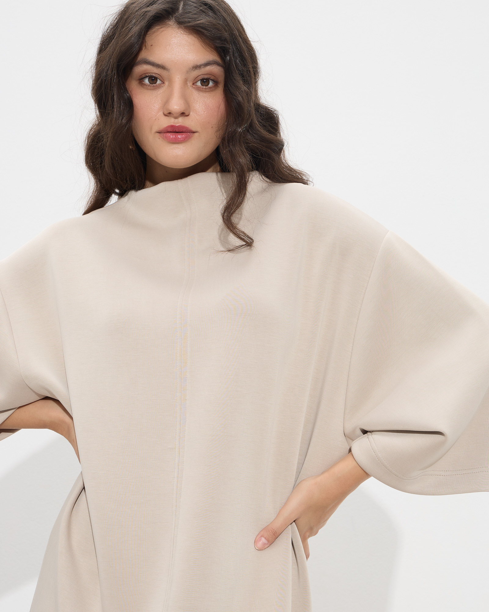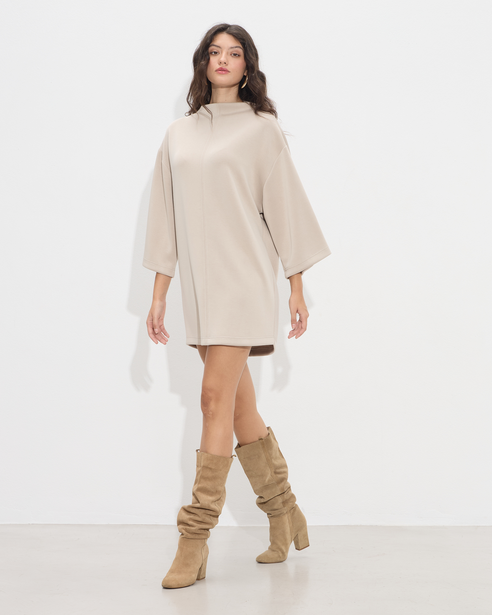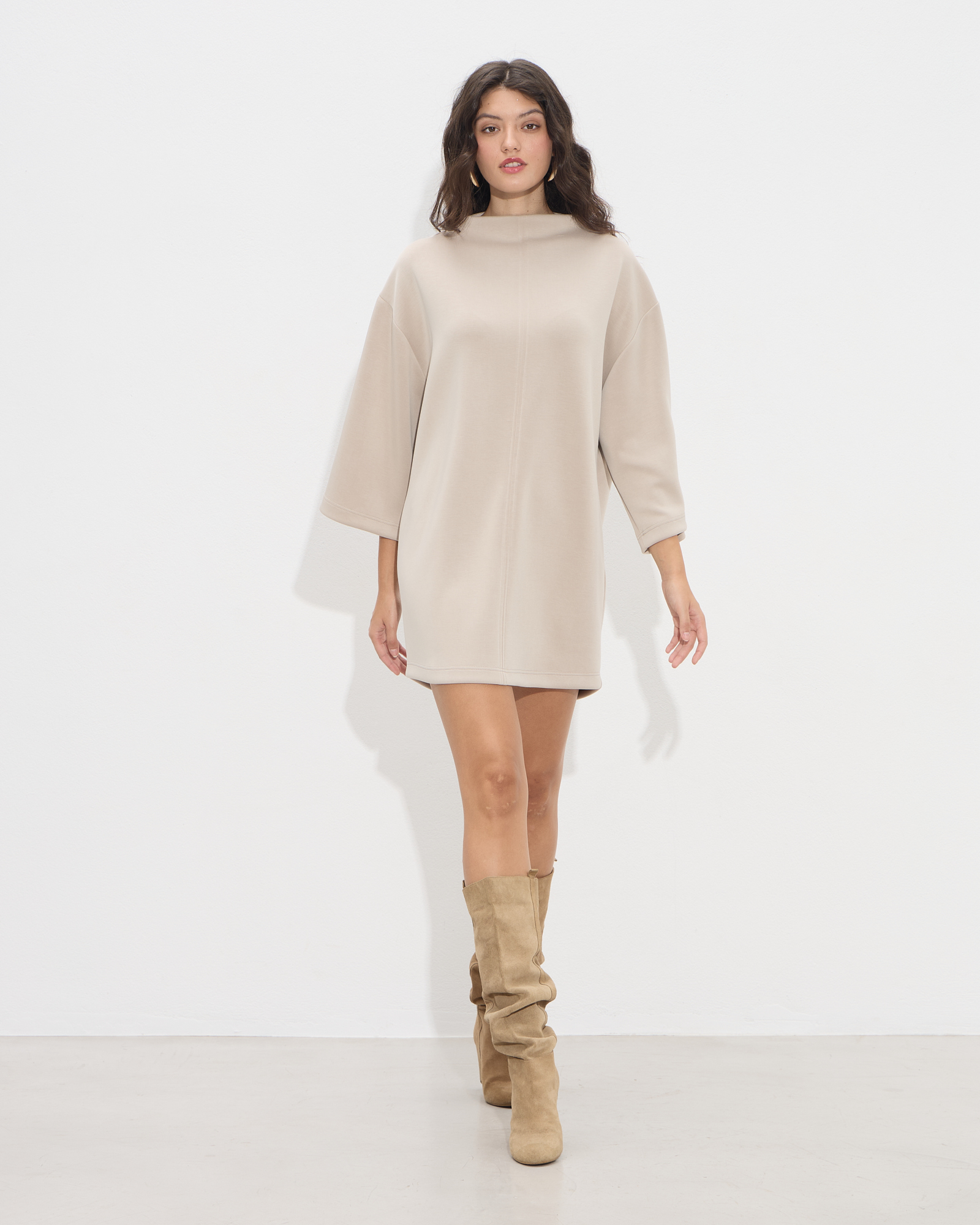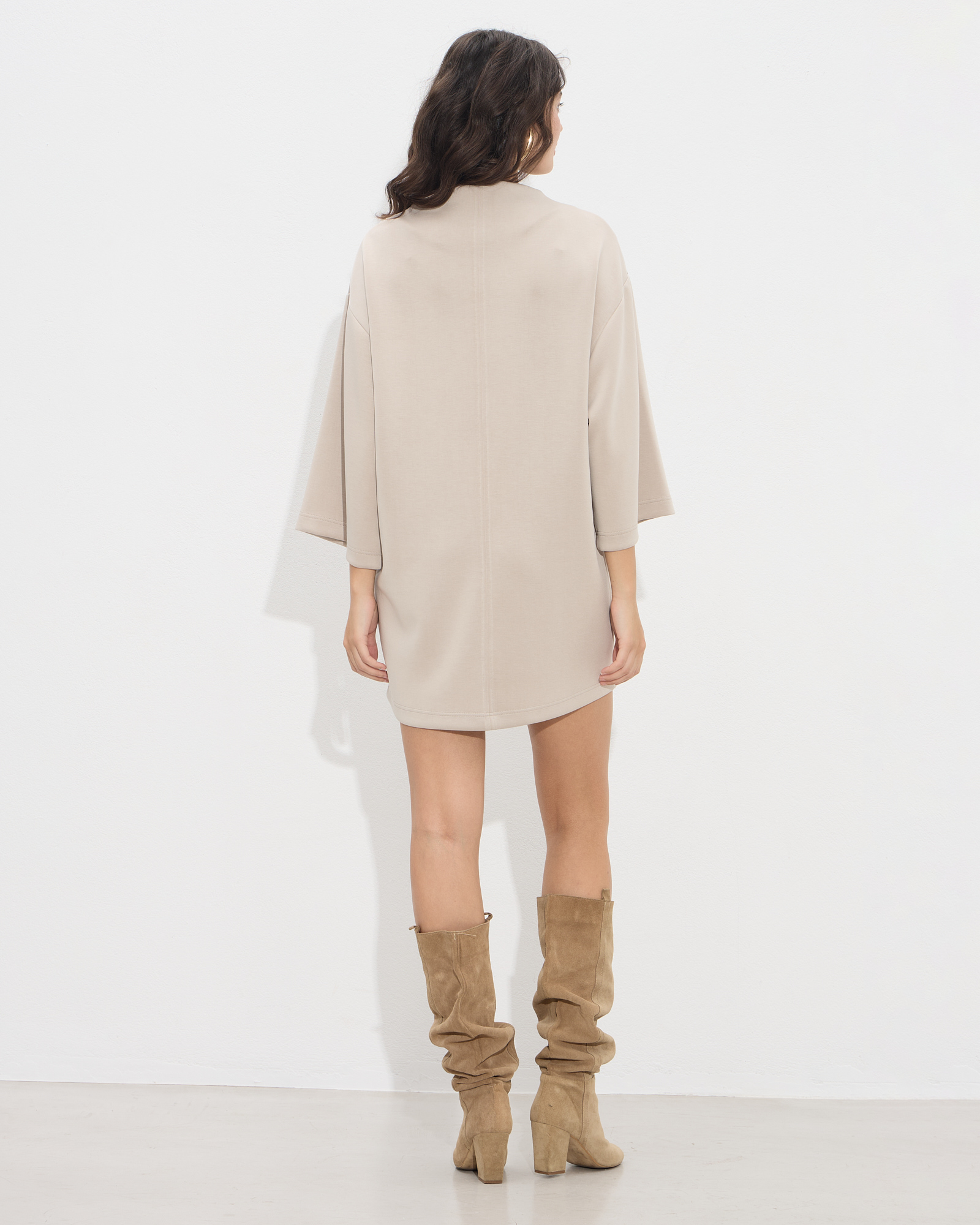Φόρεμα κοντό με στρογγυλή λαιμόκοψη και 3/4 φαρδιά μανίκια σε μαλακό ελαστικό ύφασμα σε μοντέρνα ίσια γραμμή