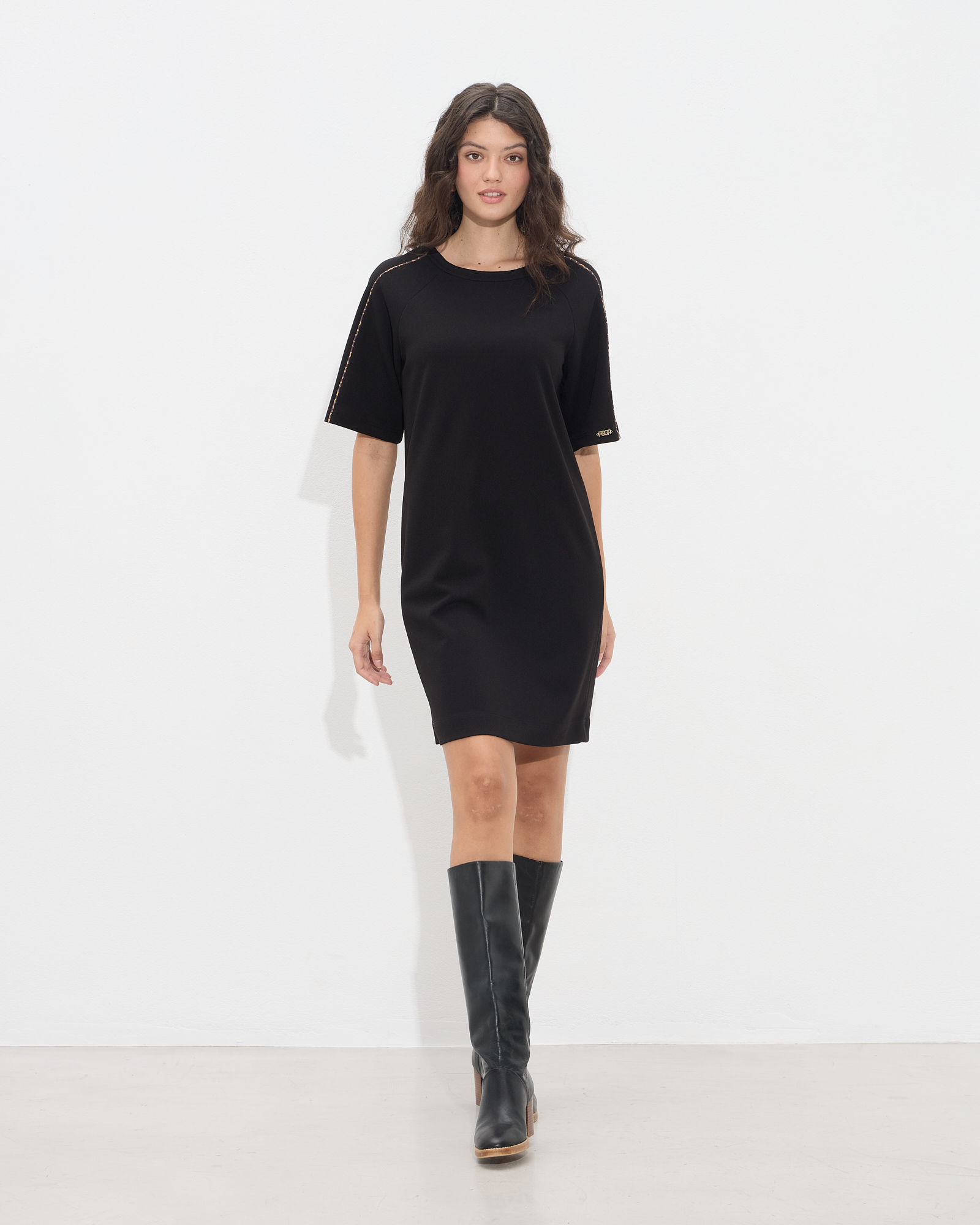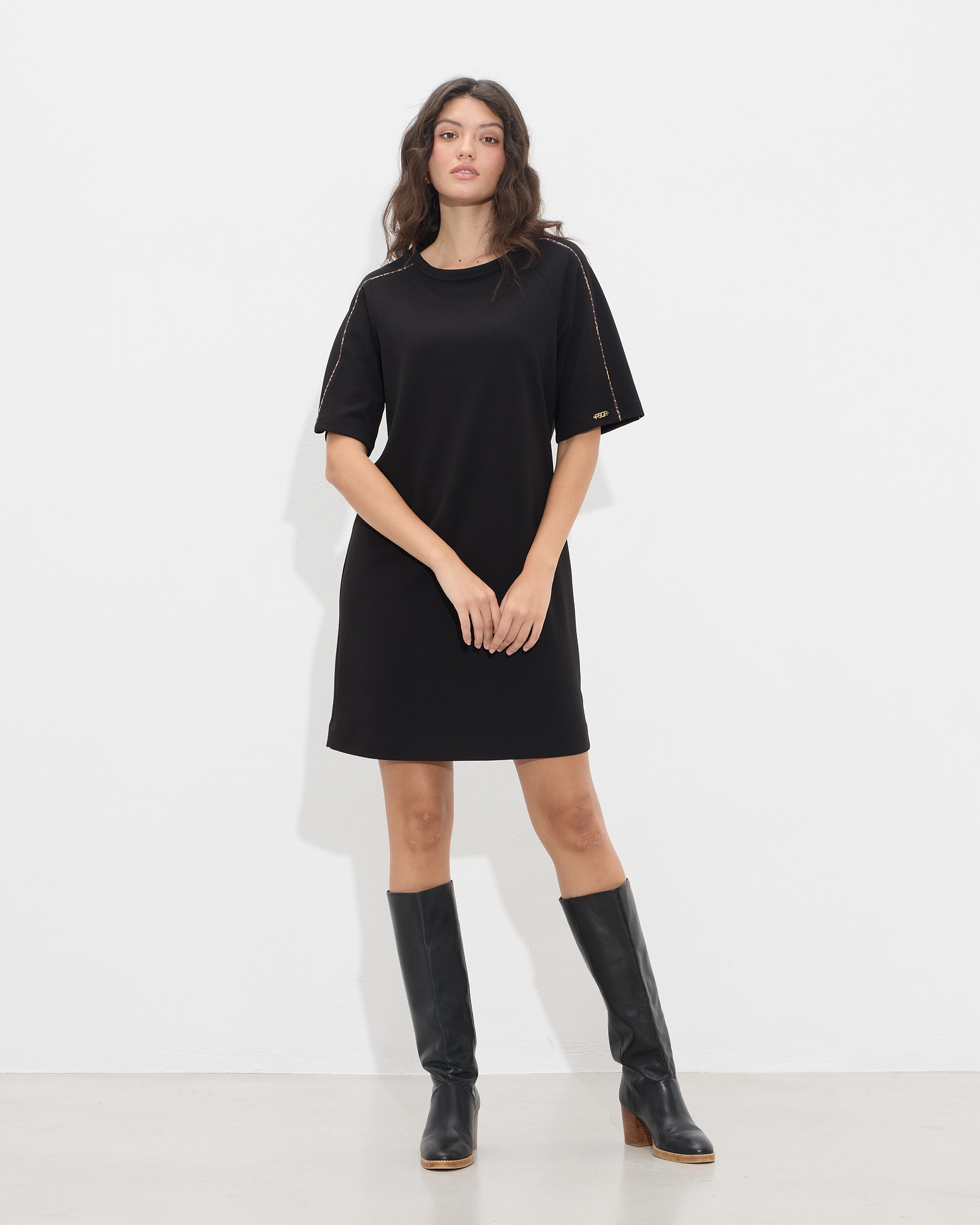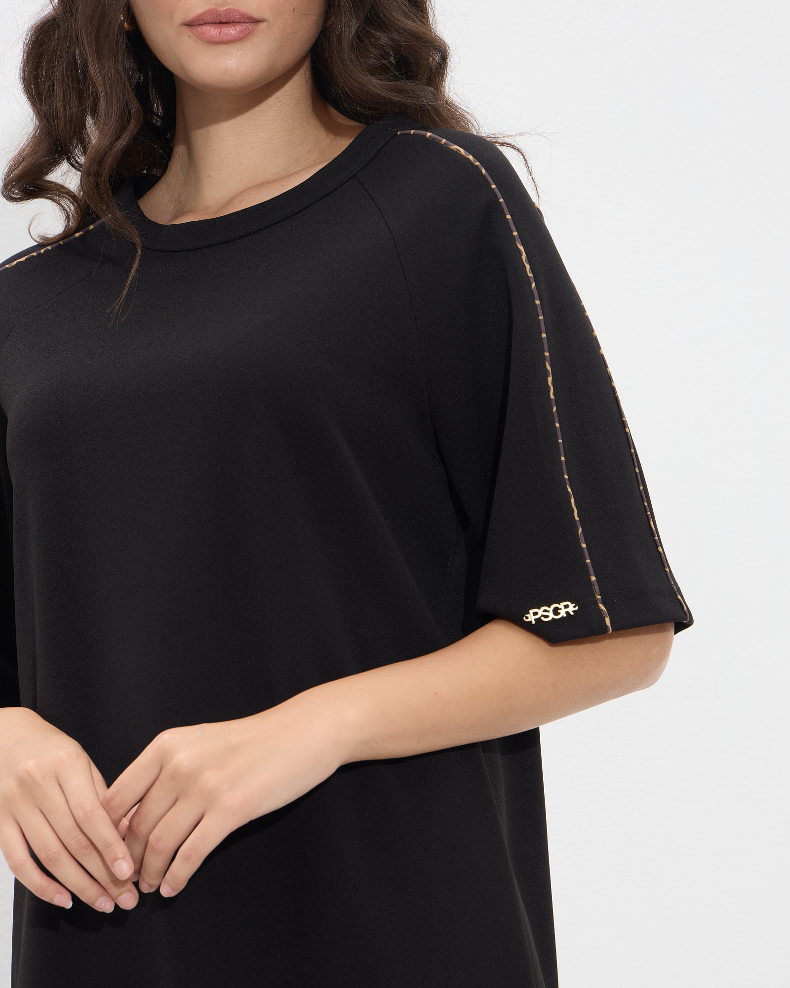 Φόρεμα mini με κοντά μανίκια, στρογγυλή λαιμόκοψη, λεπτομέρεια με λέοπαρ ρέλι, σε ίσια γραμμή