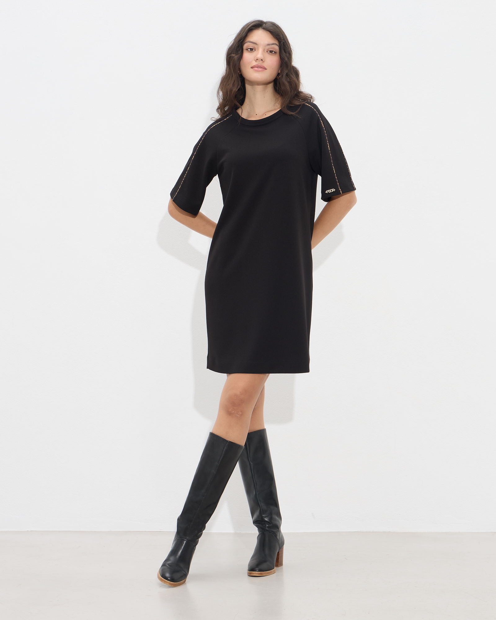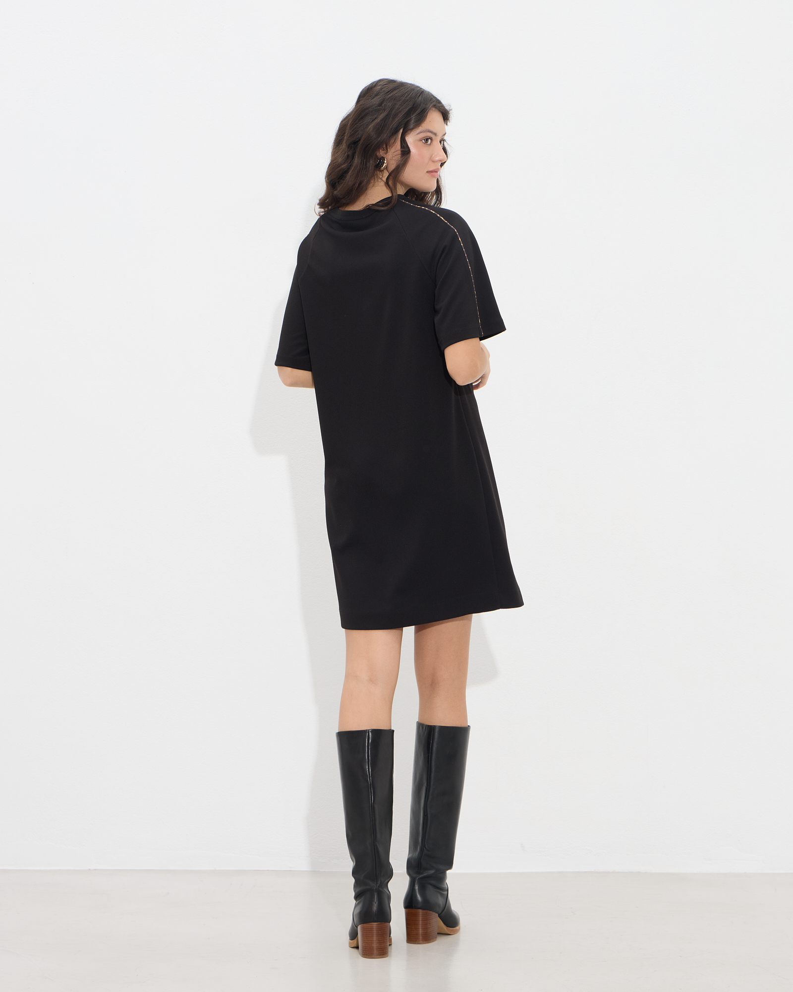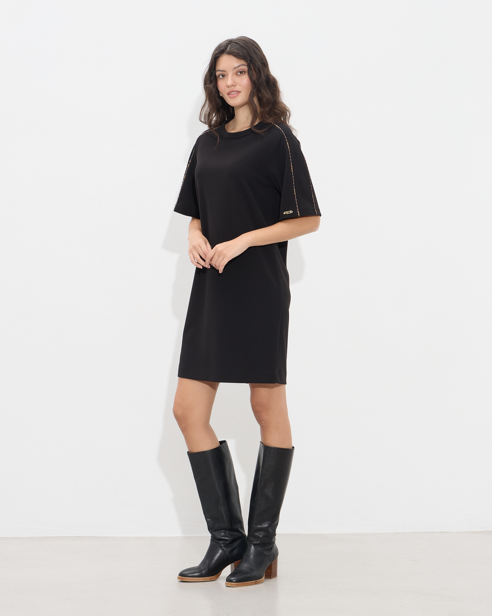 Φόρεμα mini με κοντά μανίκια, στρογγυλή λαιμόκοψη, λεπτομέρεια με λέοπαρ ρέλι, σε ίσια γραμμή