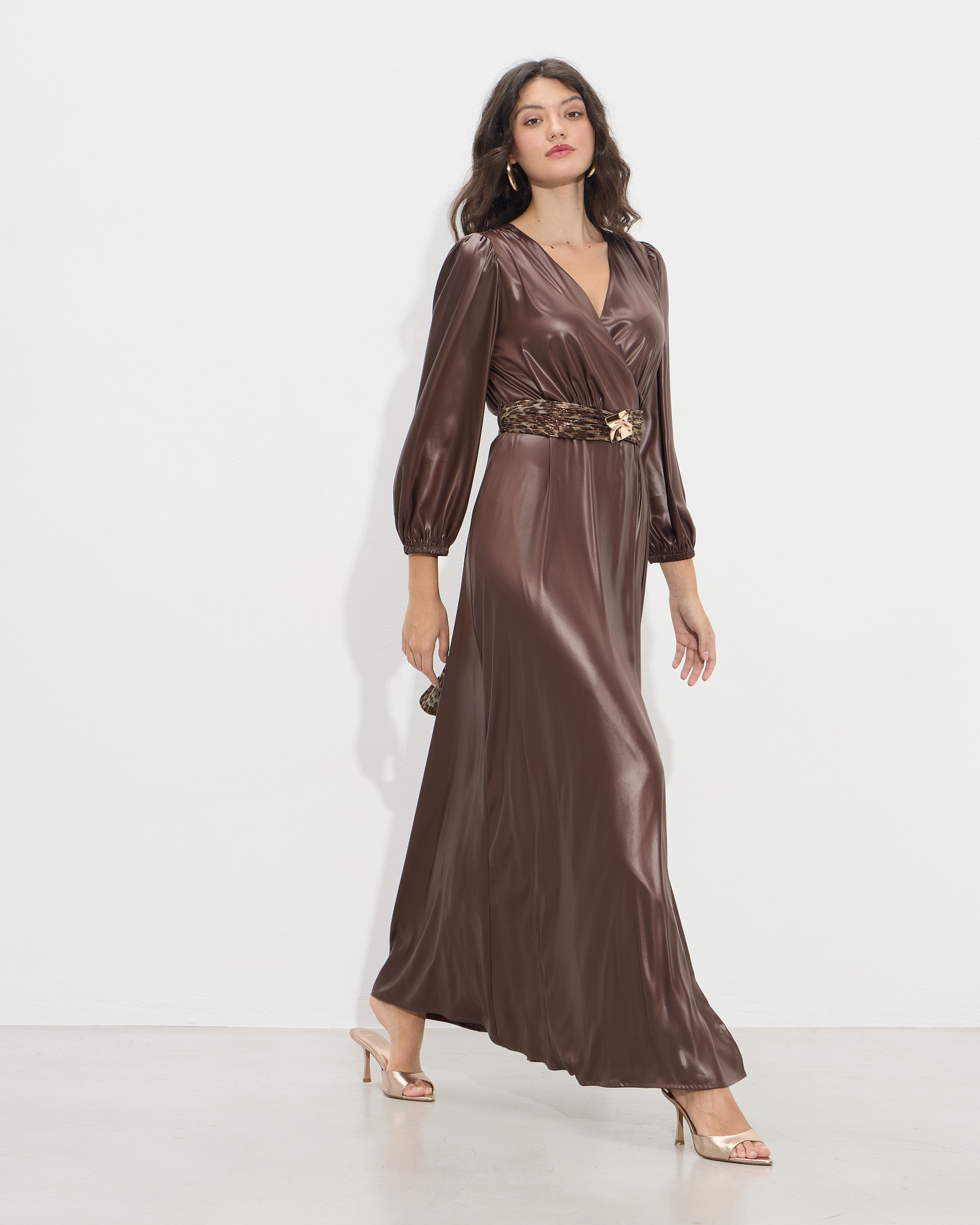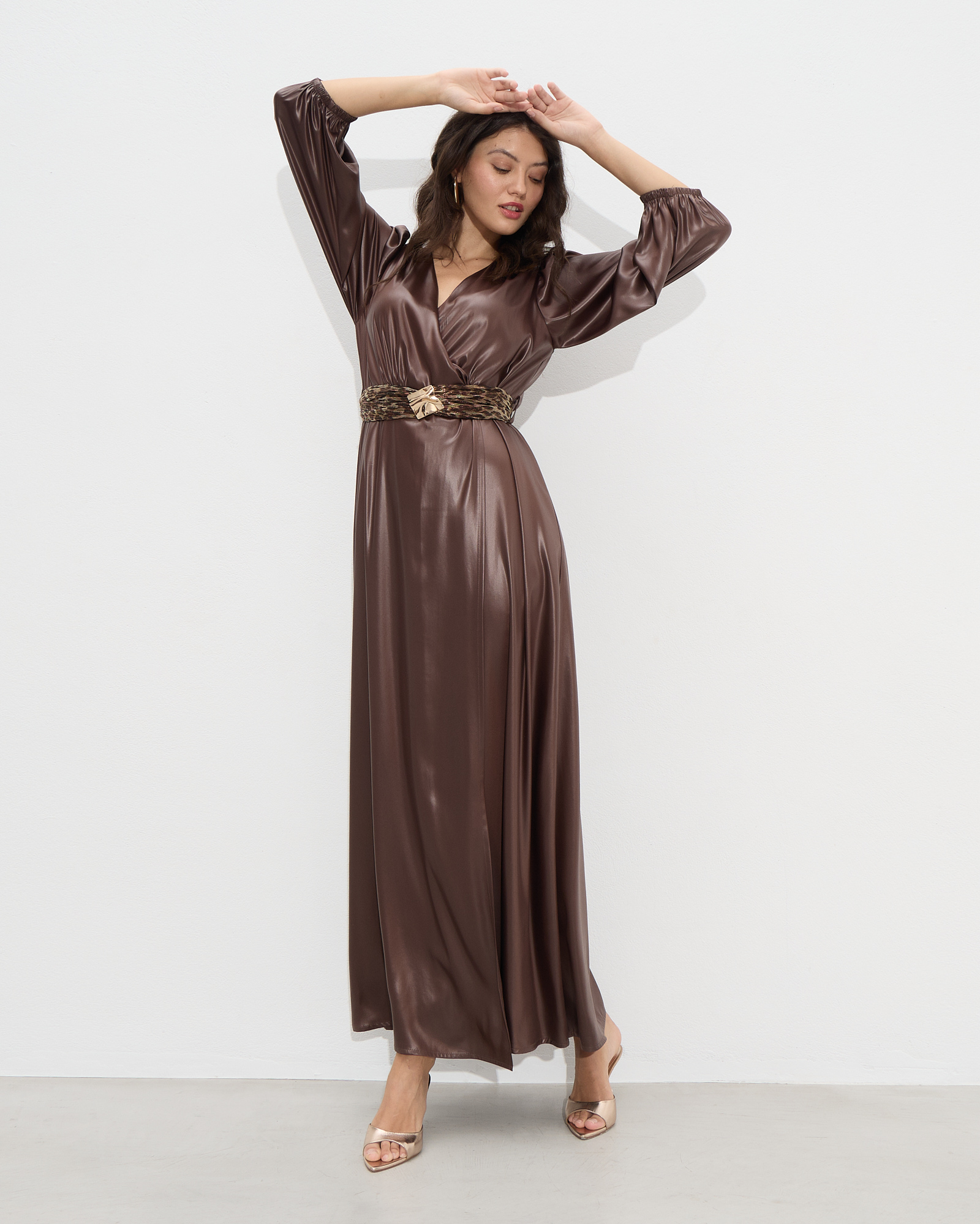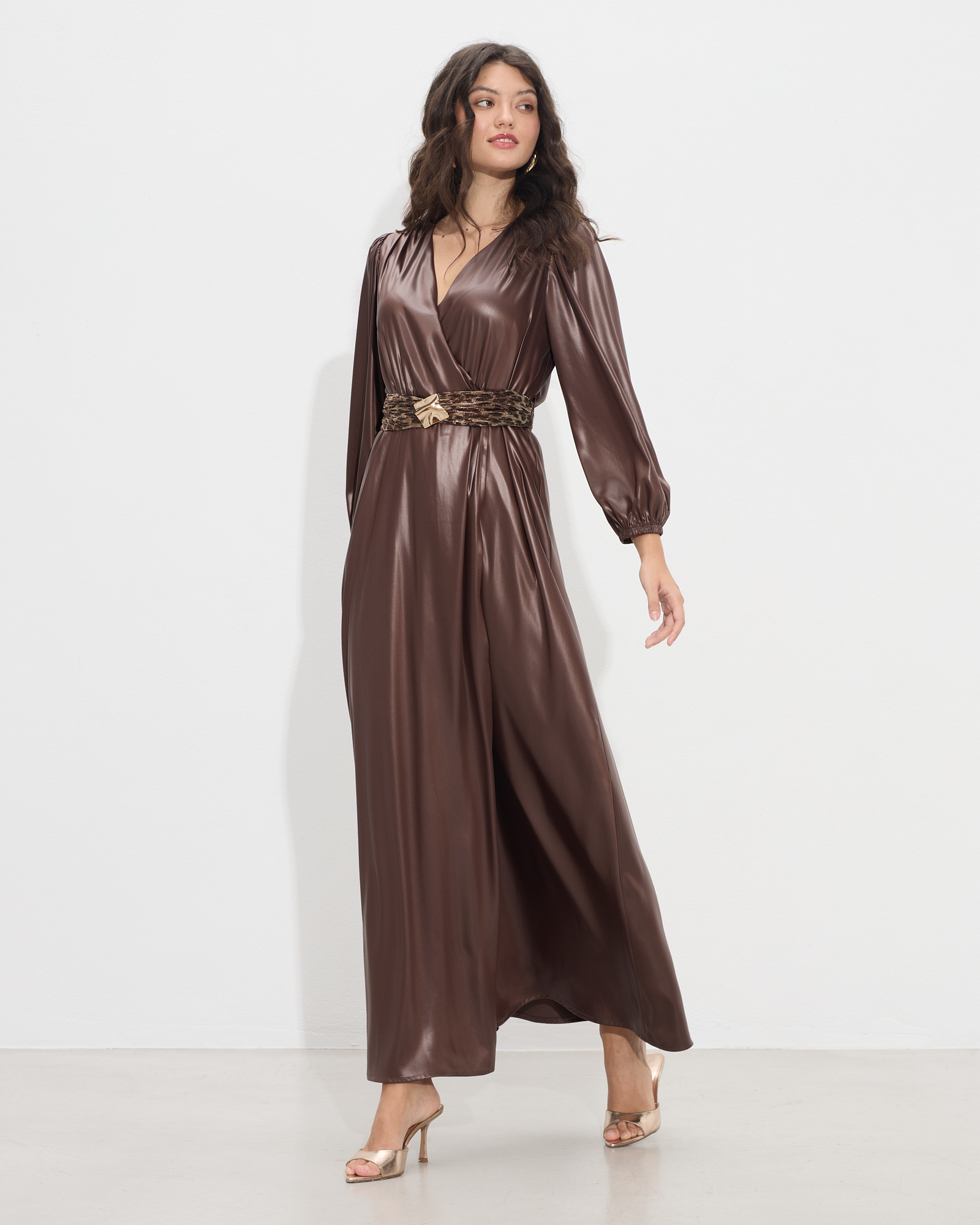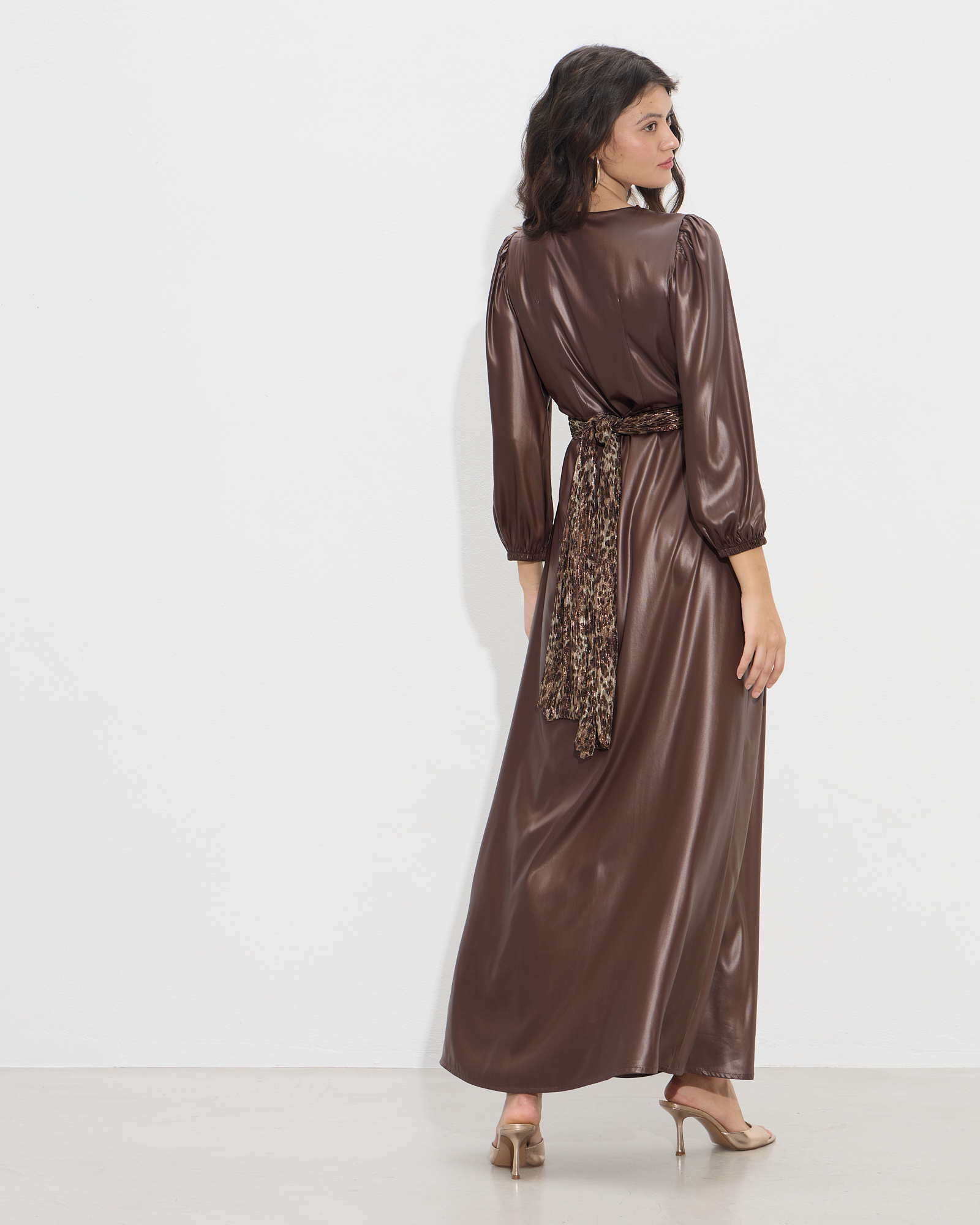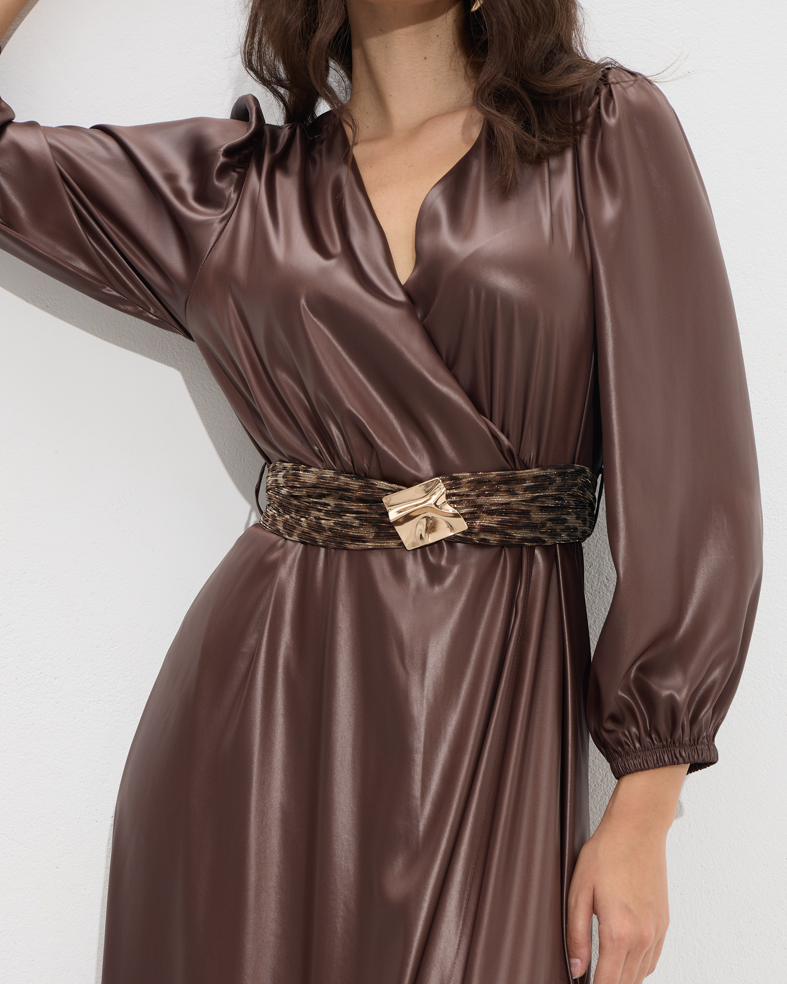 Φόρεμα maxi κρουαζέ με εφέ δερματίνη, μακρύ μανίκι με λάστιχο στο τελείωμα, διαθέτει κουμπί στη μέση και αποσπώμενη ζώνη, με εσωτερική φόδρα, σε κανονική γραμμή