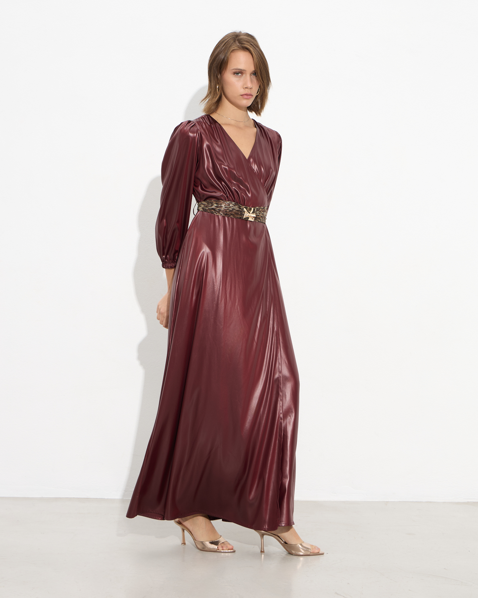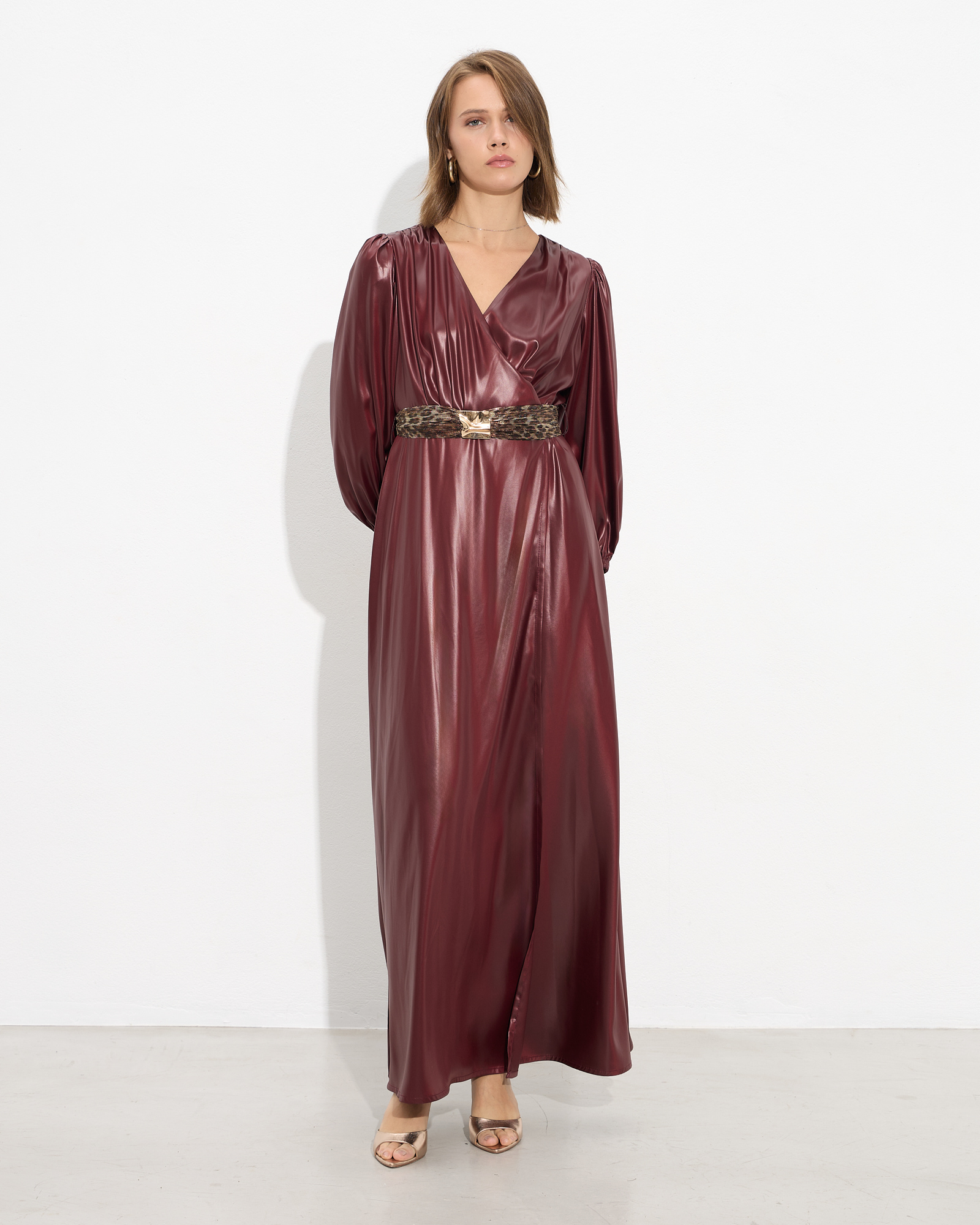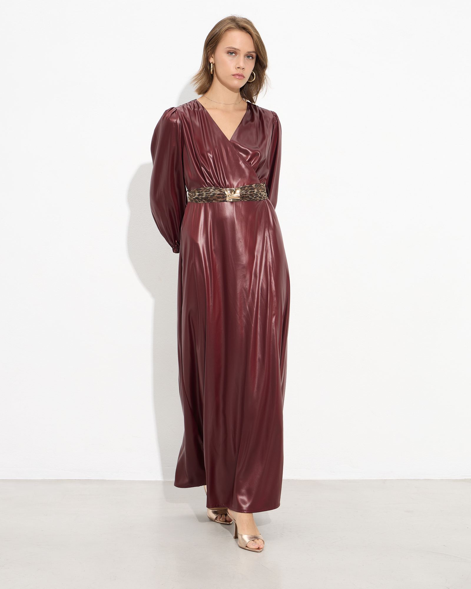 Φόρεμα maxi κρουαζέ με εφέ δερματίνη, μακρύ μανίκι με λάστιχο στο τελείωμα, διαθέτει κουμπί στη μέση και αποσπώμενη ζώνη, με εσωτερική φόδρα, σε κανονική γραμμή