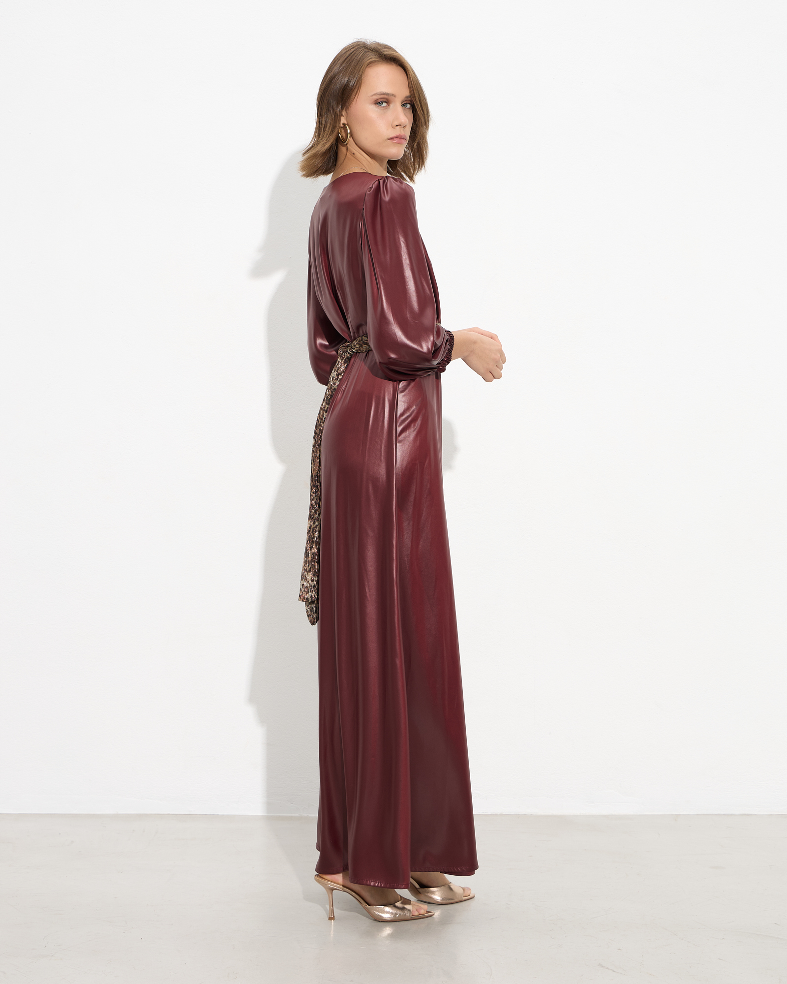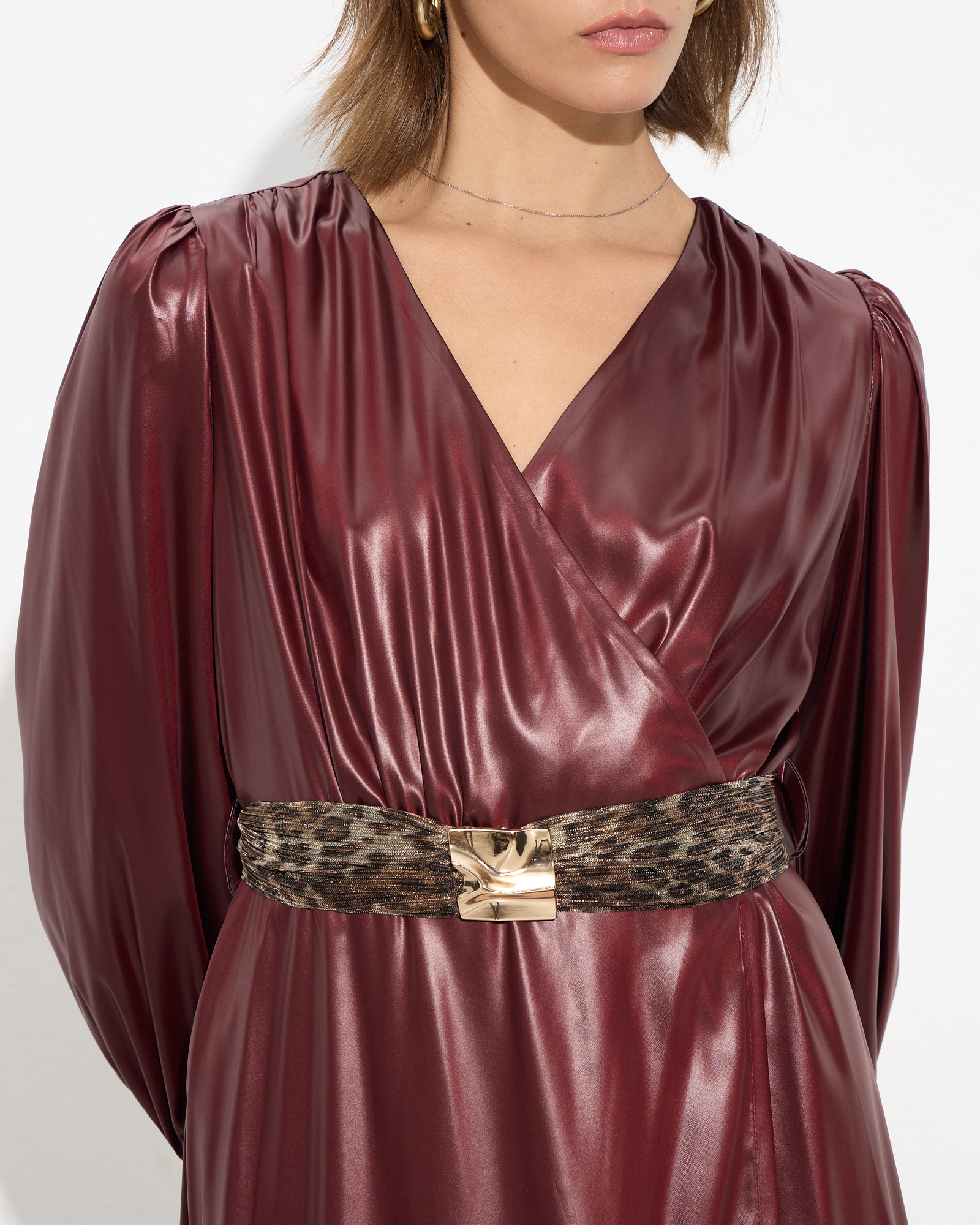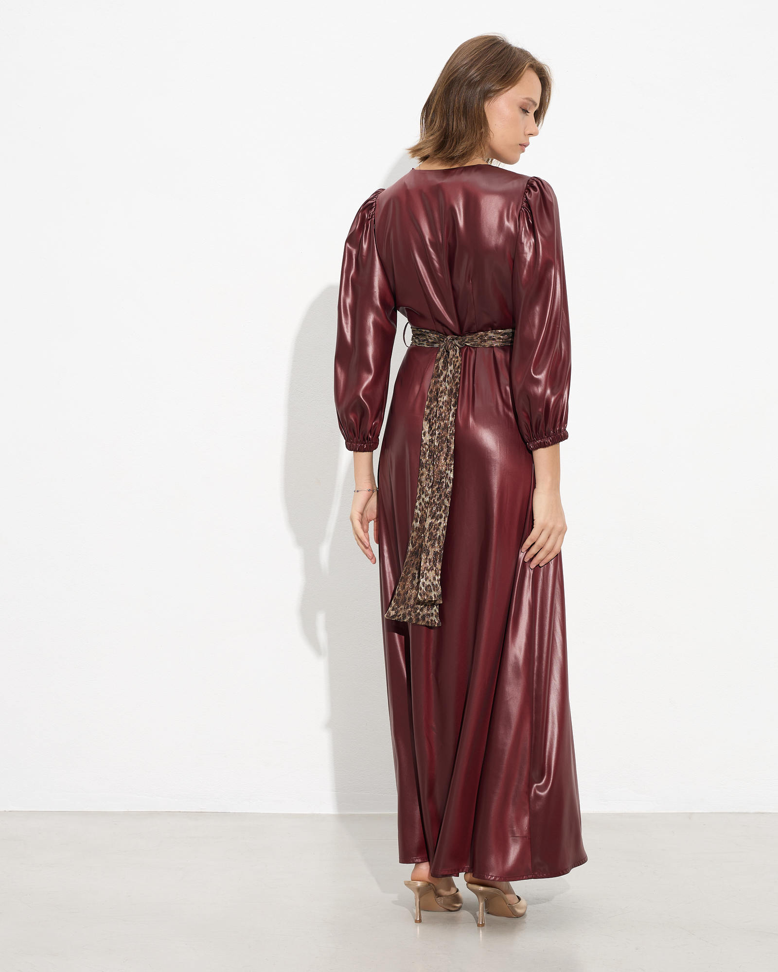 Φόρεμα maxi κρουαζέ με εφέ δερματίνη, μακρύ μανίκι με λάστιχο στο τελείωμα, διαθέτει κουμπί στη μέση και αποσπώμενη ζώνη, με εσωτερική φόδρα, σε κανονική γραμμή