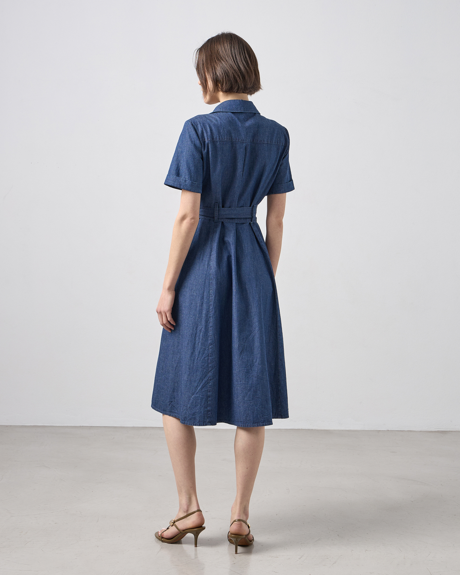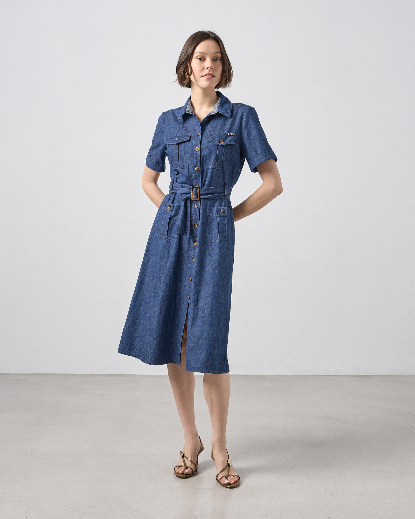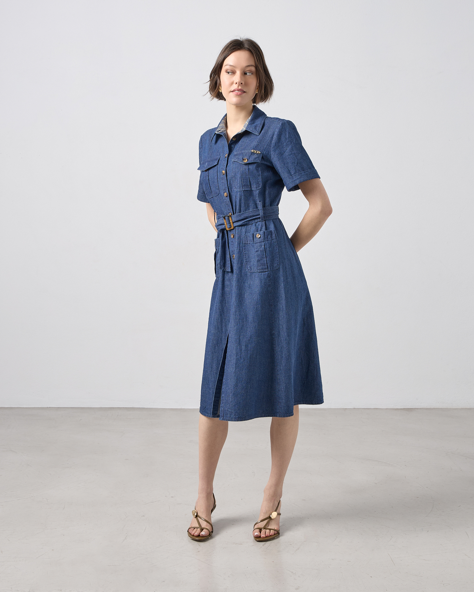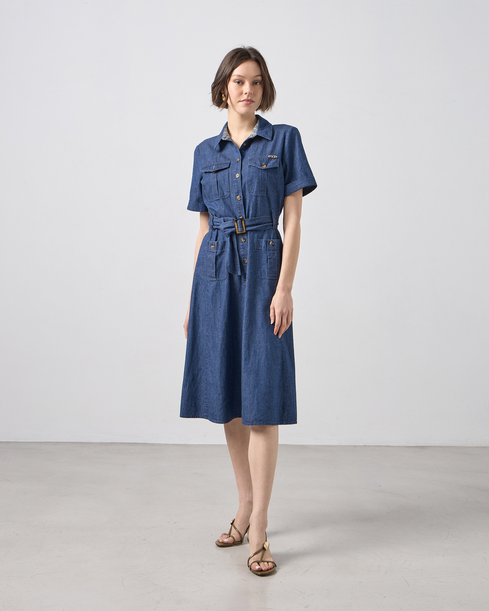 Φόρεμα midi σεμιζιέ με κοντό μανίκι, με γιακά, κλείσιμο με κουμπιά μπροστά, ζώνη με δέσιμο στη μέση , μπροστινές τσέπες, σε κανονική εφαρμογή
