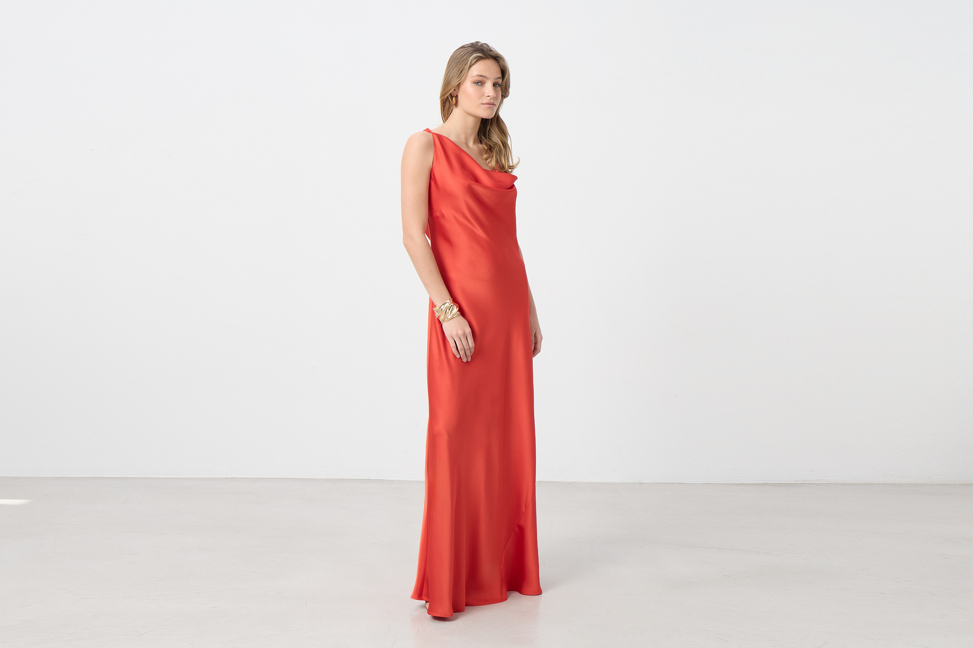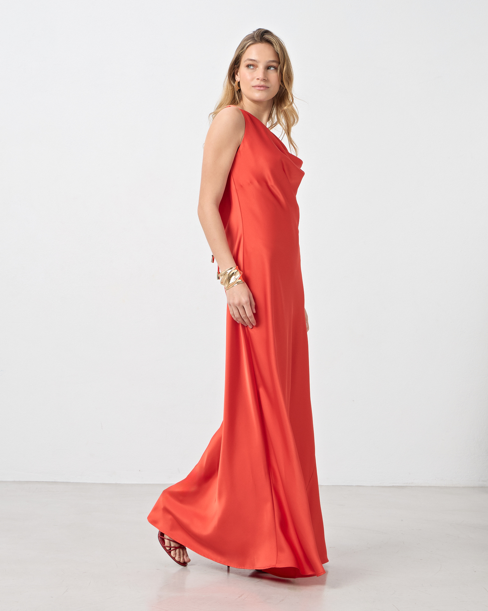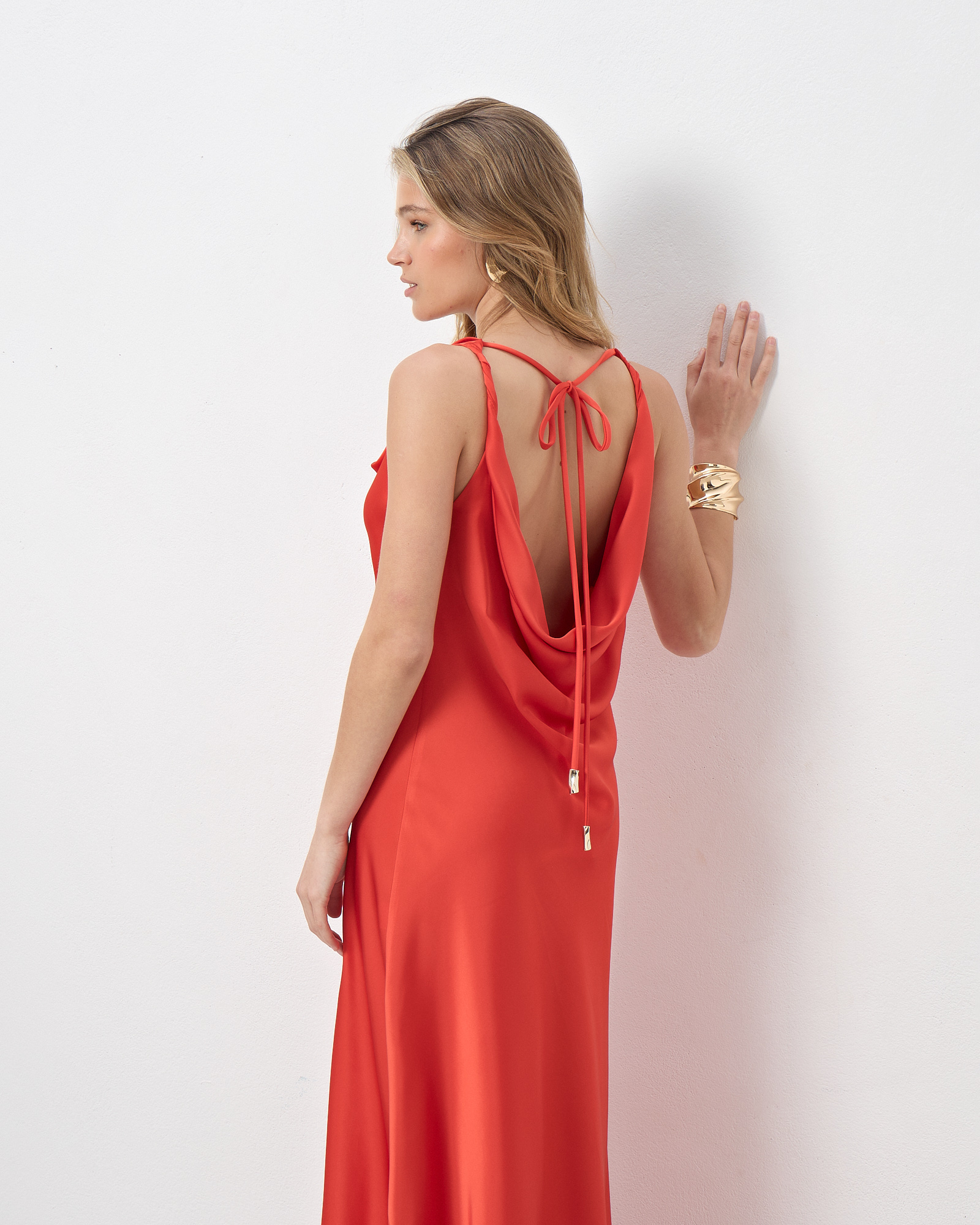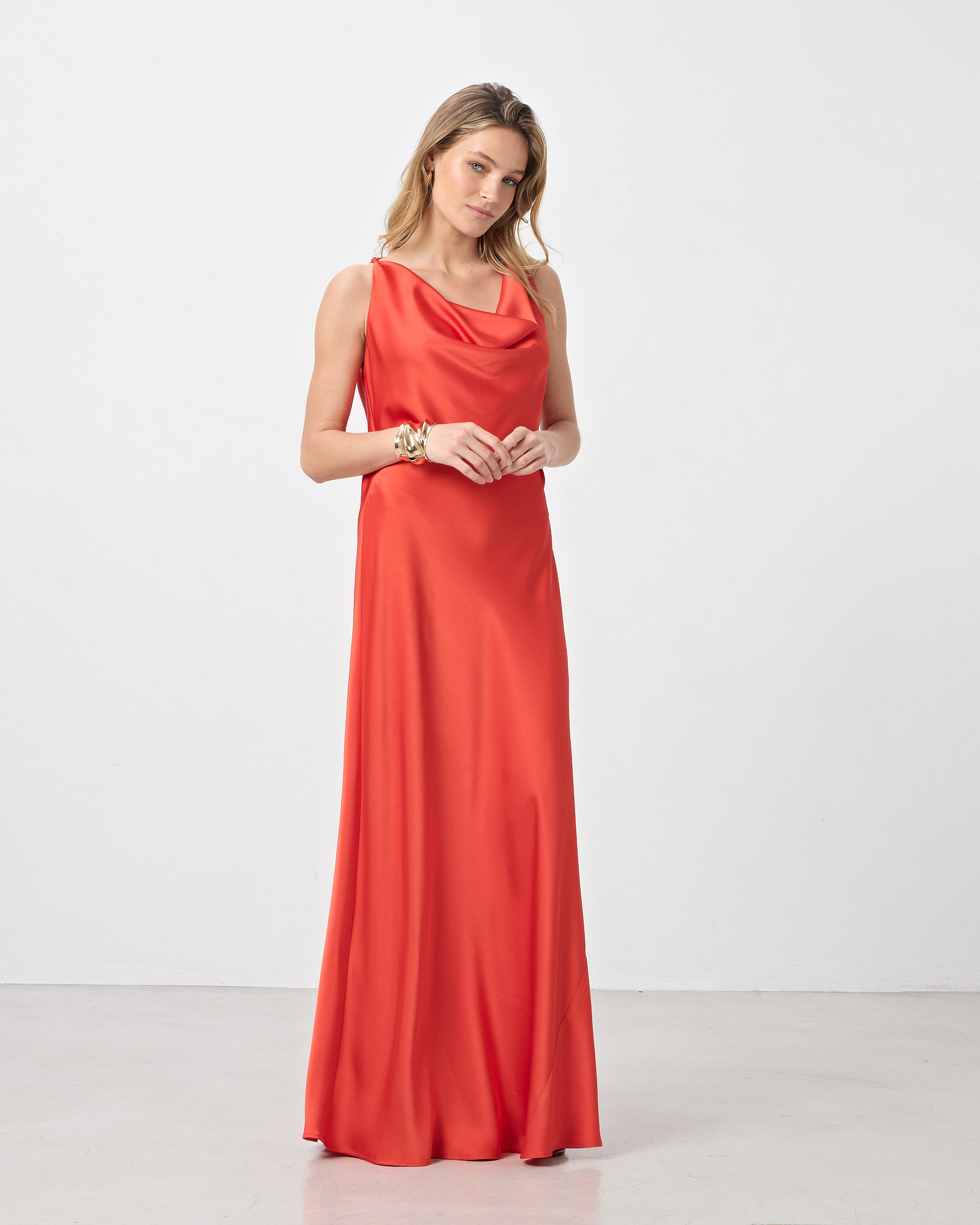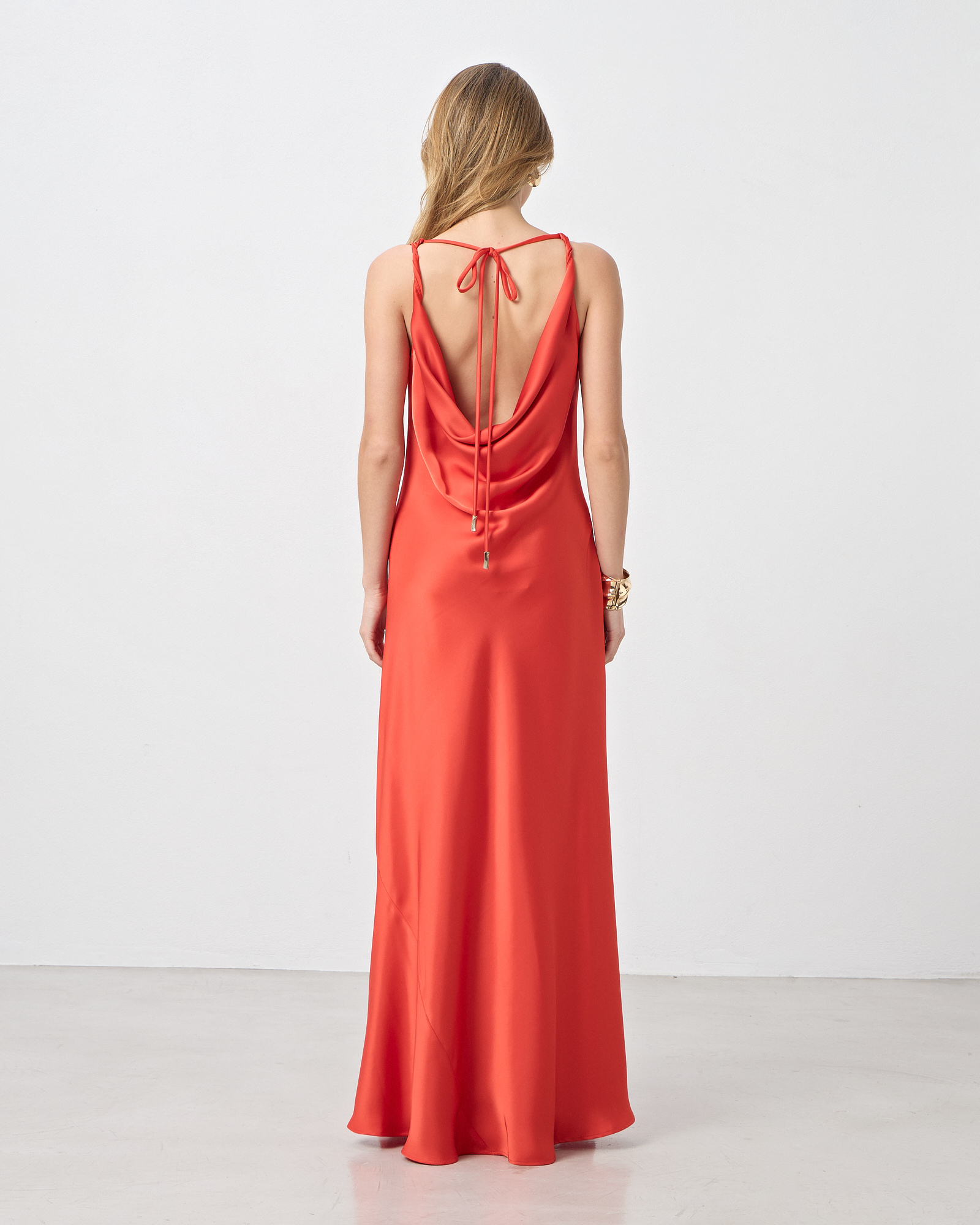 Φόρεμα maxi σατέν με τιράντες, ντραπέ ντεκολτέ και πλάτη, δέσιμο πίσω στο λαιμό, σε κανονική γραμμή