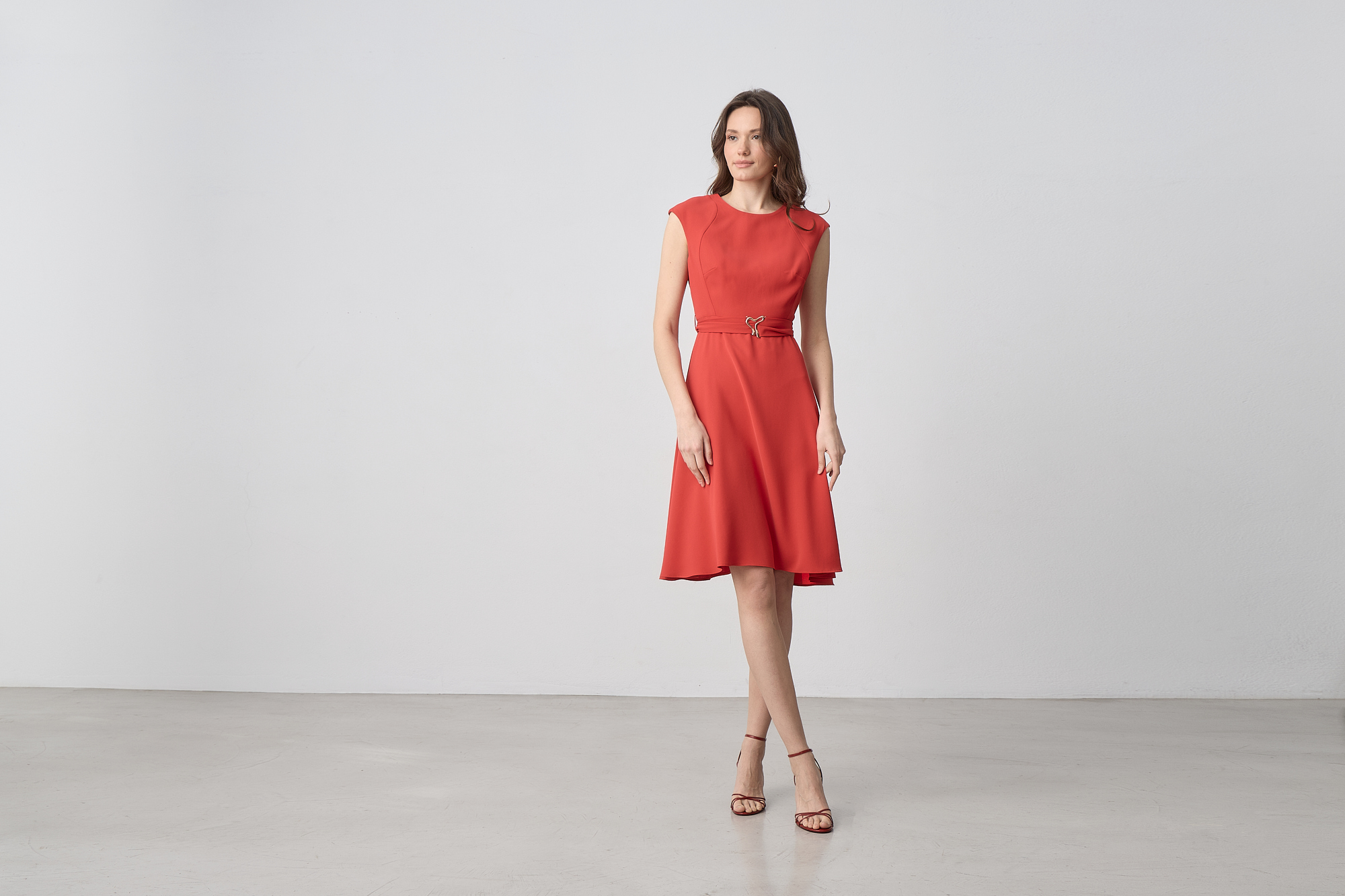 Φόρεμα midi κοντομάνικο με στρογγυλή λαιμόκοψη, σε Α γραμμή με αποσπώμενη ζώνη και διακοσμητική μεταλλική λεπτομέρεια, σε κανονική γραμμή