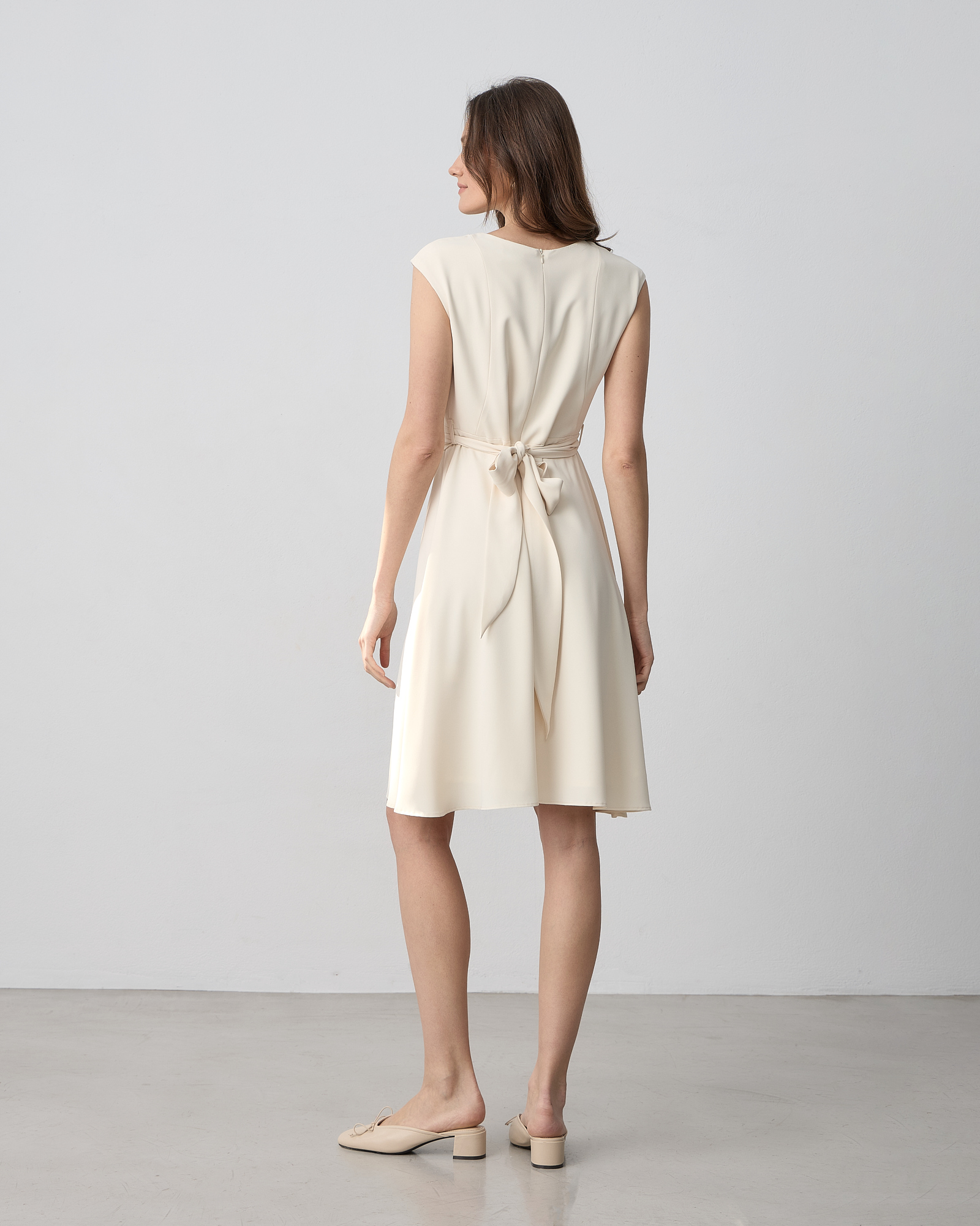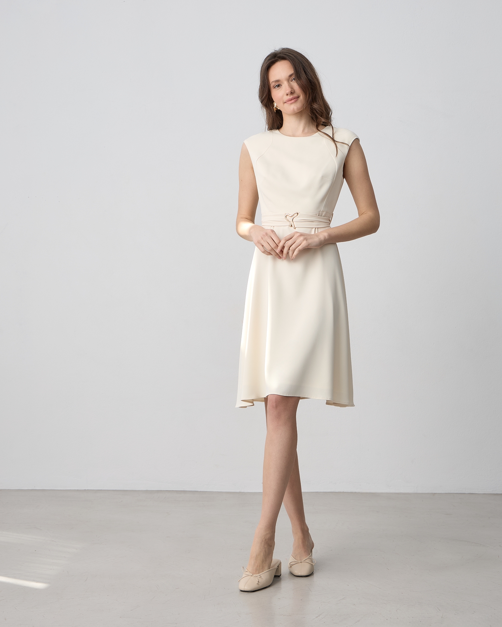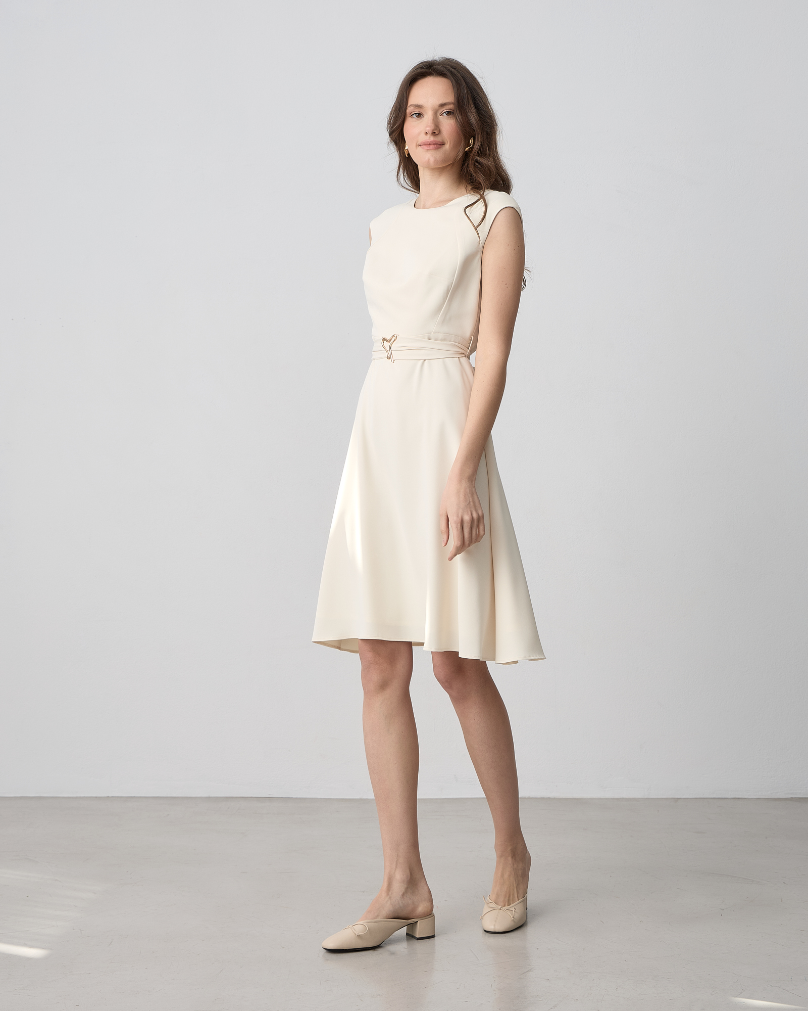 Φόρεμα midi κοντομάνικο με στρογγυλή λαιμόκοψη, σε Α γραμμή με αποσπώμενη ζώνη και διακοσμητική μεταλλική λεπτομέρεια, σε κανονική γραμμή