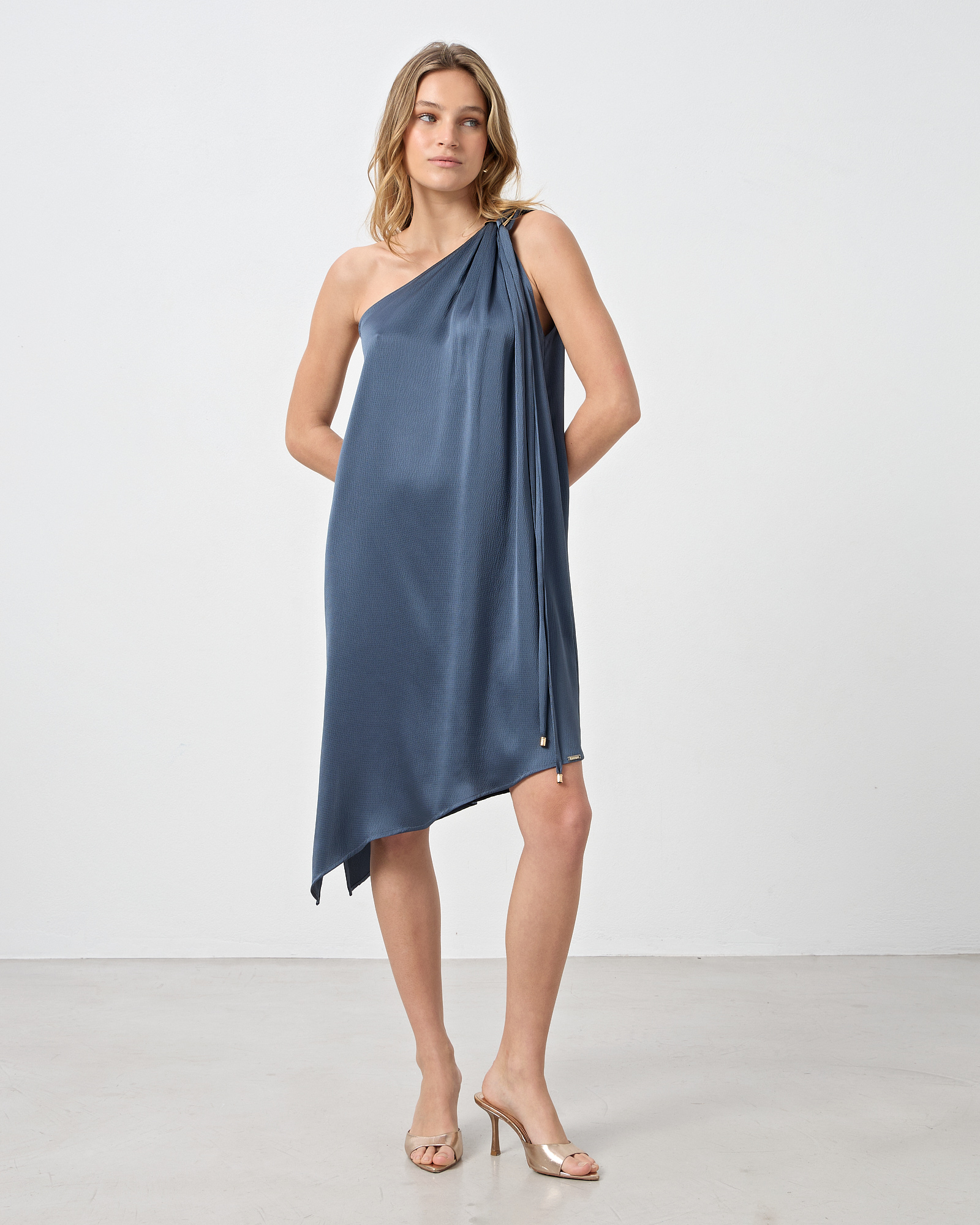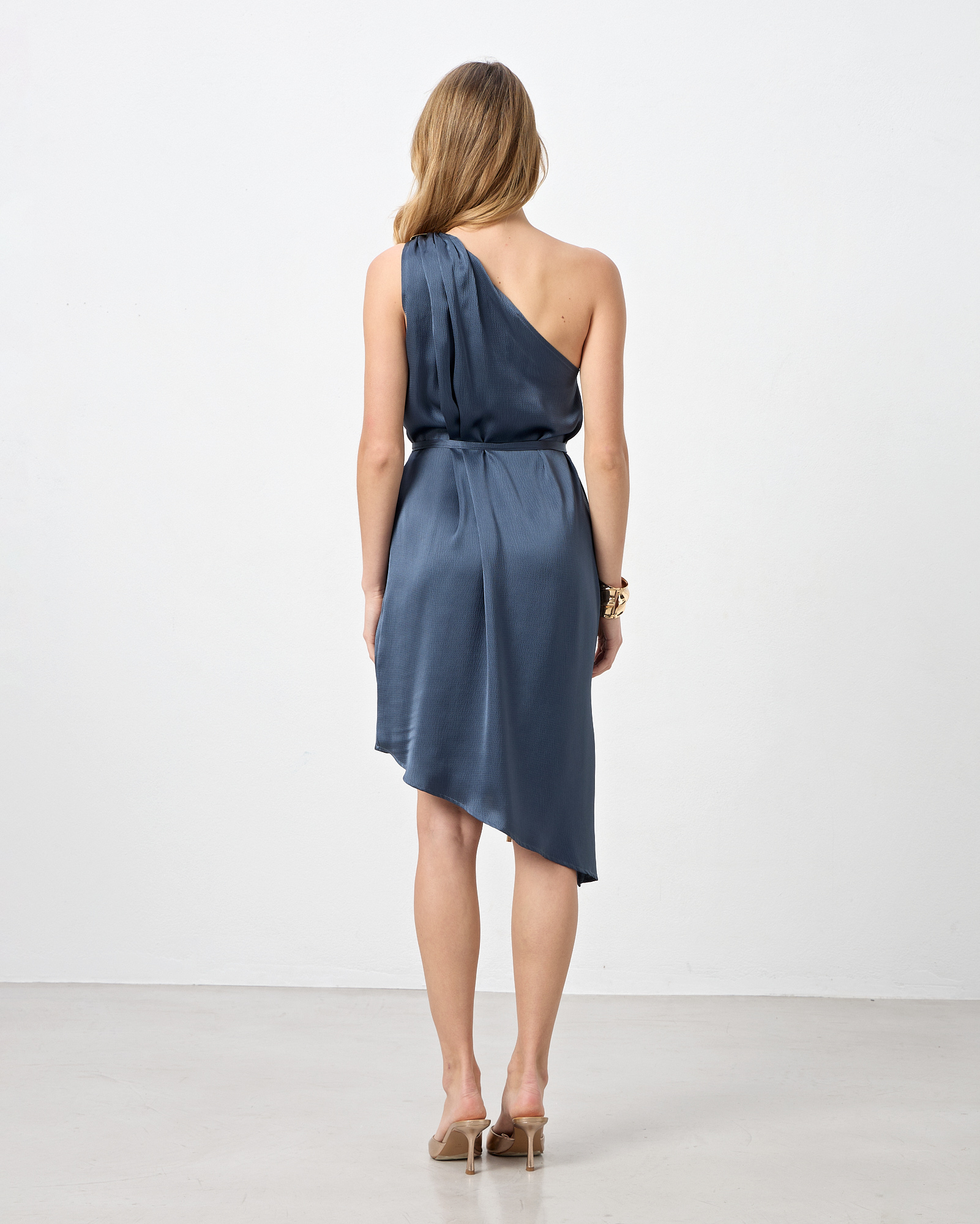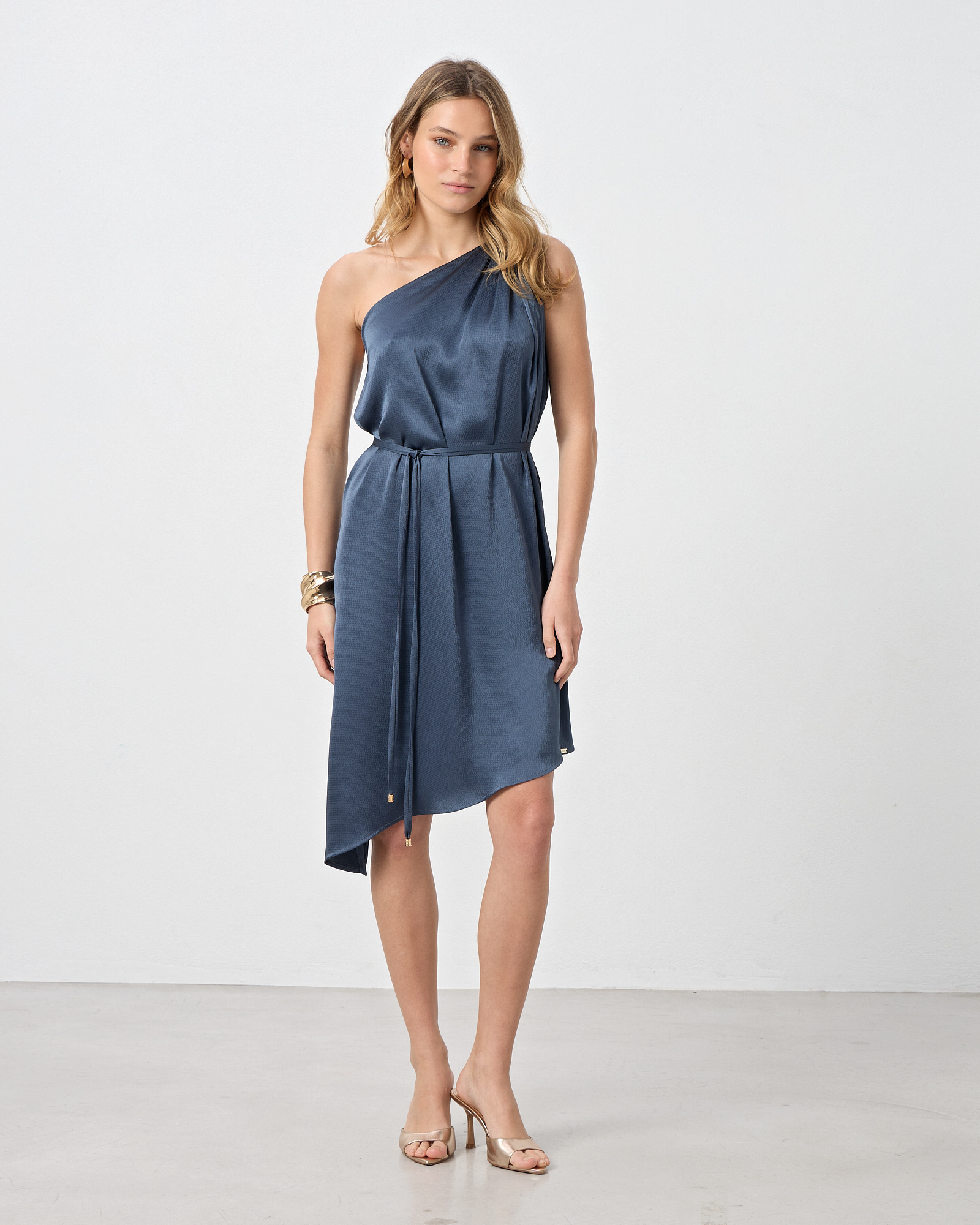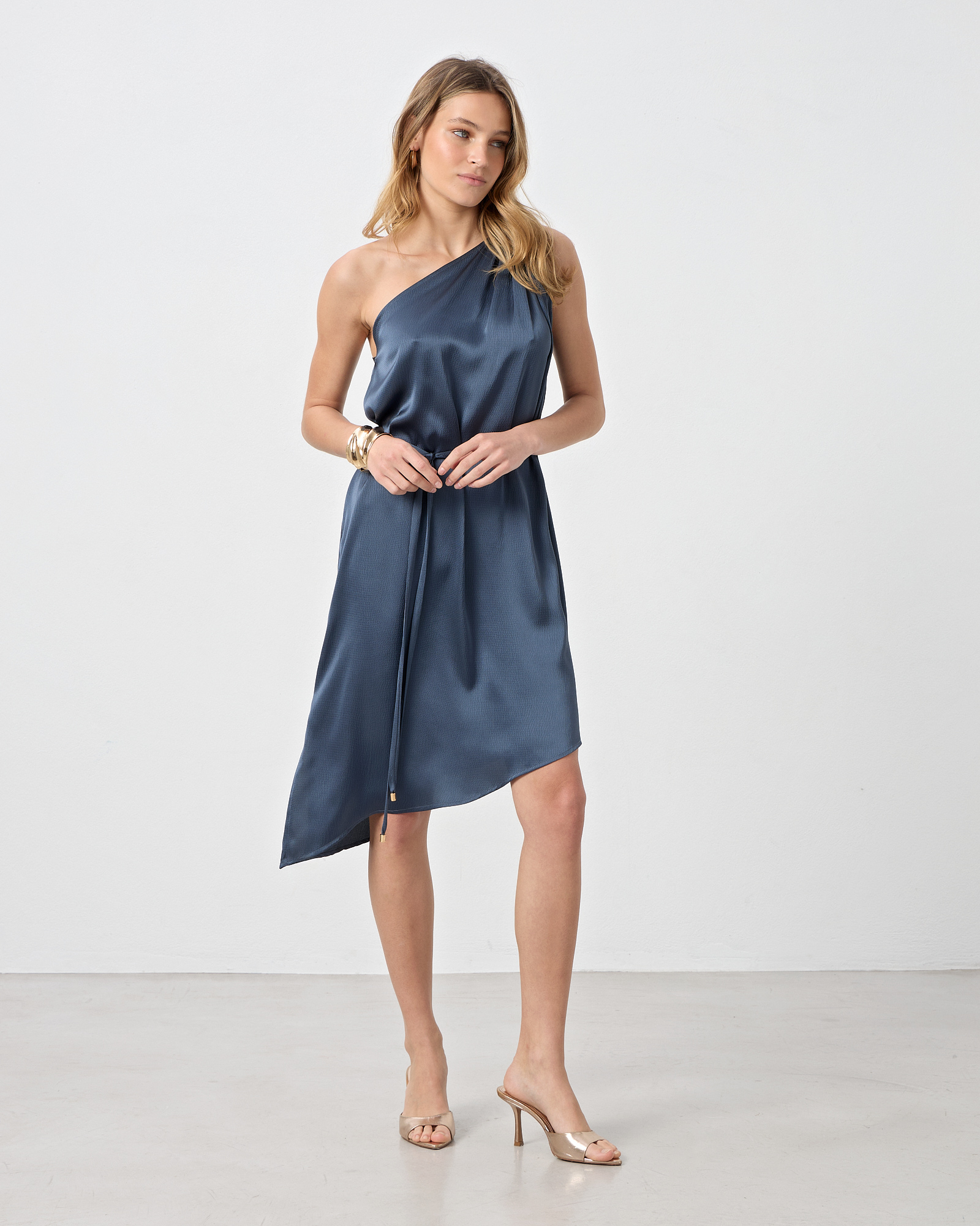 Φόρεμα με έναν ώμο,midi με ασύμμετρο τελείωμα, αποσπώμενη ζώνη με μεταλλικές λεπτομέρειες, σε όψη σατέν, σε κανονική εφαρμογή
