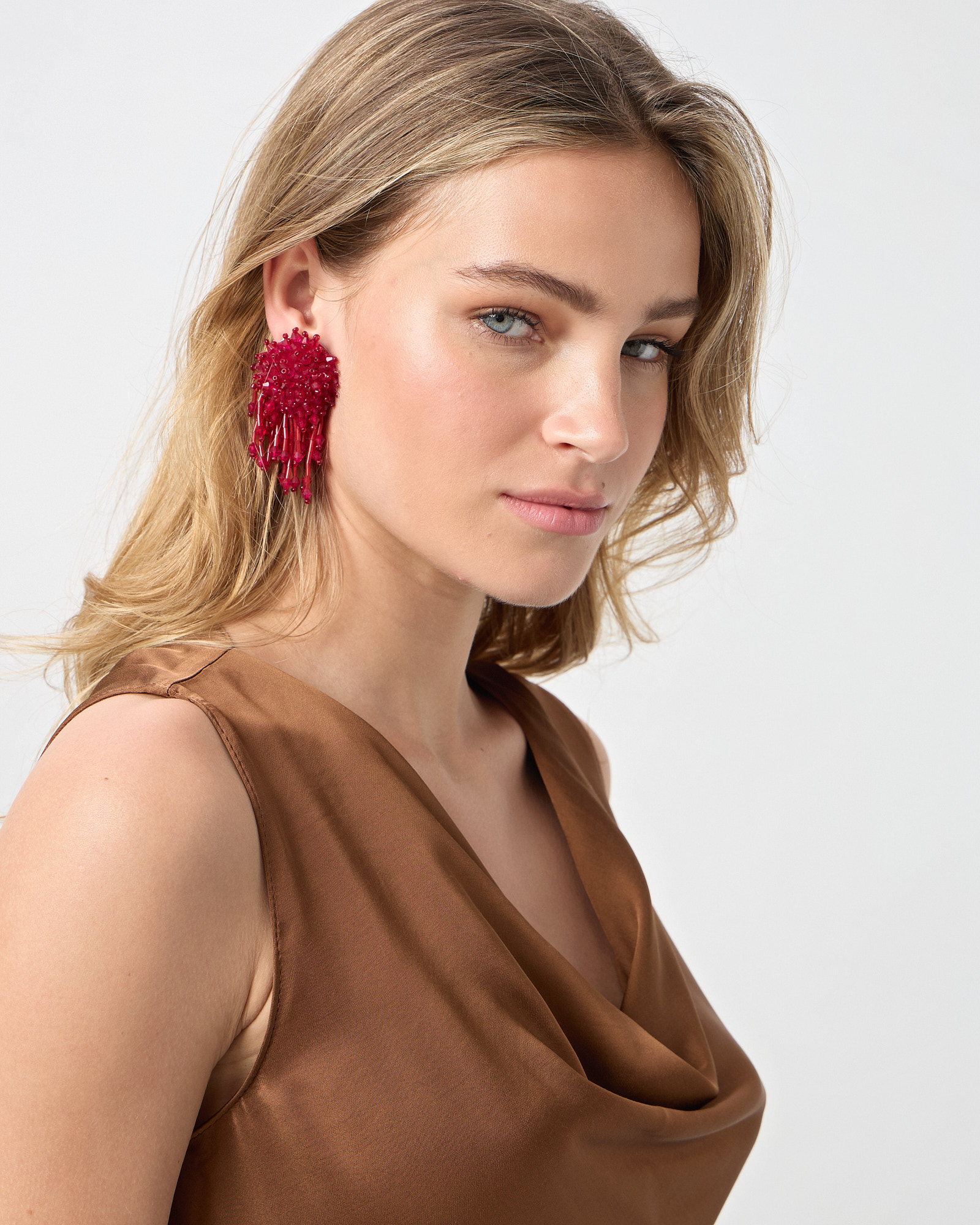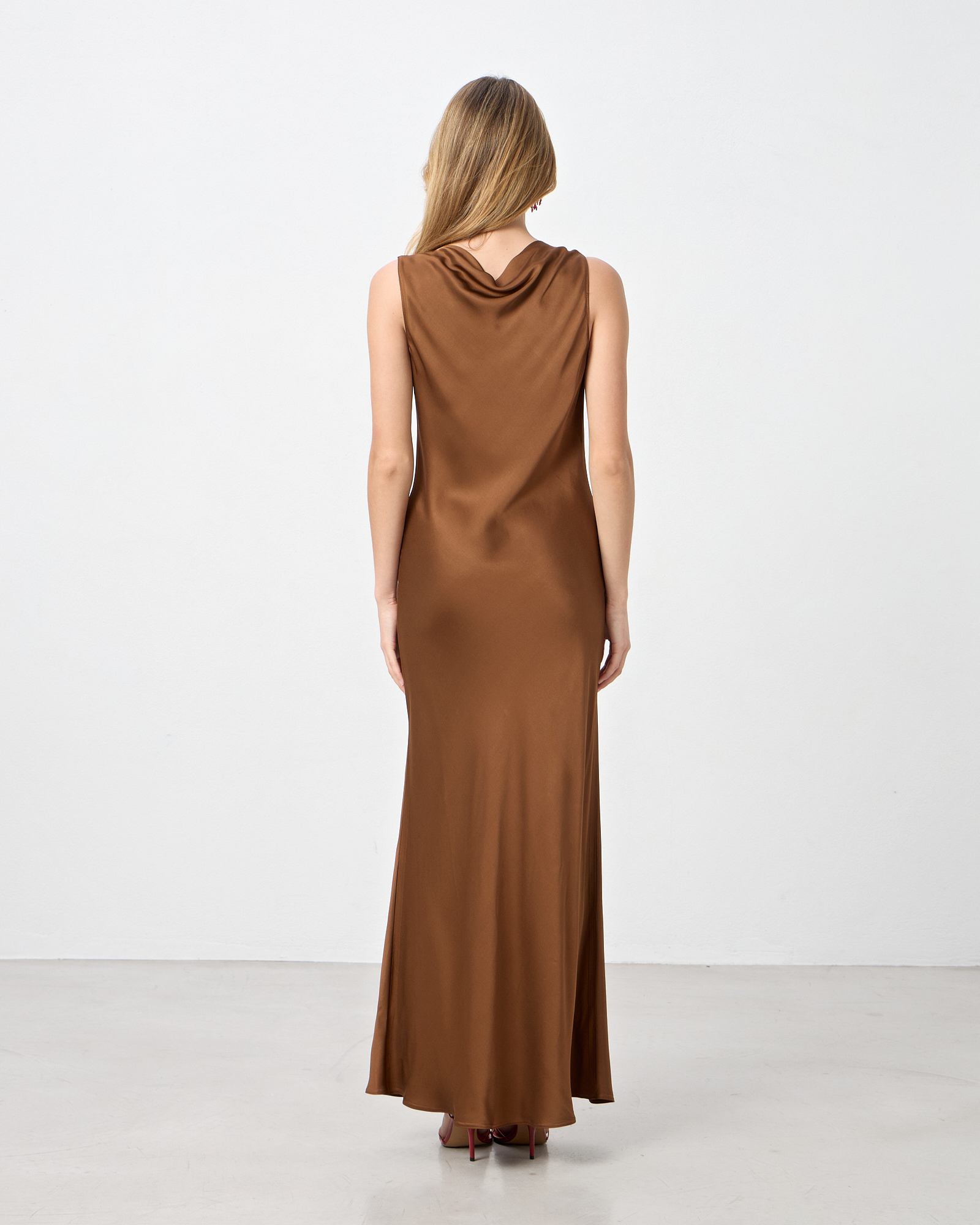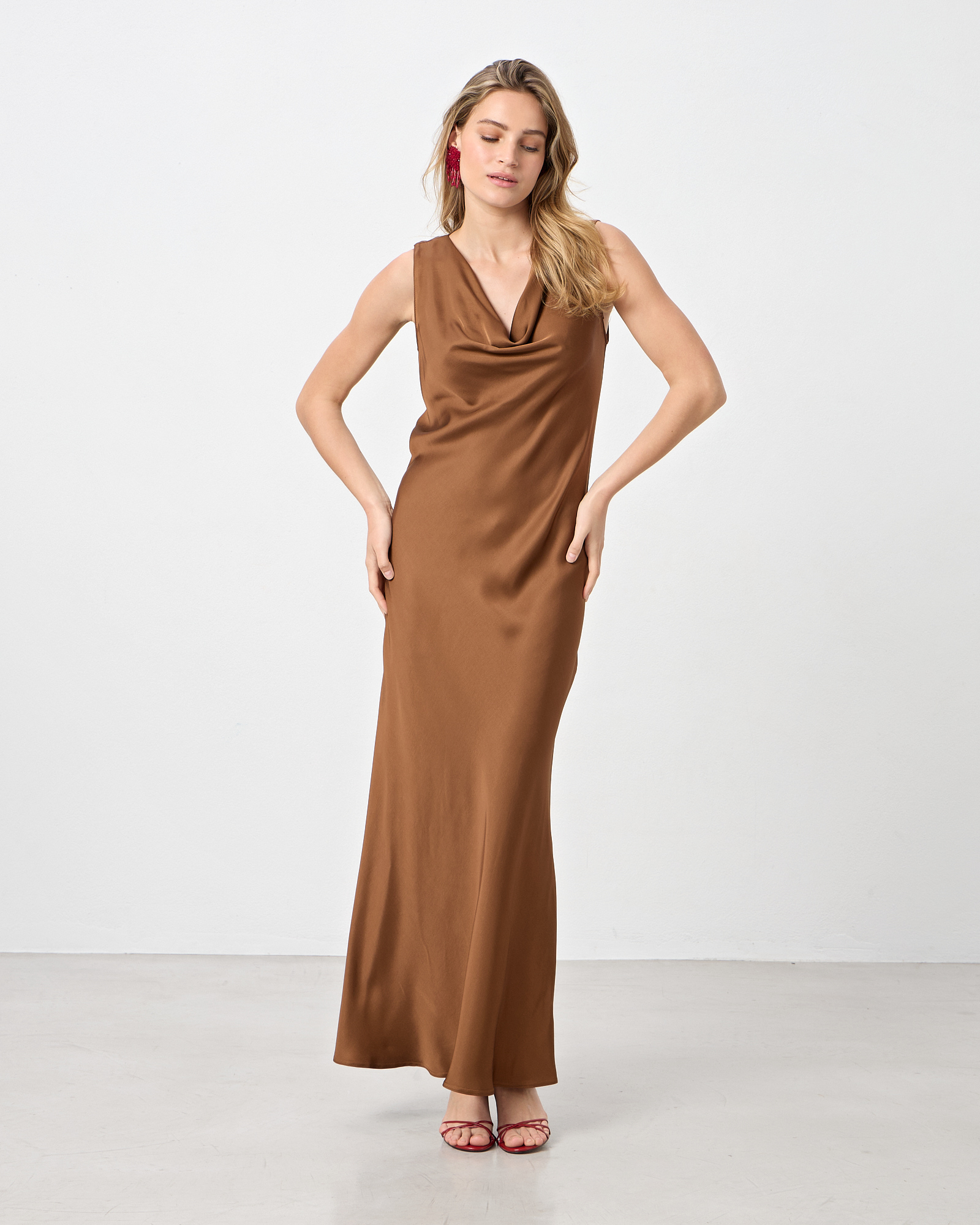 Φόρεμα αμάνικο με ντραπέ λαιμόκοψη σε σατέν βισκόζ ύφασμα, σε ίσια γραμμή, κανονική εφαρμογή