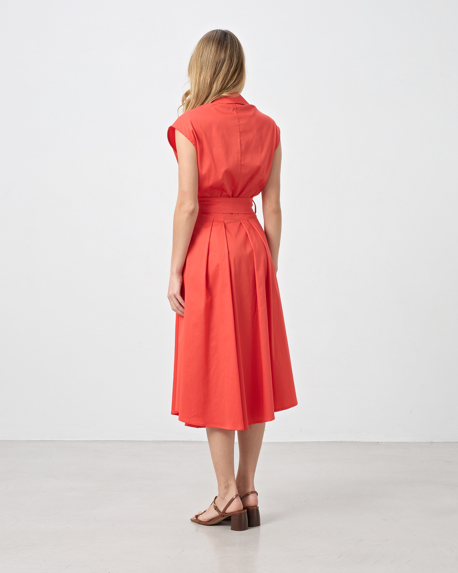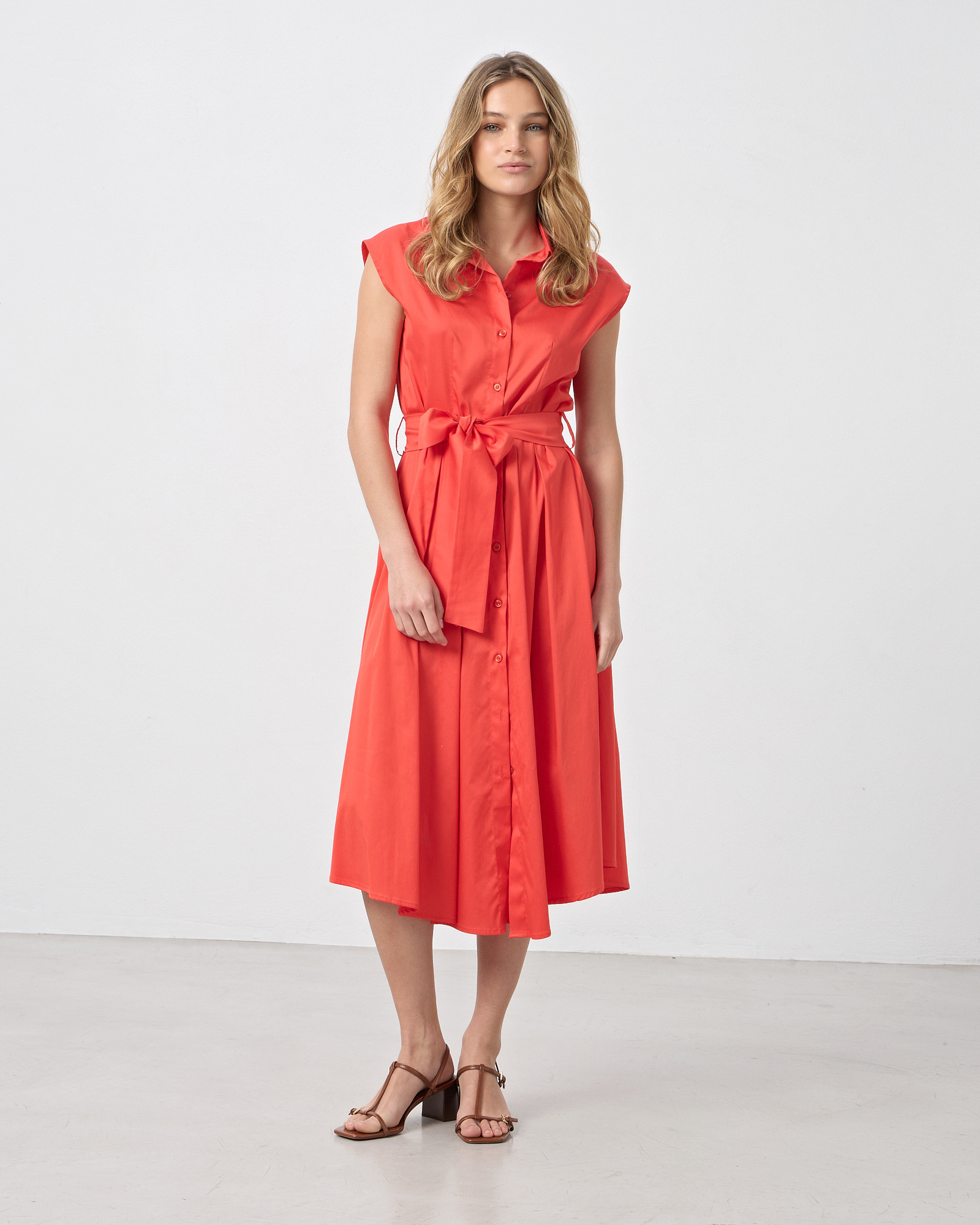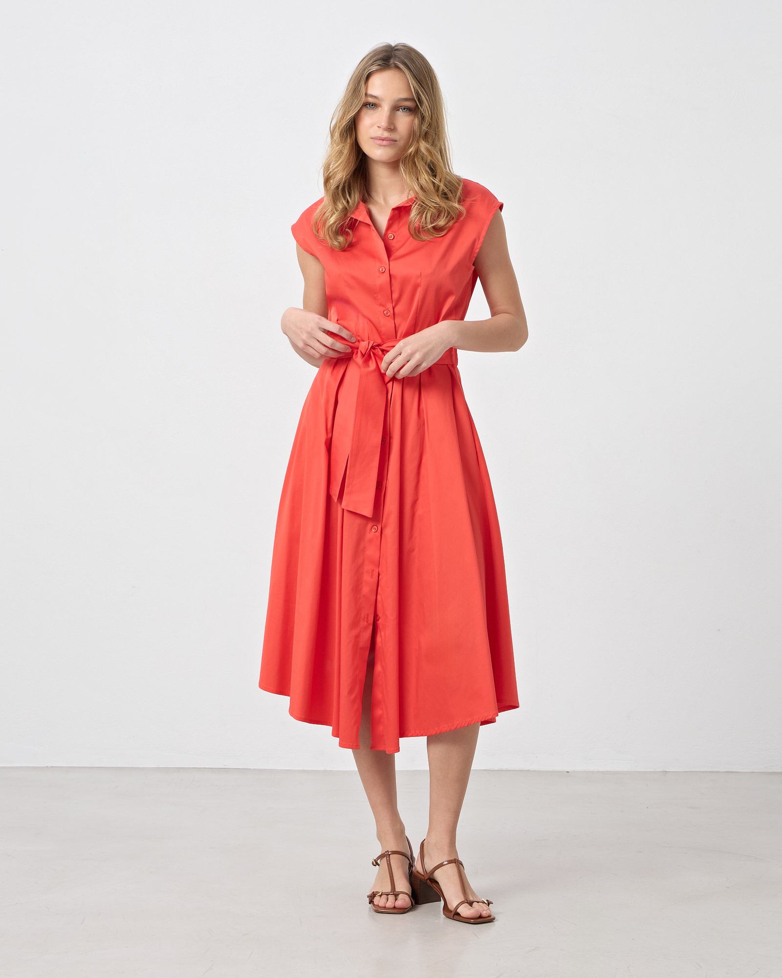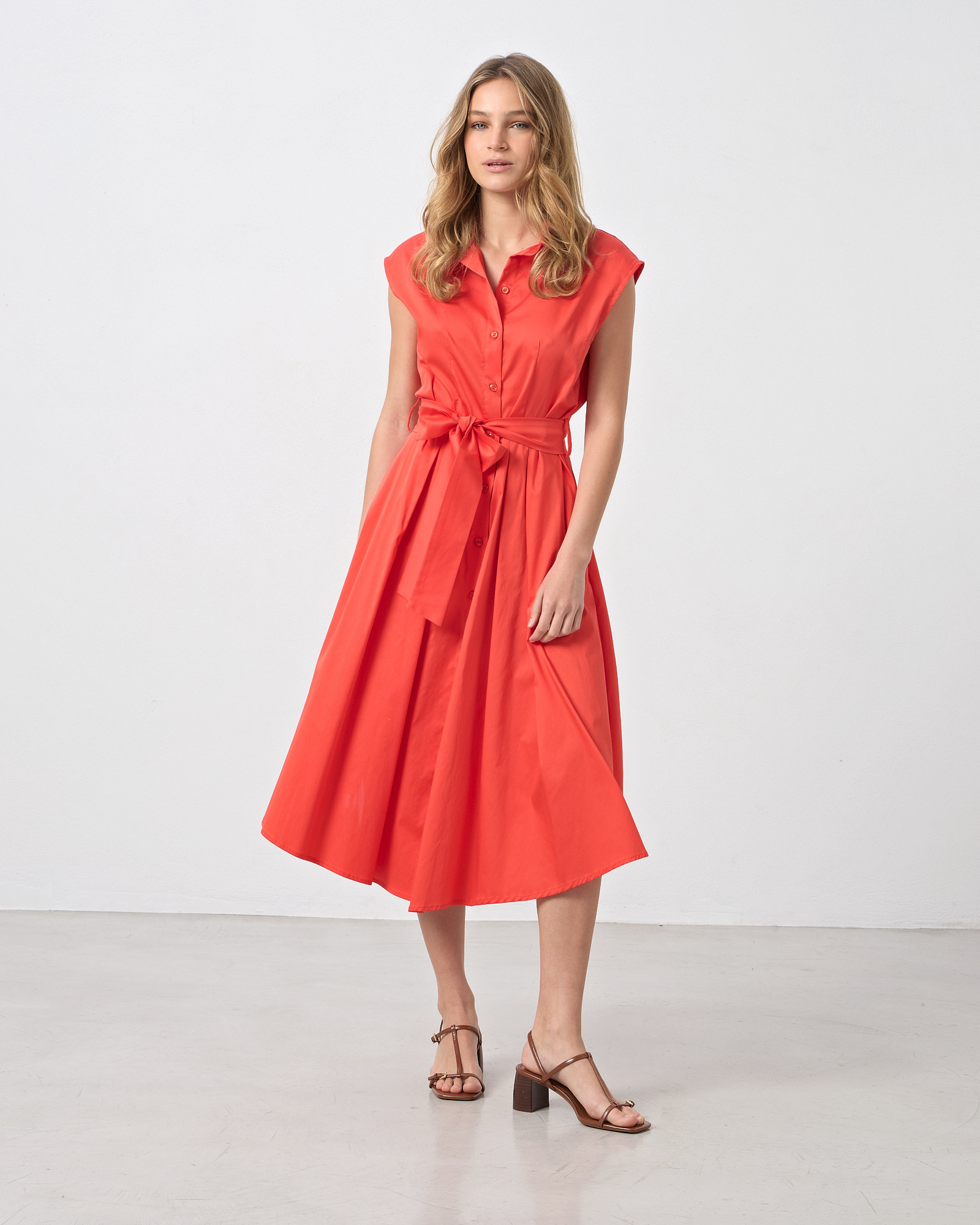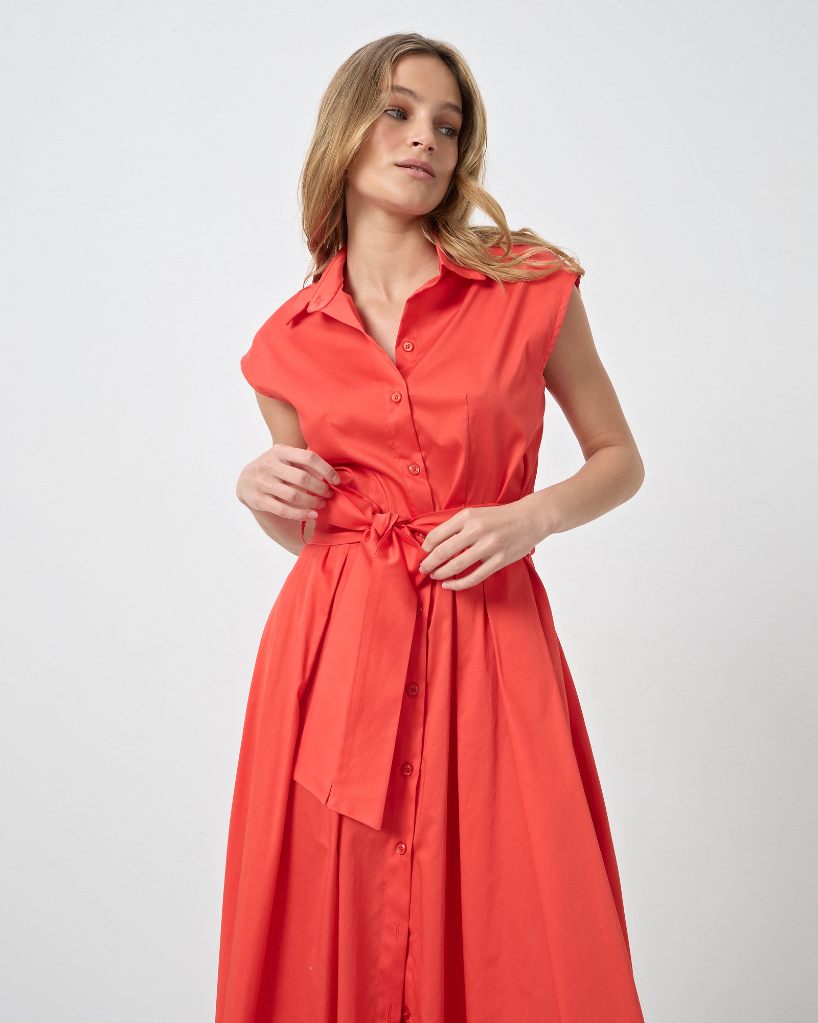 Φόρεμα midi ποπλίνα αμάνικο με γιακά, κλείσιμο μπροστά με κουμπιά, αποσπώμενη ζώνη, σε κανονική γραμμή