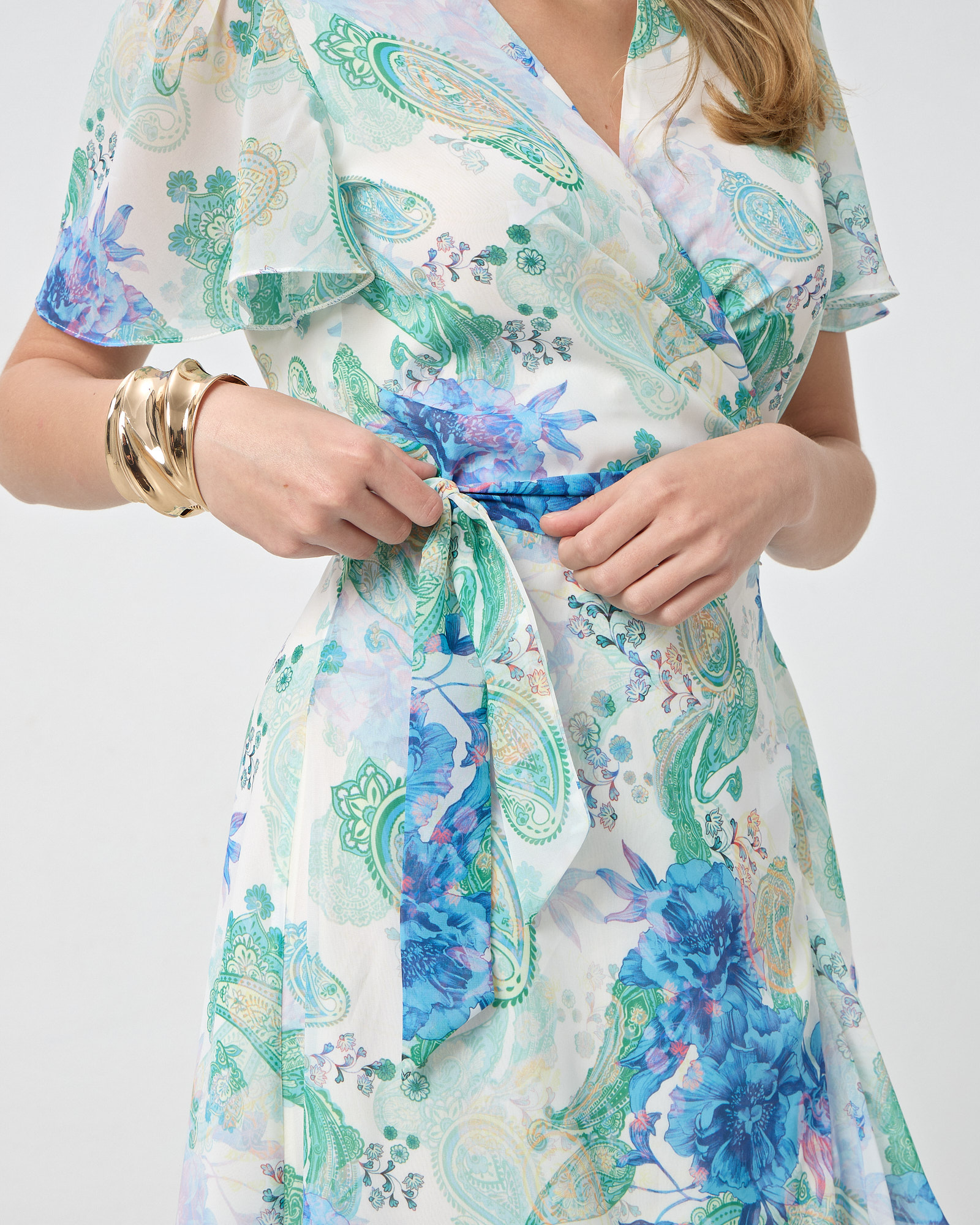 Φόρεμα midi κρουαζέ σε φλοράλ print με V λαιμόκοψη, κοντό μανίκι, ασύμμετρο τελείωμα, εσωτερική φόδρα σε ανάλαφρο και αέρινο ύφασμα σε κανονική εφαρμογή