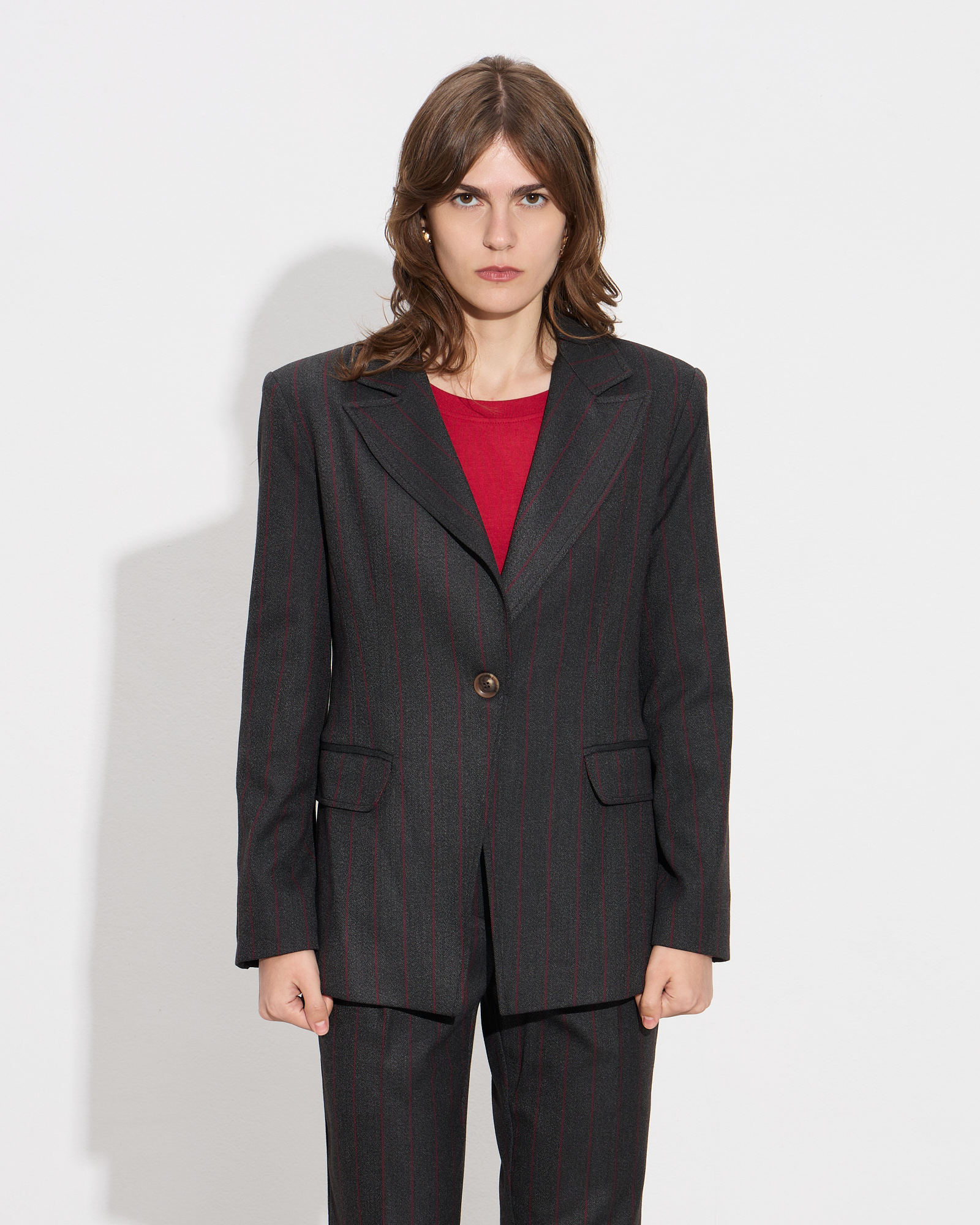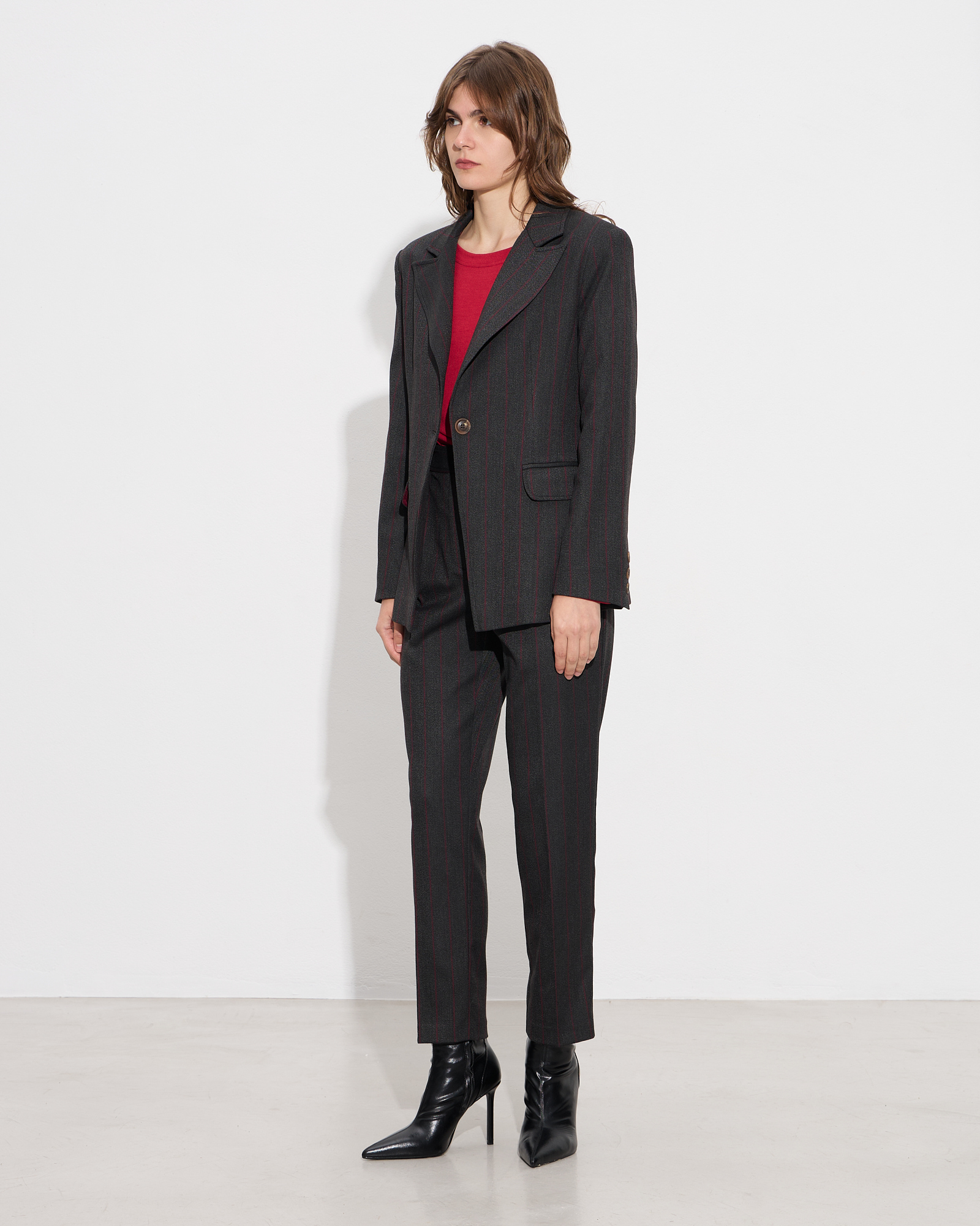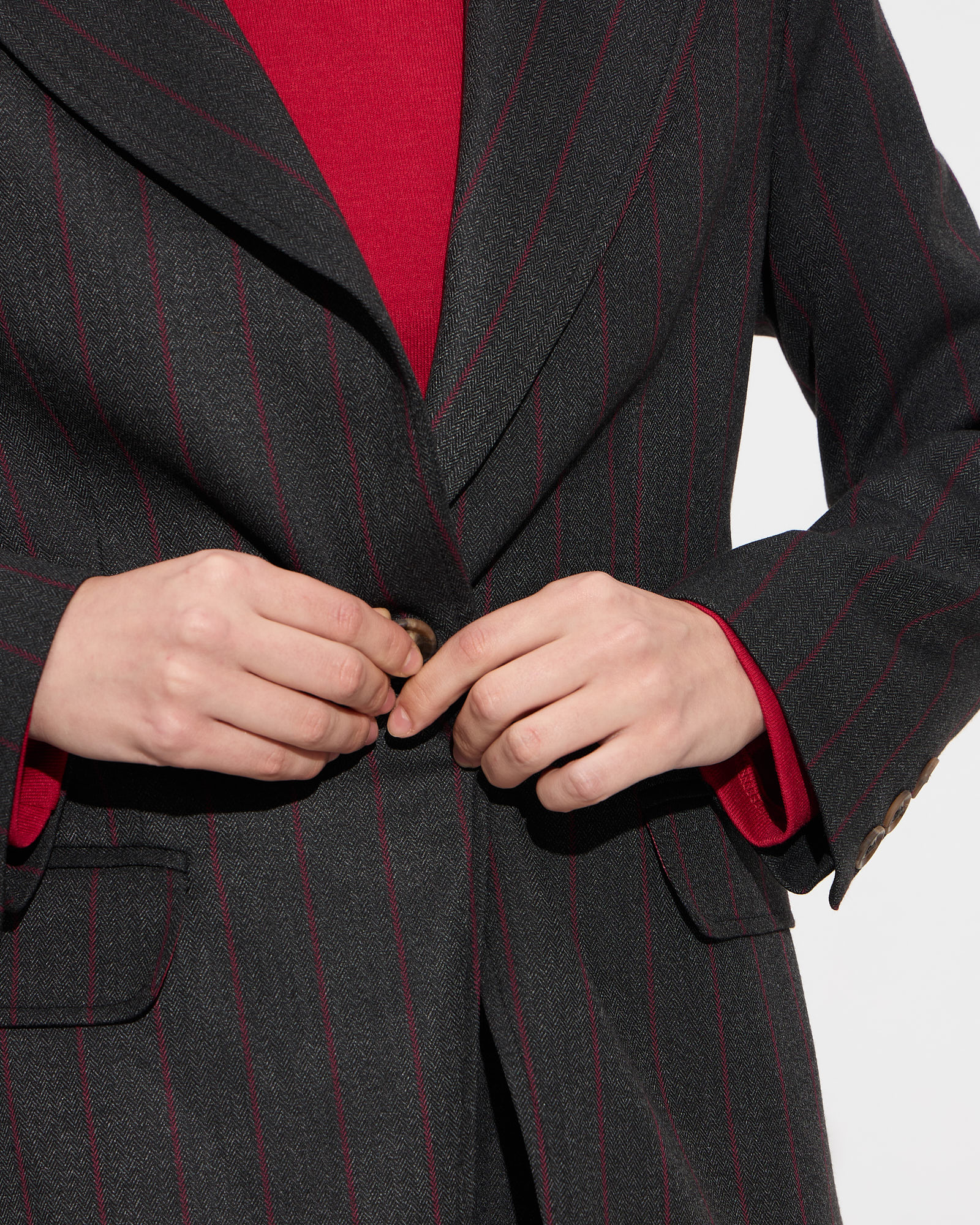 Σακάκι μεσάτο ρίγα με γιακά με πέτο, μακρύ μανίκι με διακοσμητικά κουμπιά στο τελείωμα, κλείσιμο με κουμπί, μπροστινές τσέπες, σε κανονική γραμμή