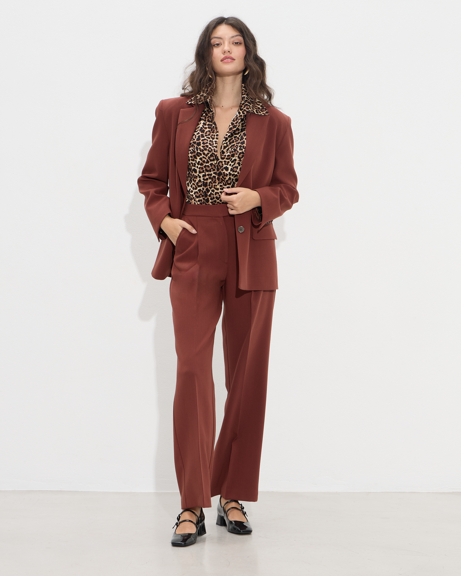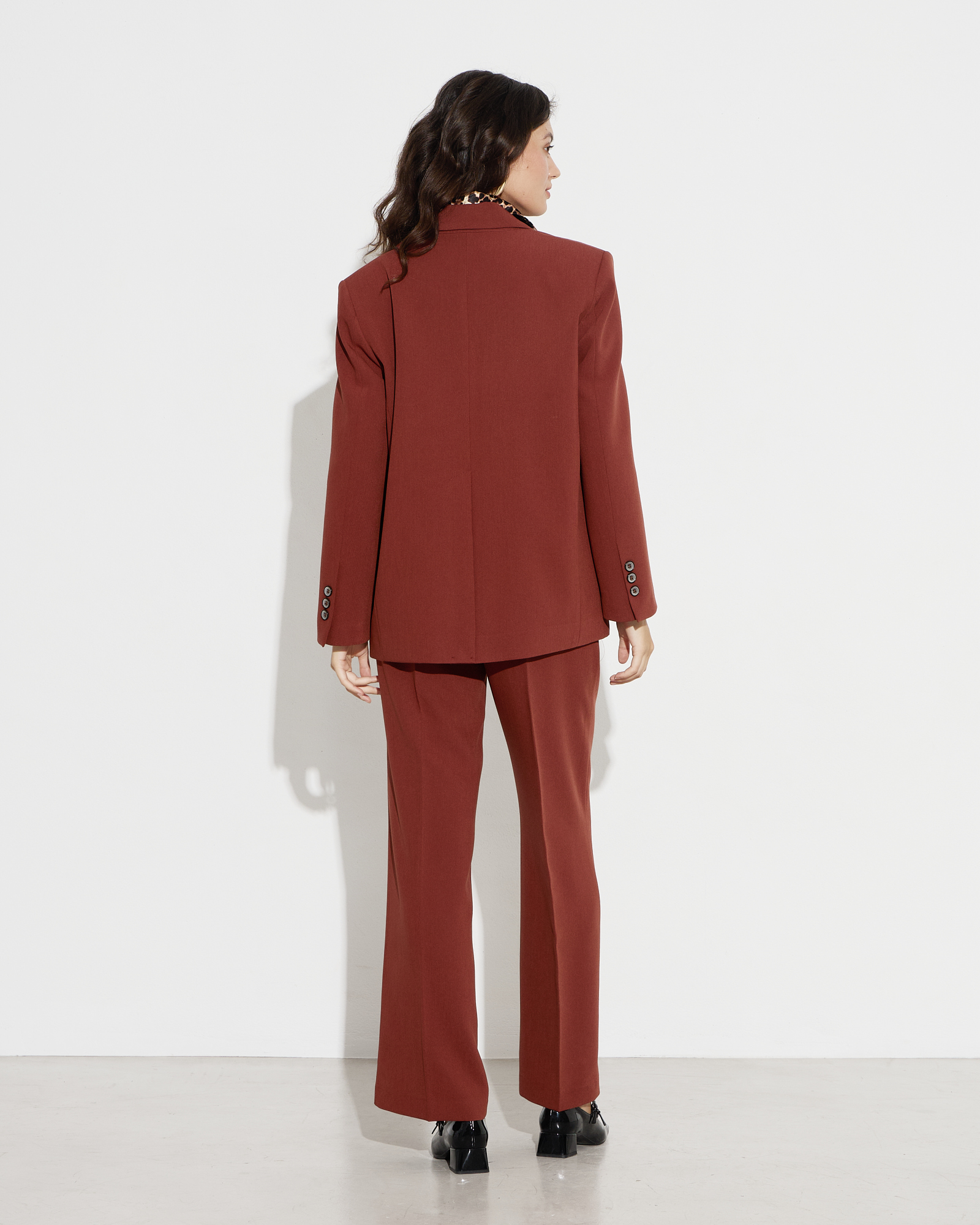 Μπλέιζερ oversize με γιακά, πέτο και μακρύ μανίκι με βάτες, μπροστινές τσέπες με καπάκι, σταυρωτό κλείσιμο με κουμπιά, σε άνετη γραμμή