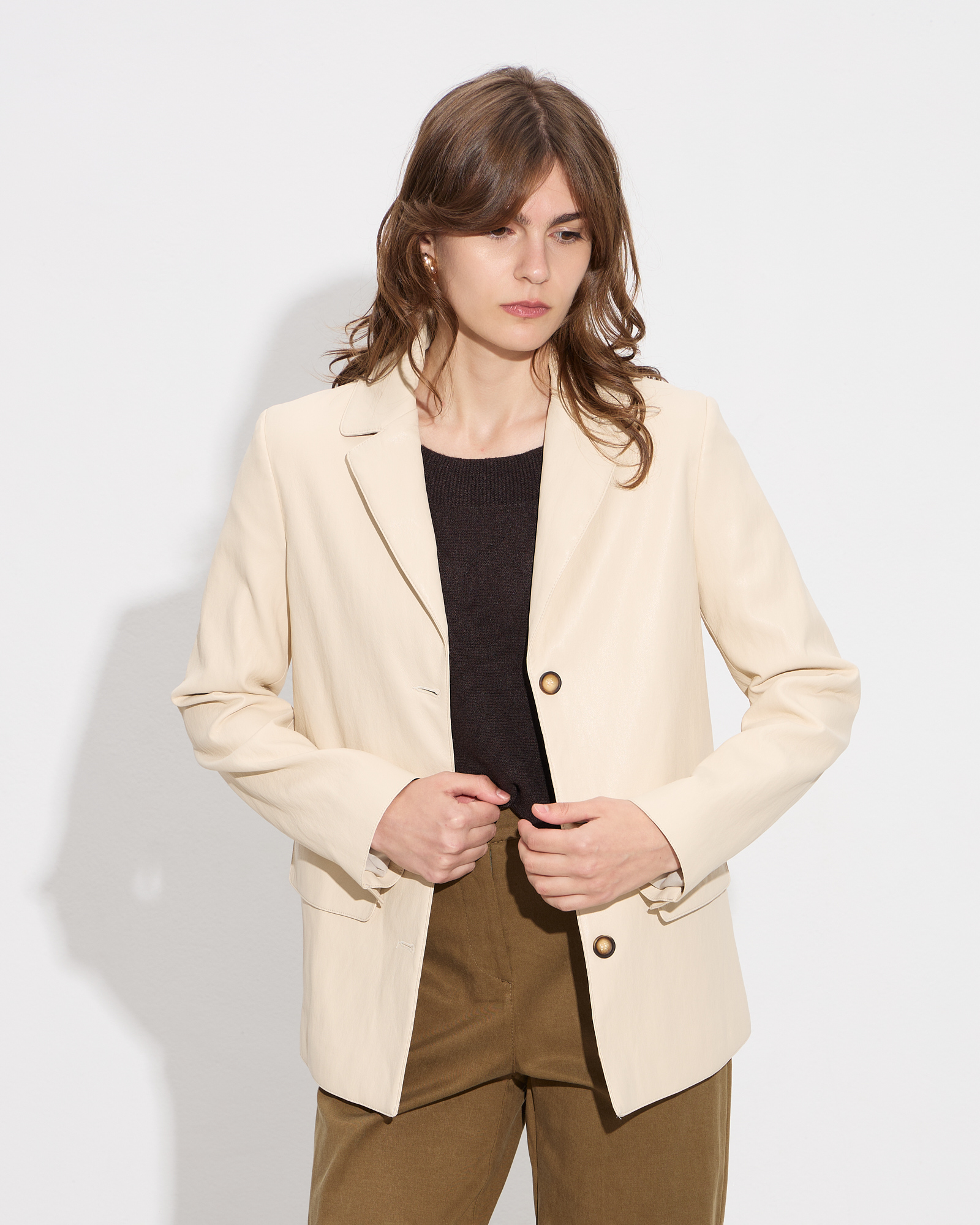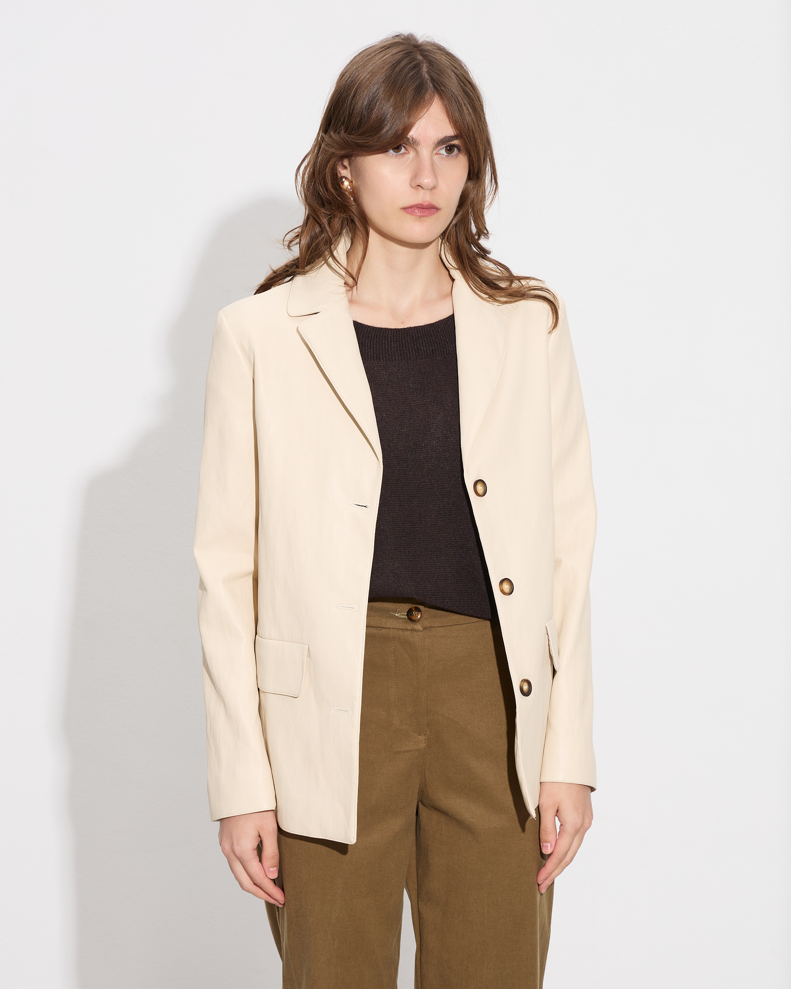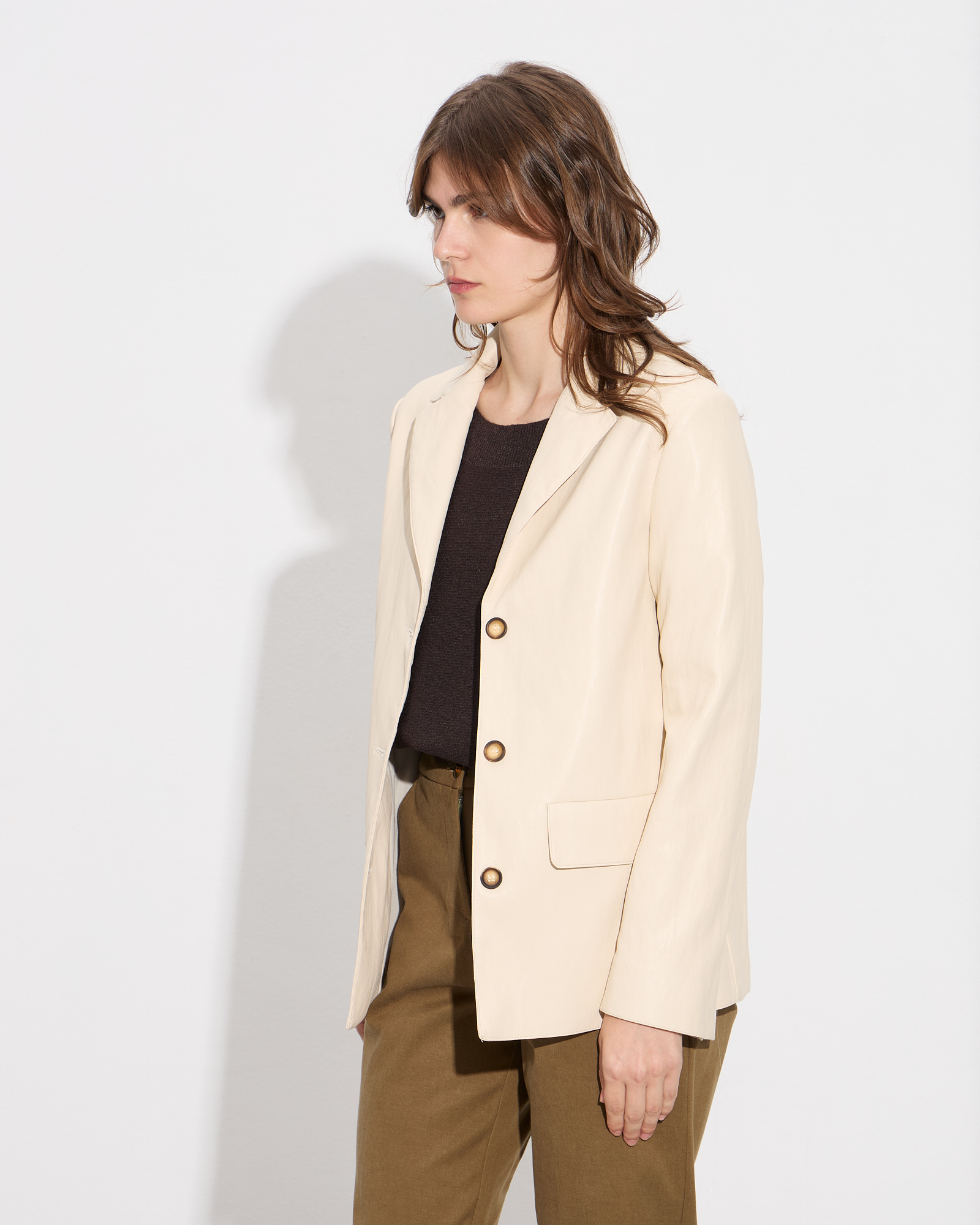 Σακάκι blazer δερματίνη, γιακάς με πέτο, κλείσιμο με κουμπιά μπροστά, πλαϊνές τσέπες με καπάκι, μαλακή υφή, σε κανονική εφαρμογή