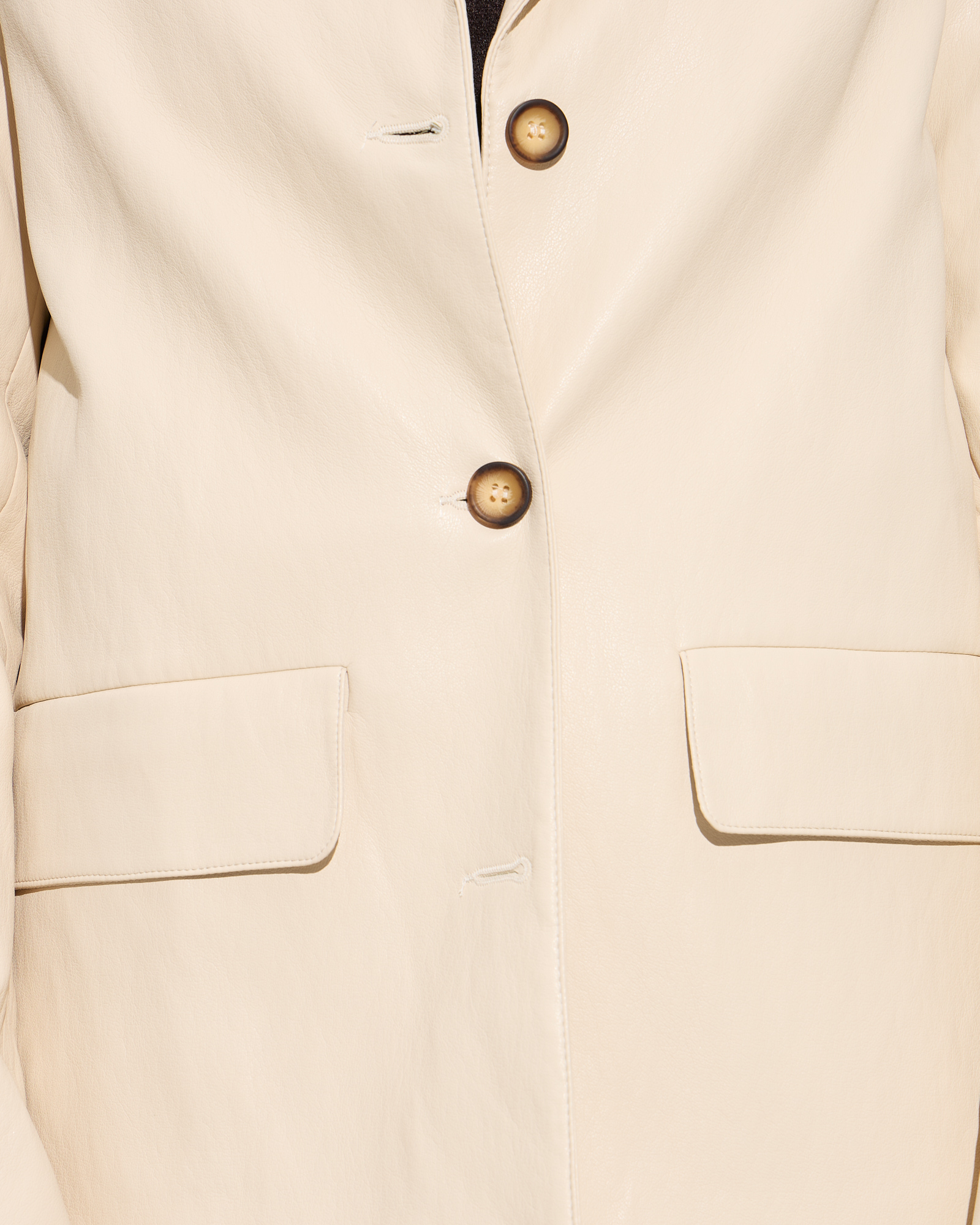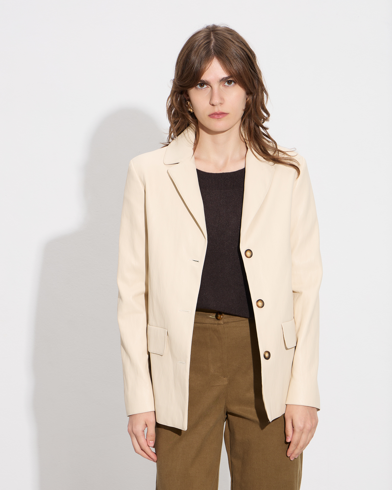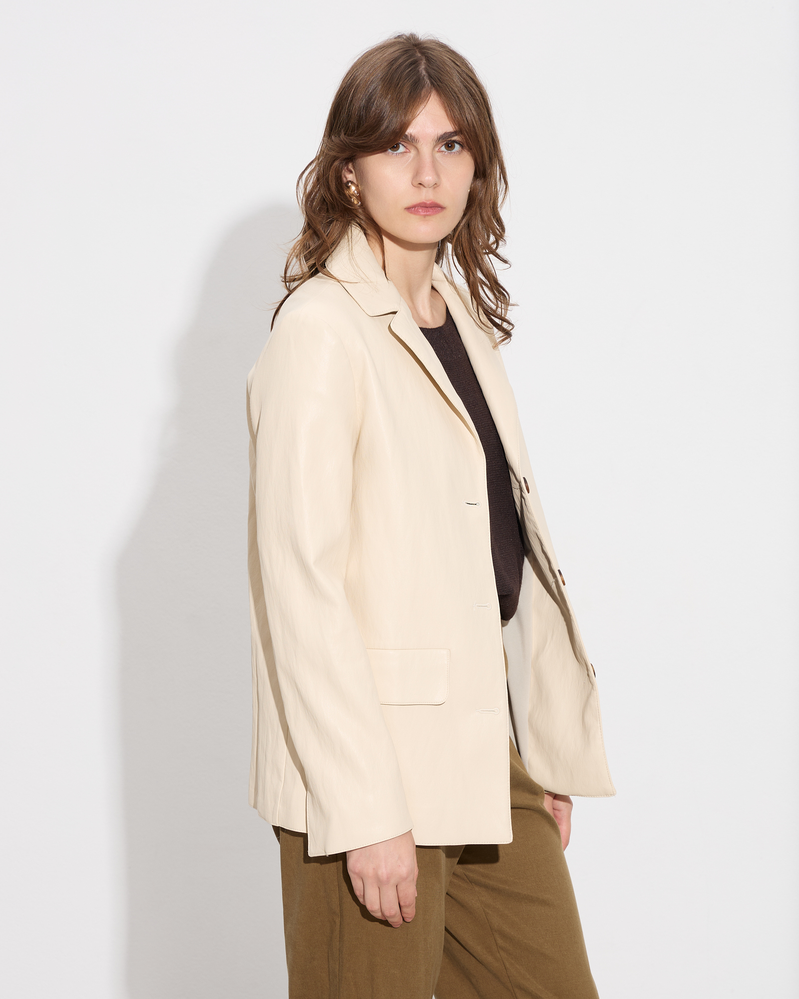 Σακάκι blazer δερματίνη, γιακάς με πέτο, κλείσιμο με κουμπιά μπροστά, πλαϊνές τσέπες με καπάκι, μαλακή υφή, σε κανονική εφαρμογή