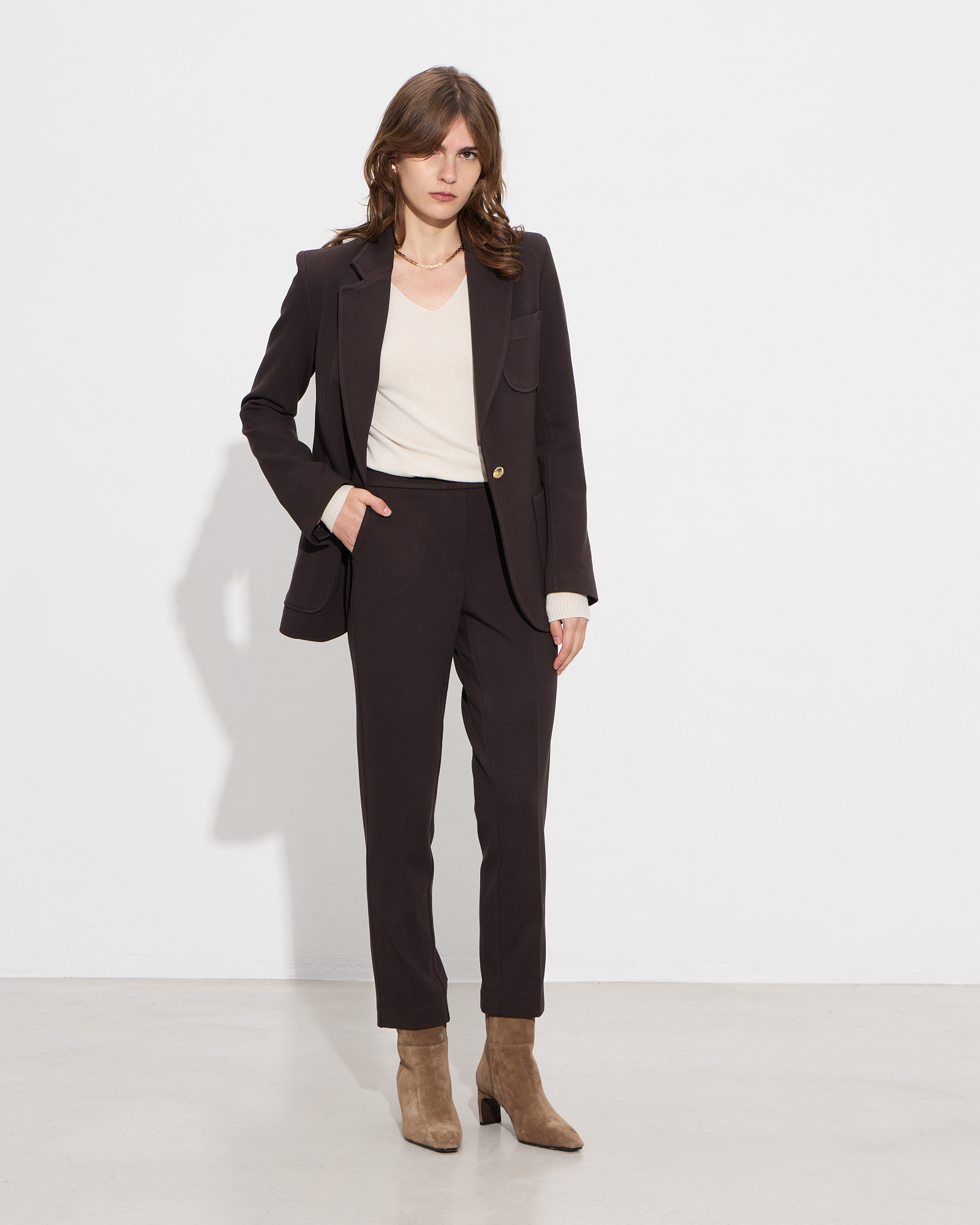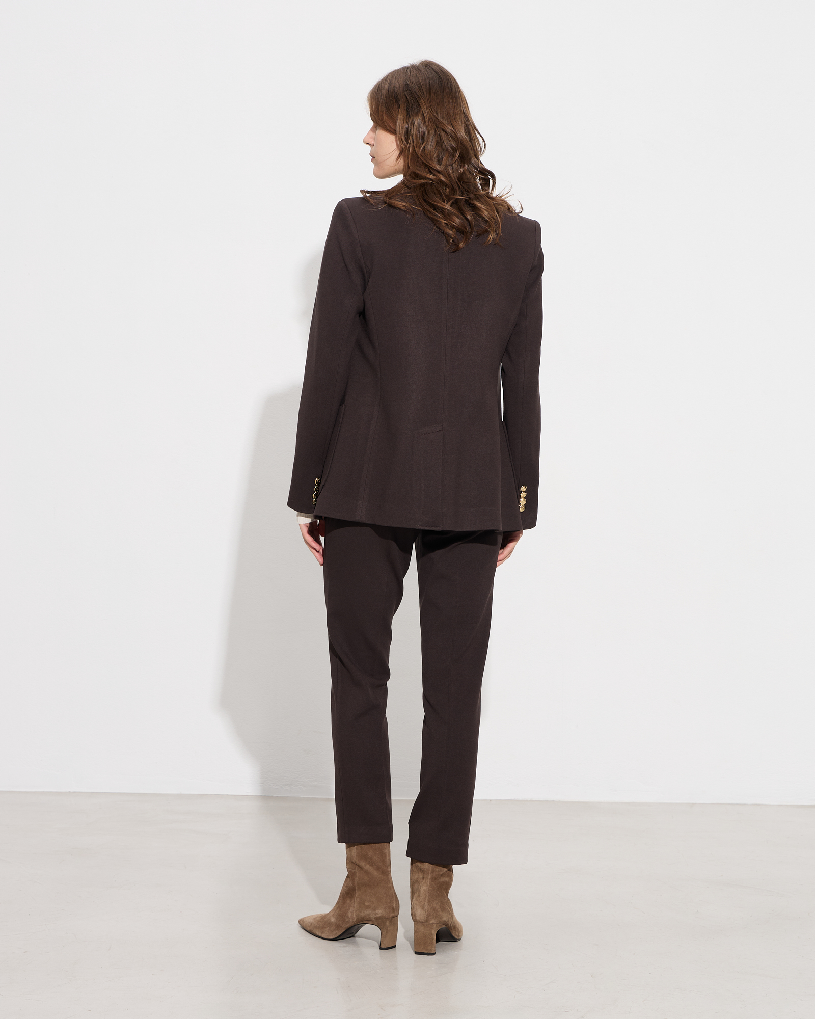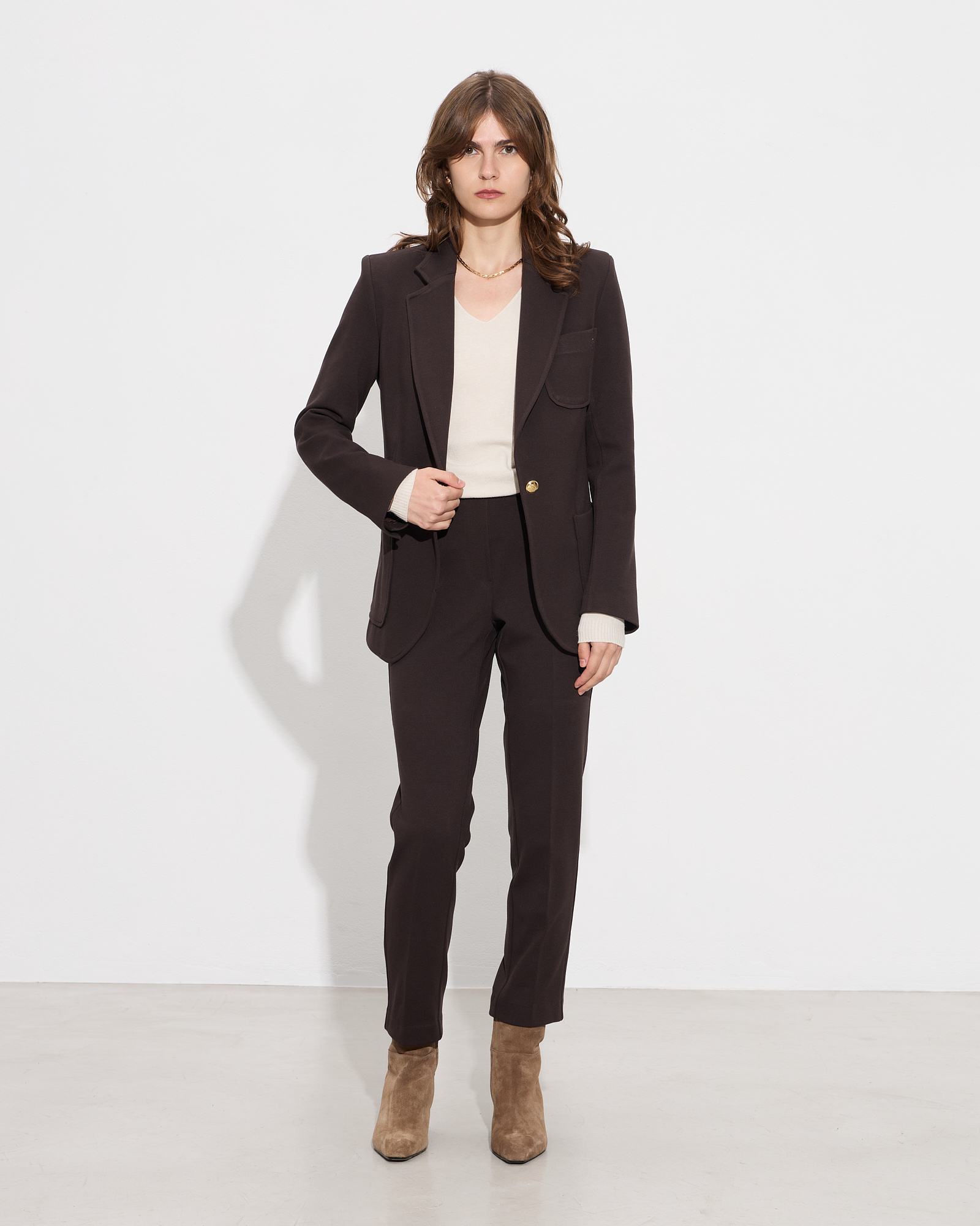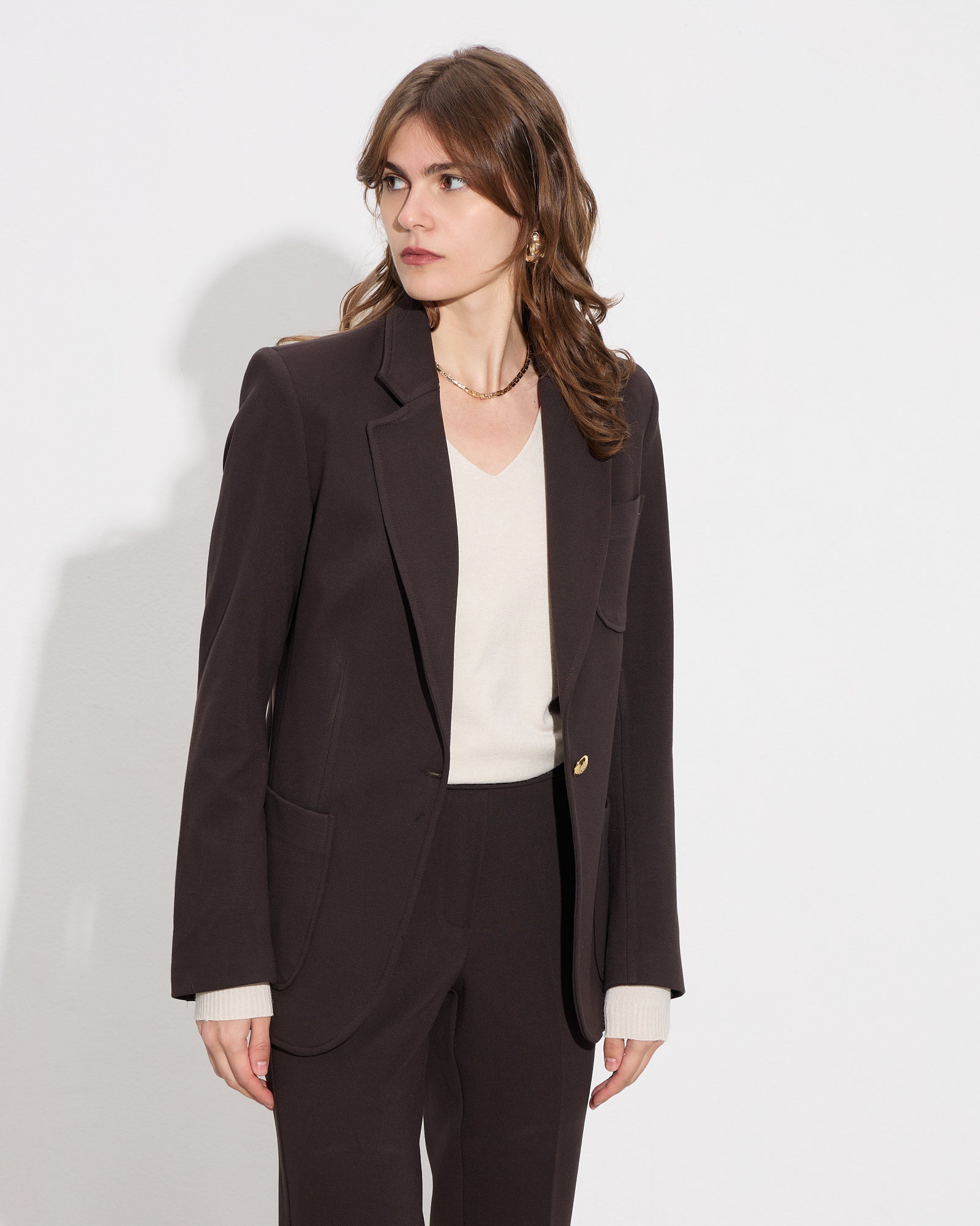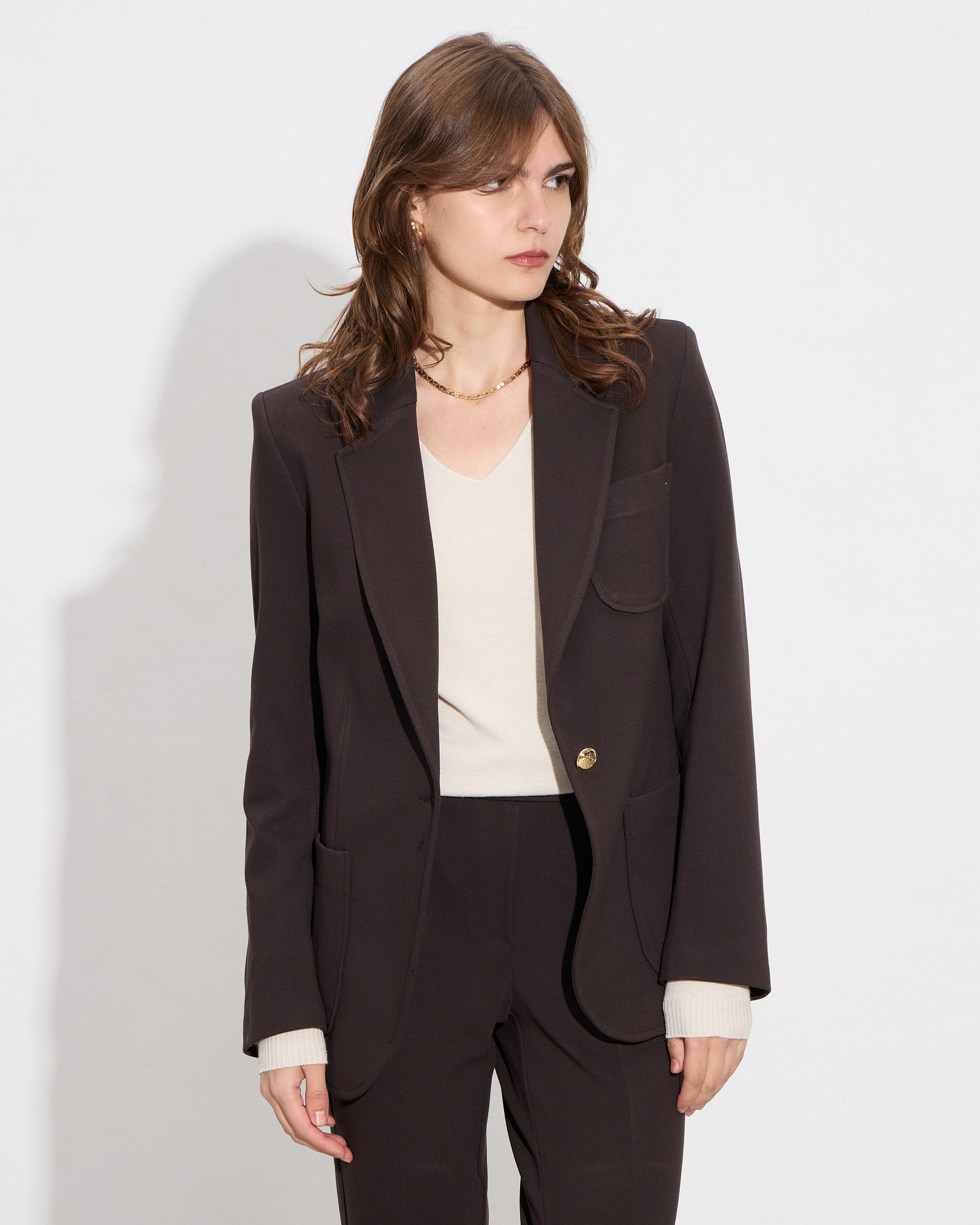 Σακάκι σε ίσια γραμμή, γιακάς με πέτο, κλείσιμο με ένα κουμπί, μακριά μανίκια με κουμπιά στο τελείωμα, ελαφριά βάτα στους ώμους, patch τσέπη στο στήθος και μπροστά, σε κανονμική γραμμή