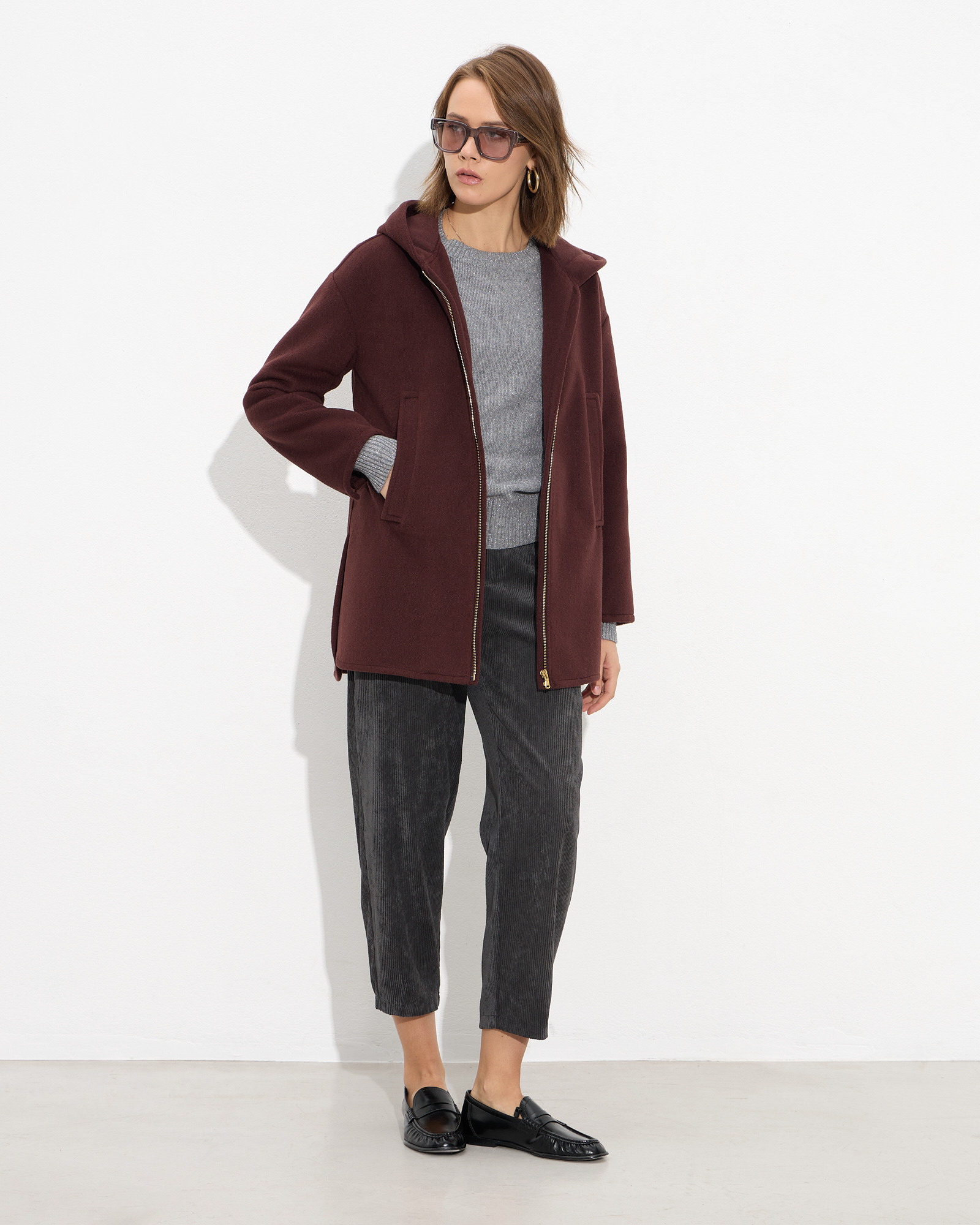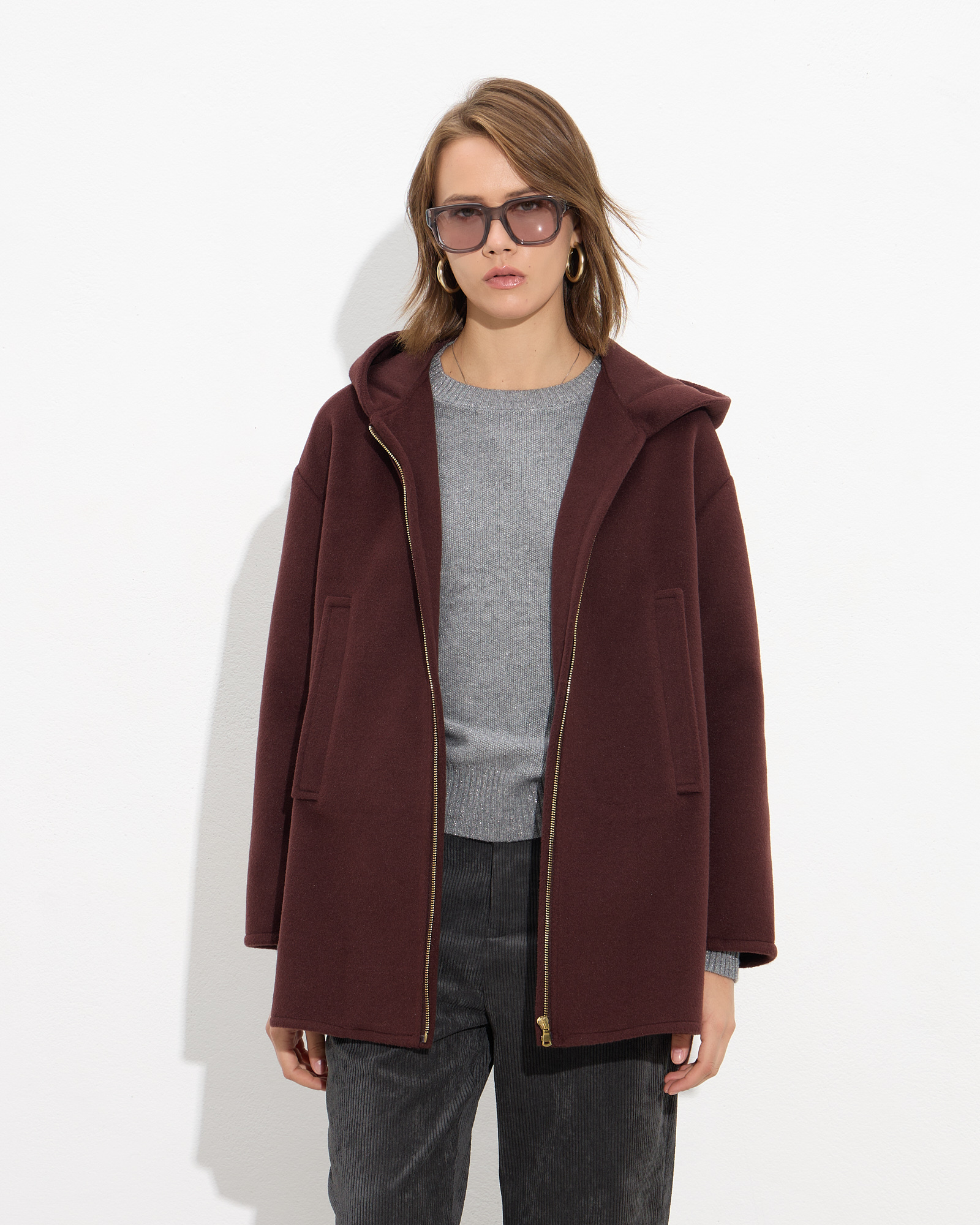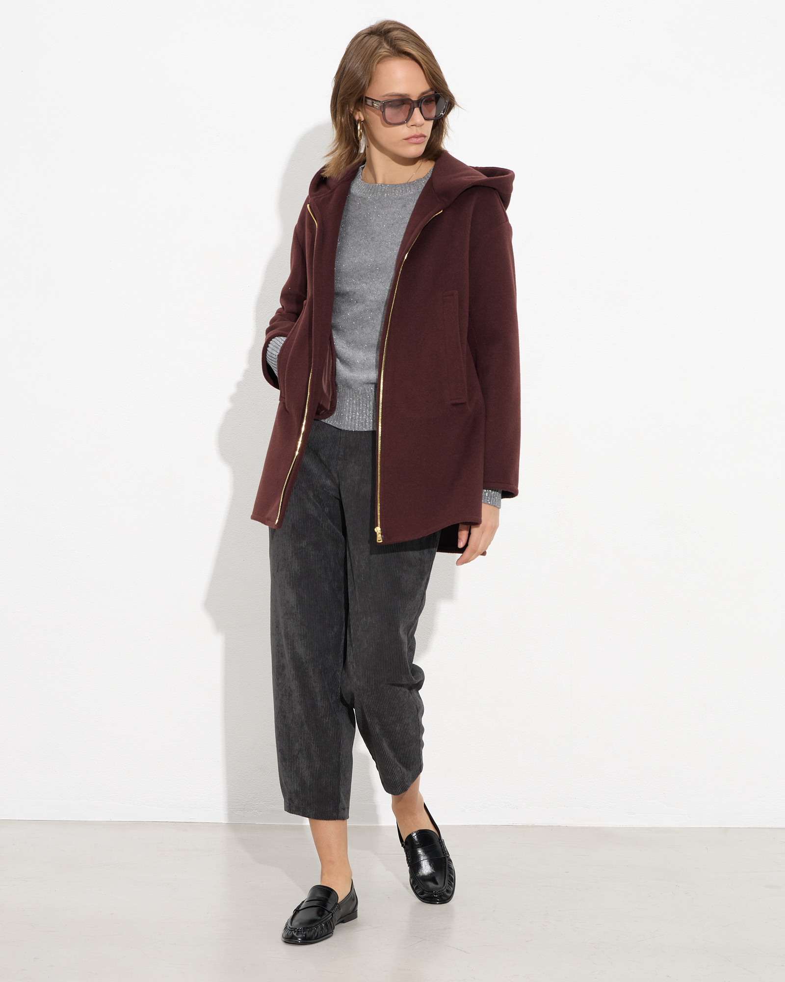 Ημίπαλτο με κουκούλα, κλείσιμο με φερμουάρ, πλαϊνές τσέπες, ανοίγματα στο πλάι, σε άνετη γραμμή