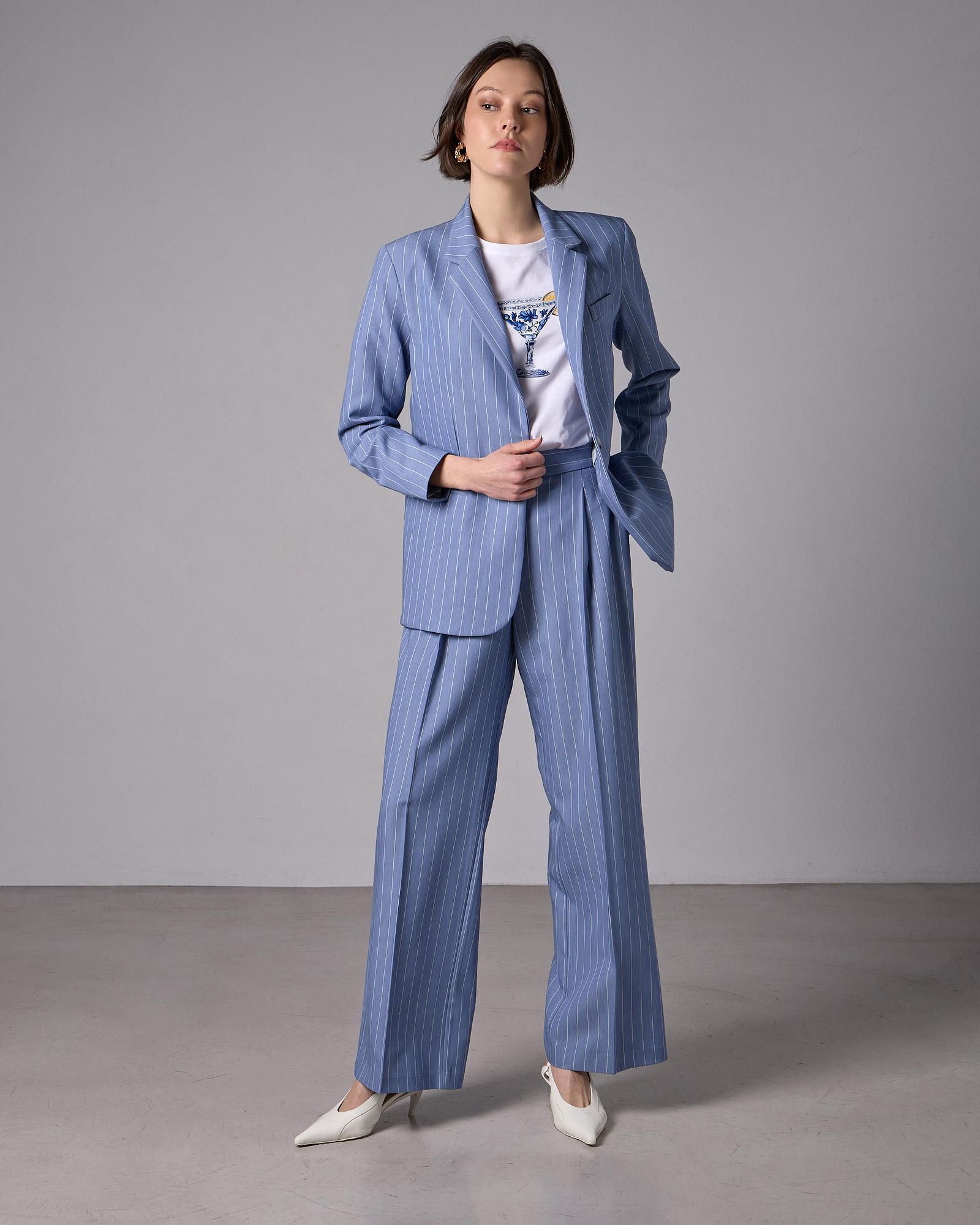 Σακάκι ριγέ με γιακά με πέτο, μακρυμάνικο, ψεύτικες τσέπες στο μπροστινό μέρος, εσωτερική φόδρα, κλείσιμο μπροστά με κουμπί, σε κανονική γραμμή