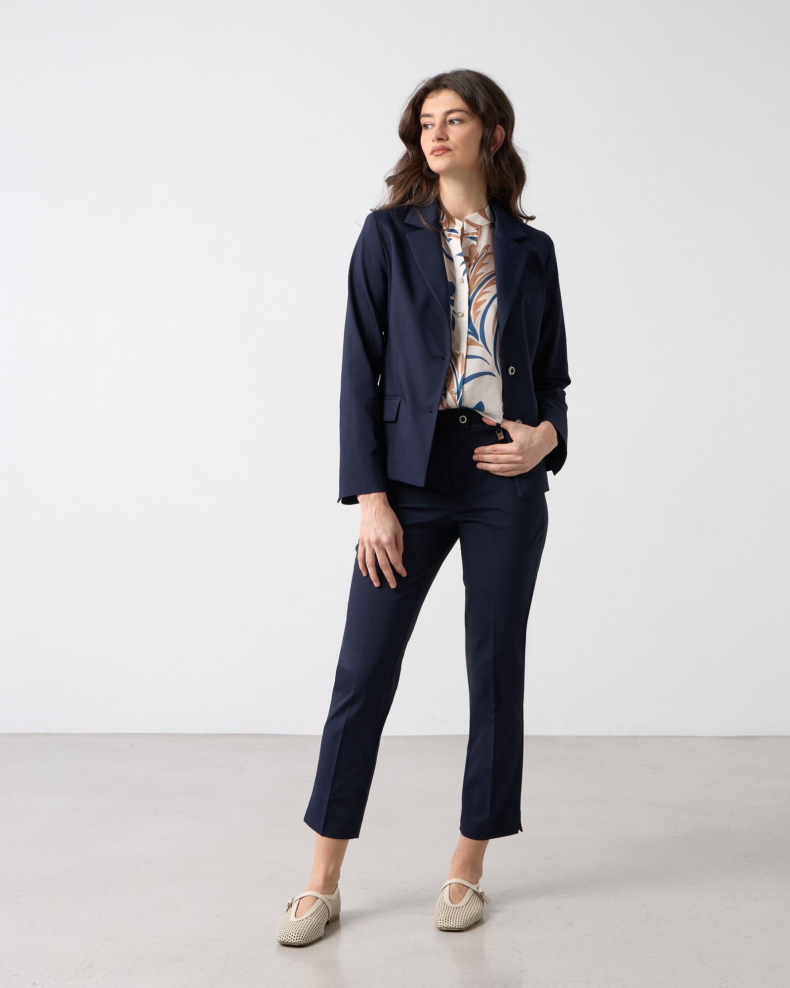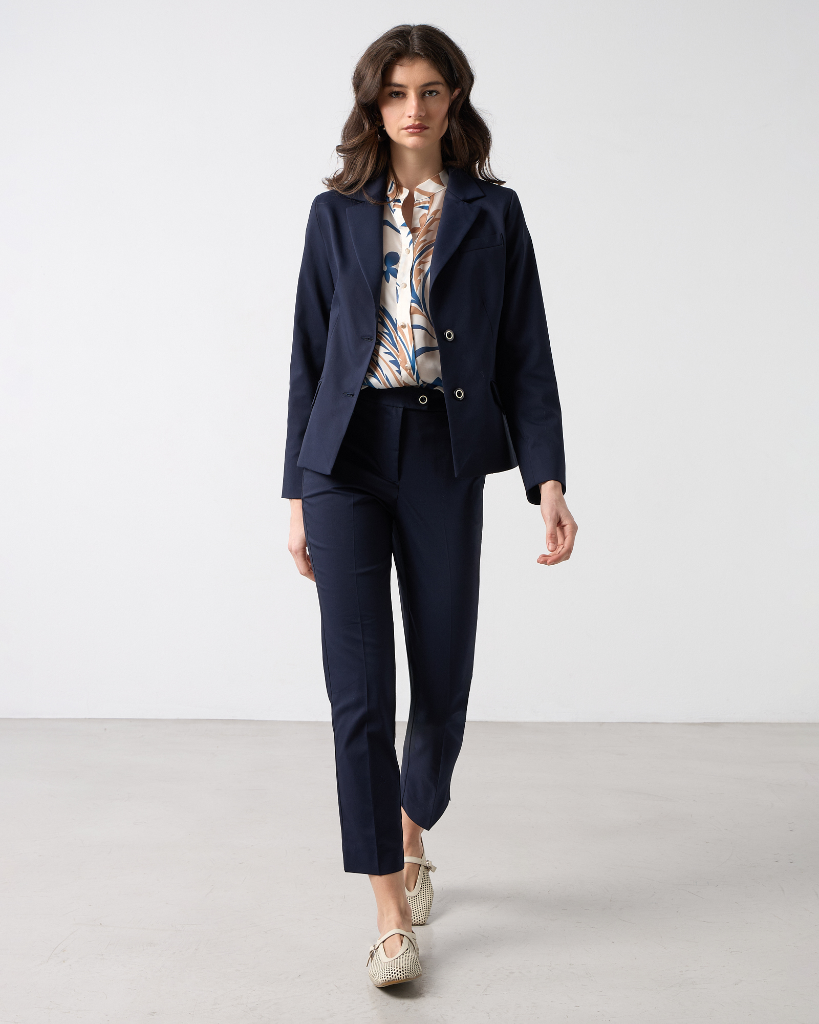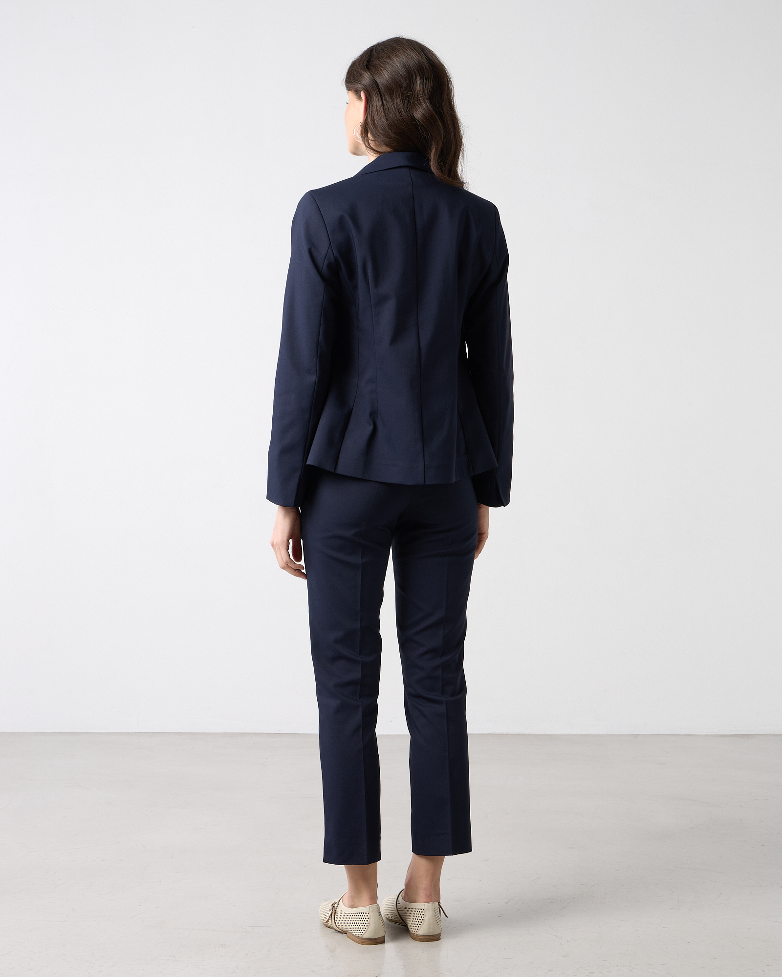 Σακάκι μεσάτο με γιακά και πέτο, μακρυμάνικο, κλείσιμο μπροστά με κουμπιά, μπροστινές τσέπες με καπάκι, υφή καπαρντίνα, σε κανονική γραμμή