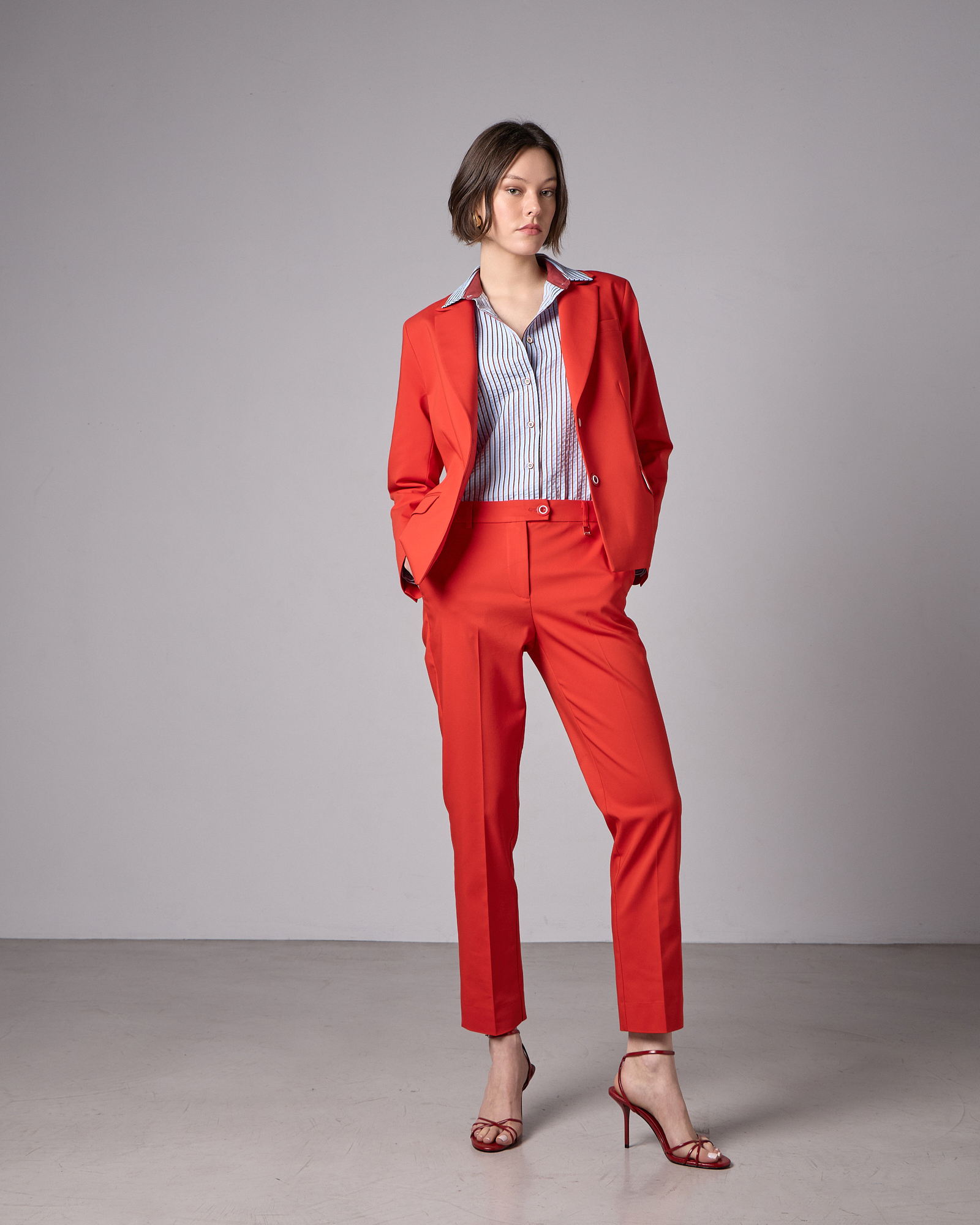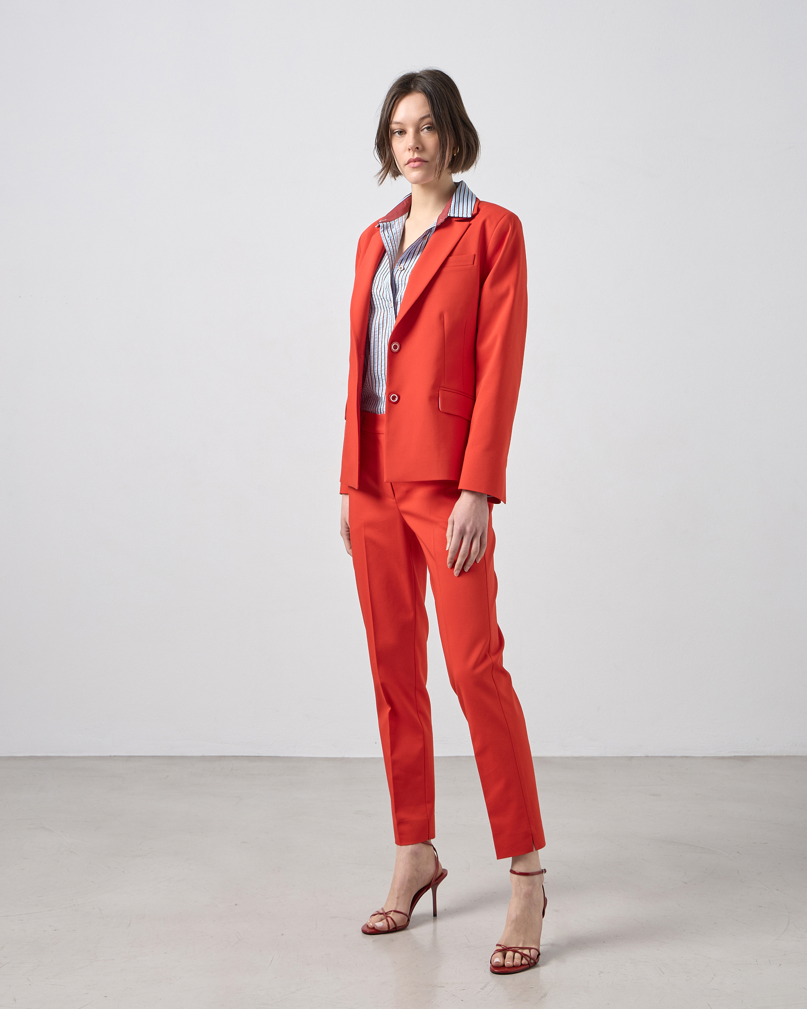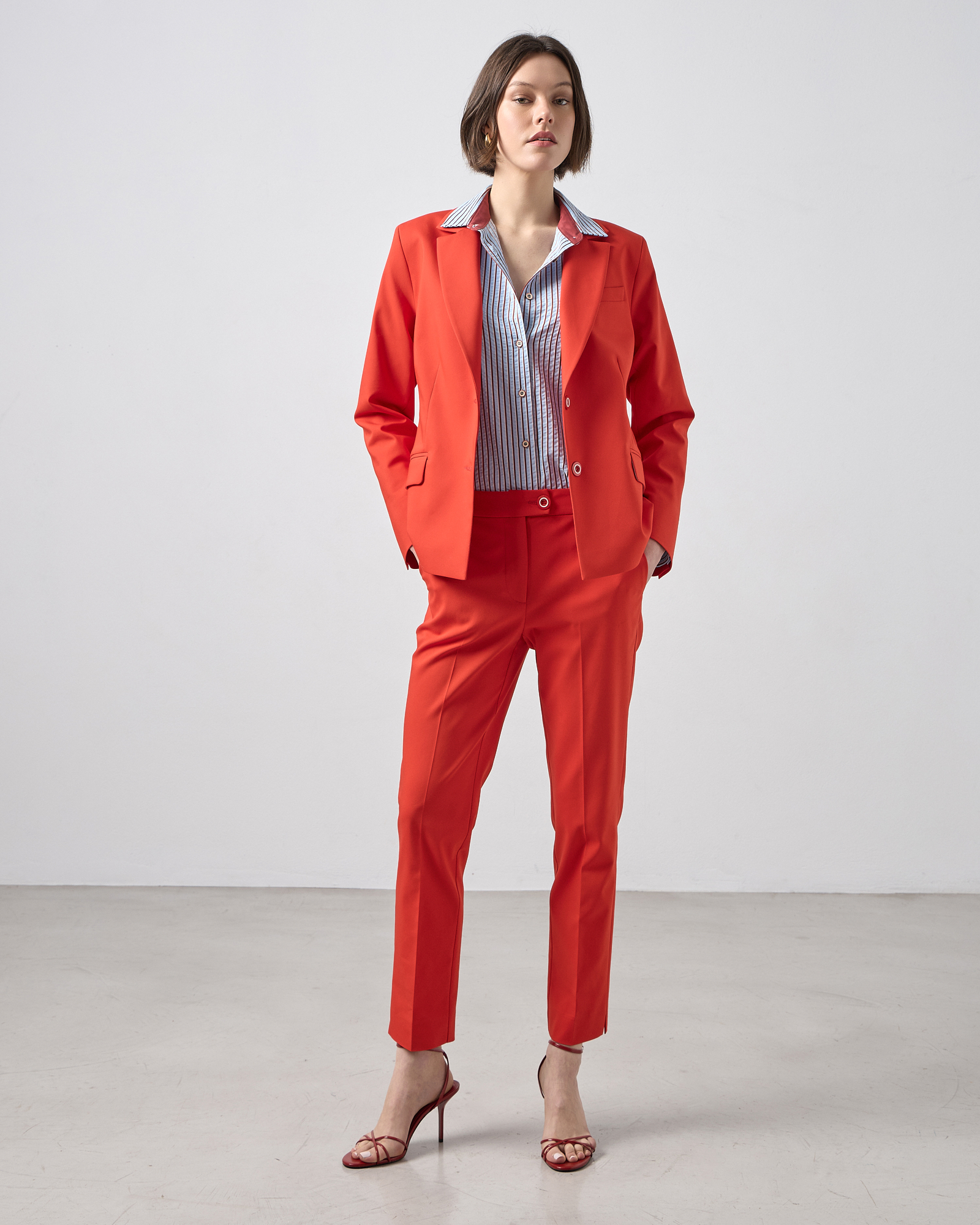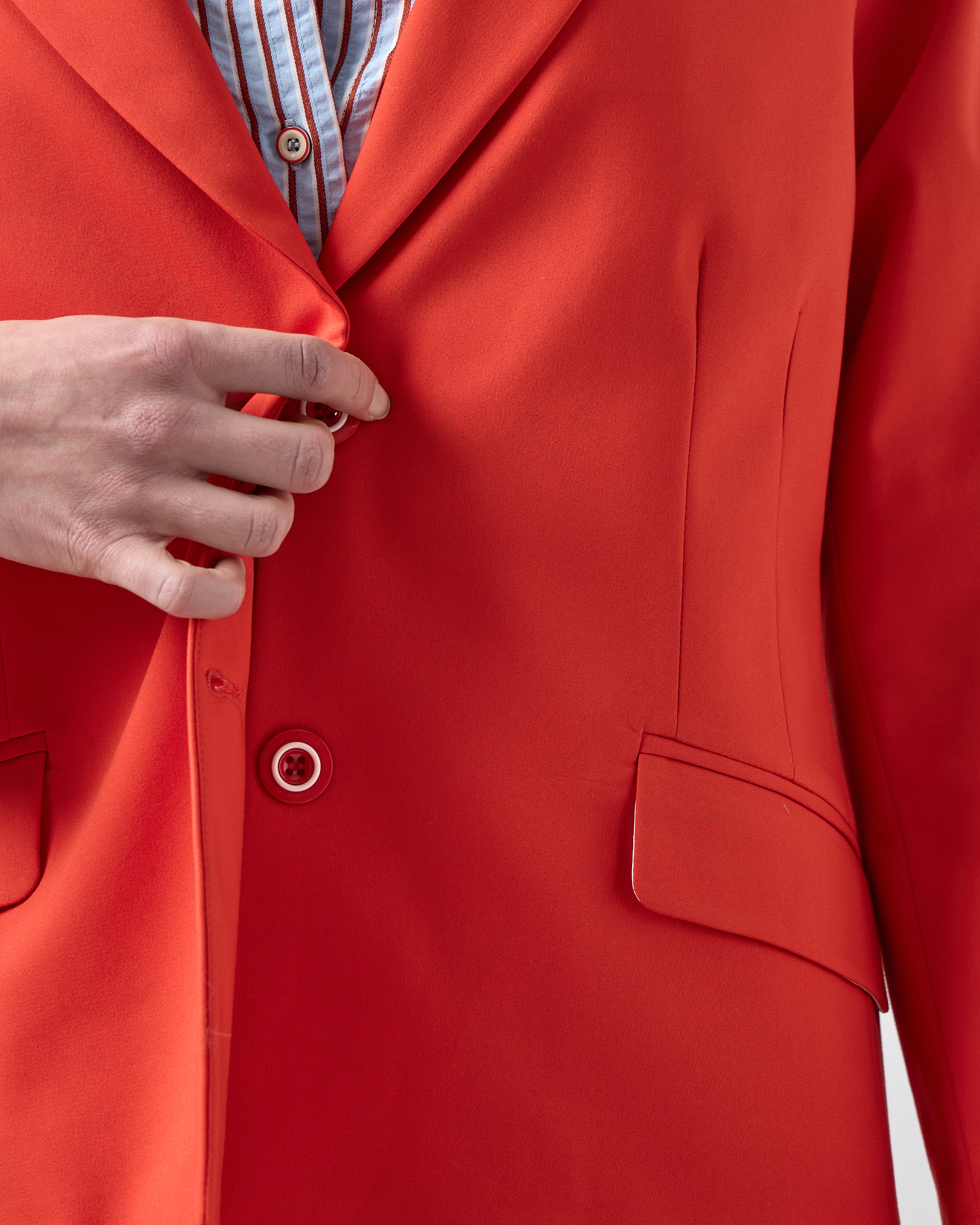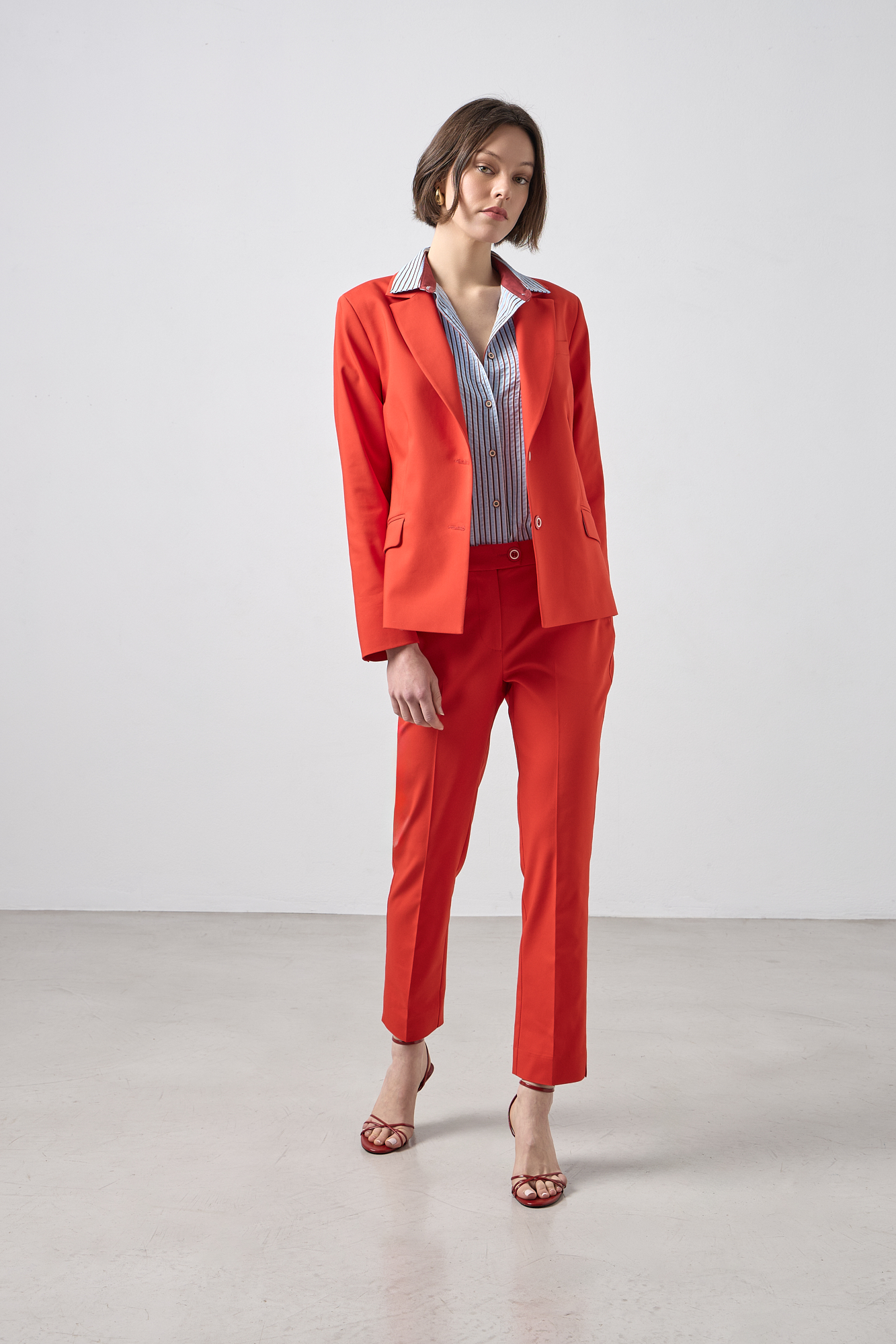 Σακάκι μεσάτο με γιακά και πέτο, μακρυμάνικο, κλείσιμο μπροστά με κουμπιά, μπροστινές τσέπες με καπάκι, υφή καπαρντίνα, σε κανονική γραμμή
