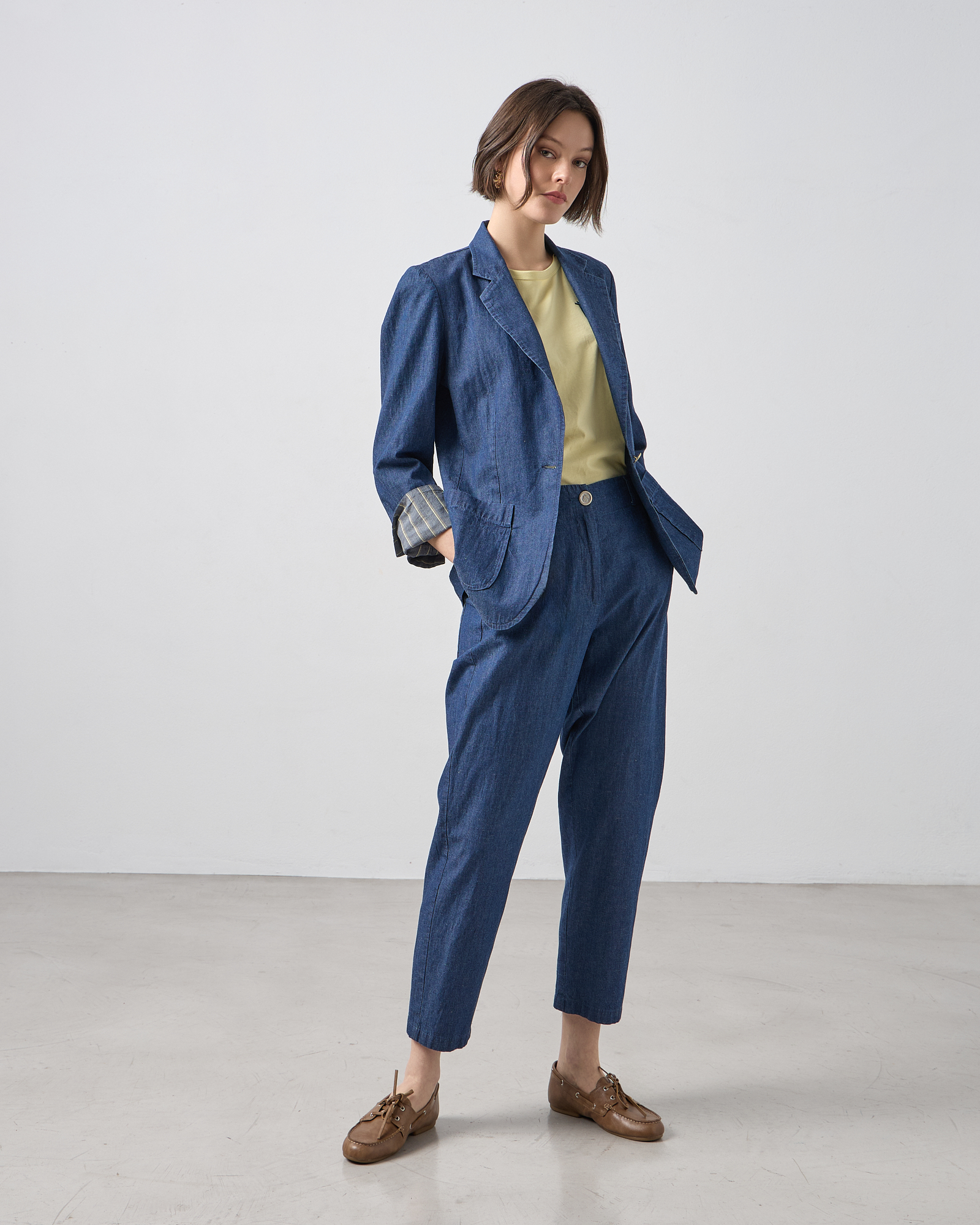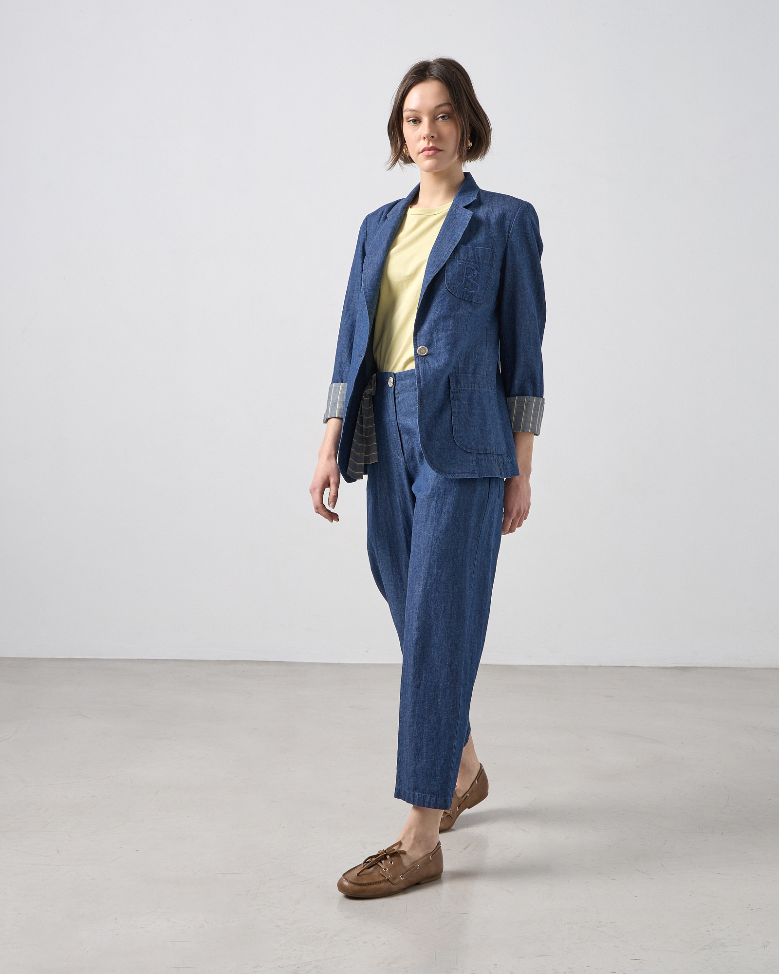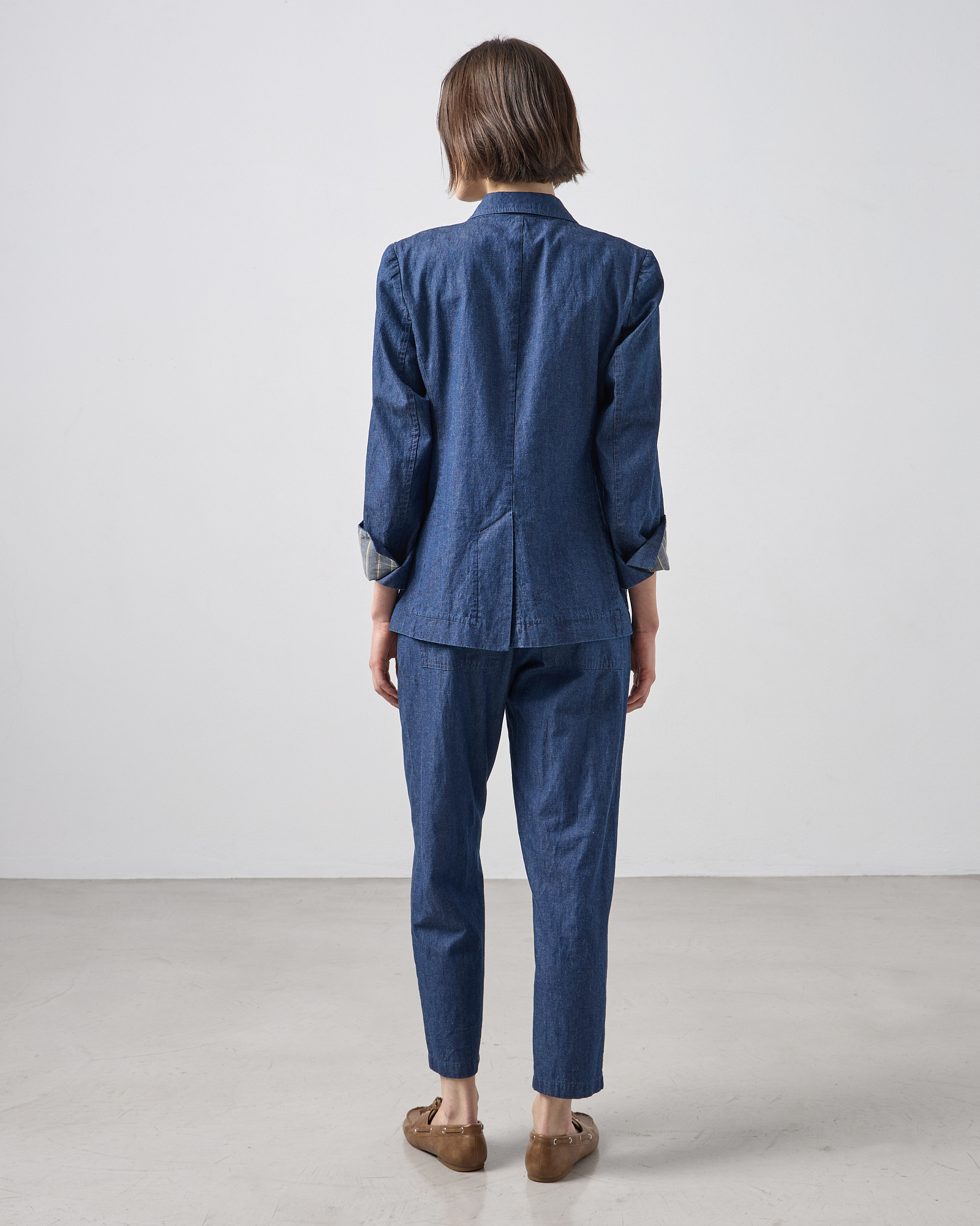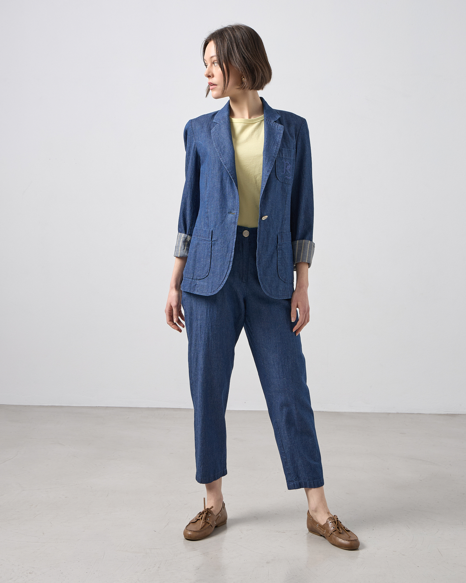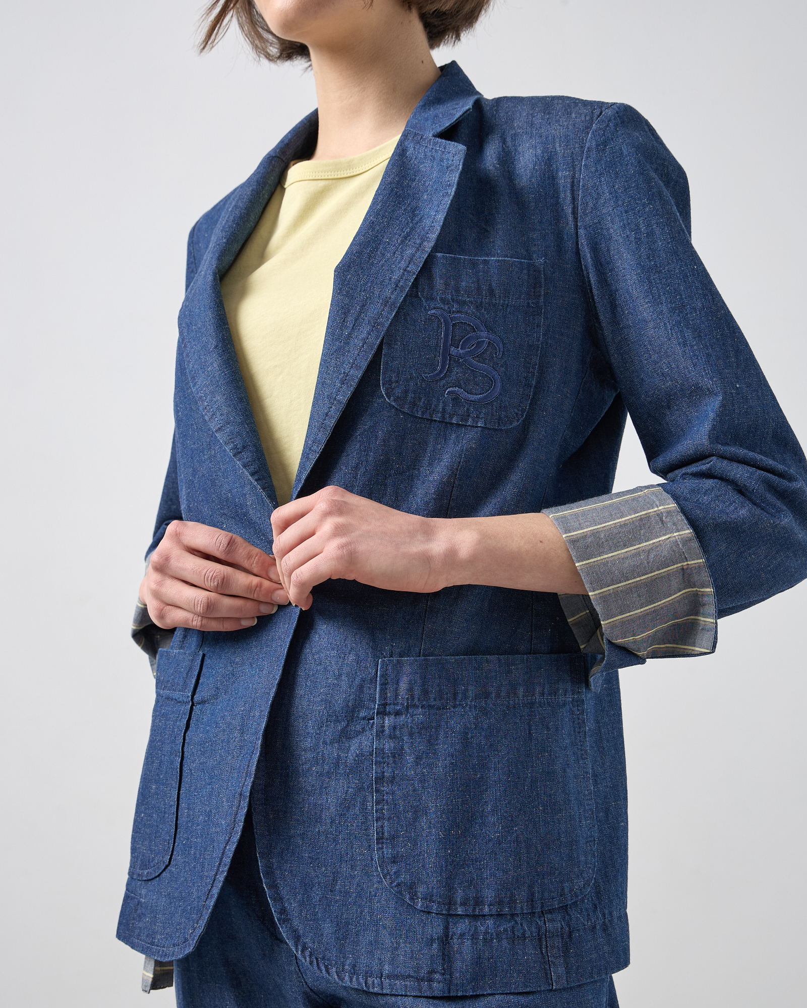 Σακάκι σε υφή jean, μεσάτο με μακρύ μανίκι, πέτο με γιακά, κλείσιμο με κουμπί μπροστά, εξωτερικές patch τσέπες, σε κανονική εφαρμογή