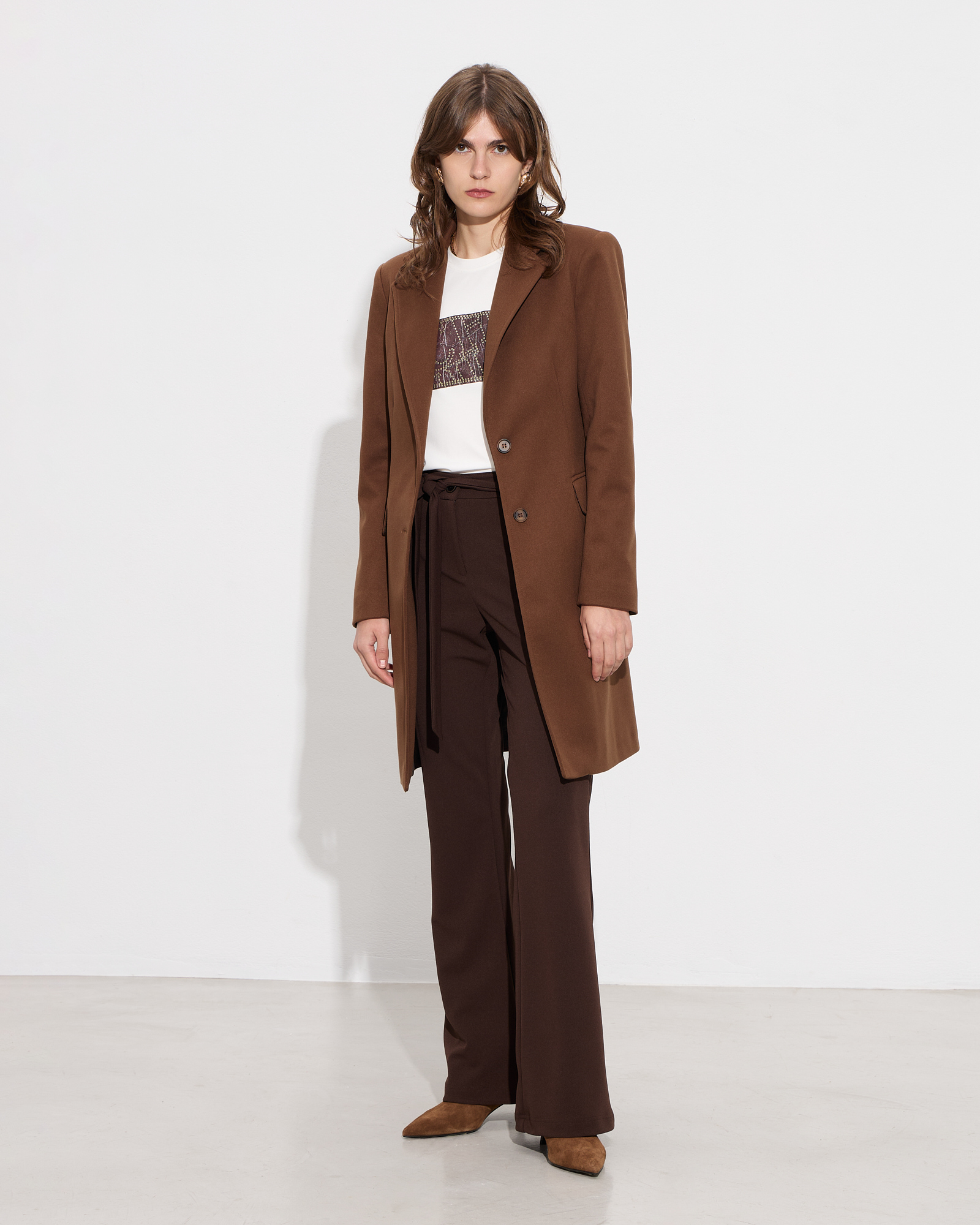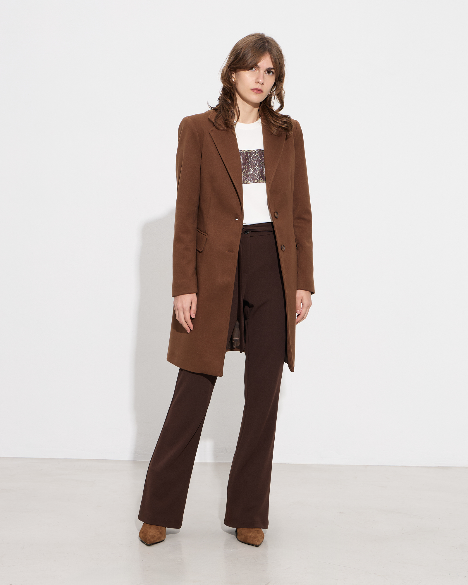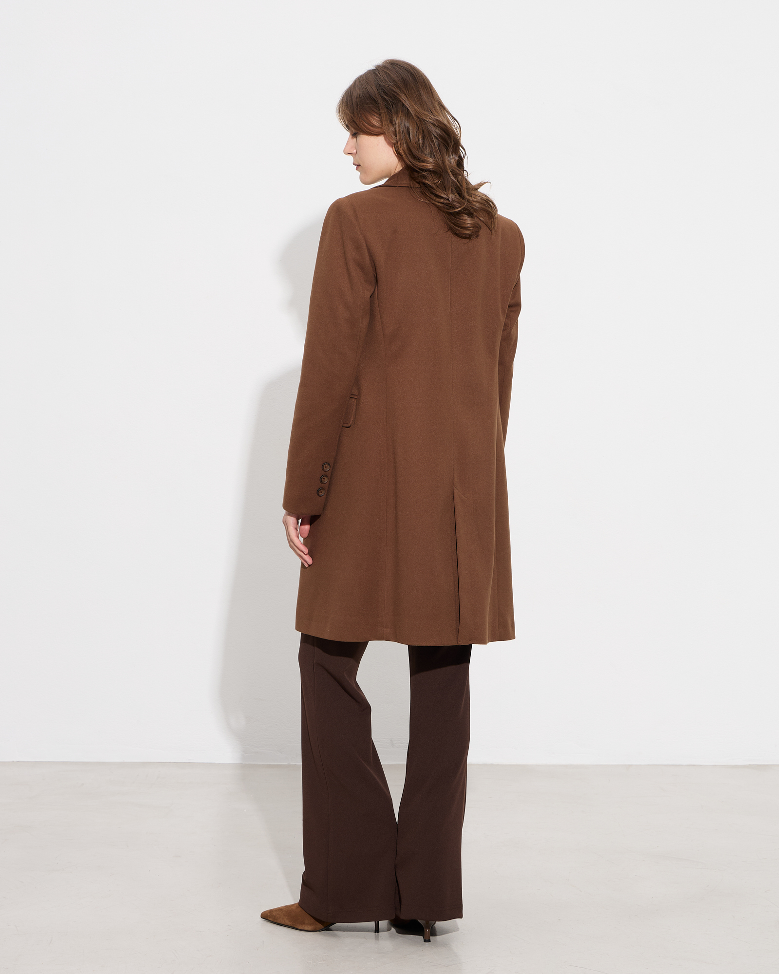 Παλτό με γιακά με πέτο, μακρύ μανίκι, βάτες στους ώμους, πλαϊνές τσέπες με καπάκι, κλείσιμο μπροστά με κουμπιά, άνοιγμα στο κάτω μέρος πίσω, εσωερική φόδρα, σε κανονική γραμμή