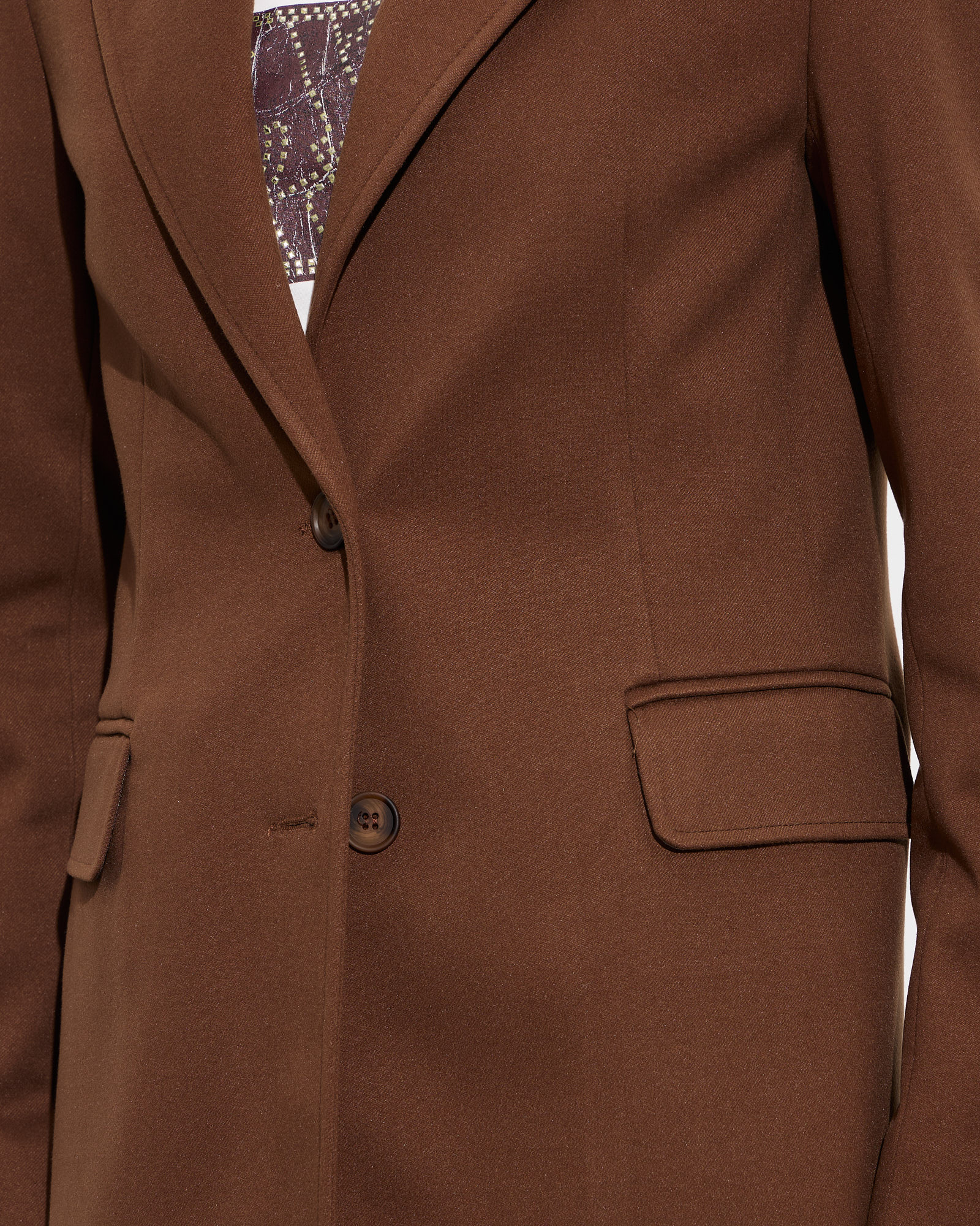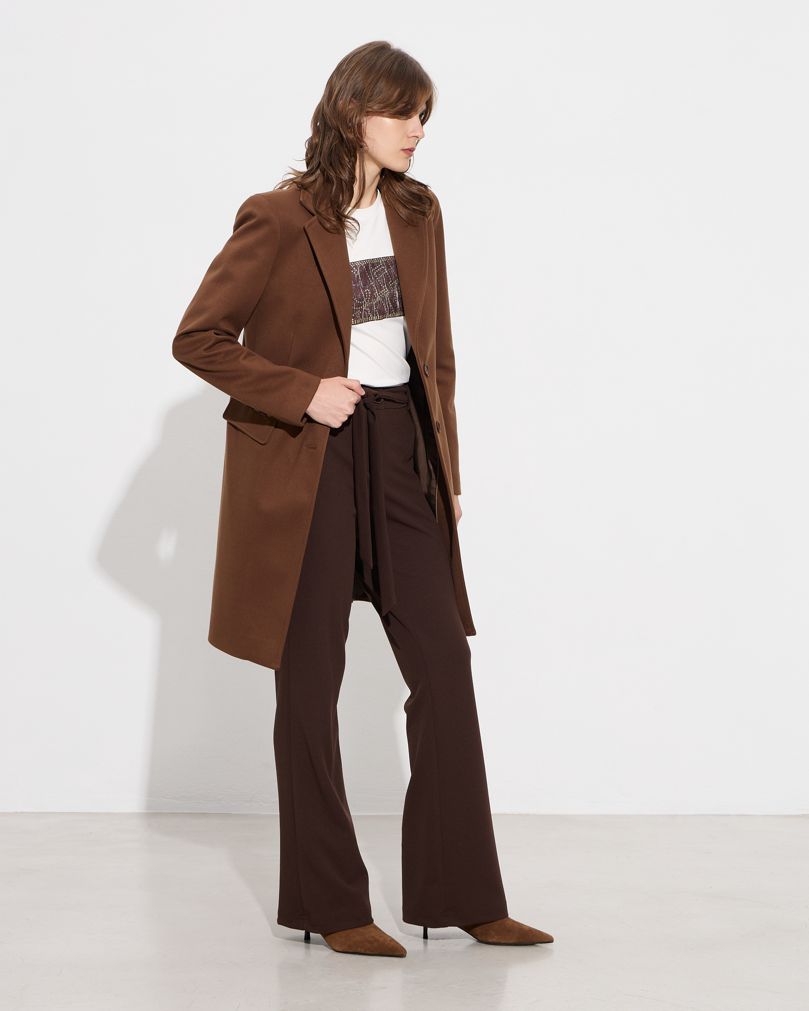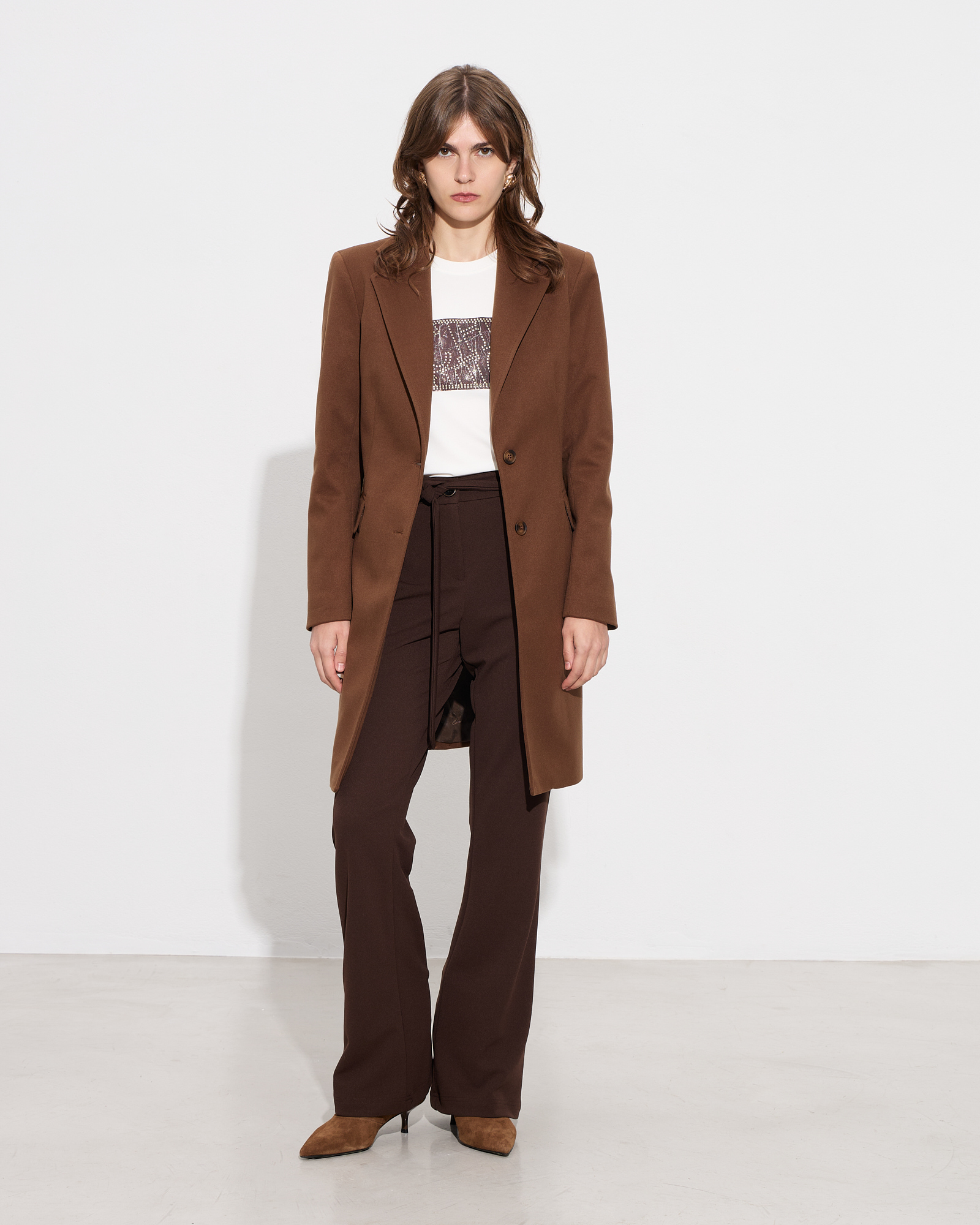 Παλτό με γιακά με πέτο, μακρύ μανίκι, βάτες στους ώμους, πλαϊνές τσέπες με καπάκι, κλείσιμο μπροστά με κουμπιά, άνοιγμα στο κάτω μέρος πίσω, εσωερική φόδρα, σε κανονική γραμμή