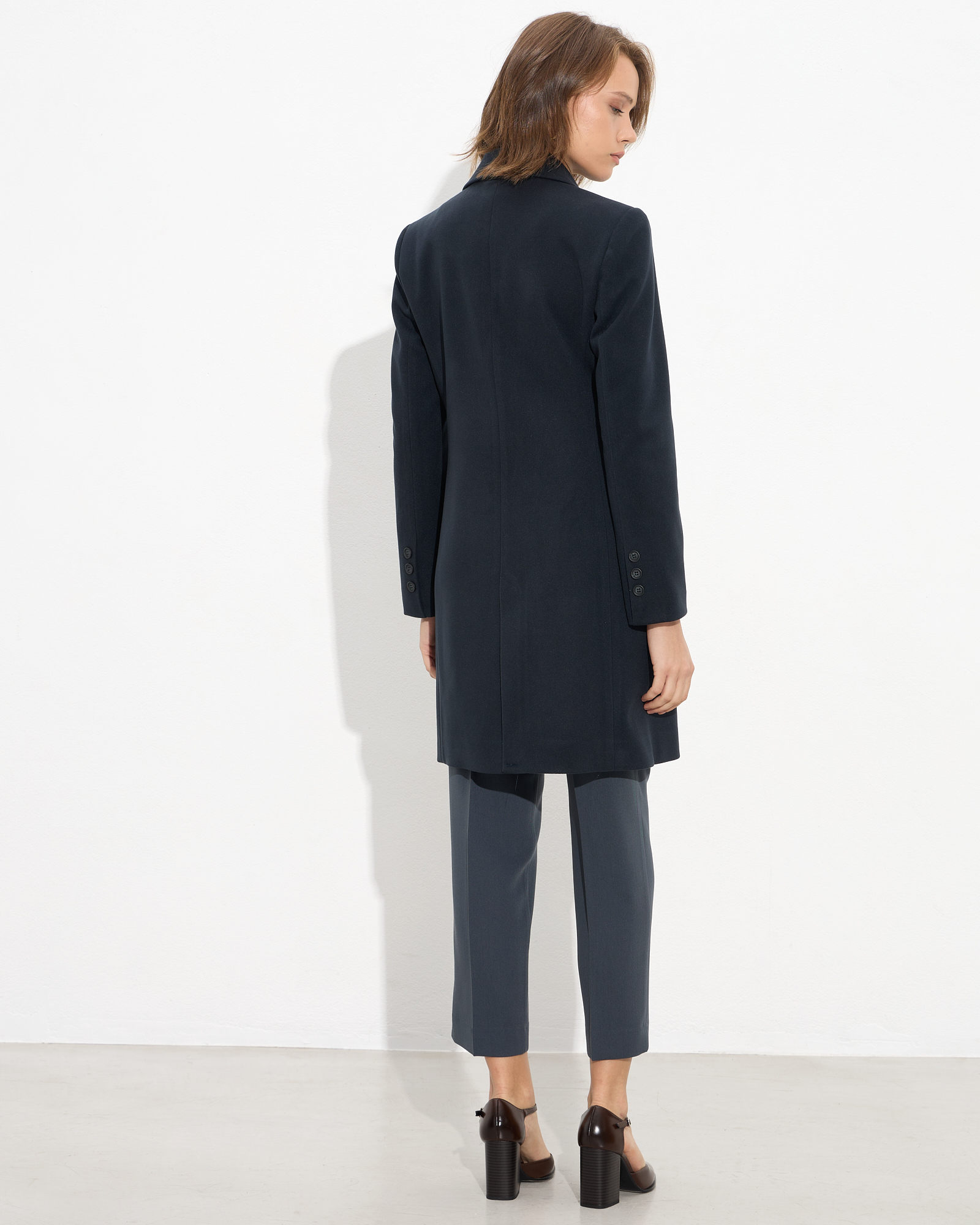 Παλτό με γιακά με πέτο, μακρύ μανίκι, βάτες στους ώμους, πλαϊνές τσέπες με καπάκι, κλείσιμο μπροστά με κουμπιά, άνοιγμα στο κάτω μέρος πίσω, εσωερική φόδρα, σε κανονική γραμμή
