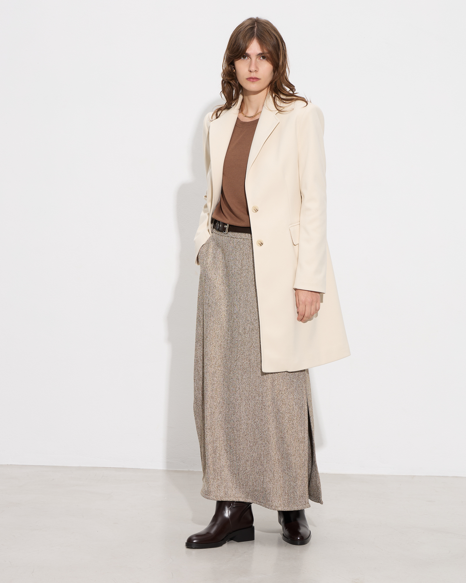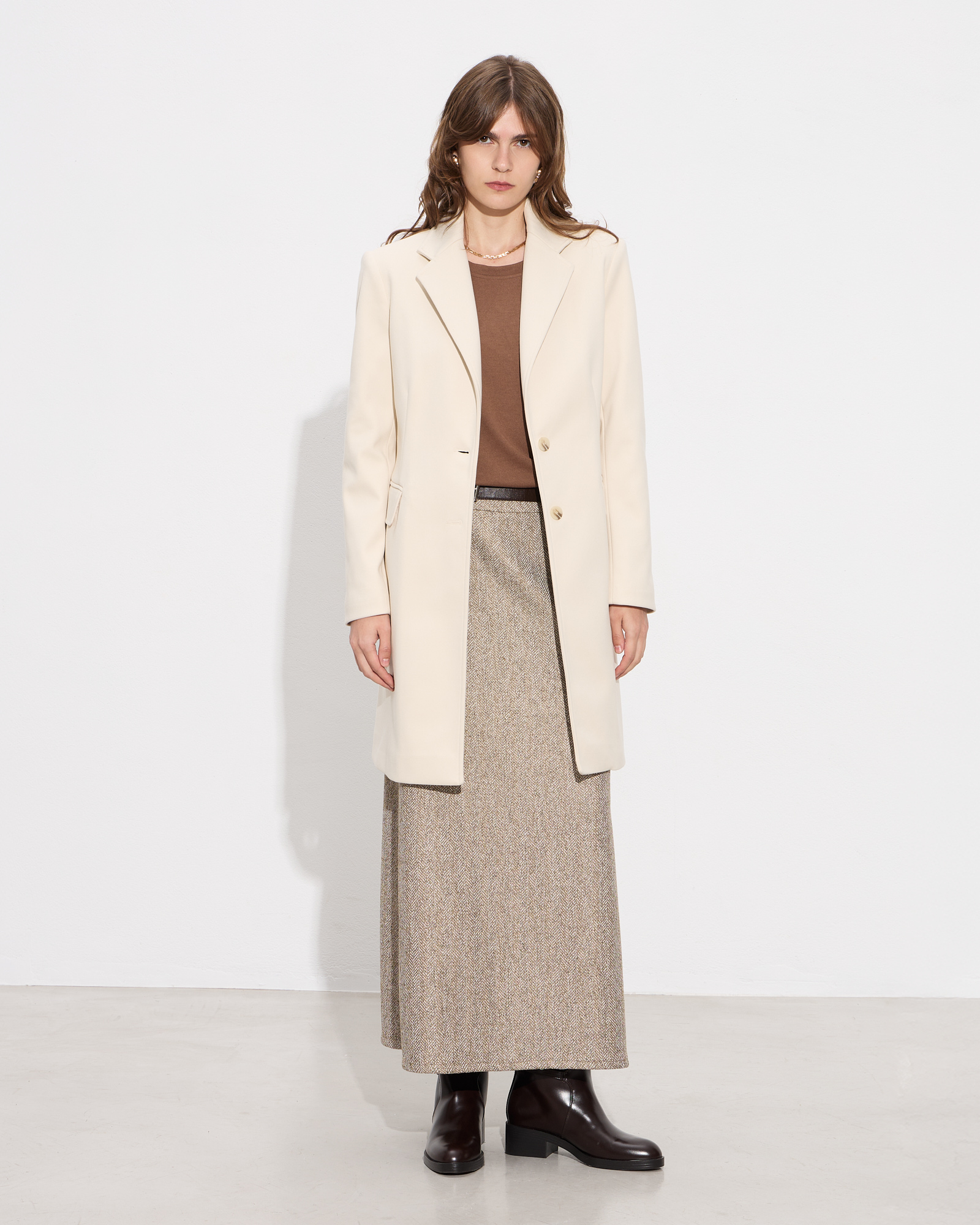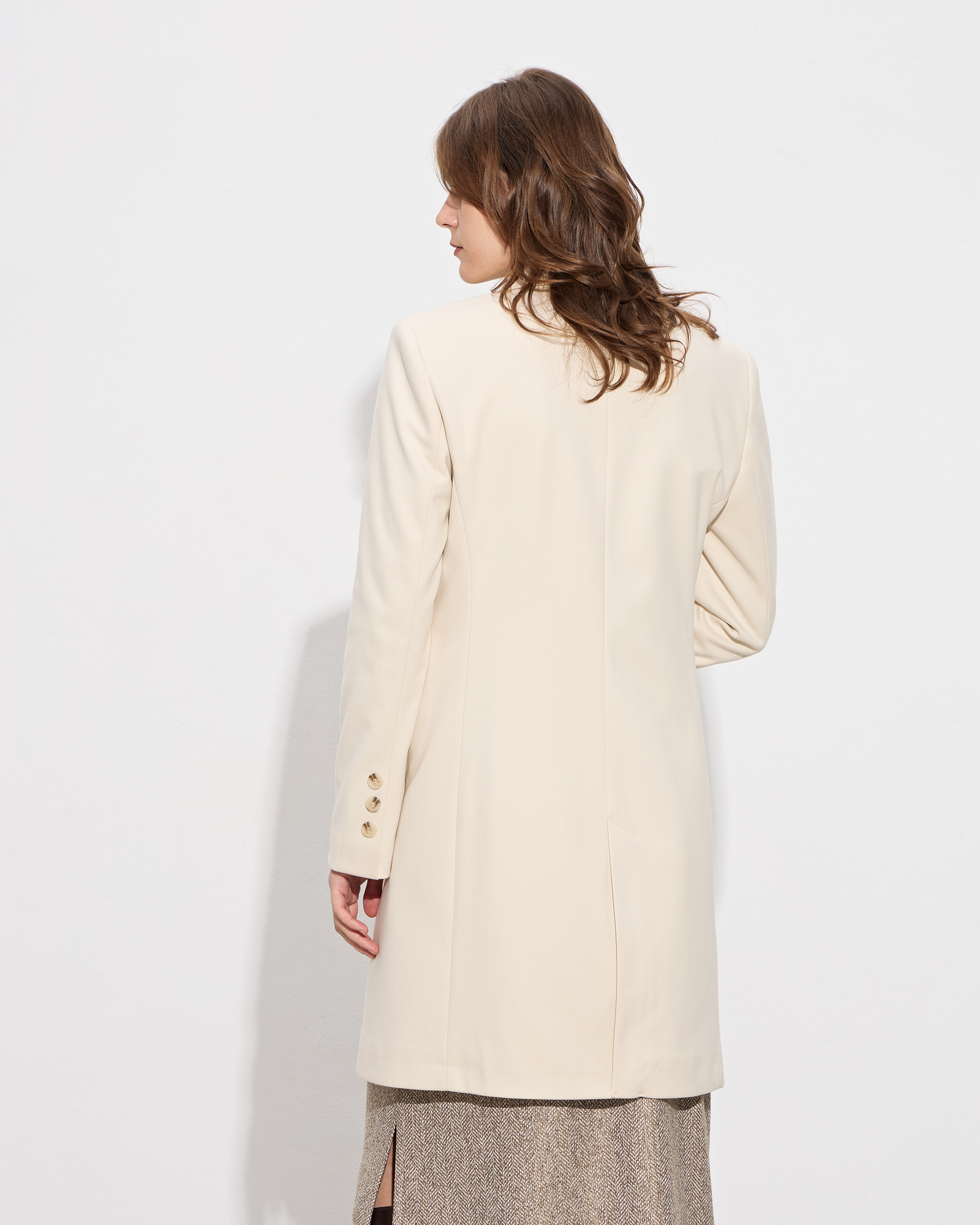 Παλτό με γιακά με πέτο, μακρύ μανίκι, βάτες στους ώμους, πλαϊνές τσέπες με καπάκι, κλείσιμο μπροστά με κουμπιά, άνοιγμα στο κάτω μέρος πίσω, εσωερική φόδρα, σε κανονική γραμμή