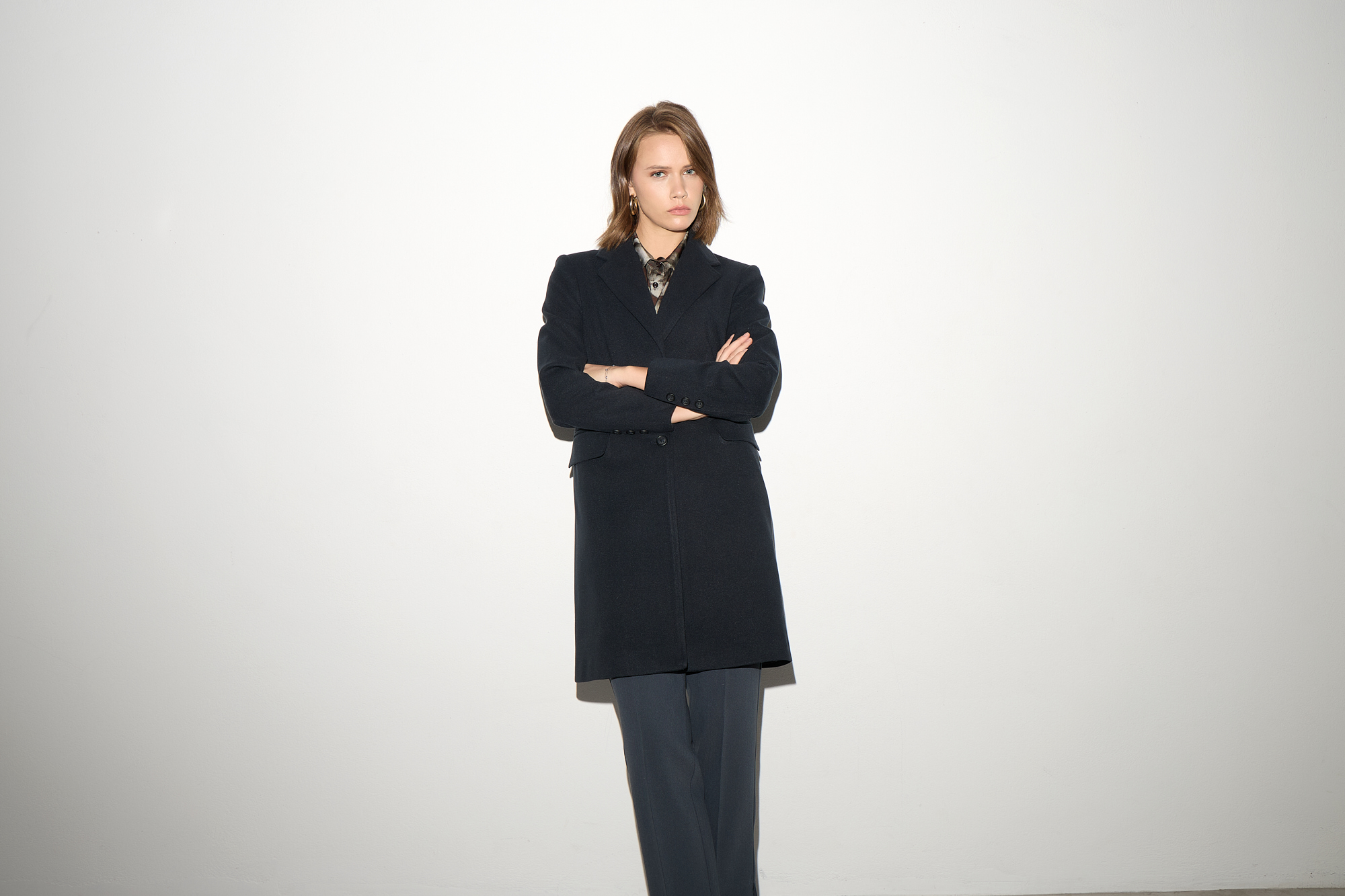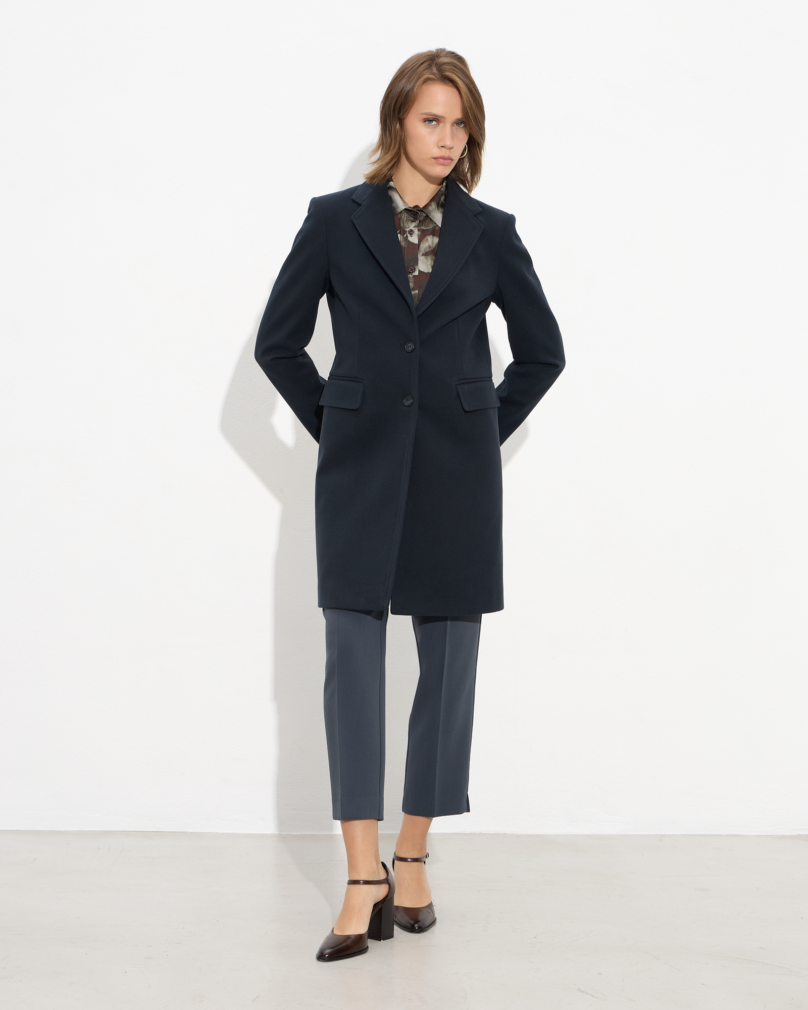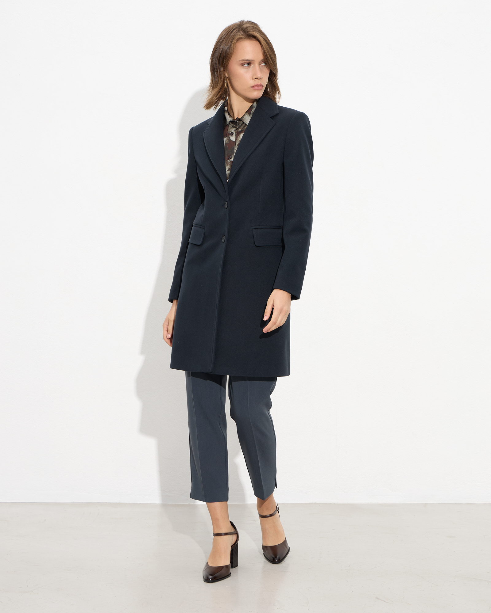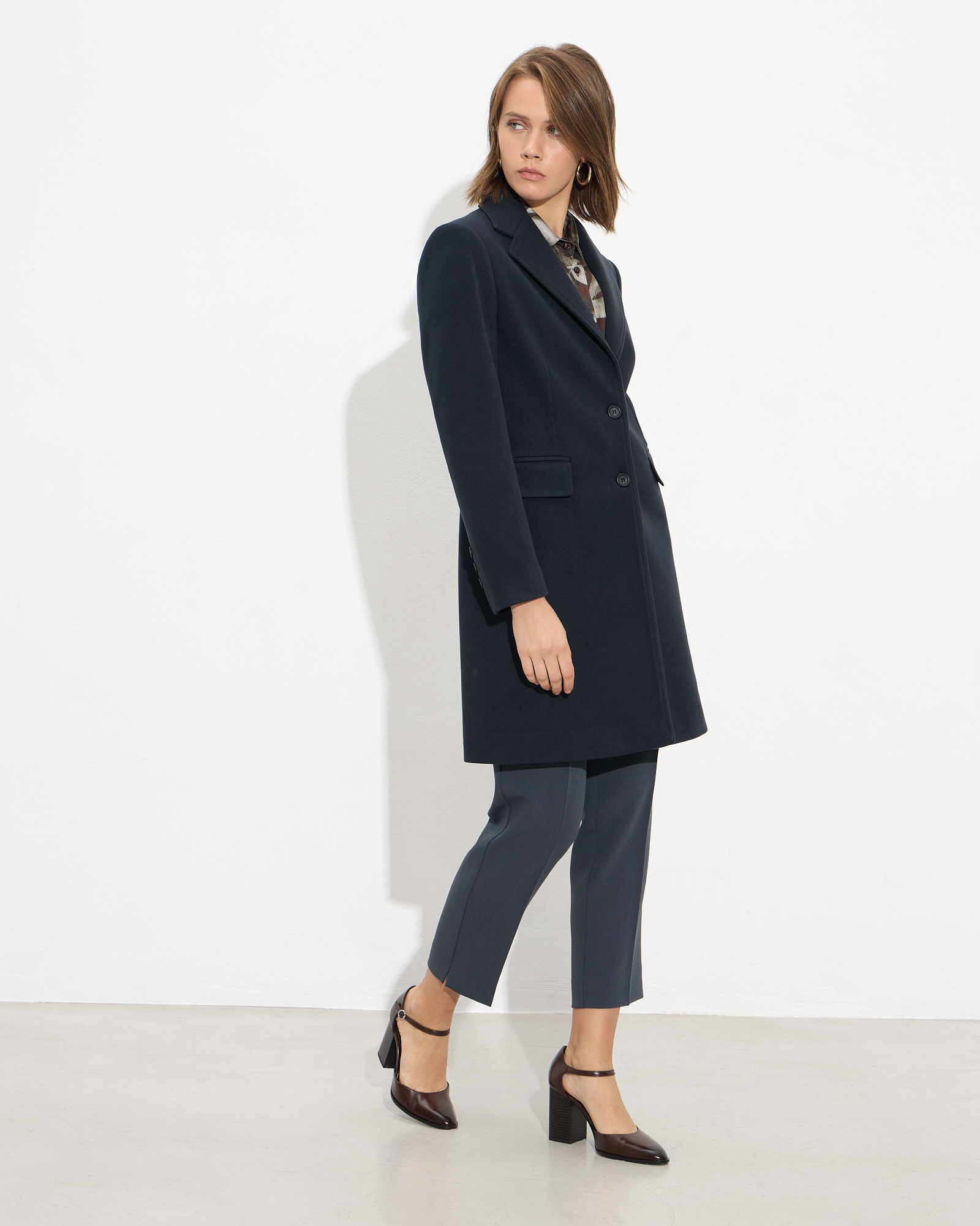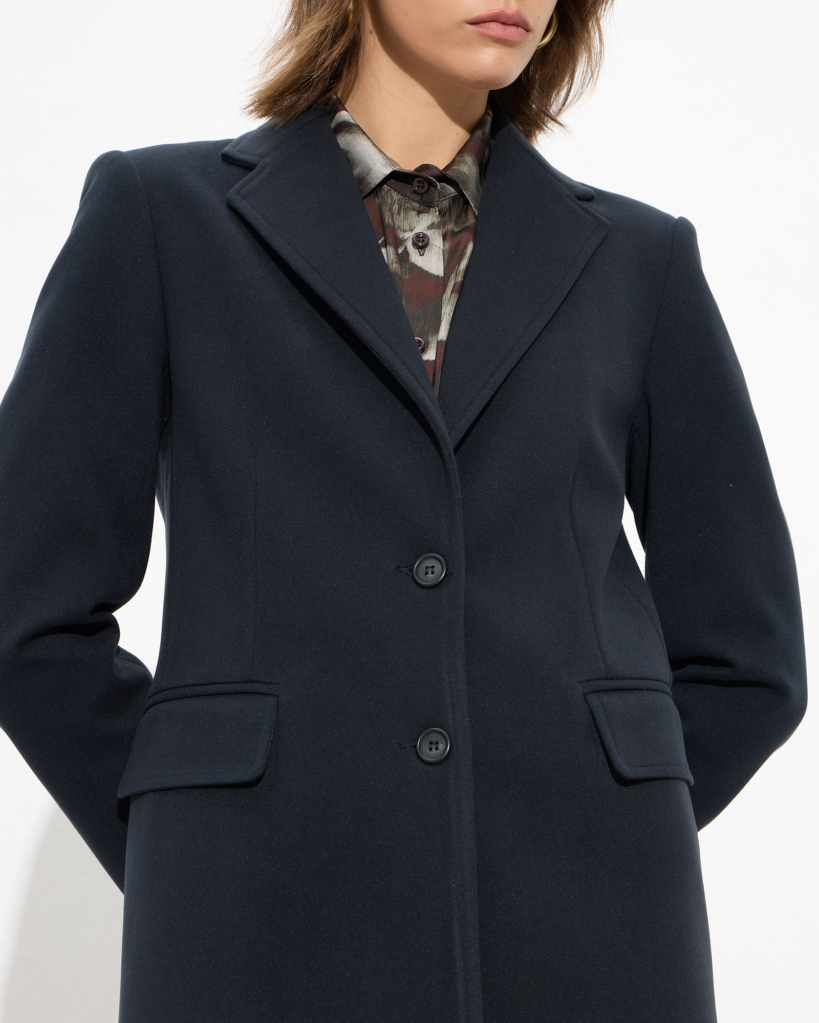 Παλτό με γιακά με πέτο, μακρύ μανίκι, βάτες στους ώμους, πλαϊνές τσέπες με καπάκι, κλείσιμο μπροστά με κουμπιά, άνοιγμα στο κάτω μέρος πίσω, εσωερική φόδρα, σε κανονική γραμμή