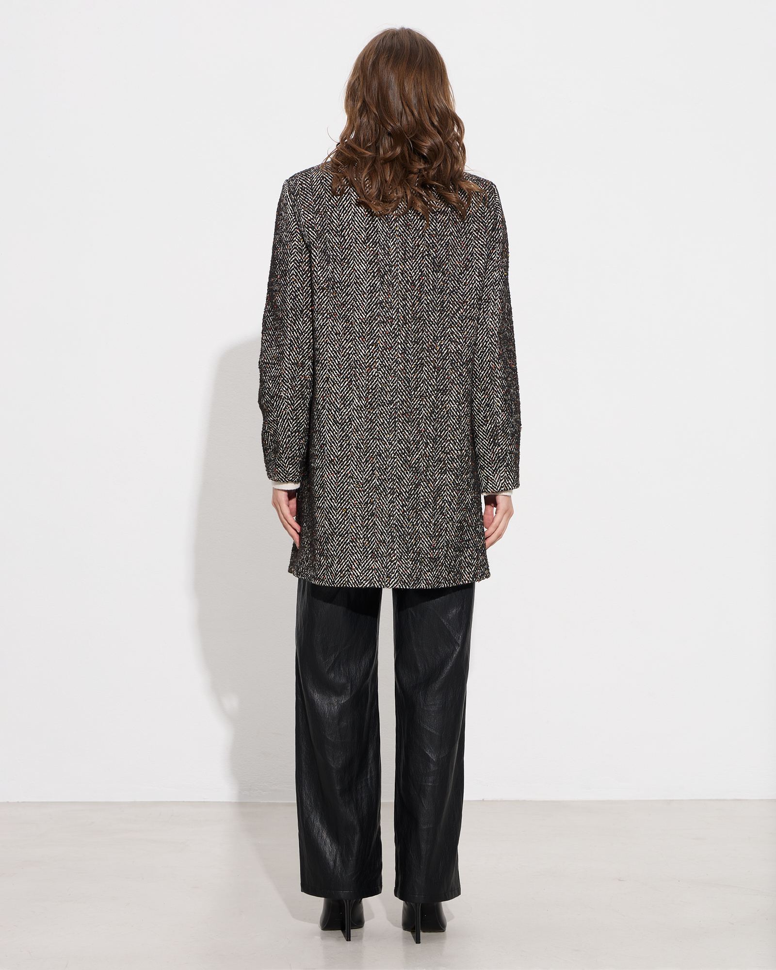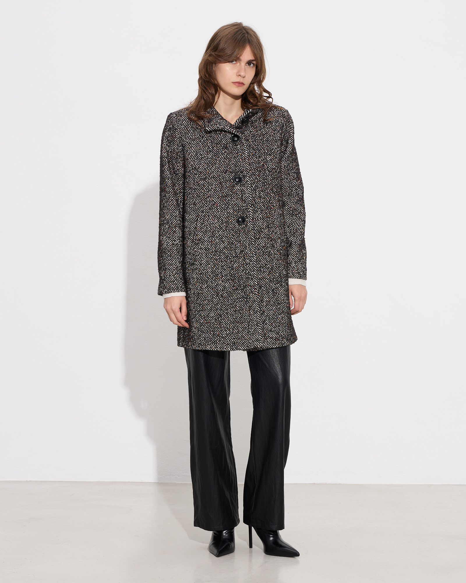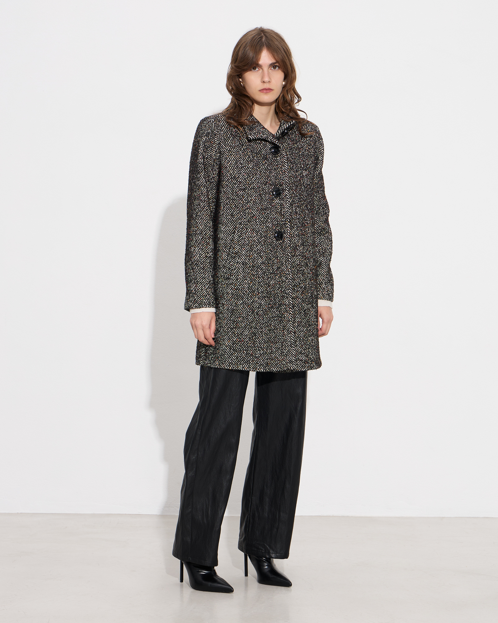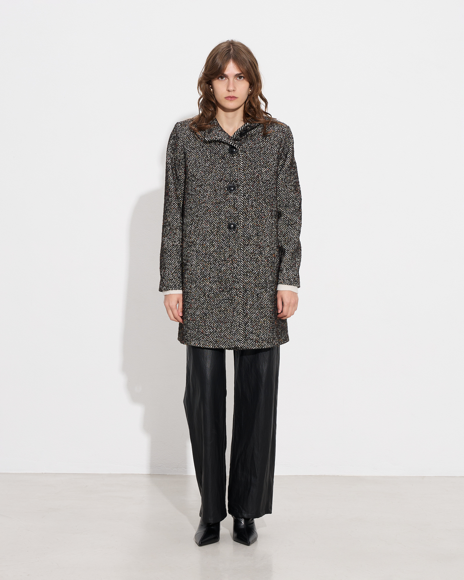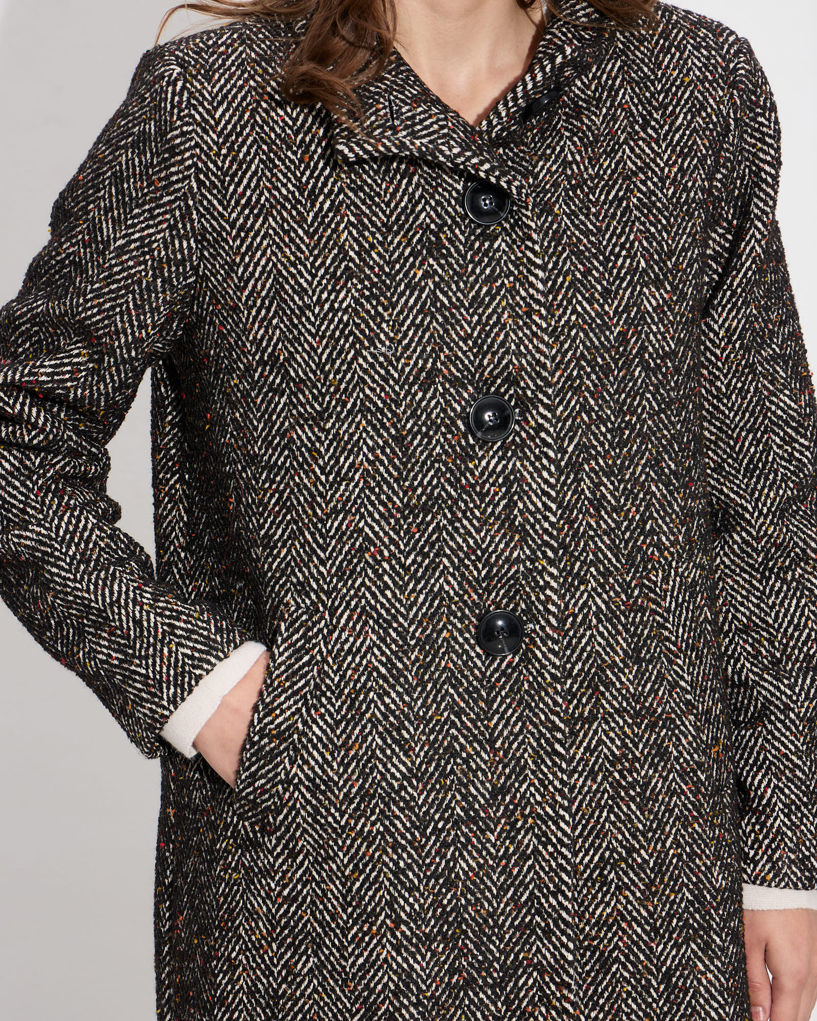 Παλτό ψαροκόκκαλο με όρθιο γιακά και μακρύ μανίκι, μπροστινές τσέπες, κλείσιμο με κουμπιά μπροστά, με εσωτερική φόδρα, σε κανονική γραμμή