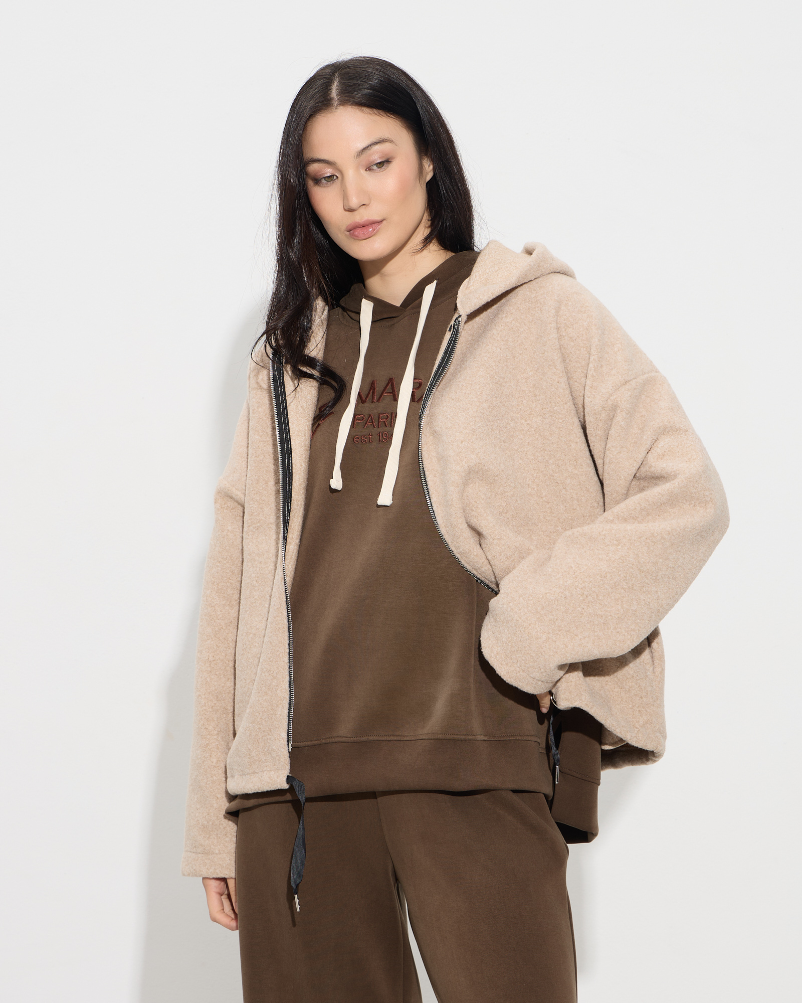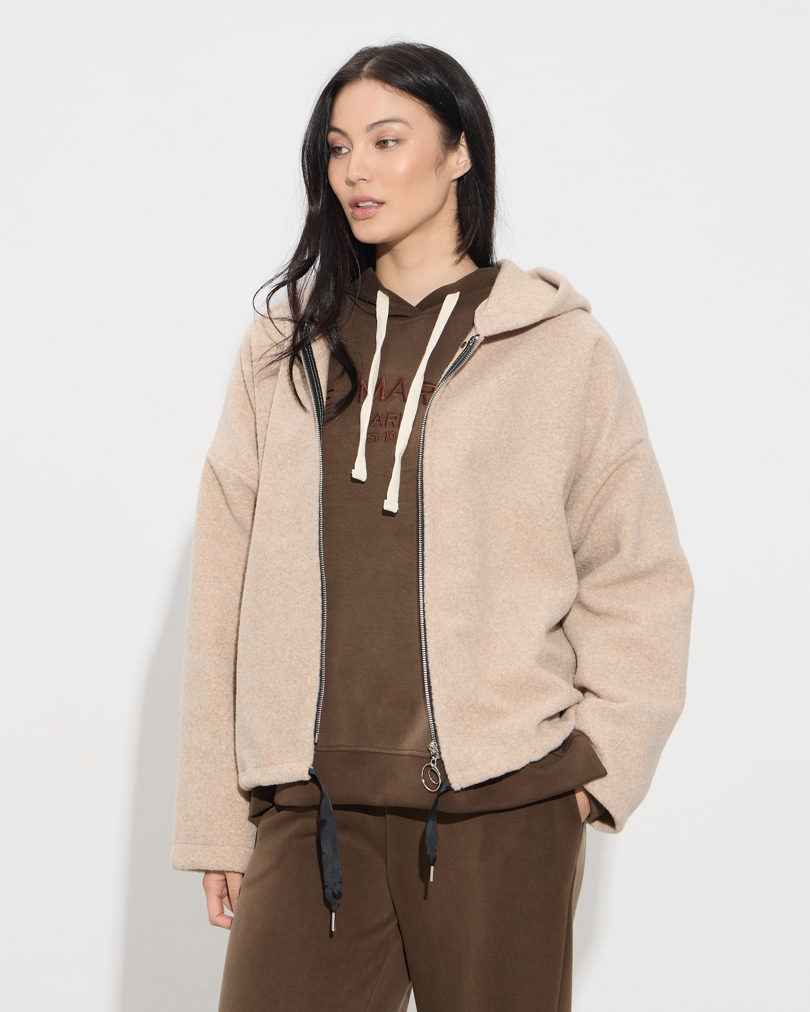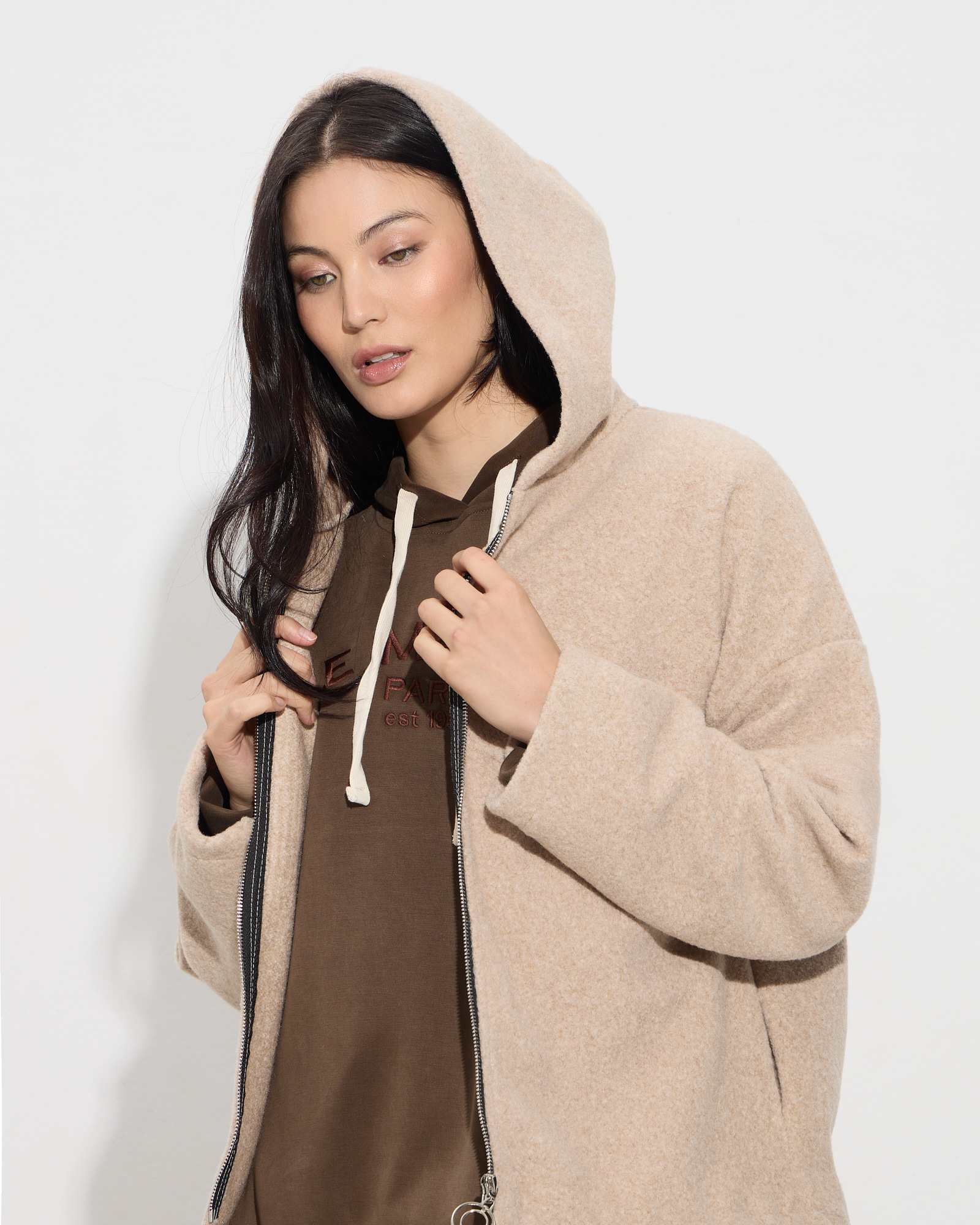 Ζακέτα oversized με κουκούλα, μπροστινό κλείσιμο με φερμουάρ, κορδόνι στο τελείωμα, τσέπες στο πλάι, σε άνετη γραμμή
