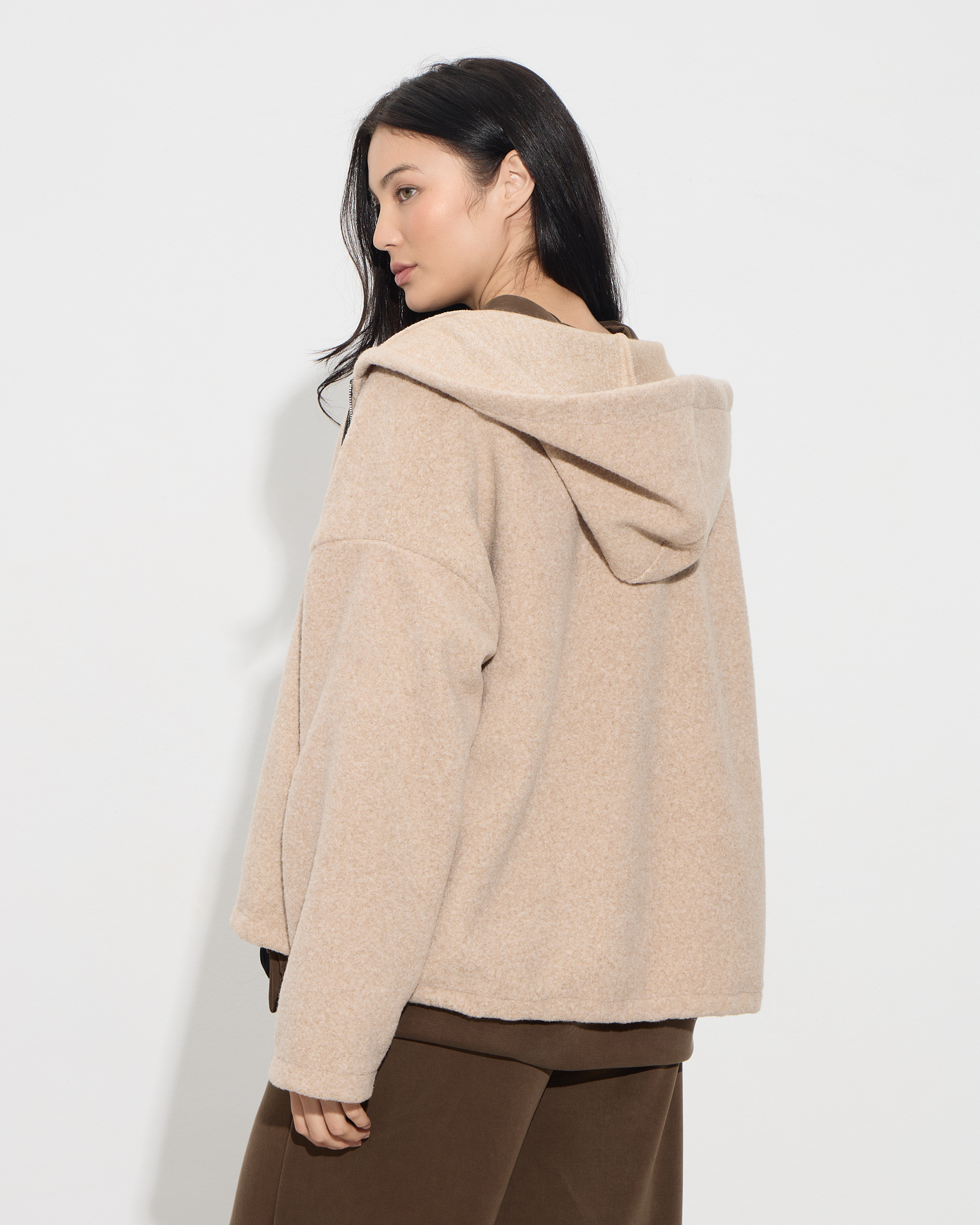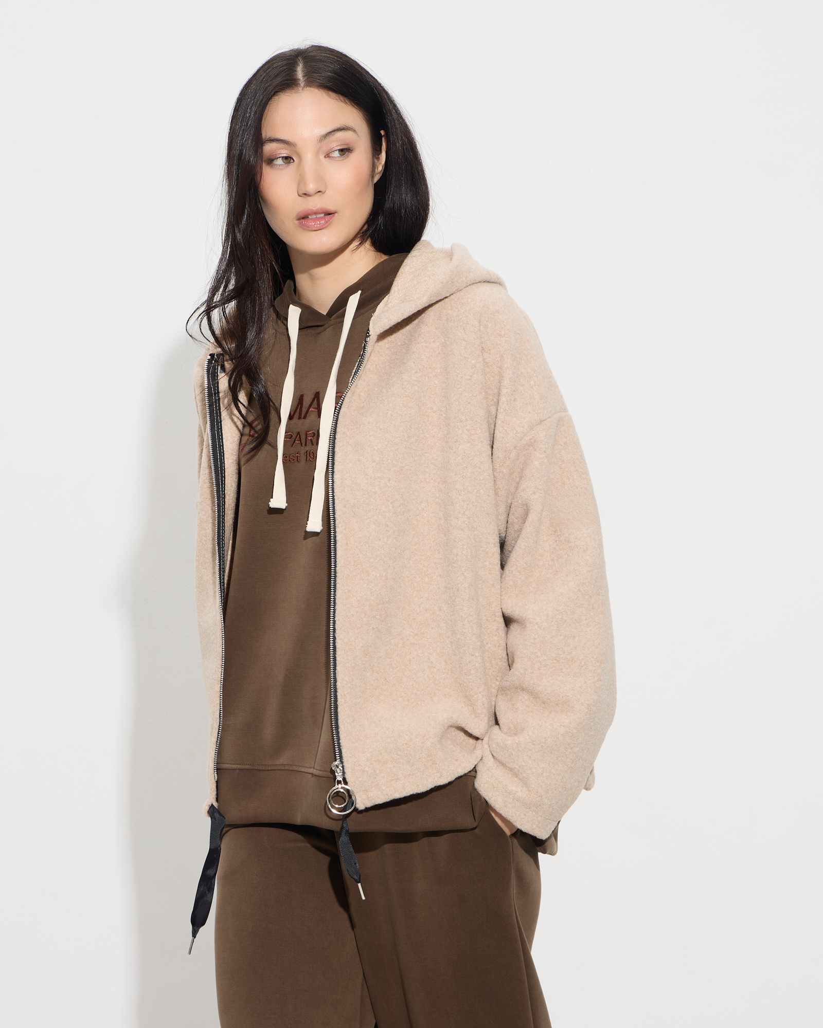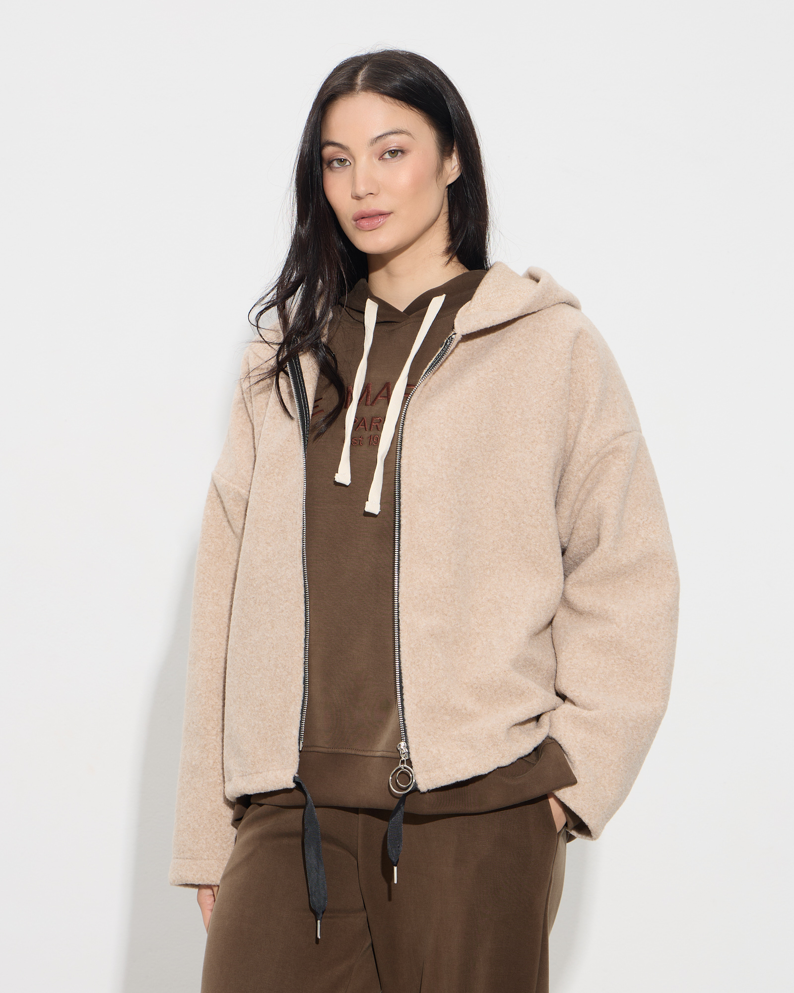 Ζακέτα oversized με κουκούλα, μπροστινό κλείσιμο με φερμουάρ, κορδόνι στο τελείωμα, τσέπες στο πλάι, σε άνετη γραμμή