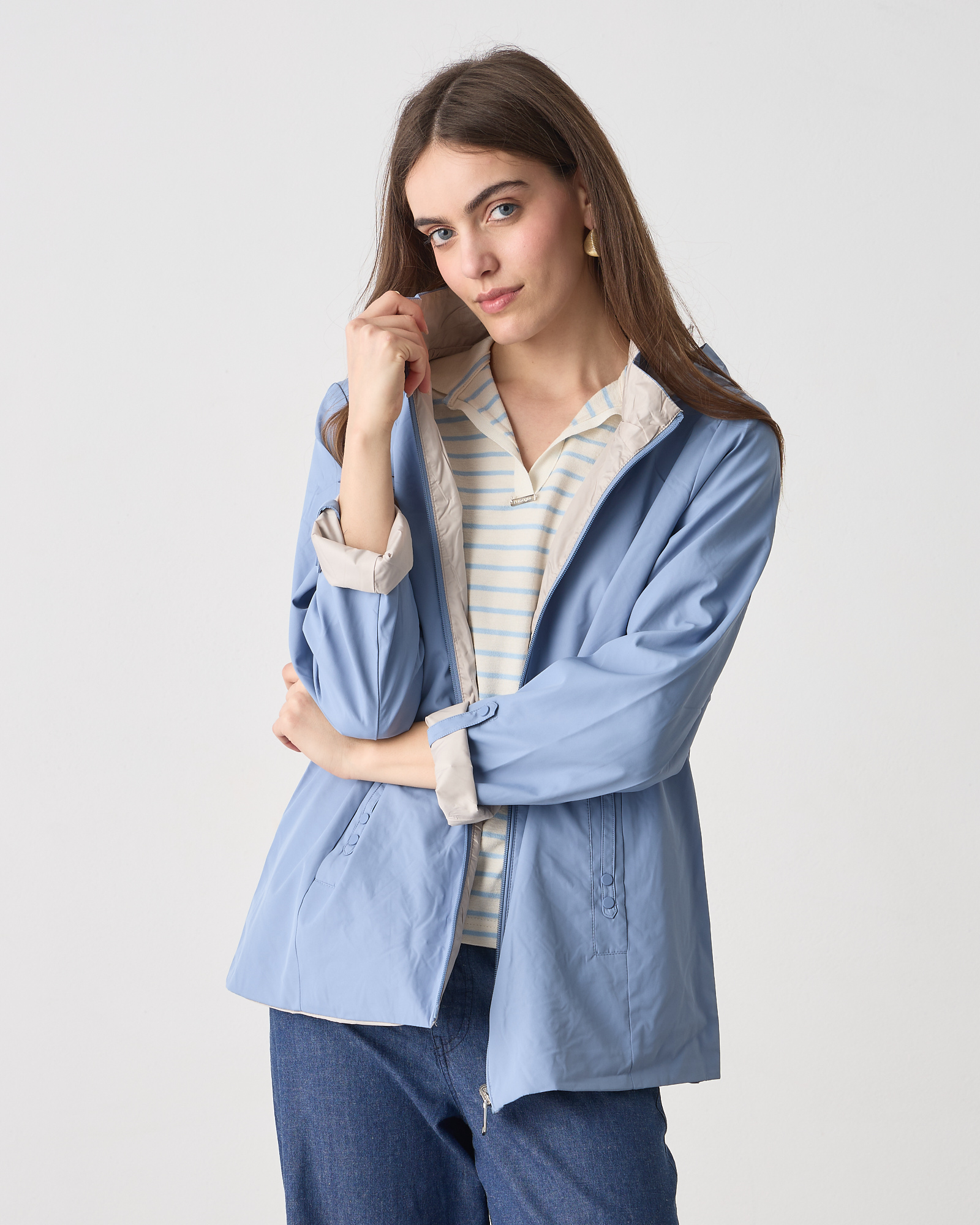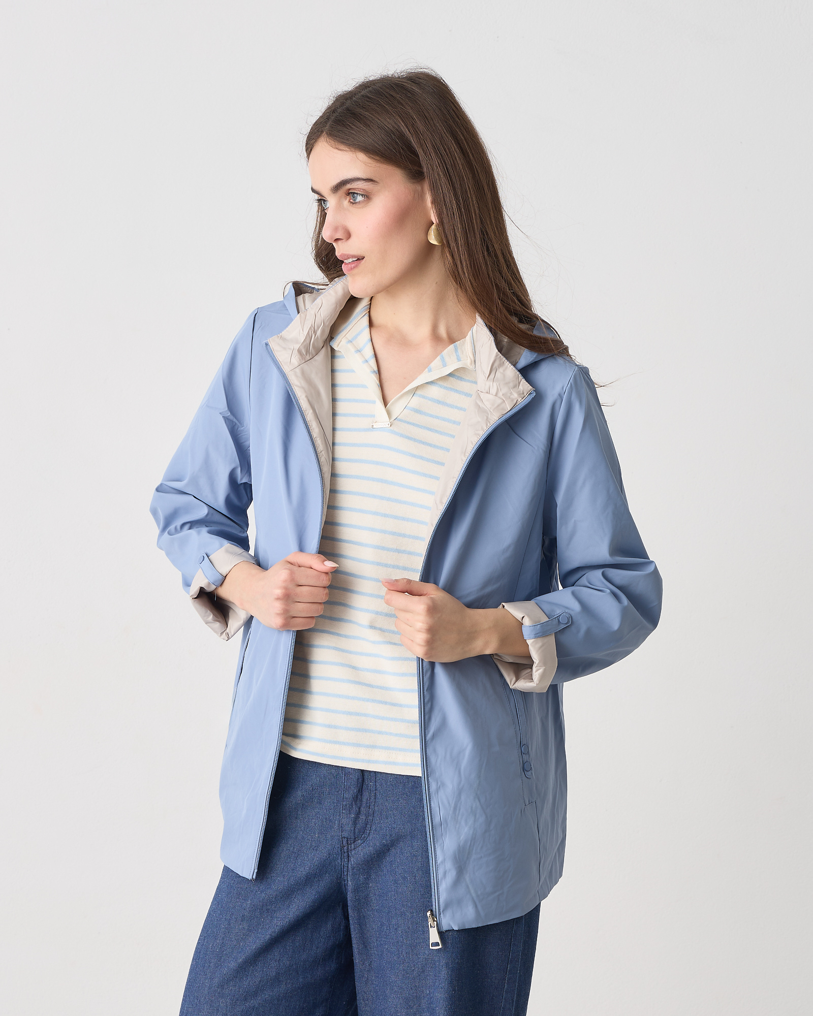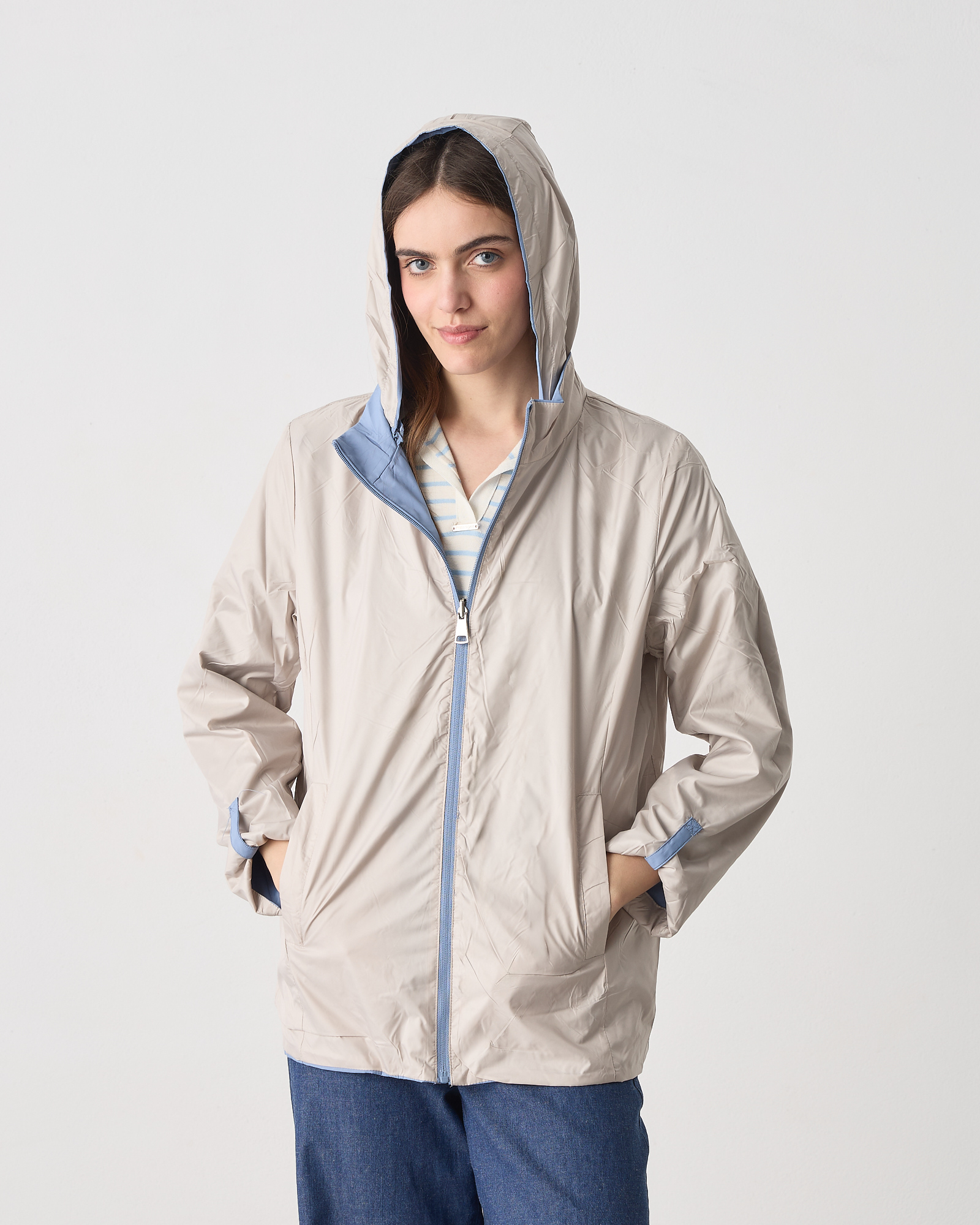 Μπουφάν διπλής όψης μακρυμάνικο, κλείσιμο μπροστά με φερμουάρ, αποσπώμενη κουκούλα, σε κανονική εφαρμογή