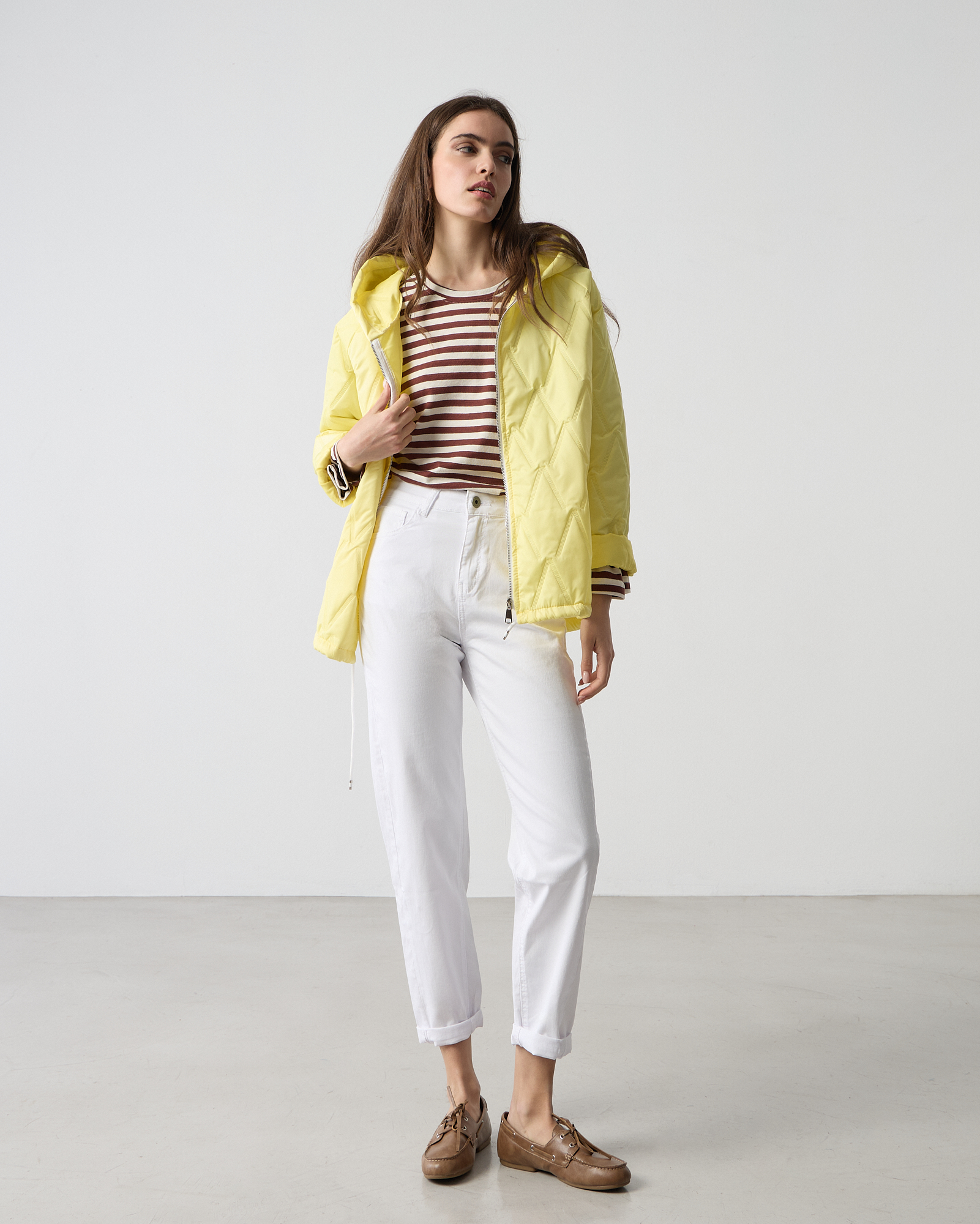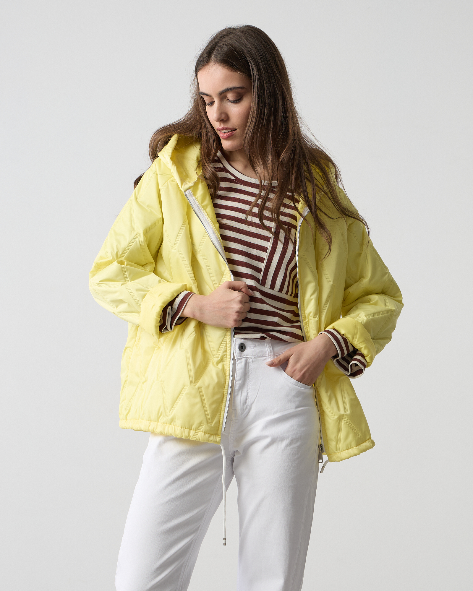 Μπουφάν ελαφρύ, μακρυμάνικο με κουκούλα, τσέπες στο πλάι, κλείσιμο με φερμουάρ μπροστά, λάστιχο στο κάτω μέρος, σε άνετη χαλαρή εφαρμογή