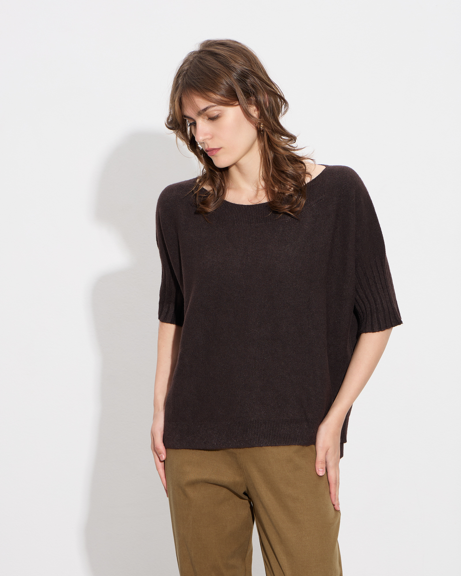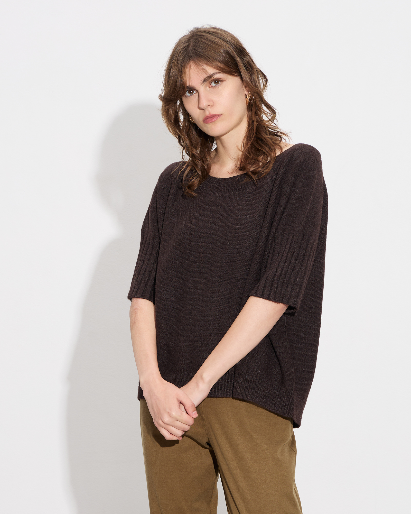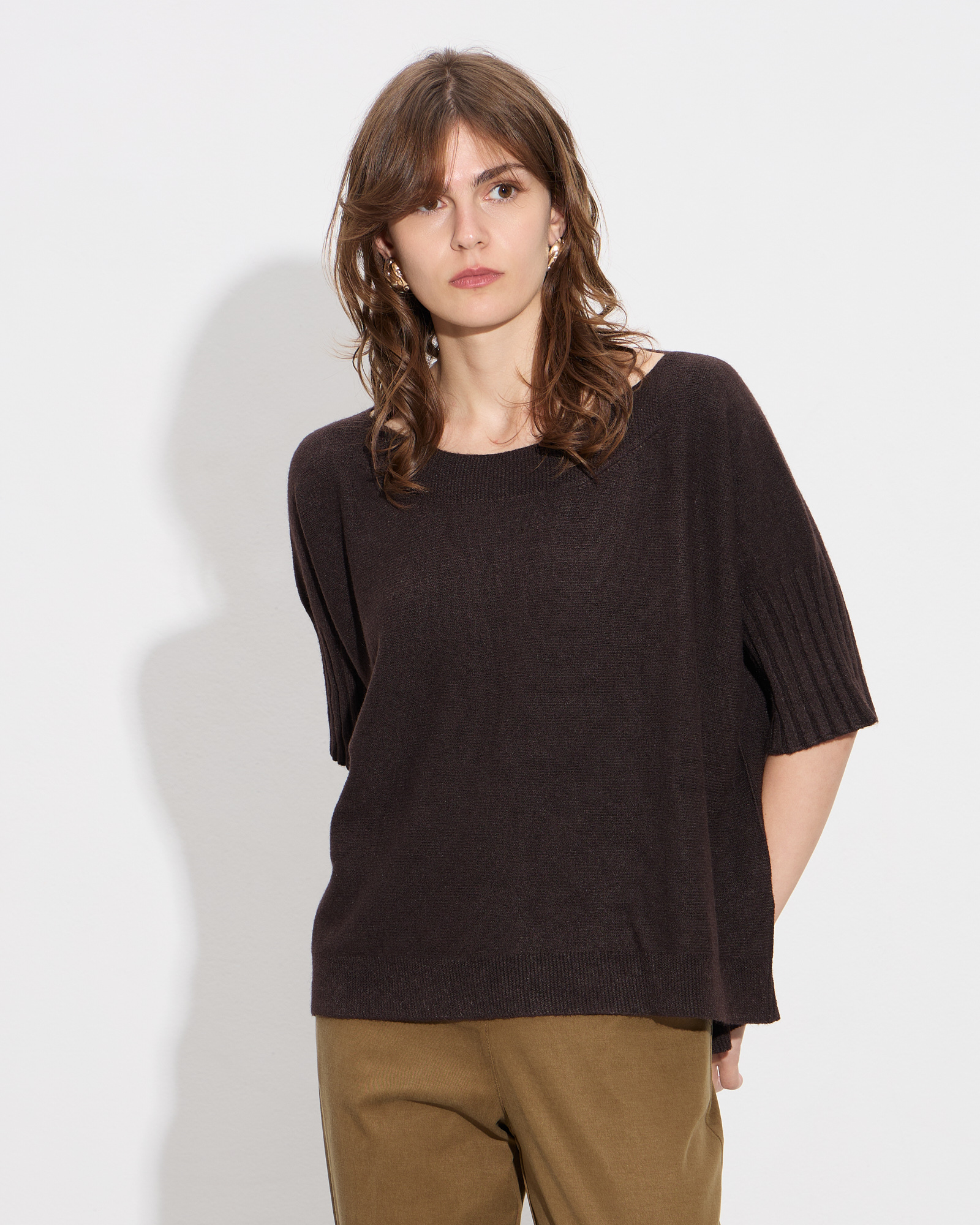 Πουλόβερ με λαιμόκοψη χαμόγελο, κοντό μανίκι με λεπτομέρεια ριπ, απαλή υφή, σε άνετη εφαρμογή